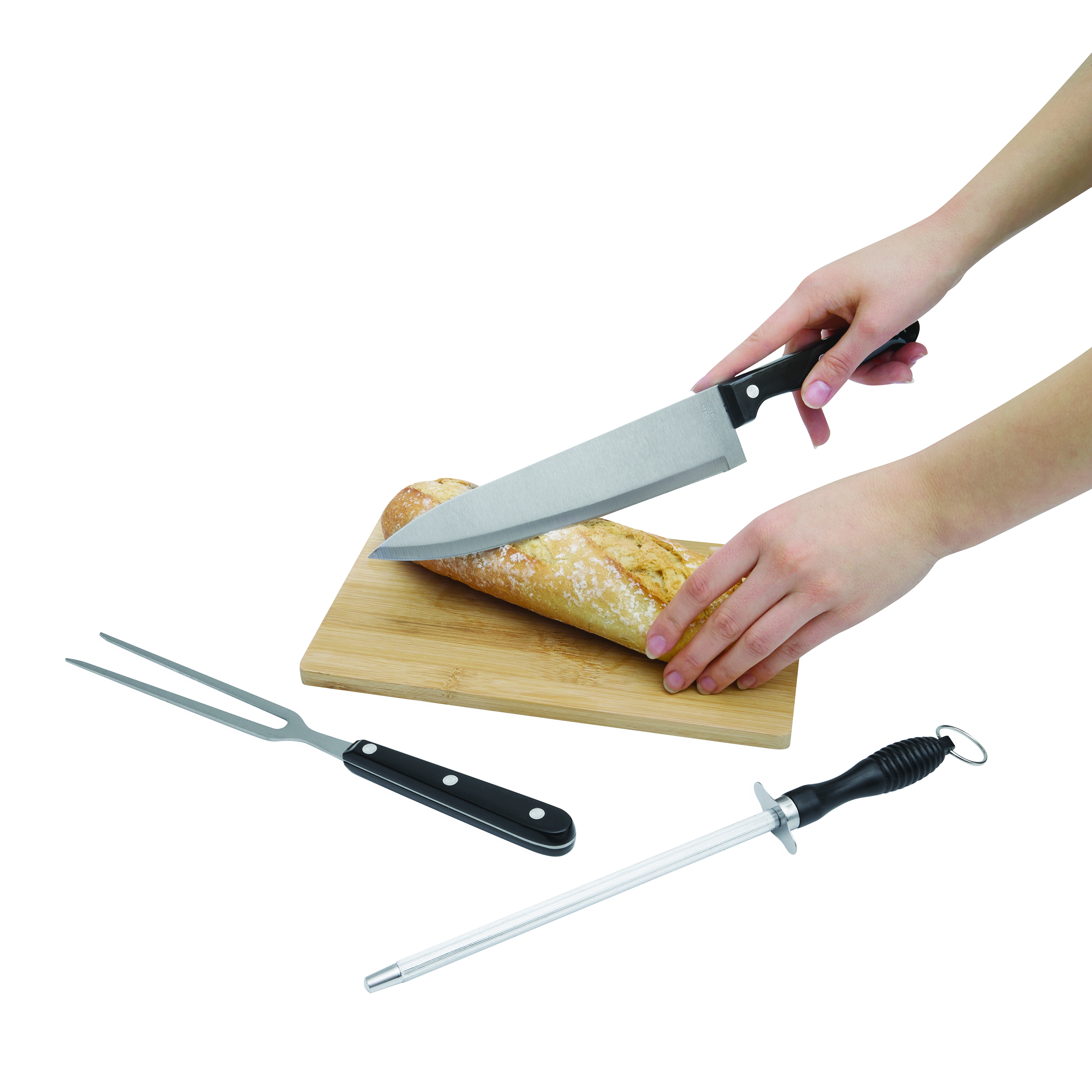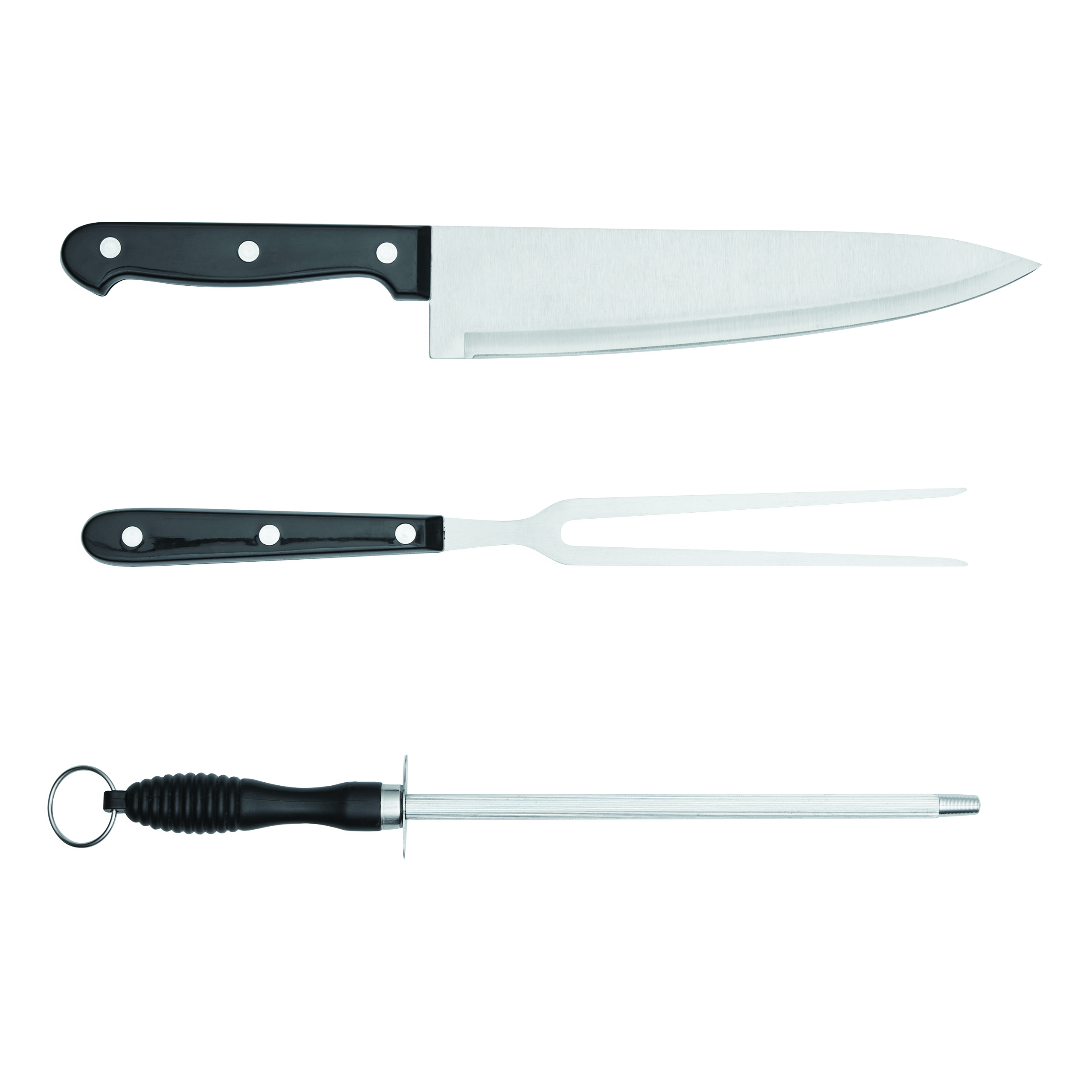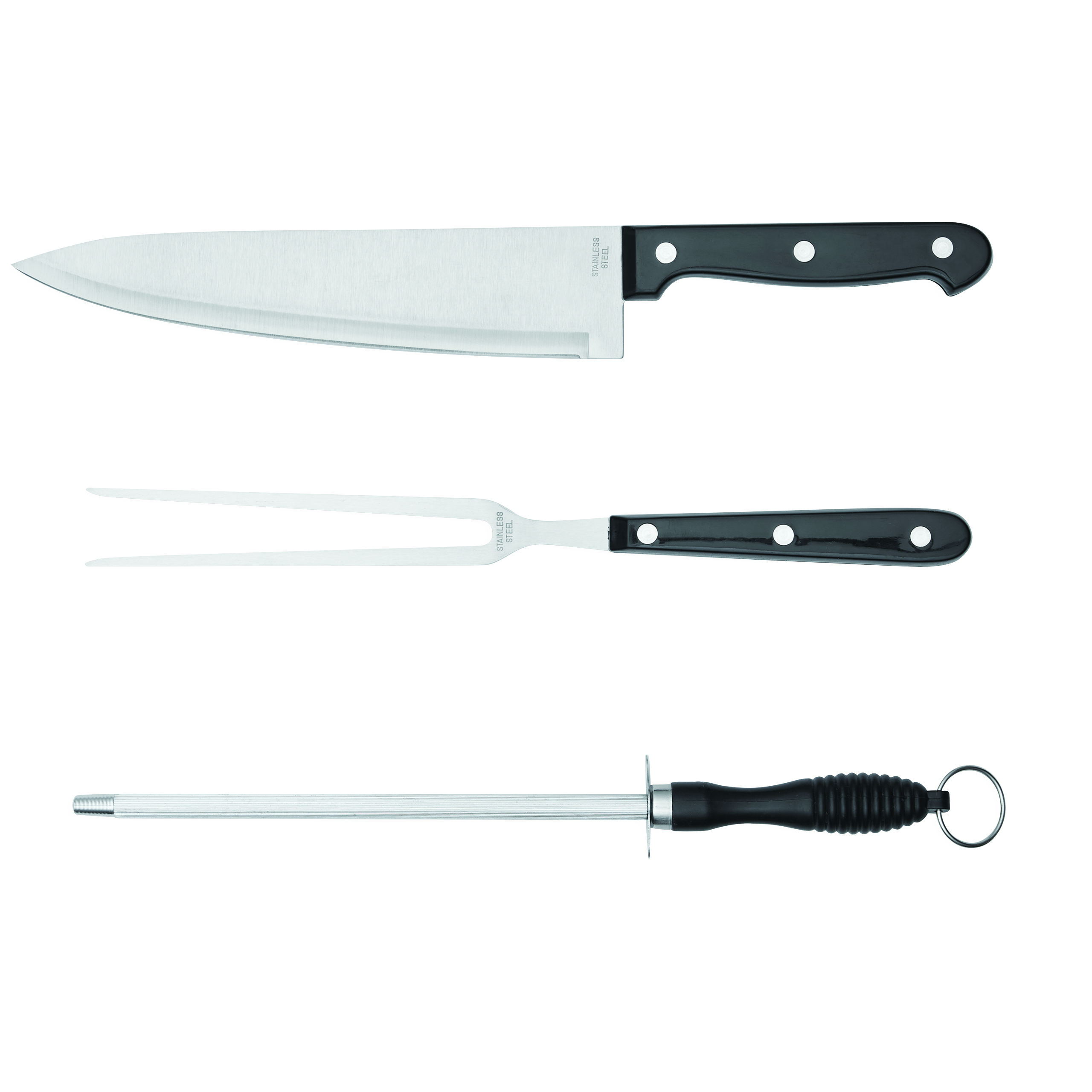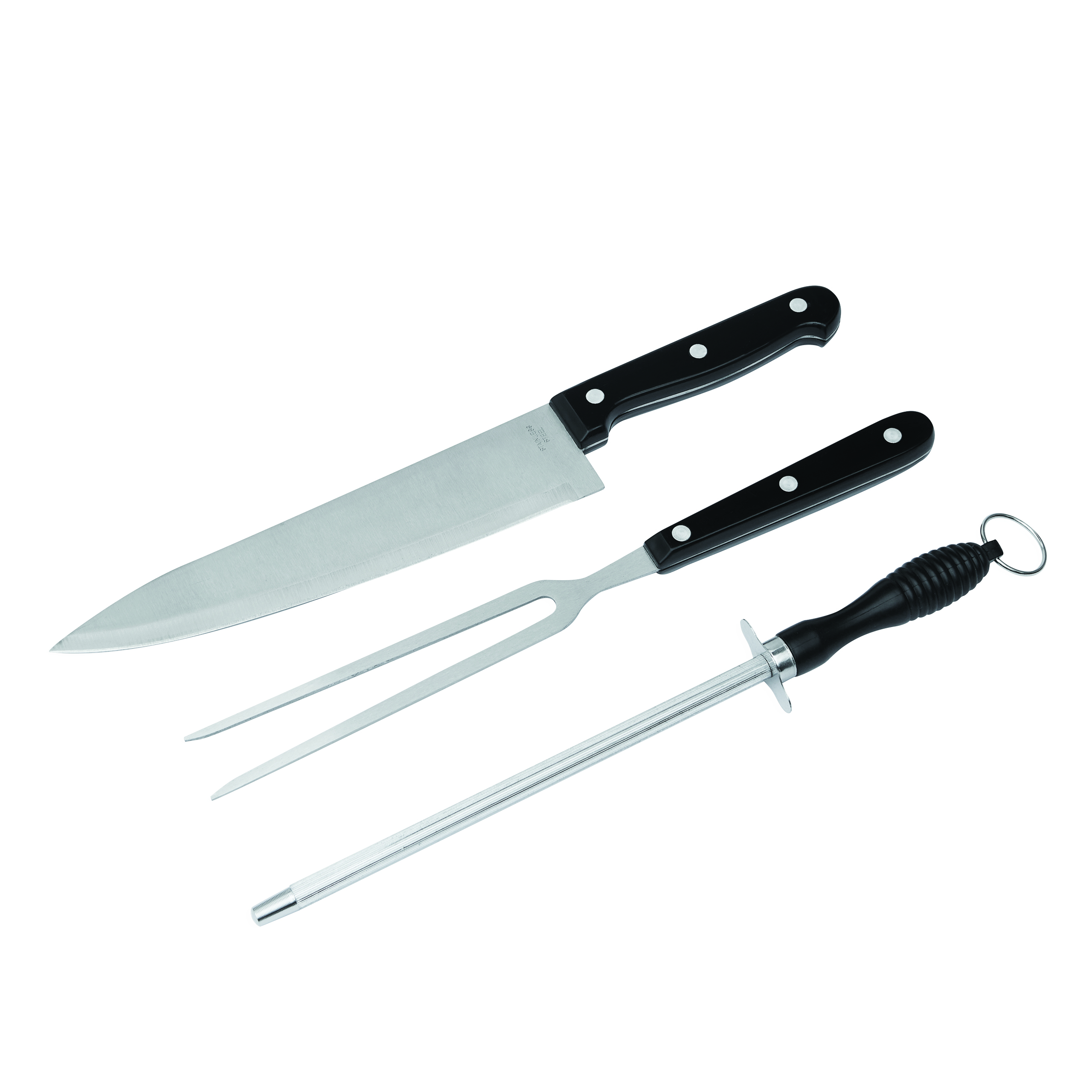 3-częściowy zestaw ze stali nierdzewnej CARVE składa się z ostrzałki z metalowym oczkiem do zawieszania, noża i widelca do mięsa, zapakowany w proste pudełko.