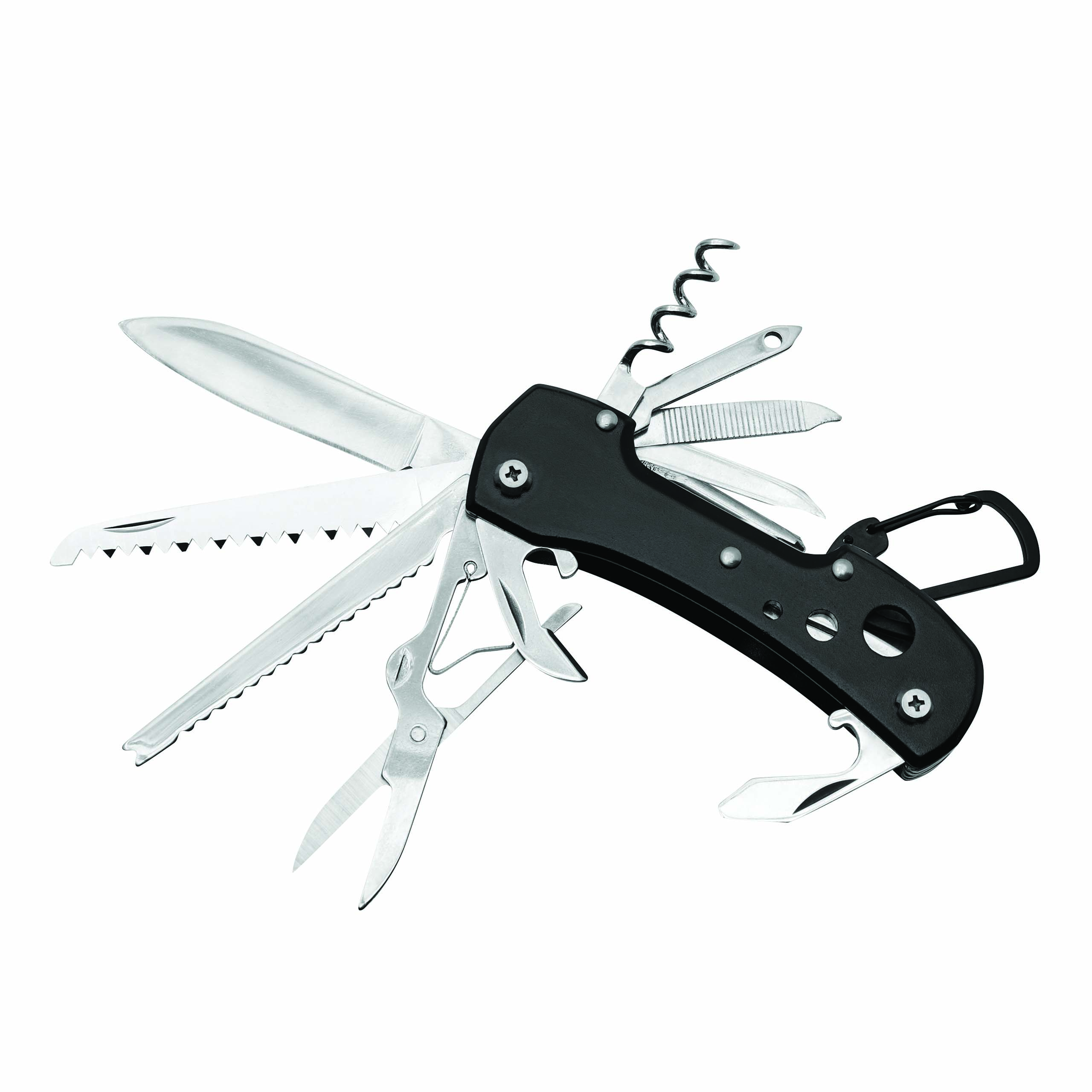 Scyzoryk STRONG HELPER składa się z 12 elementów: nożyka, piły, nożyczek, otwieracza do puszek, korkociągu, otwieracza do butelek, śrubokręta płaskiego, śrubokręta krzyżakowego, szpikulca-rozwiertaka, szydła, linijki, pilniczka oraz karabińczyka.
