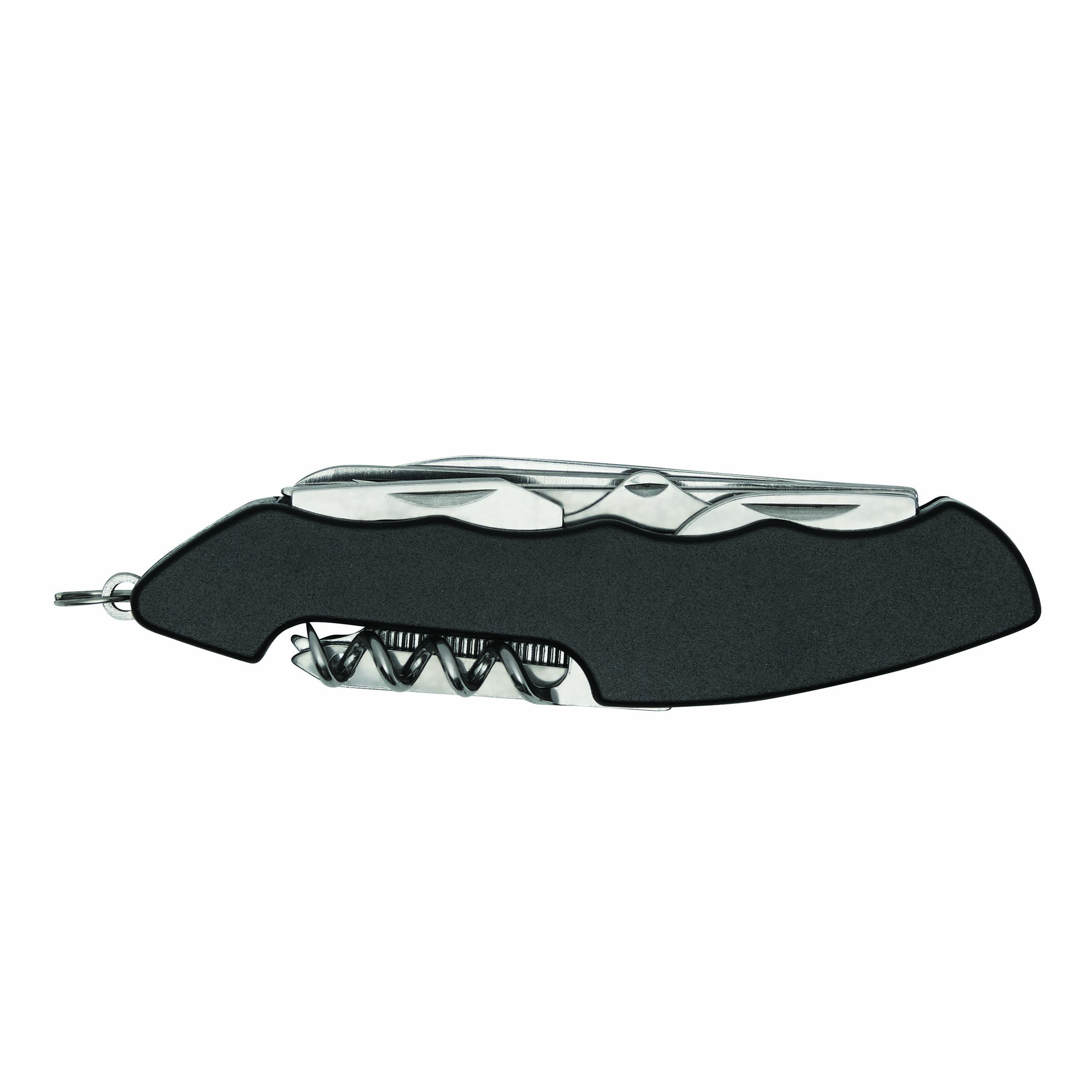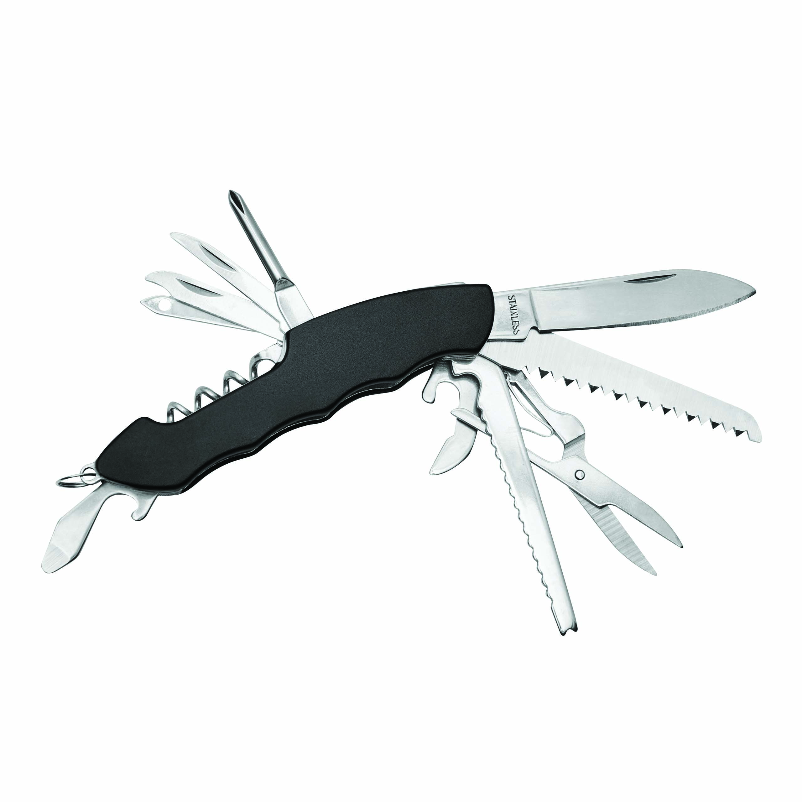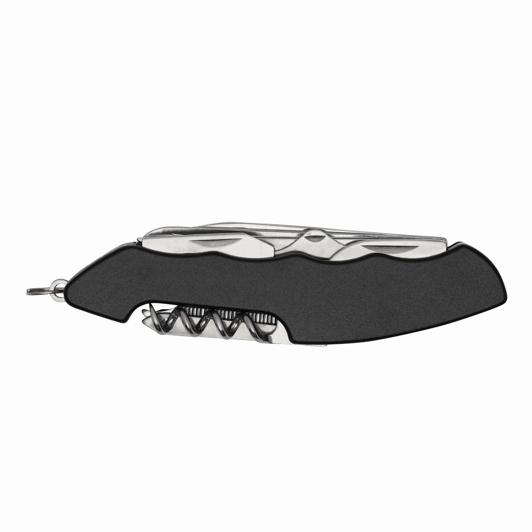 Scyzoryk ALL TOGETHER z 11 funkcjami, w tym nożyczkami, nożem, małą i dużą piłą, otwieraczem do puszek i butelek, korkociągiem, pilniczkiem i śrubokrętem. W pudełku.