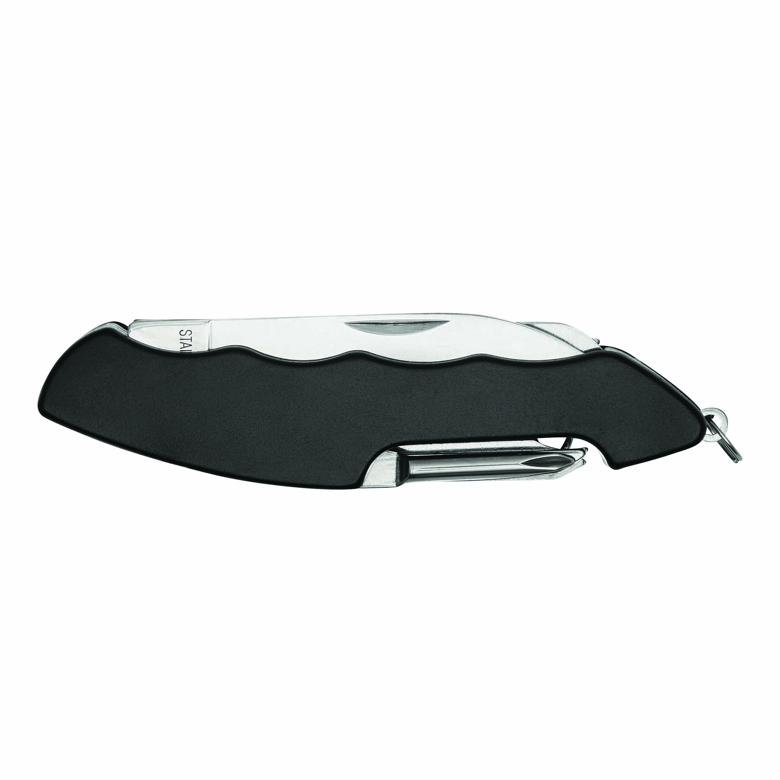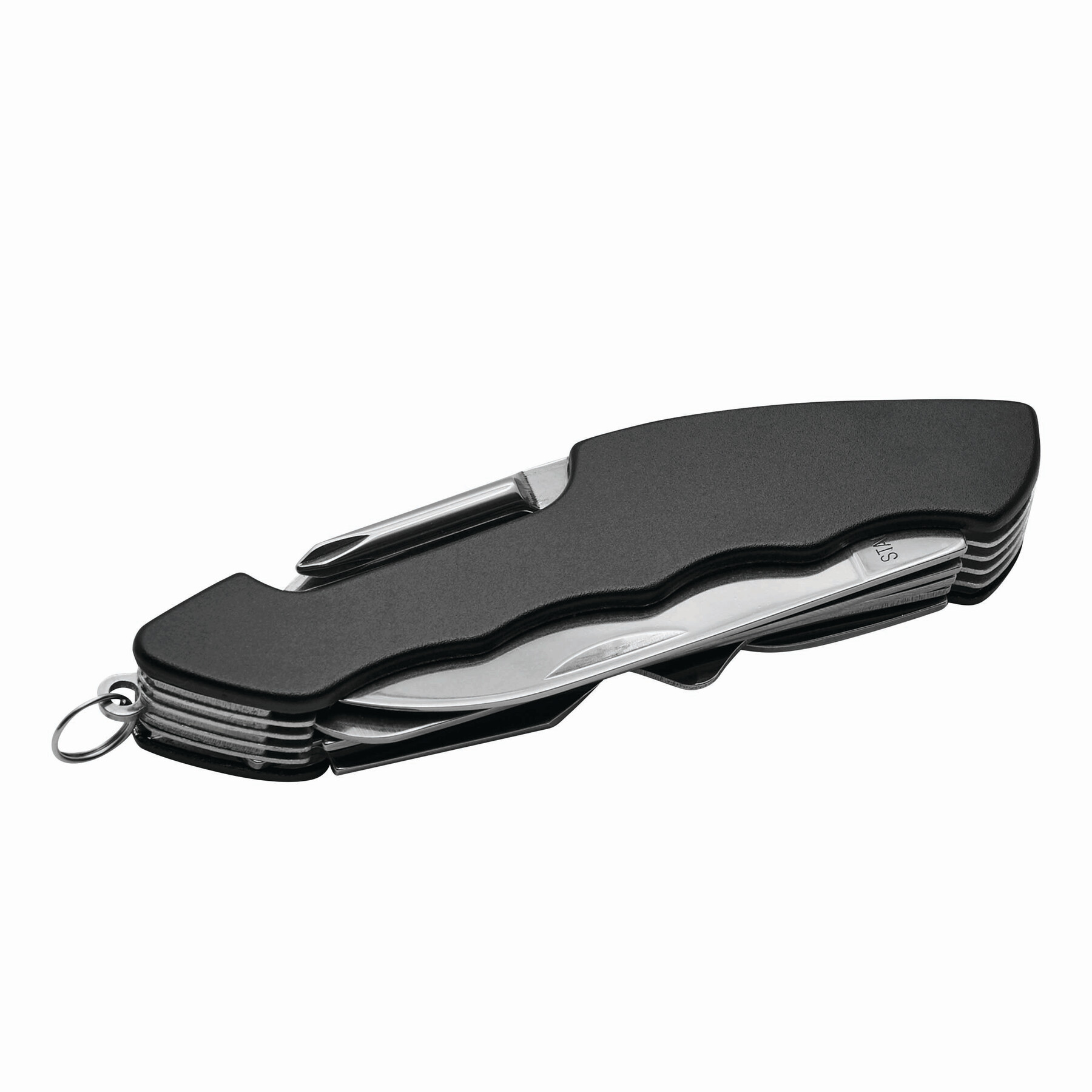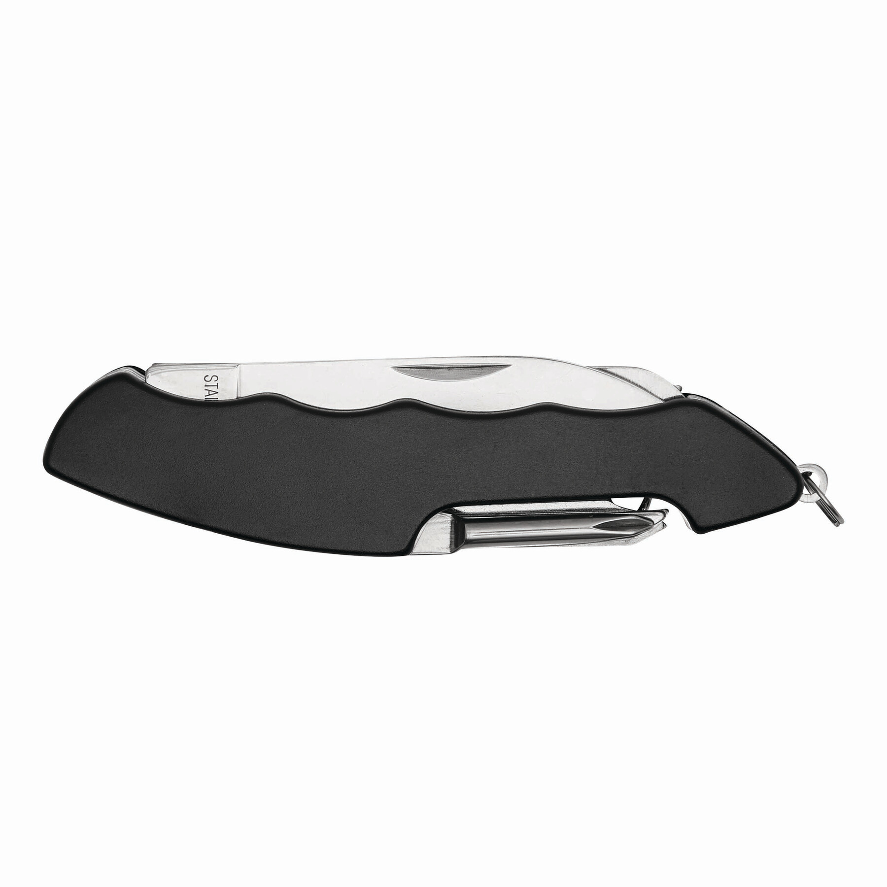 Scyzoryk ALL TOGETHER z 11 funkcjami, w tym nożyczkami, nożem, małą i dużą piłą, otwieraczem do puszek i butelek, korkociągiem, pilniczkiem i śrubokrętem. W pudełku.