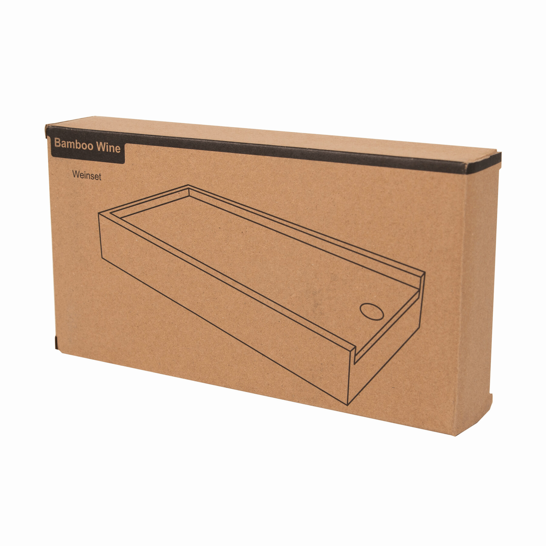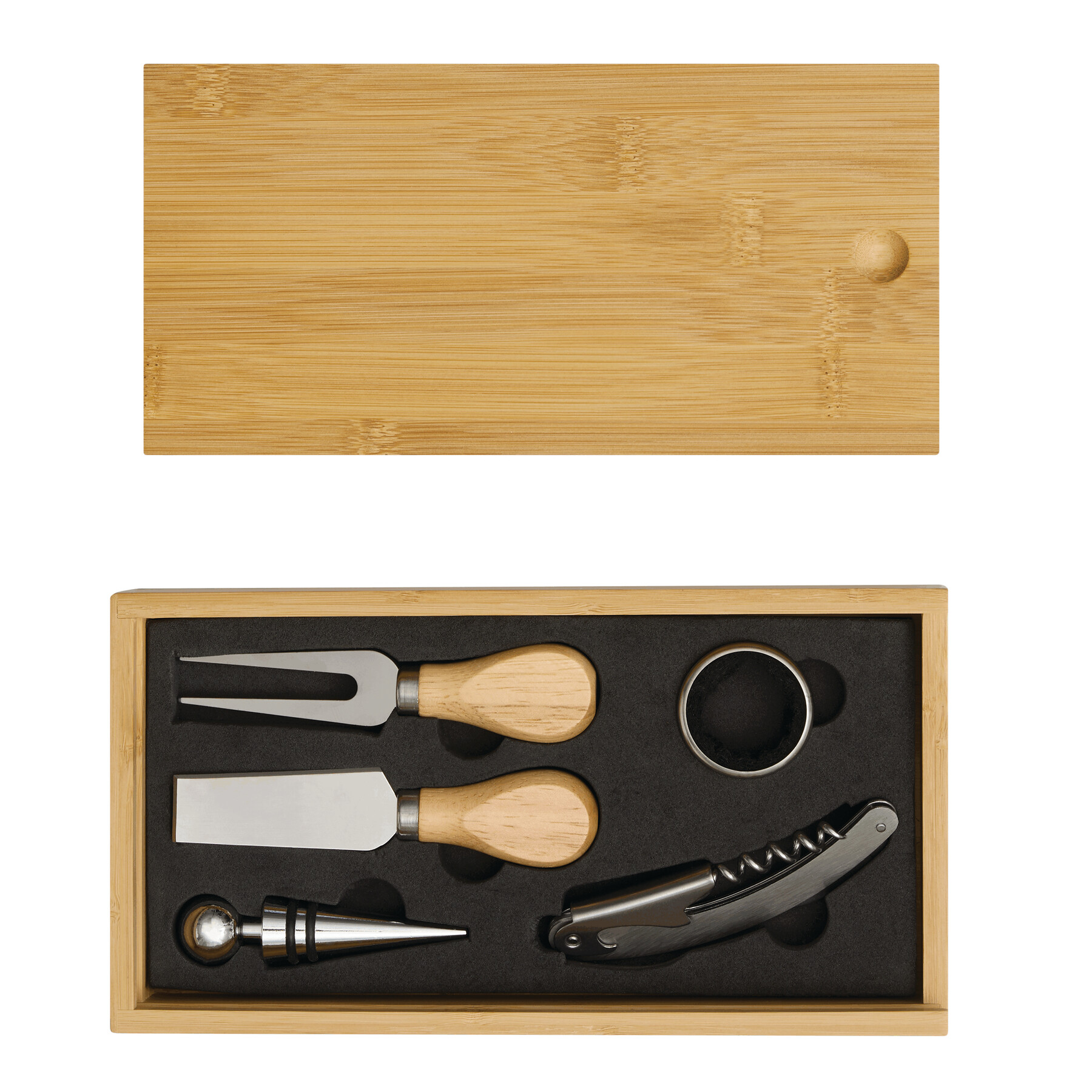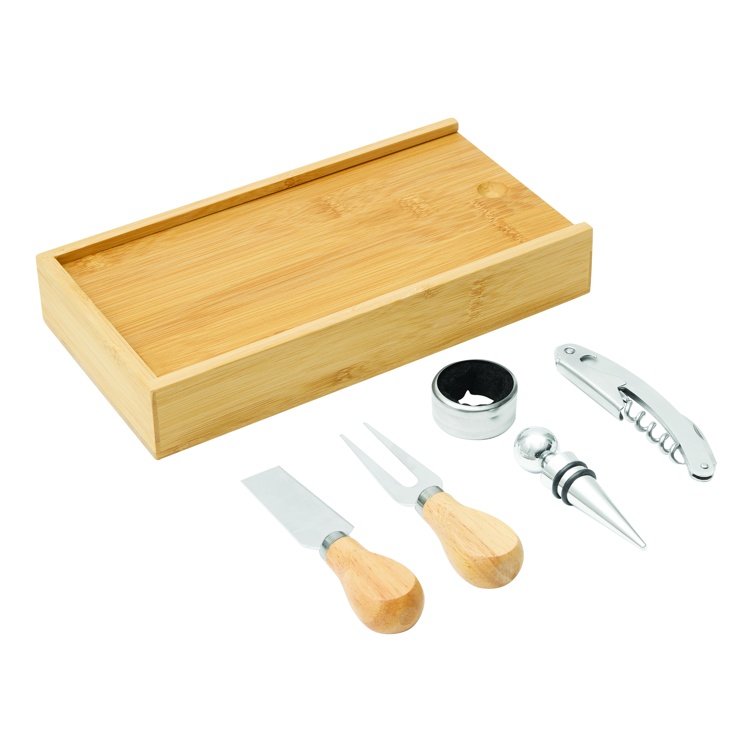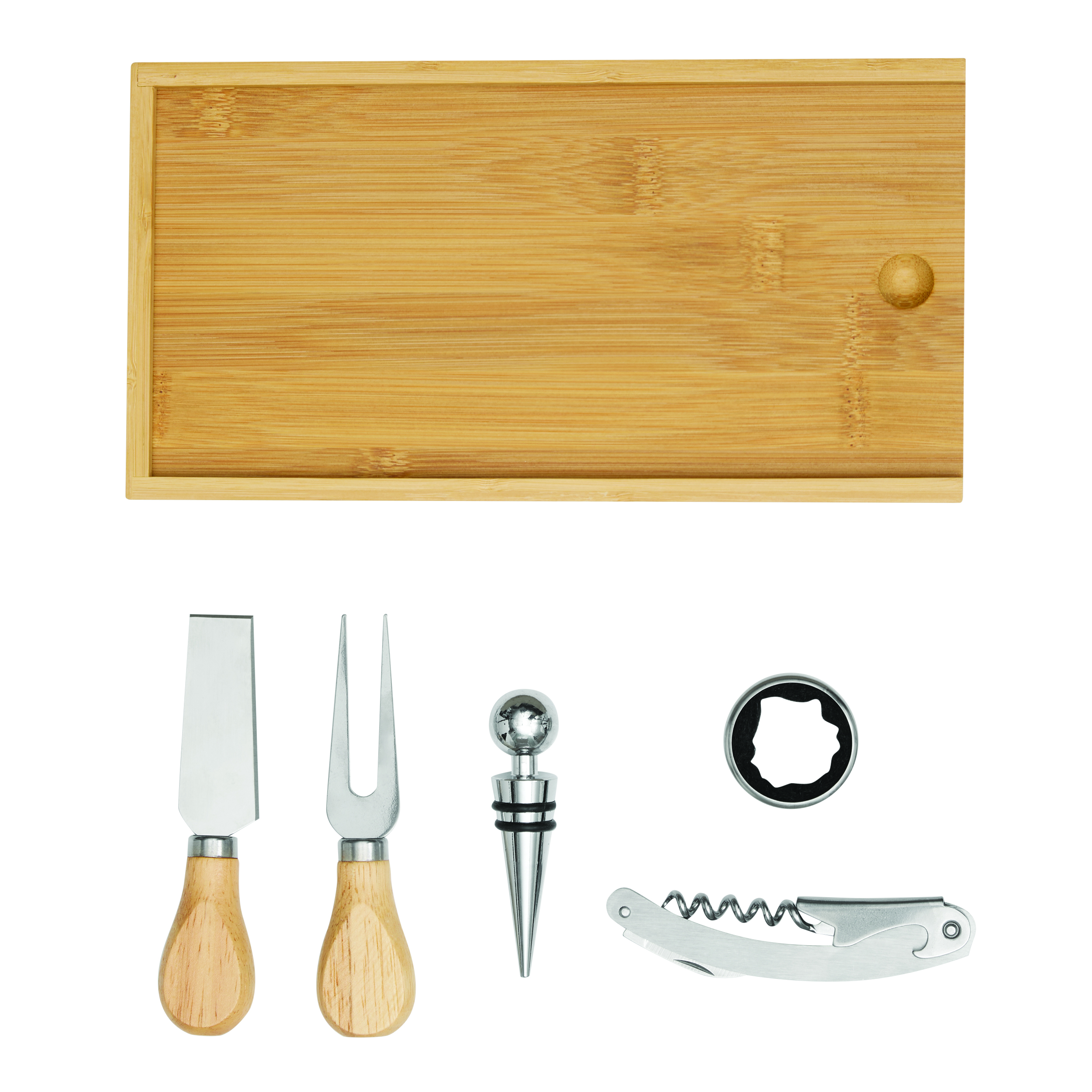 Zestaw do wina i serów BAMBOO WINE w bambusowym pudełku. Zawiera pierścień na szyjkę butelki i nóż kelnerski ze stali nierdzewnej oraz metalowy korek. Nóż i widelec do sera z drewnianymi rączkami świetnie uzupełniają ten zestaw. Dodatkowo tylna część pokrywy pudełka może posłużyć jako deska do krojenia.