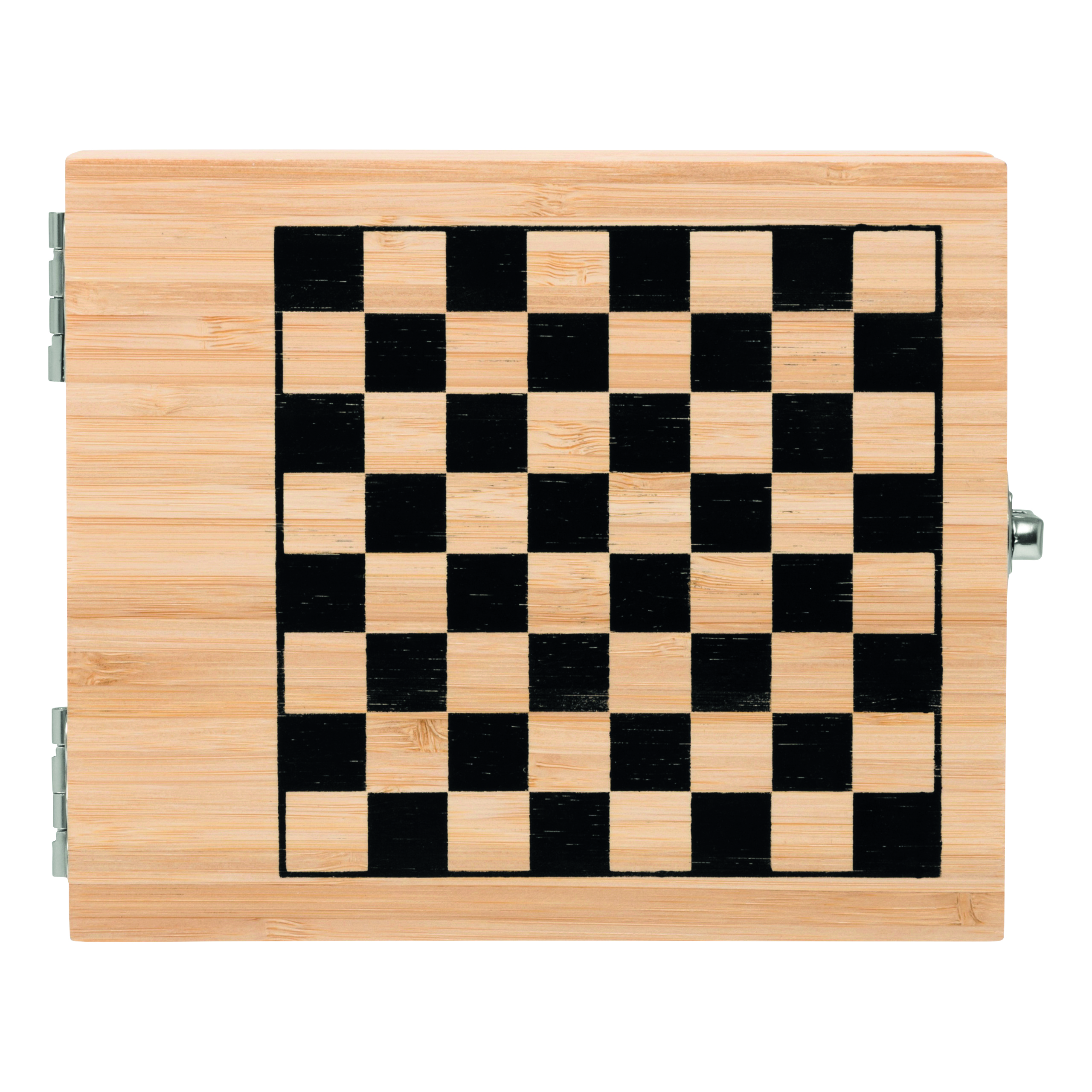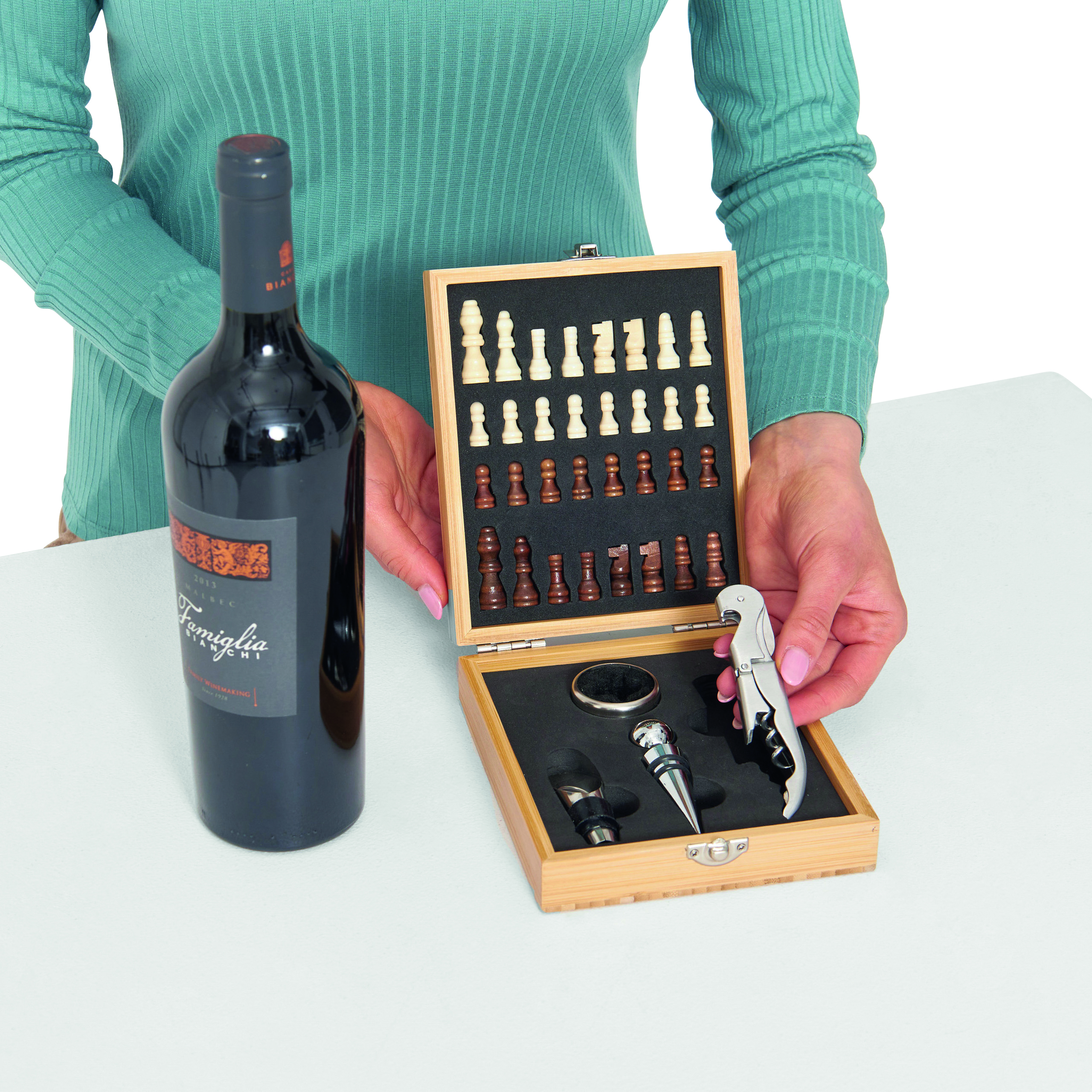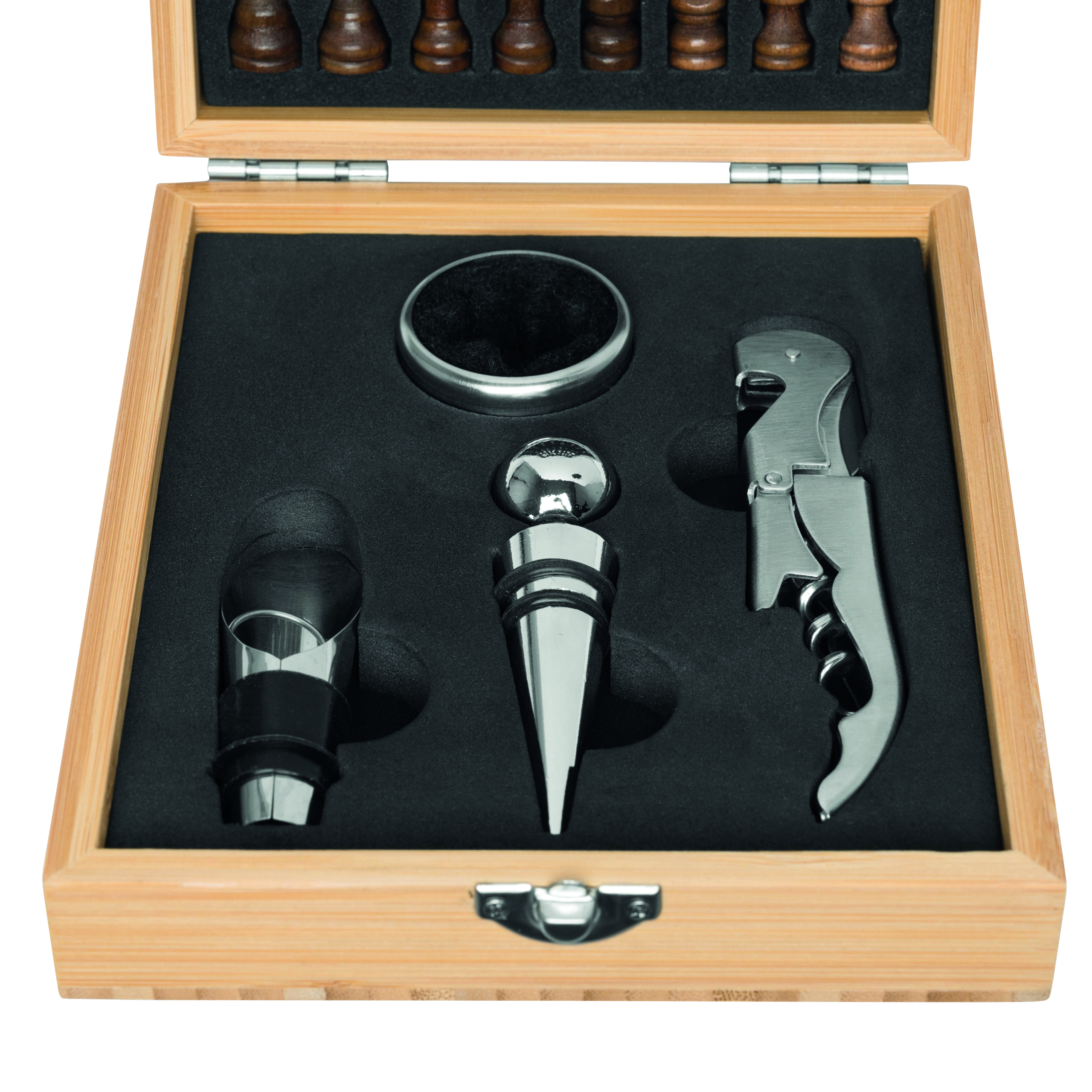 Zestaw do wina BAMBOO CHESS z szachami: składa się z noża kelnerskiego ze stali nierdzewnej, pierścienia ociekowego ze stali nierdzewnej, metalowego korka do butelki, metalowego nalewaka i drewnianych szachów, w bambusowym pudełku z planszą do gry na pokrywie.