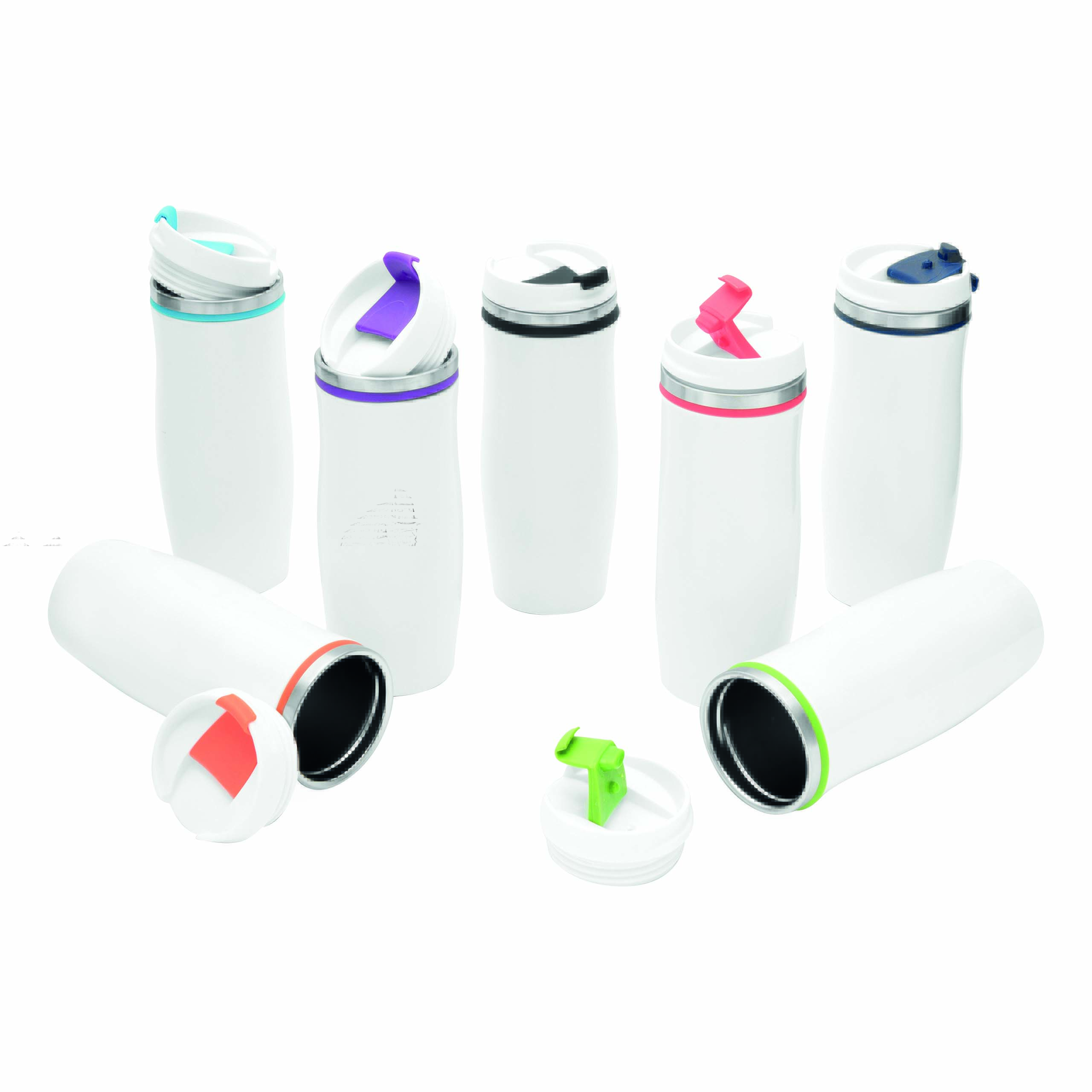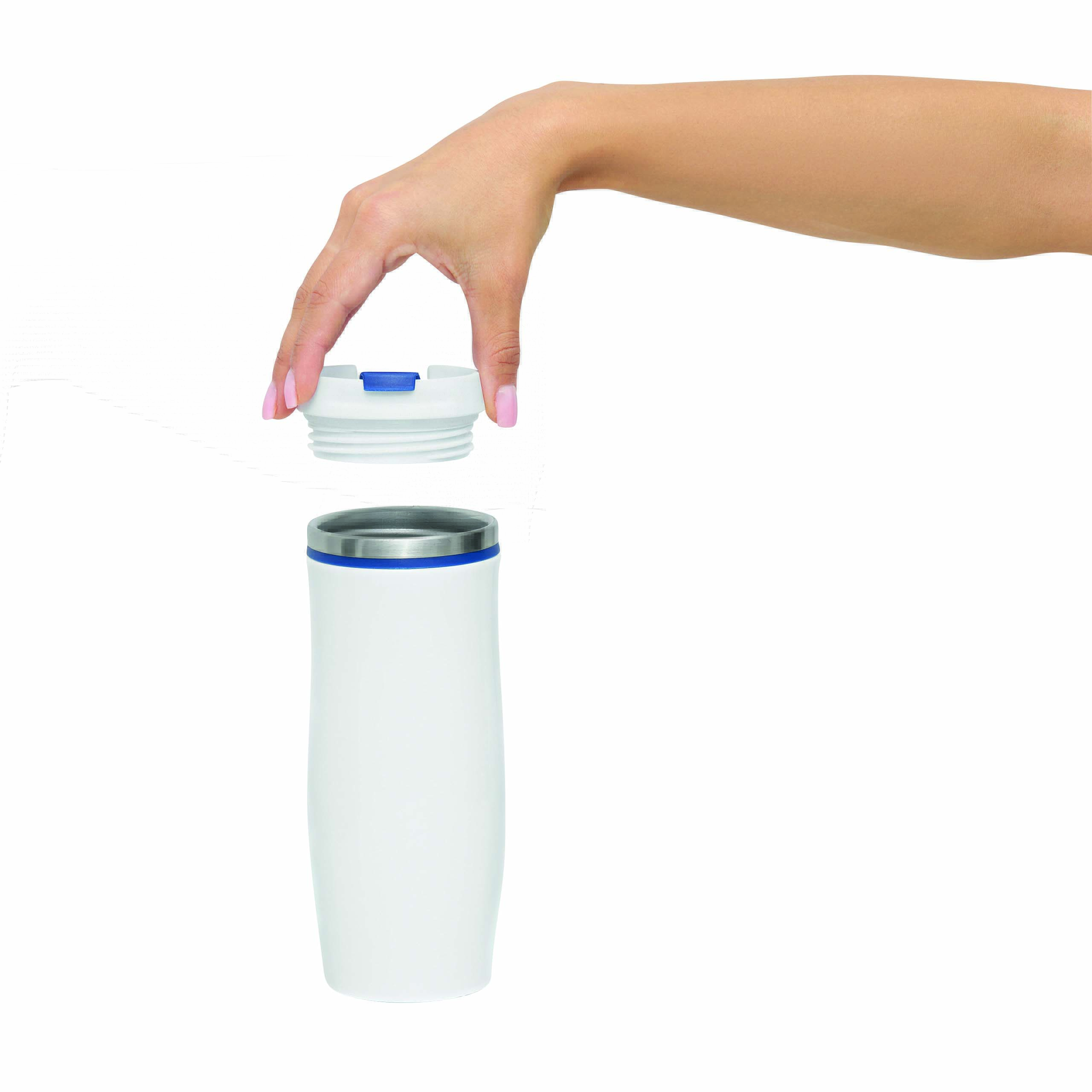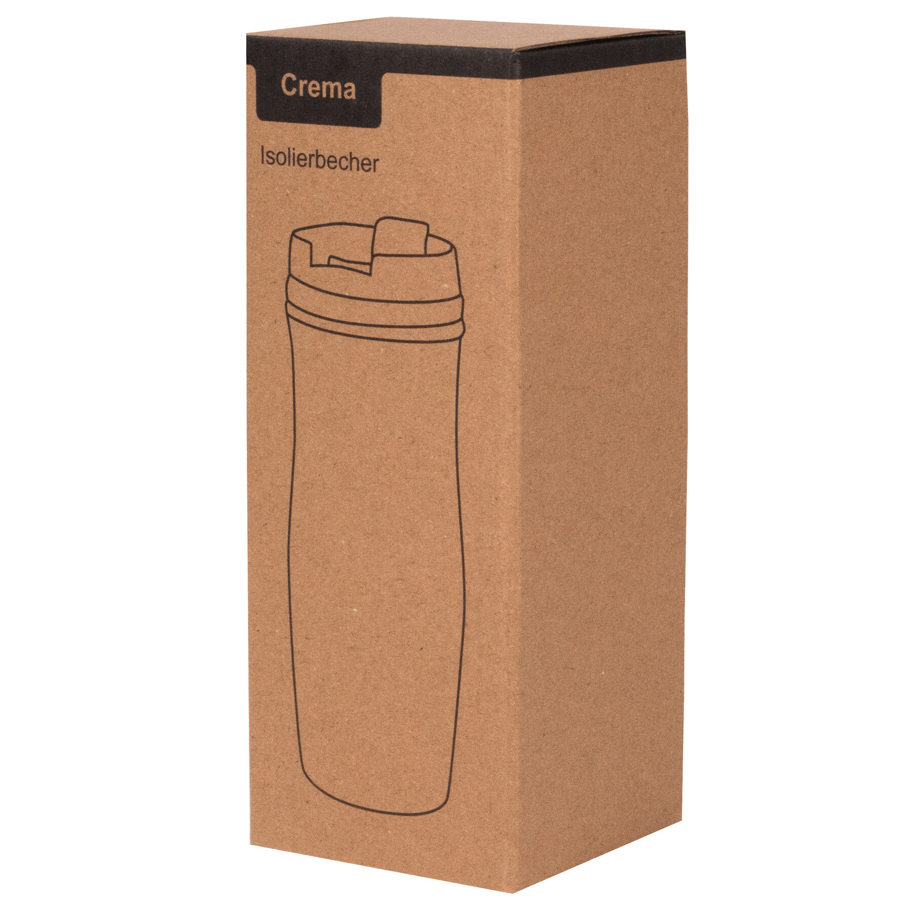 Kubek termiczny CREMA ze stali nierdzewnej wewnątrz i na zewnątrz. Z odkręcaną plastikową pokrywą i wbudowanym, składanym otworem do picia. Kolorowa guma wokół otworu, gumowany spód, pojemność ok. 400 ml.