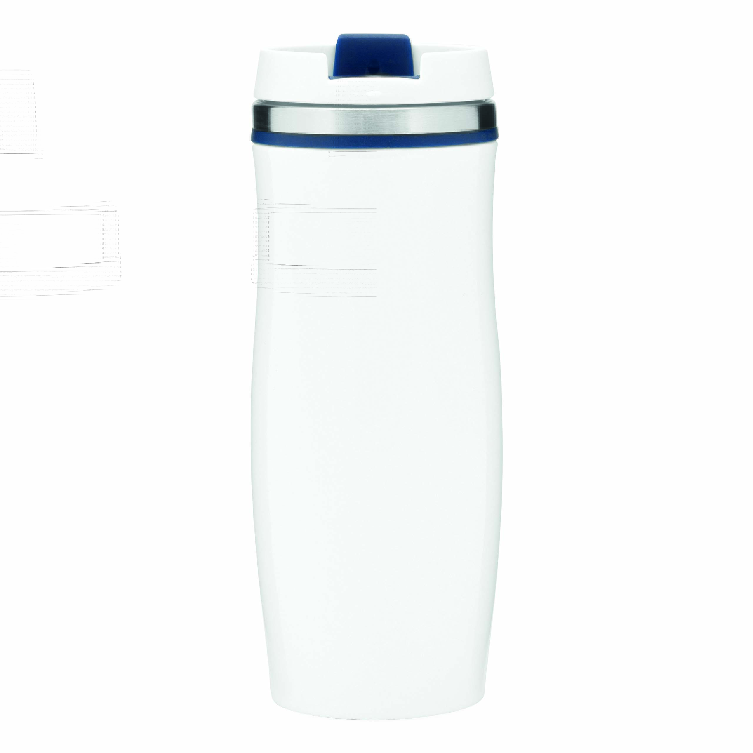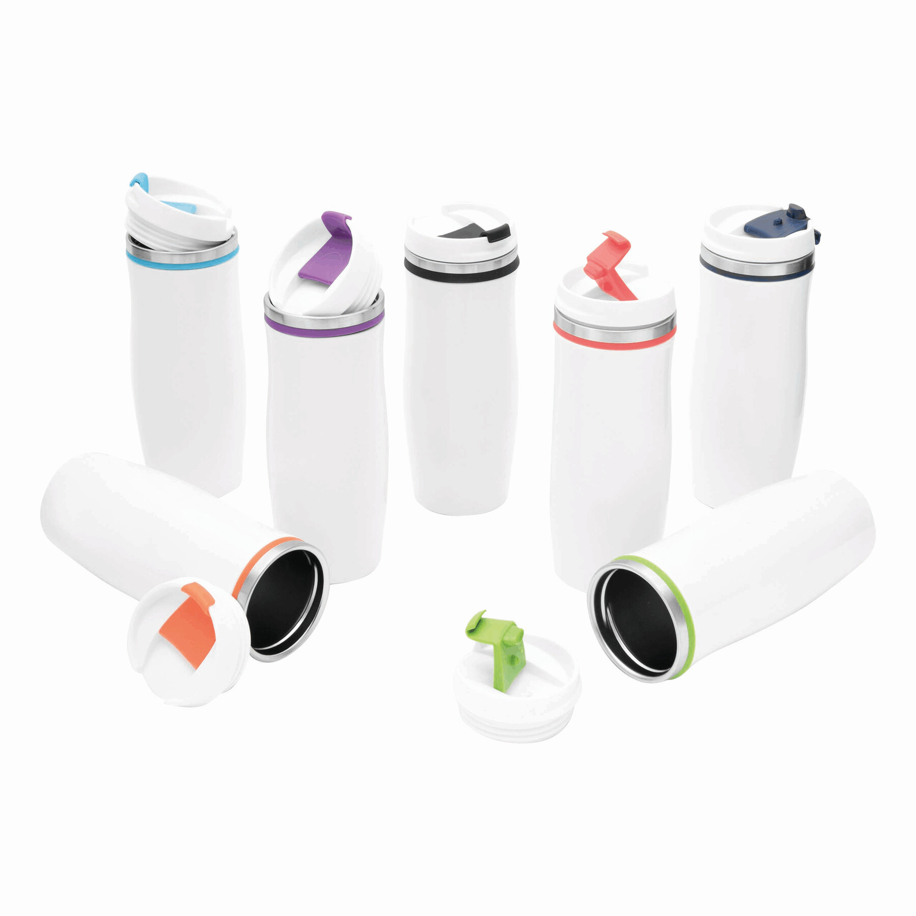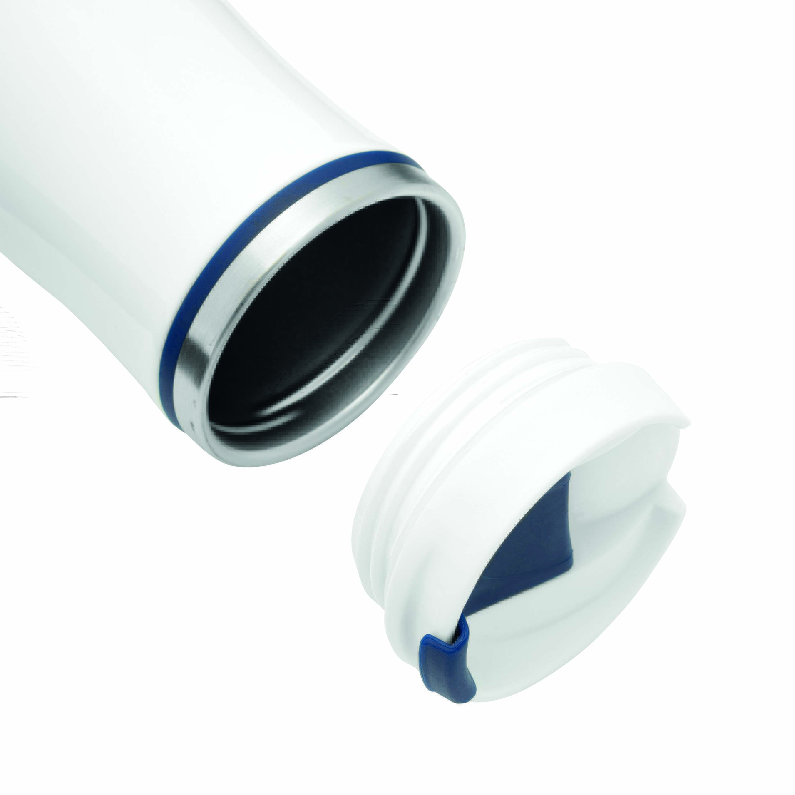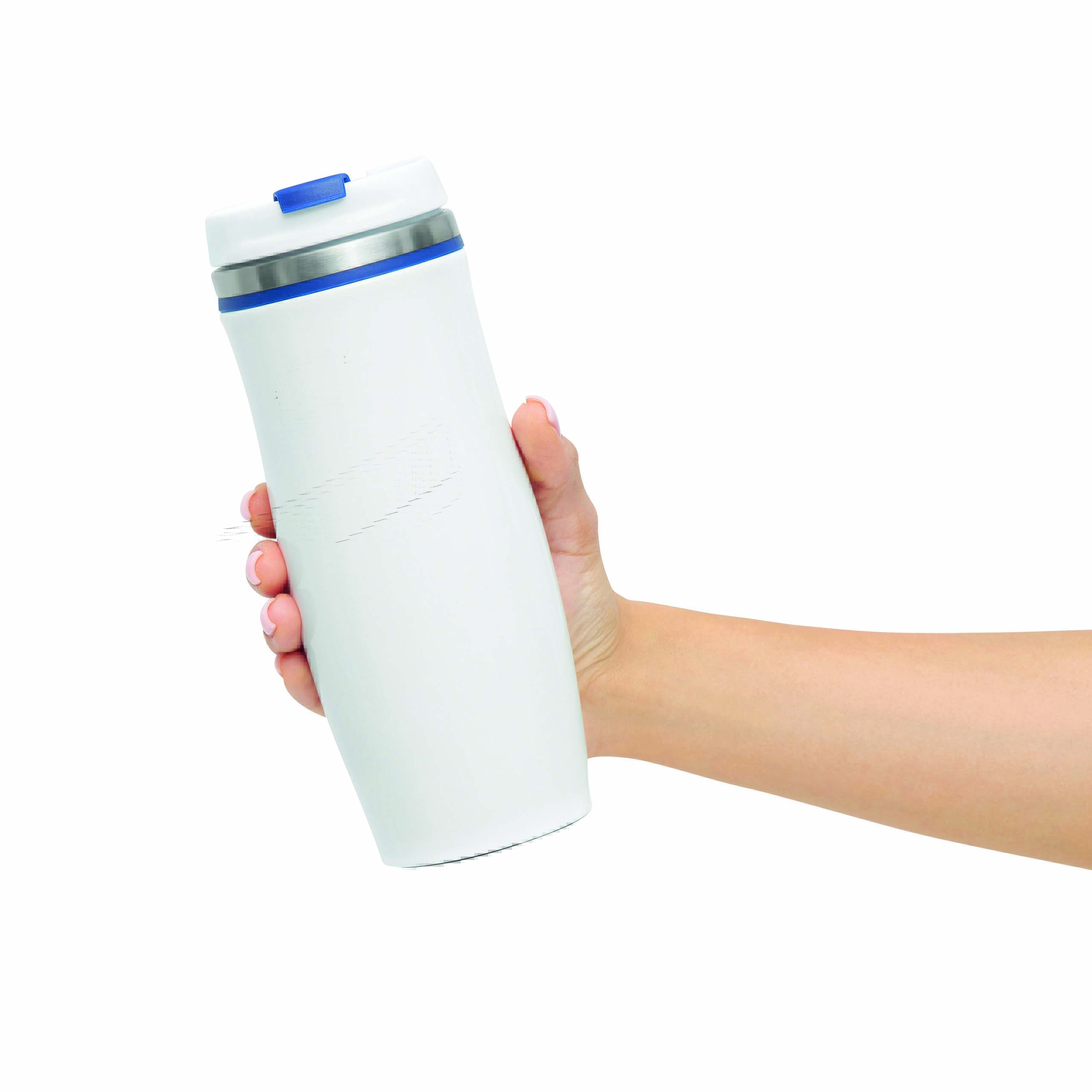 Kubek termiczny CREMA ze stali nierdzewnej wewnątrz i na zewnątrz. Z odkręcaną plastikową pokrywą i wbudowanym, składanym otworem do picia. Kolorowa guma wokół otworu, gumowany spód, pojemność ok. 400 ml.