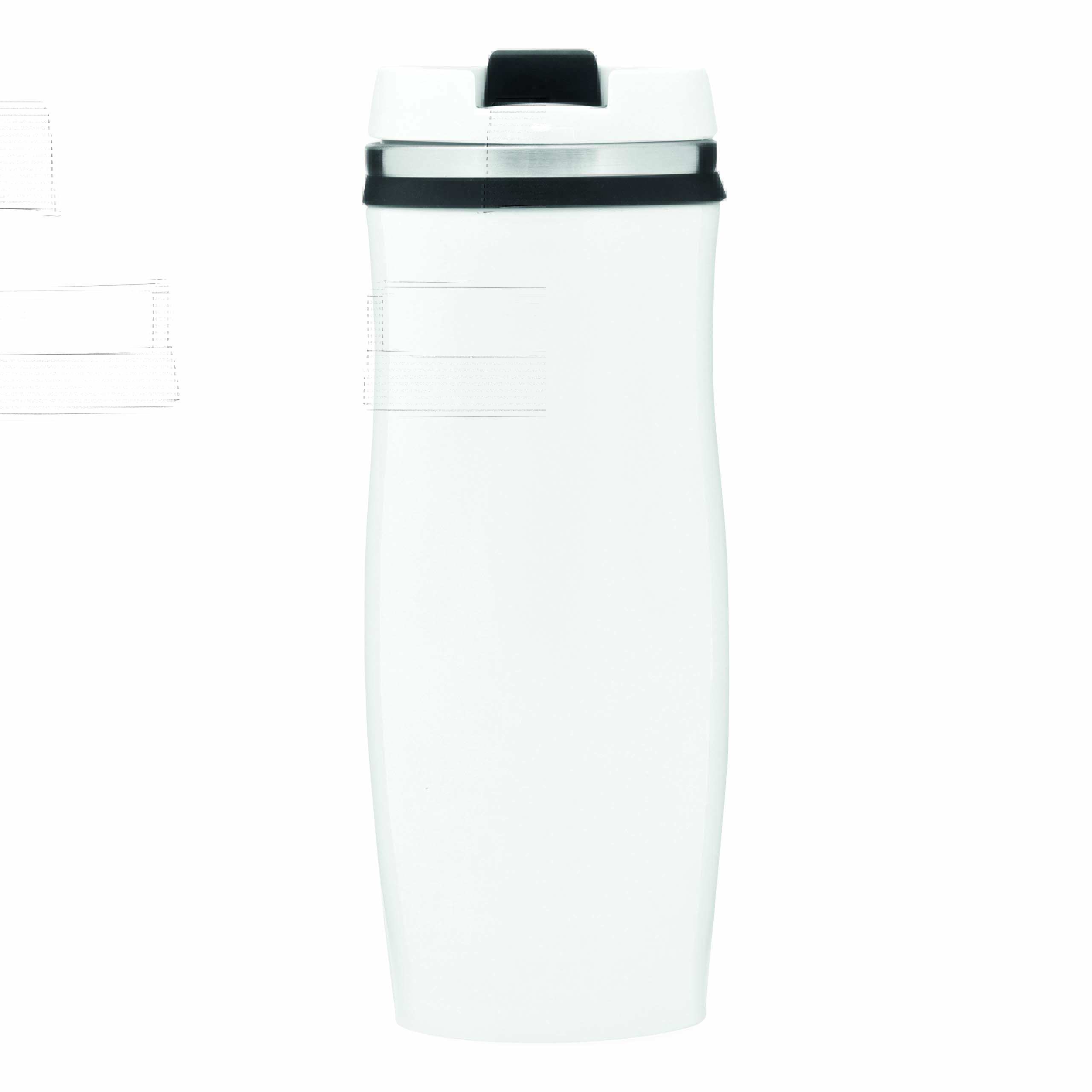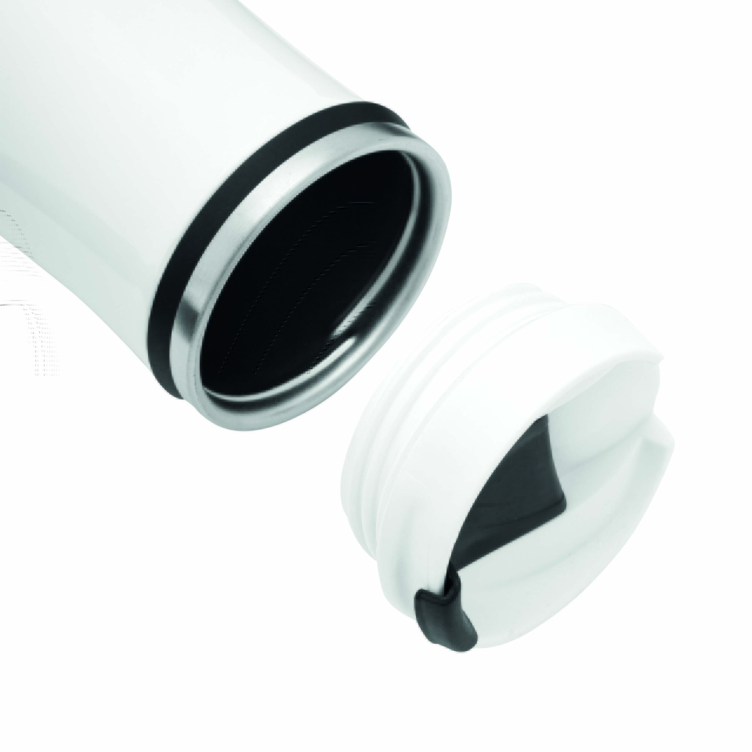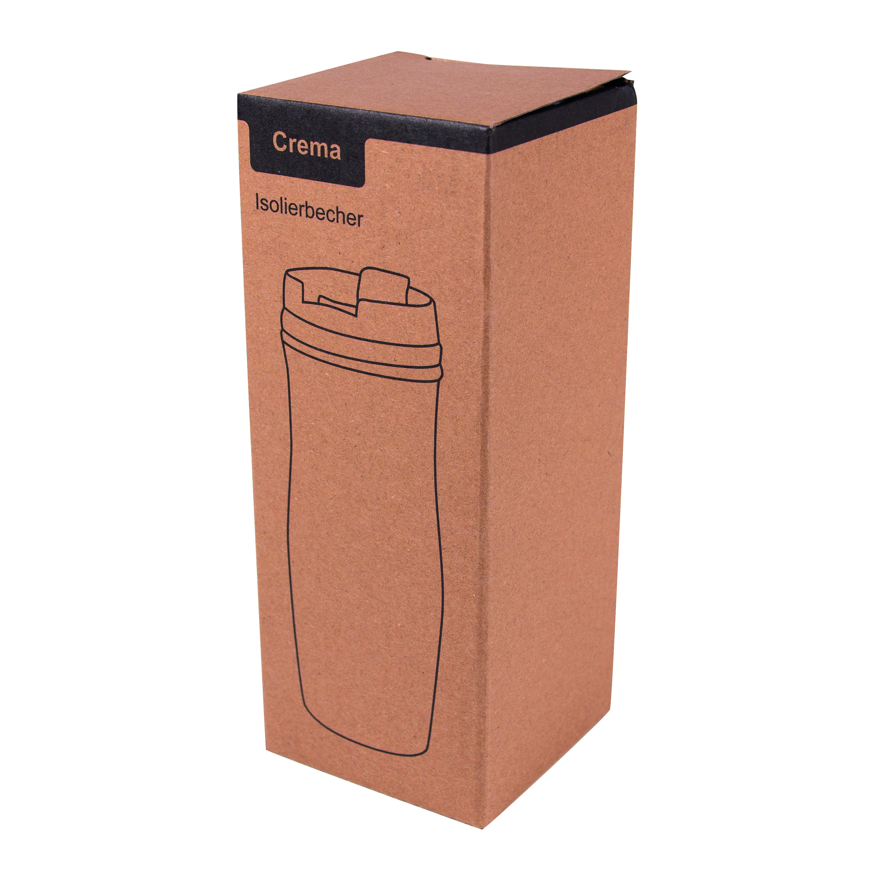 Kubek termiczny CREMA ze stali nierdzewnej wewnątrz i na zewnątrz. Z odkręcaną plastikową pokrywą i wbudowanym, składanym otworem do picia. Kolorowa guma wokół otworu, gumowany spód, pojemność ok. 400 ml.