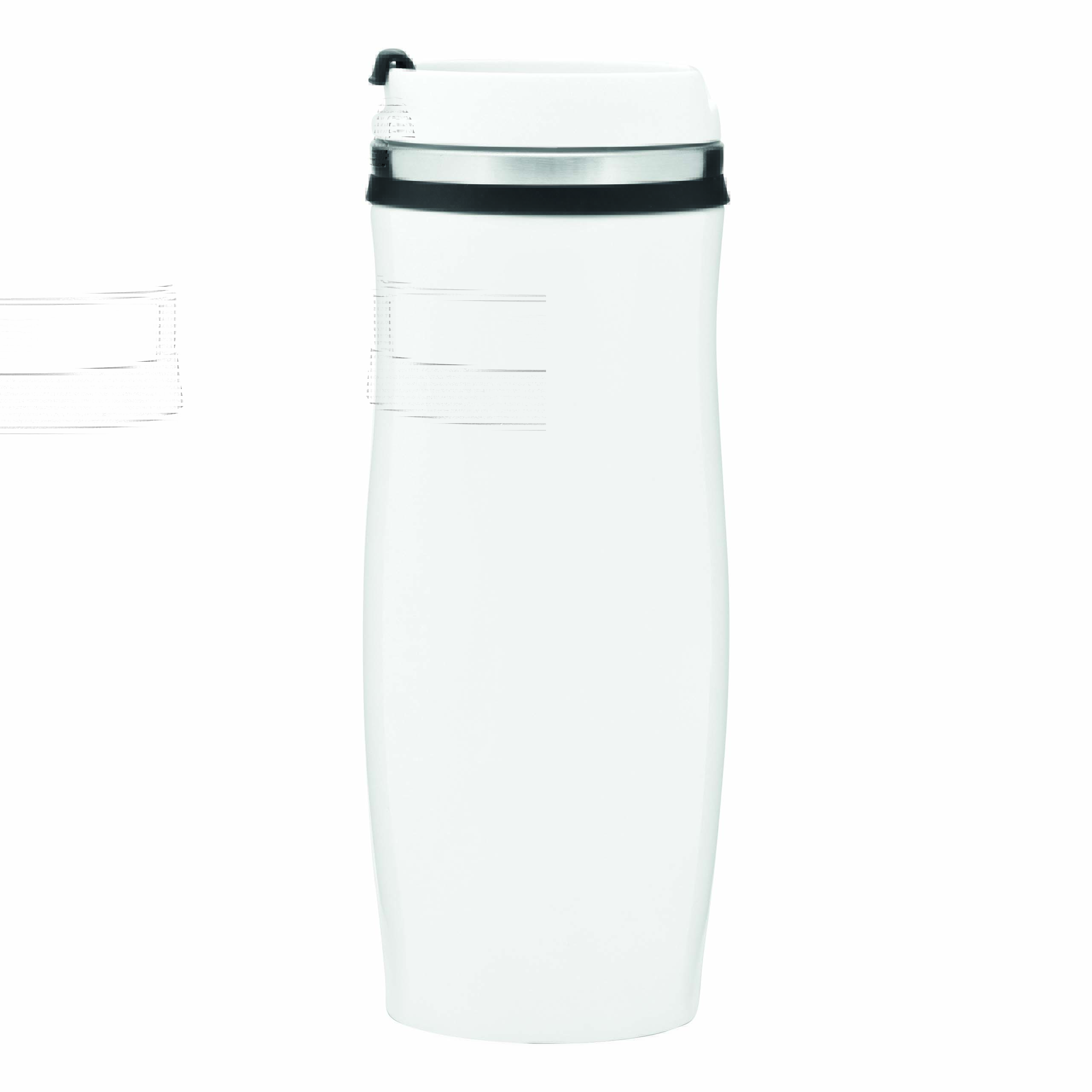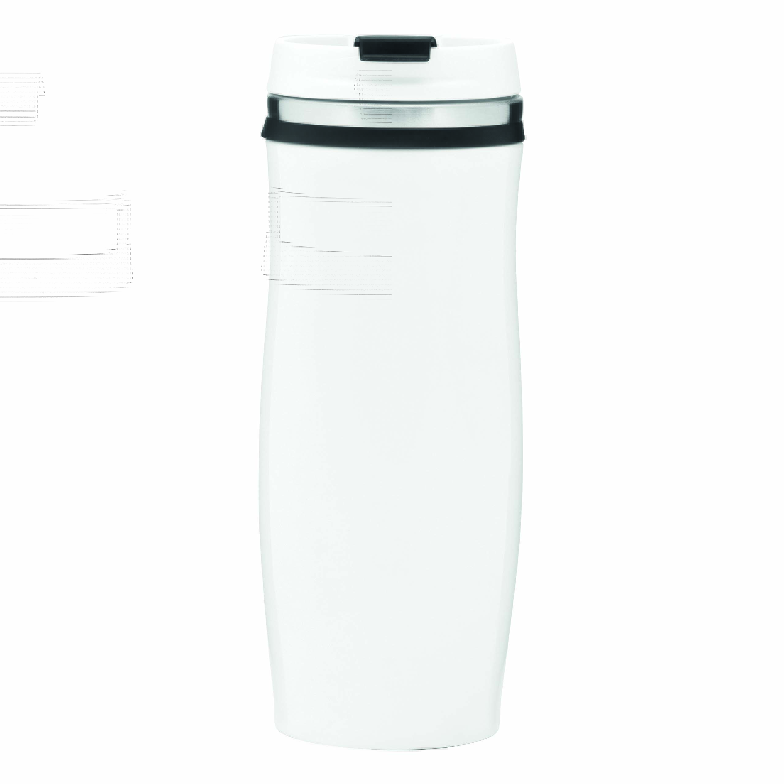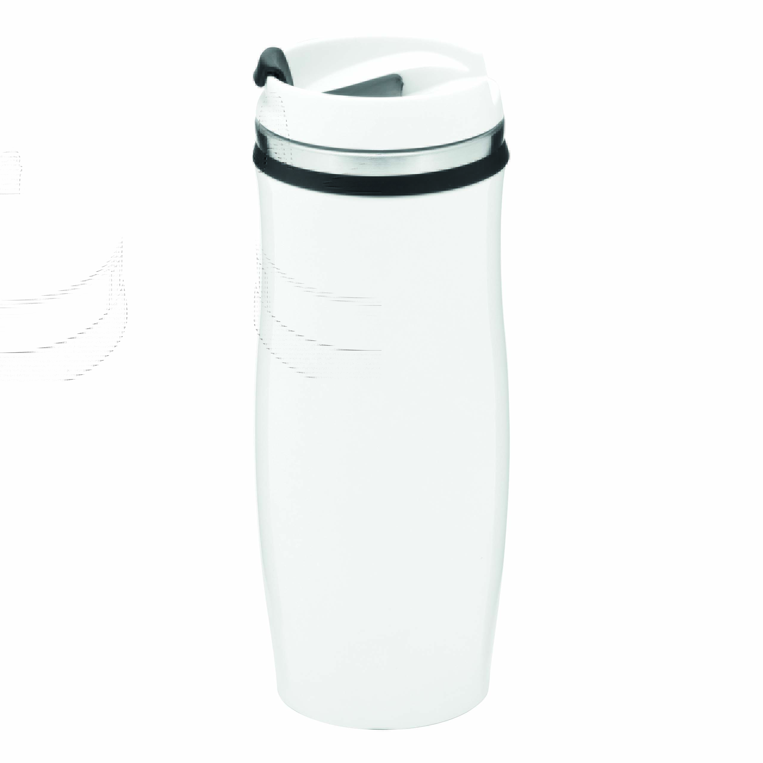 Kubek termiczny CREMA ze stali nierdzewnej wewnątrz i na zewnątrz. Z odkręcaną plastikową pokrywą i wbudowanym, składanym otworem do picia. Kolorowa guma wokół otworu, gumowany spód, pojemność ok. 400 ml.