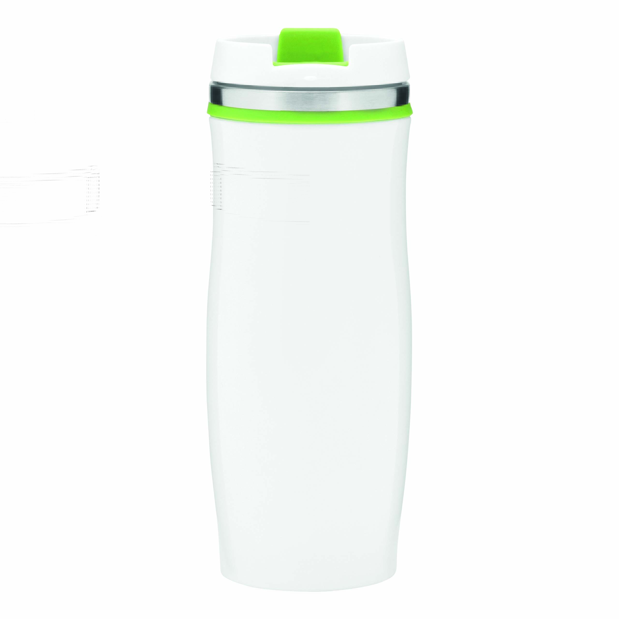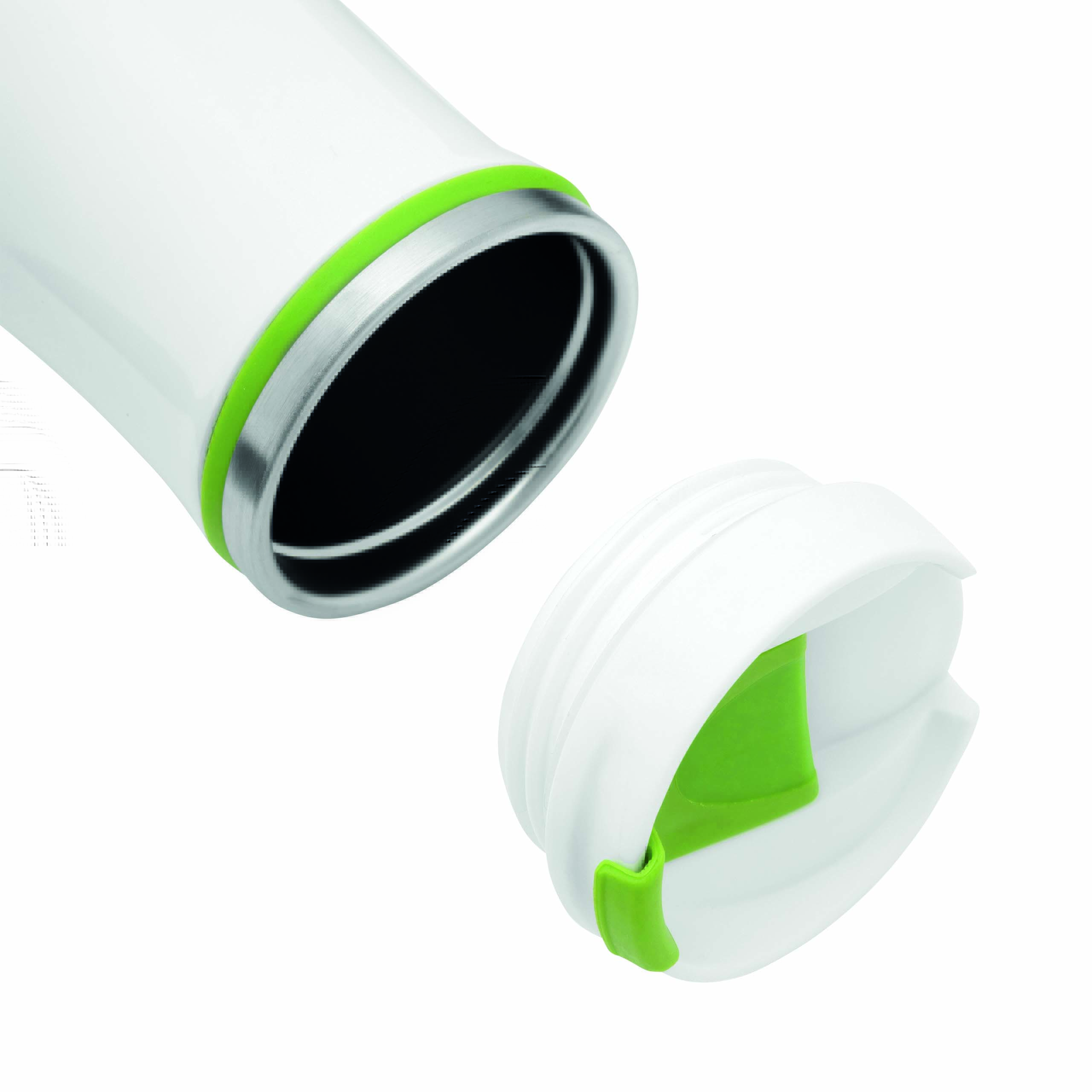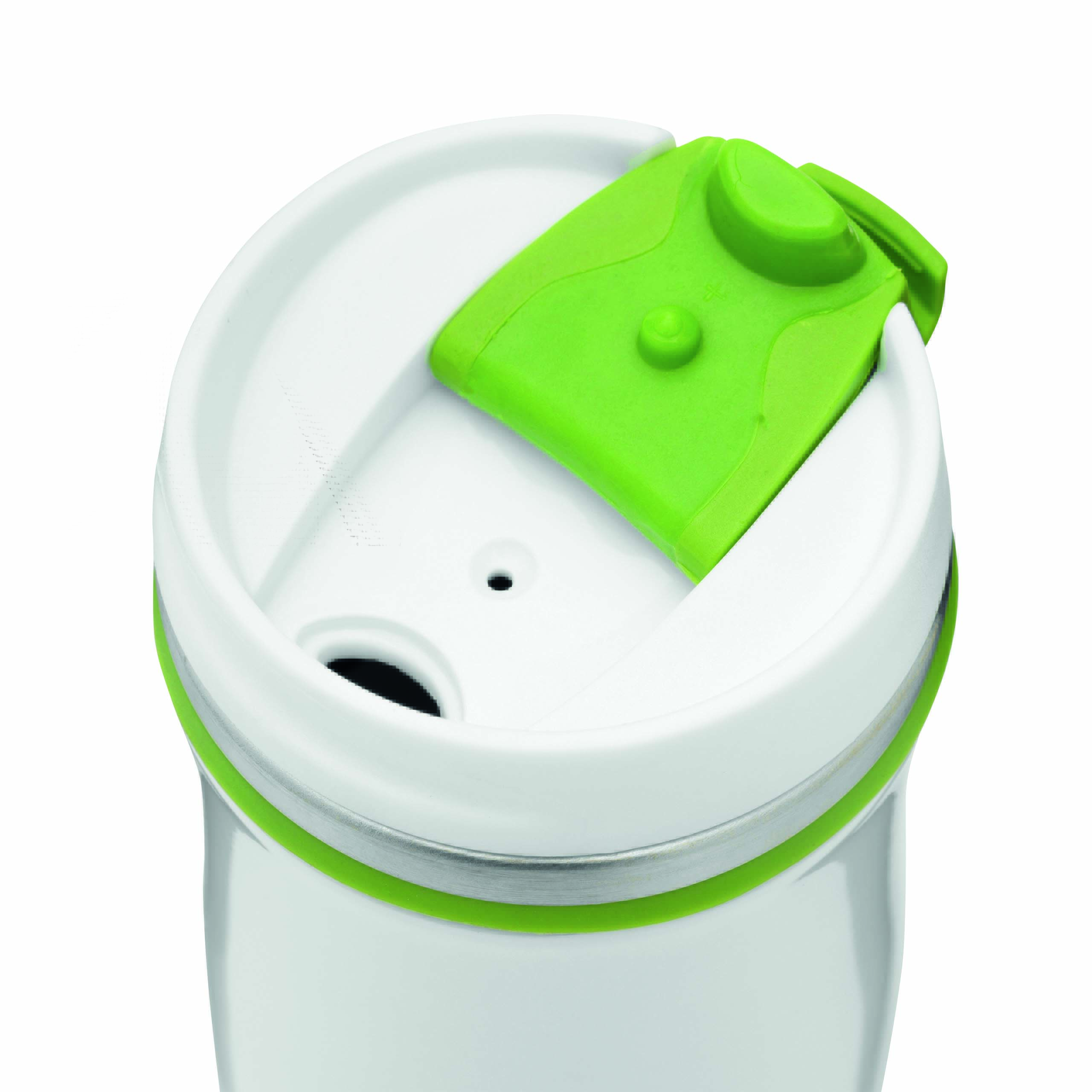 Kubek termiczny CREMA ze stali nierdzewnej wewnątrz i na zewnątrz. Z odkręcaną plastikową pokrywą i wbudowanym, składanym otworem do picia. Kolorowa guma wokół otworu, gumowany spód, pojemność ok. 400 ml.