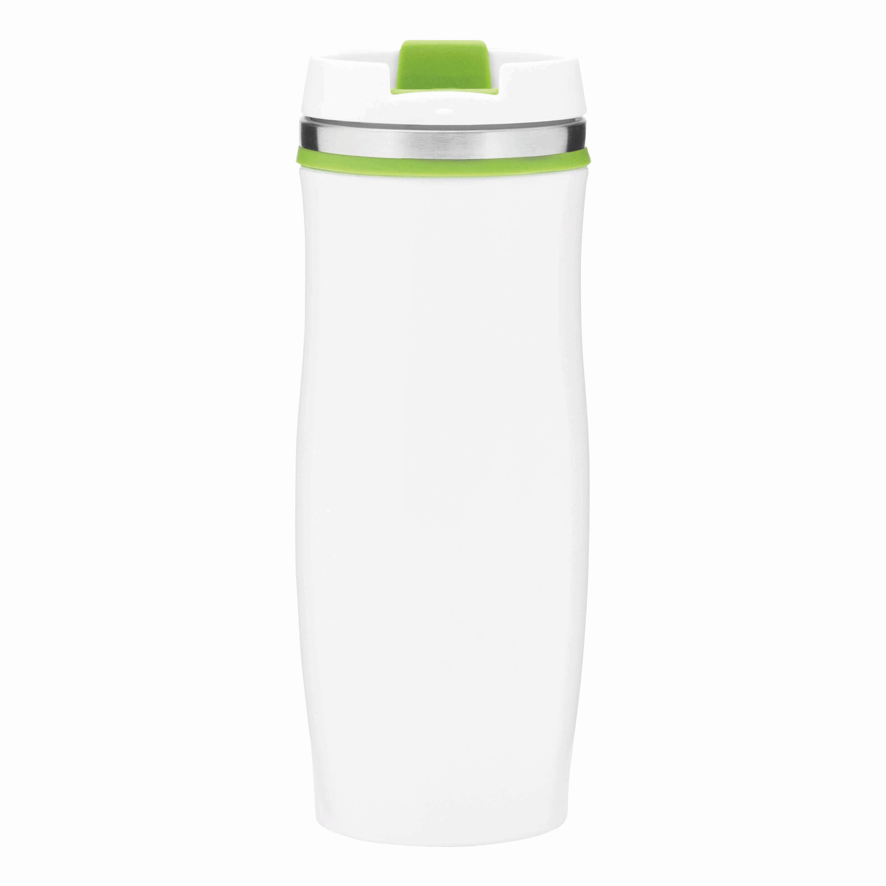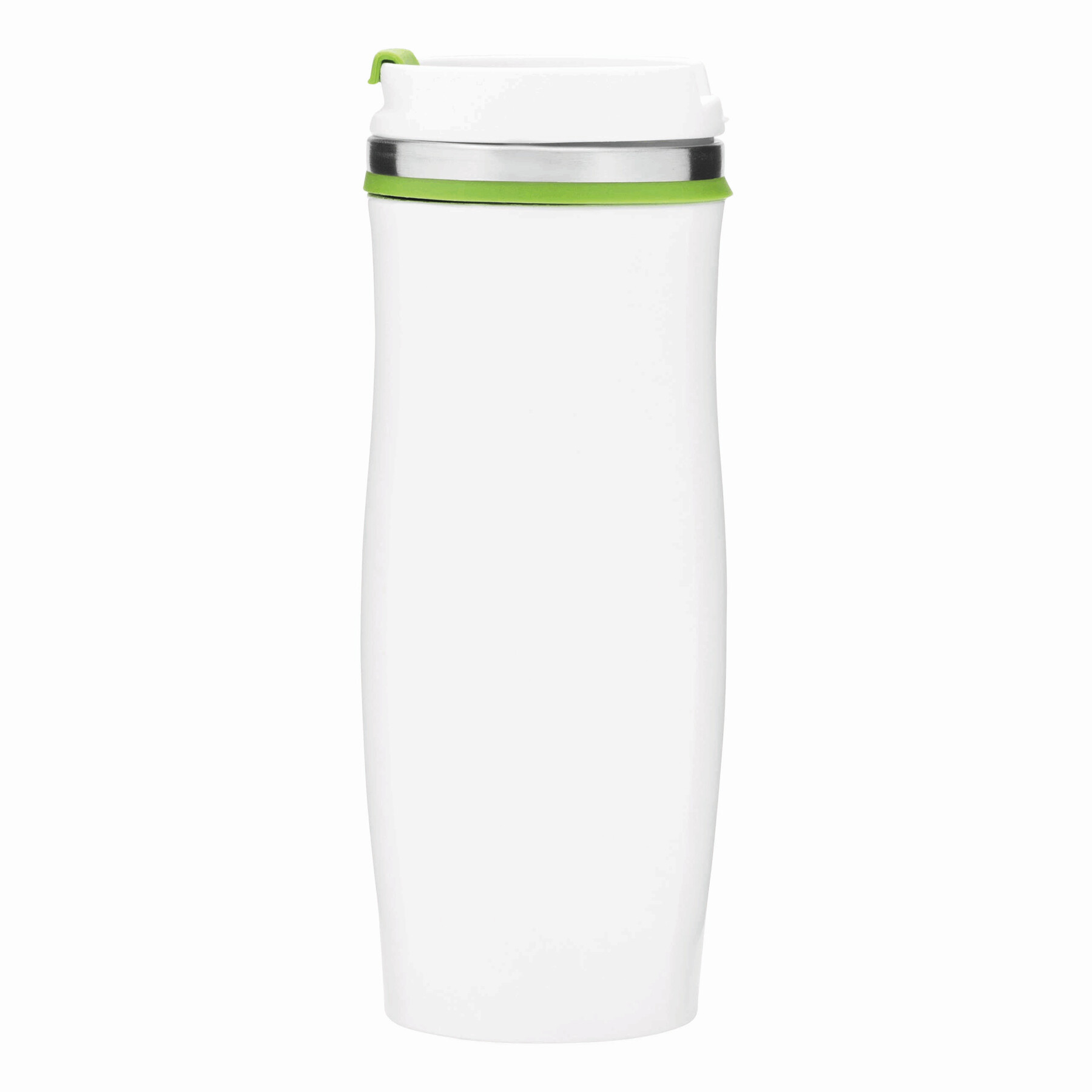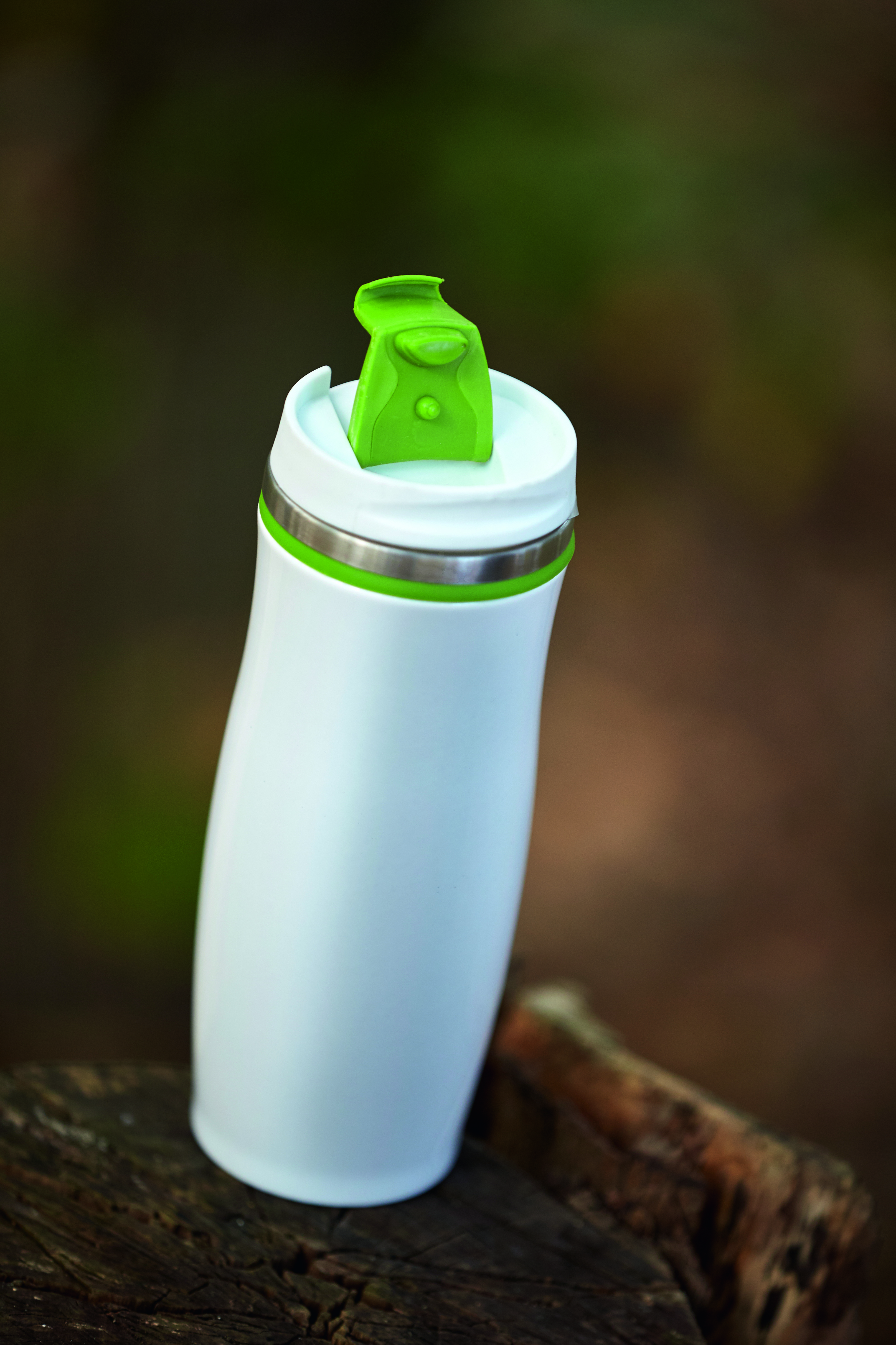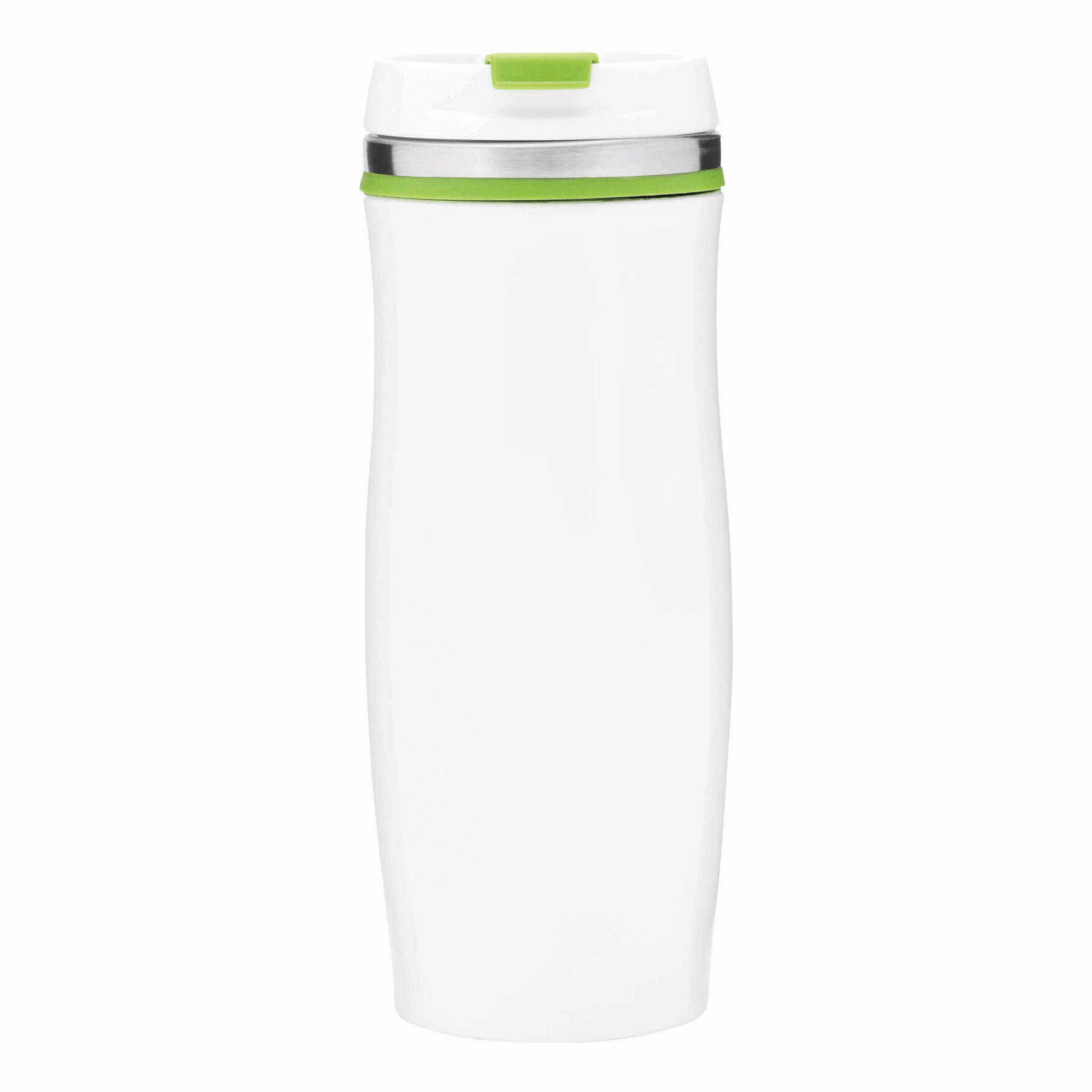 Kubek termiczny CREMA ze stali nierdzewnej wewnątrz i na zewnątrz. Z odkręcaną plastikową pokrywą i wbudowanym, składanym otworem do picia. Kolorowa guma wokół otworu, gumowany spód, pojemność ok. 400 ml.