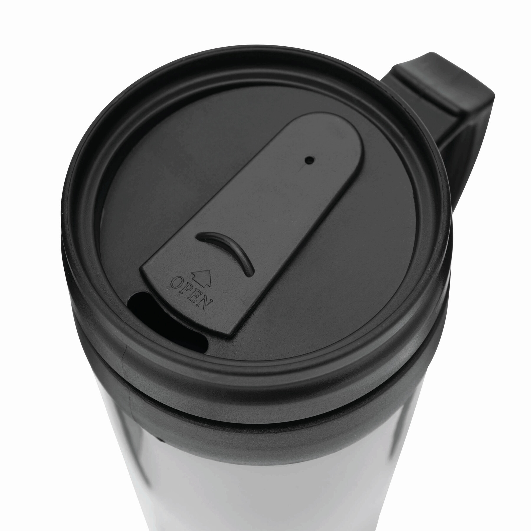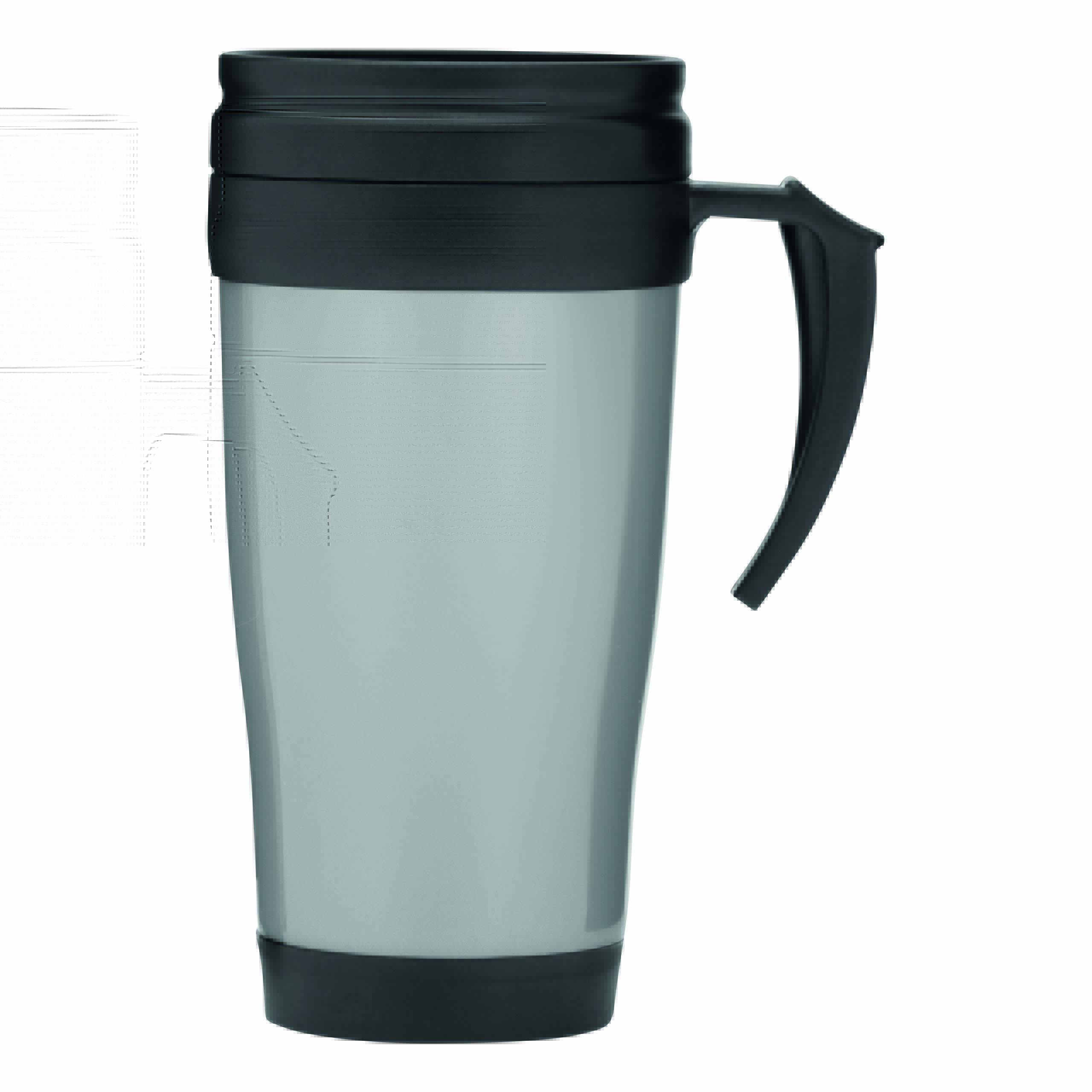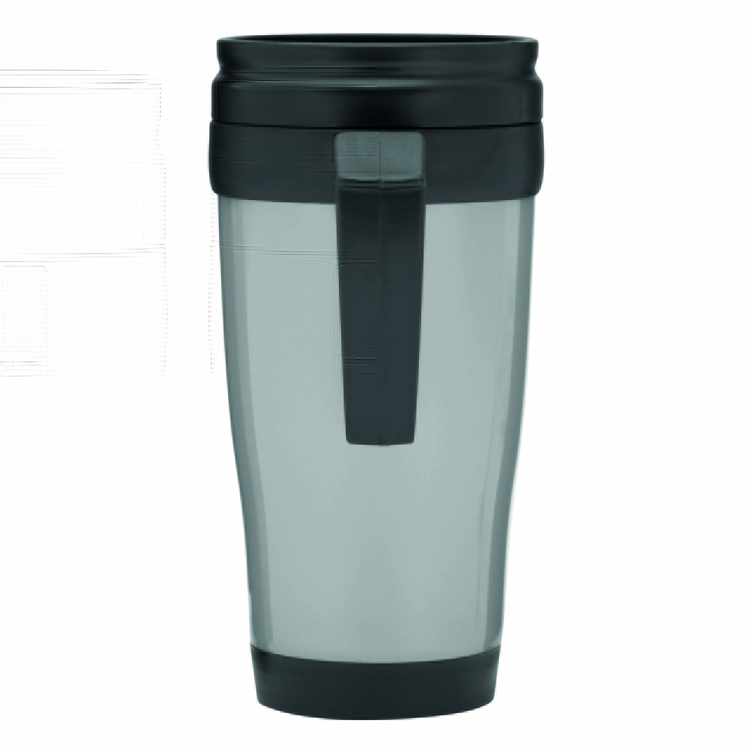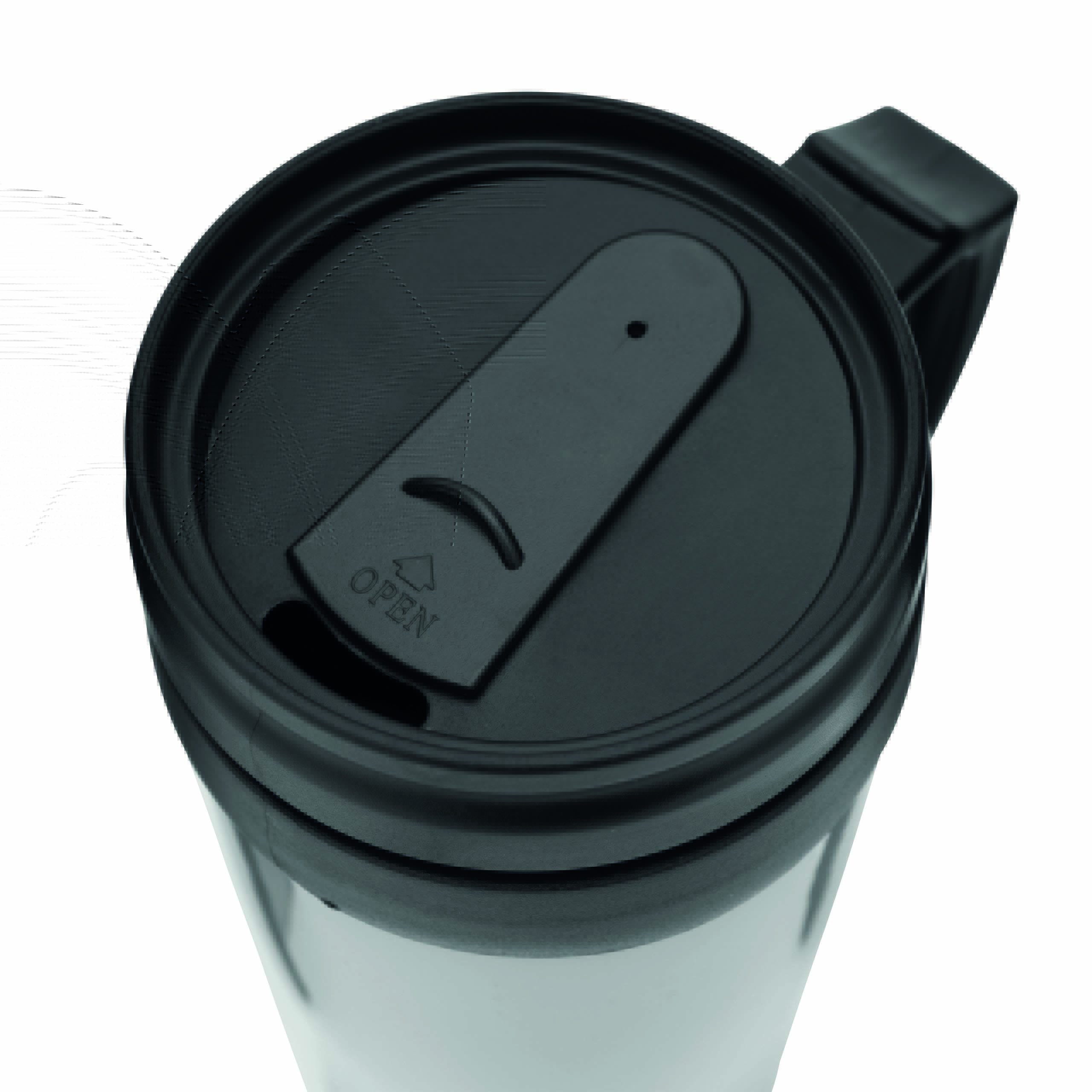 Kubek termoizolacyjny WARM-UP wykonany z plastiku wewnątrz i na zewnątrz. Z gumowaną powierzchnią do trzymania, z plastikowym wieczkiem i otworem do picia w wieczku, 400 ml.