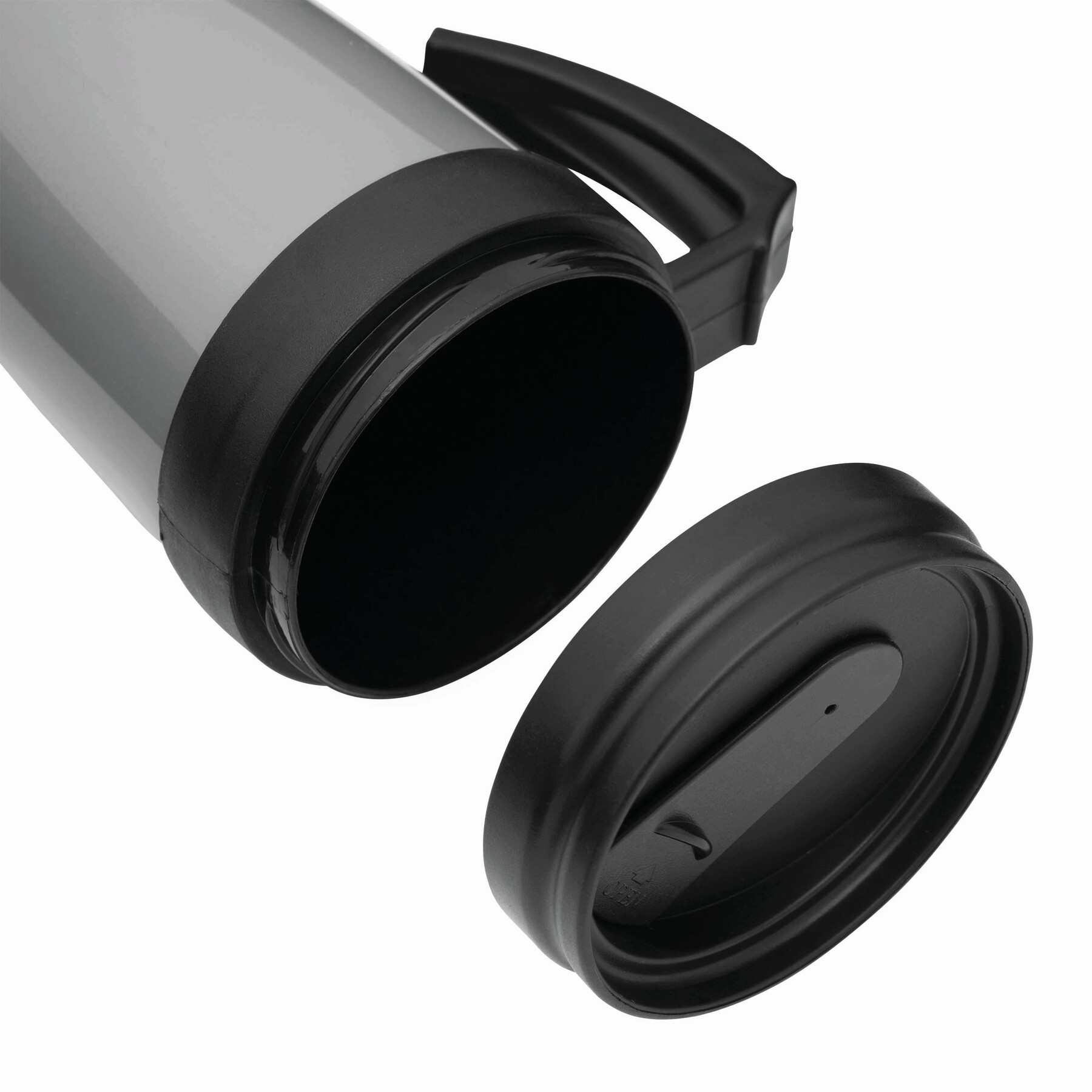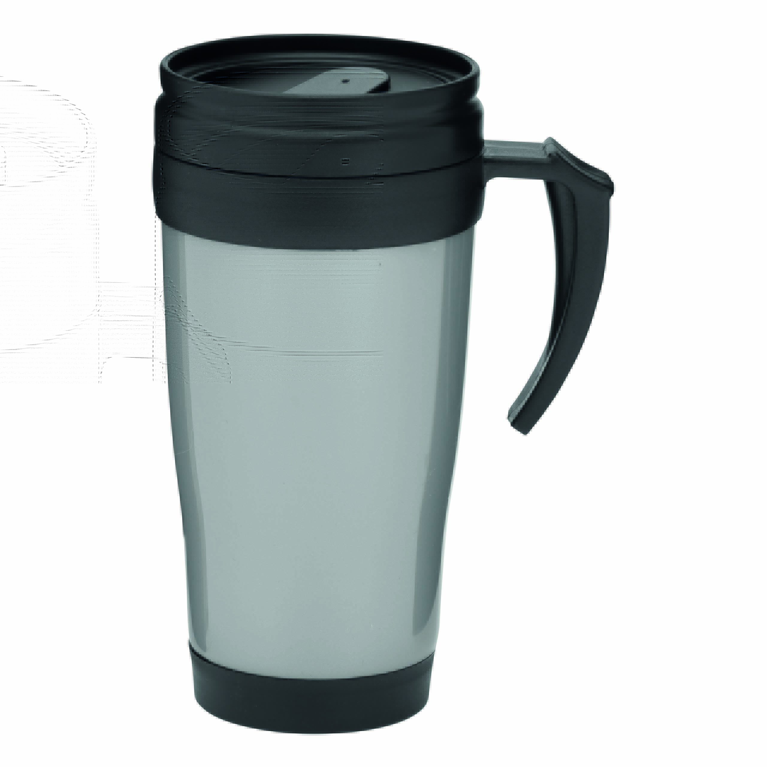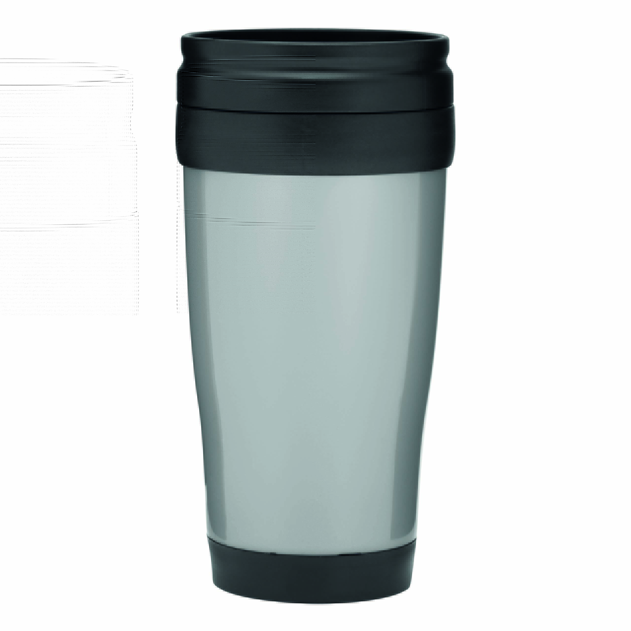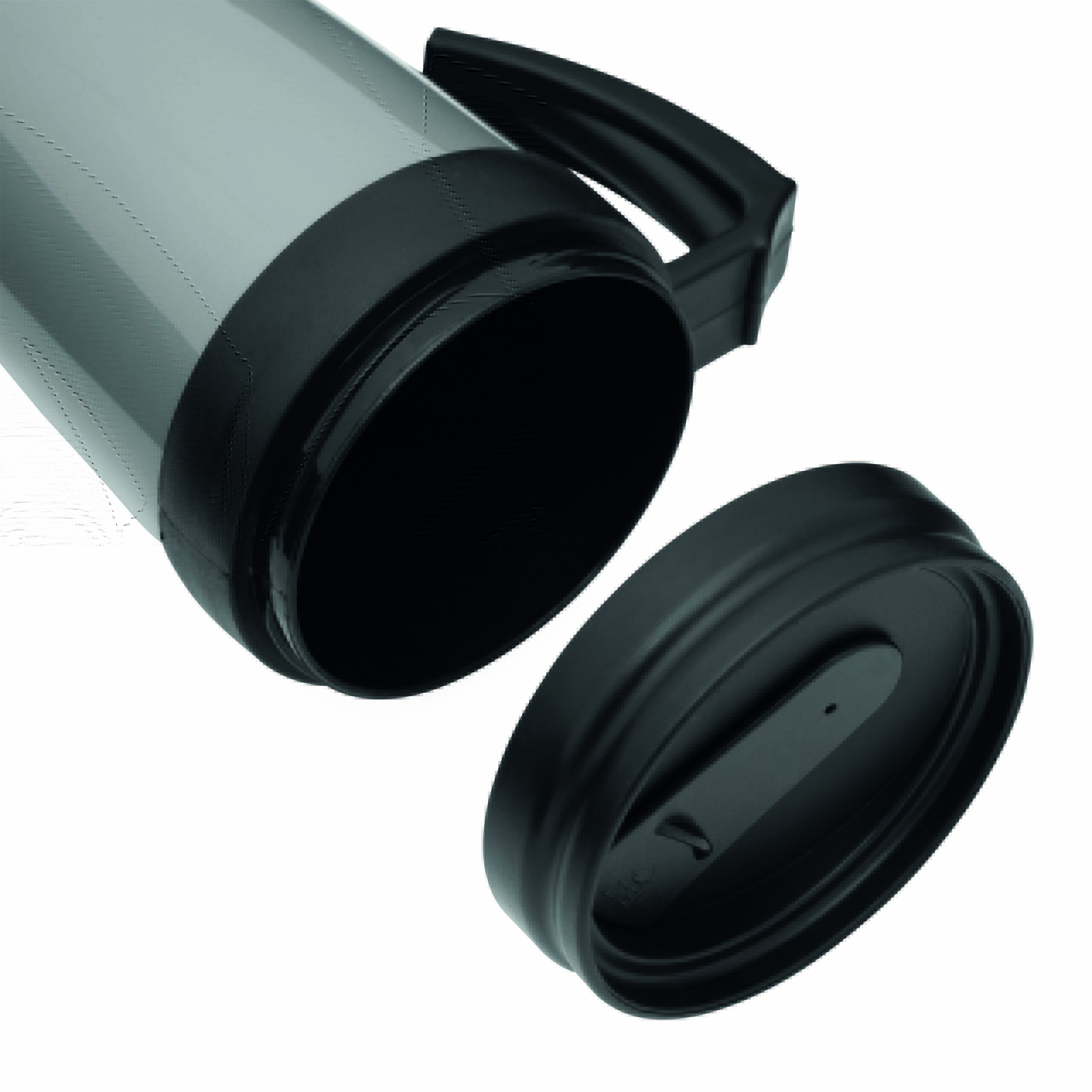 Kubek termoizolacyjny WARM-UP wykonany z plastiku wewnątrz i na zewnątrz. Z gumowaną powierzchnią do trzymania, z plastikowym wieczkiem i otworem do picia w wieczku, 400 ml.