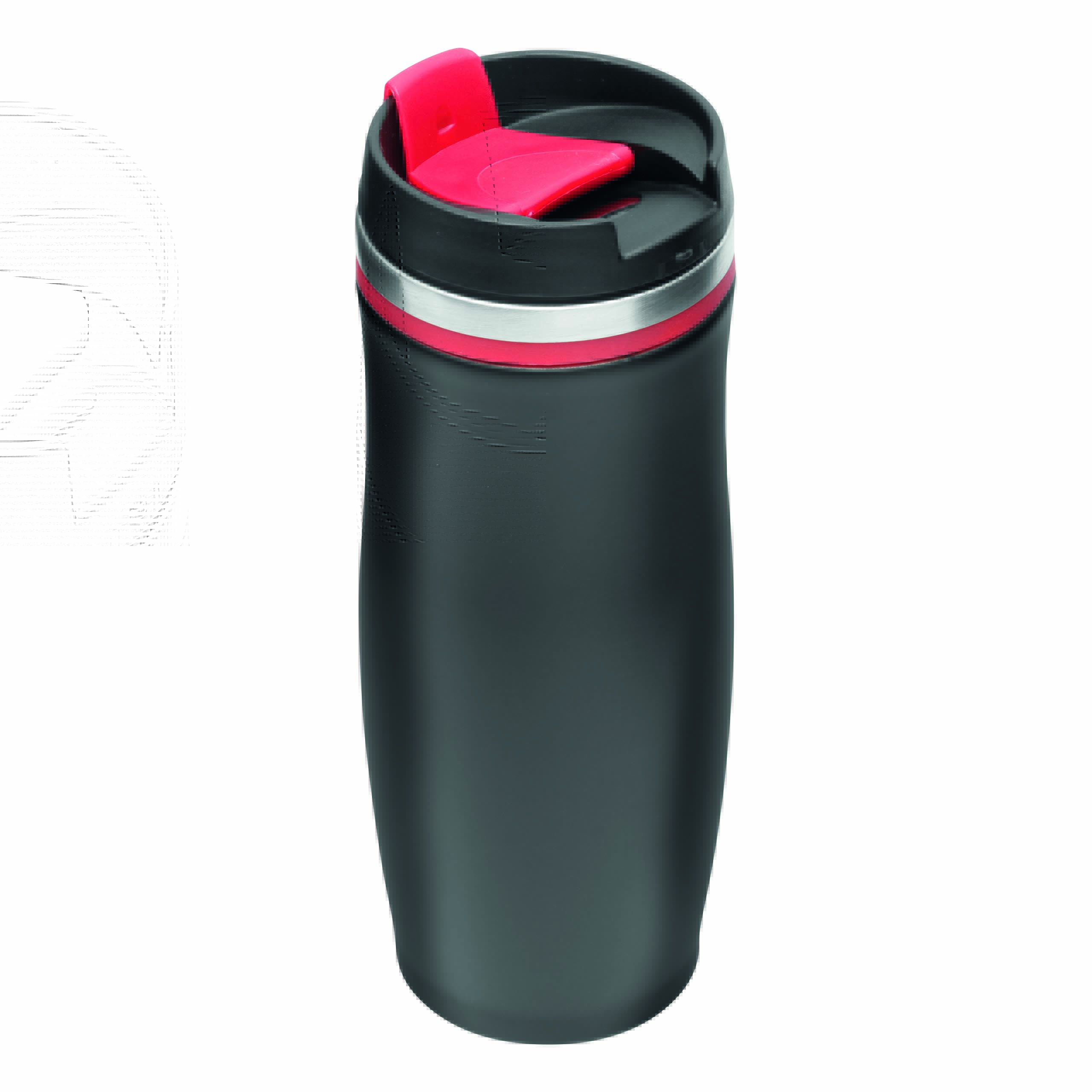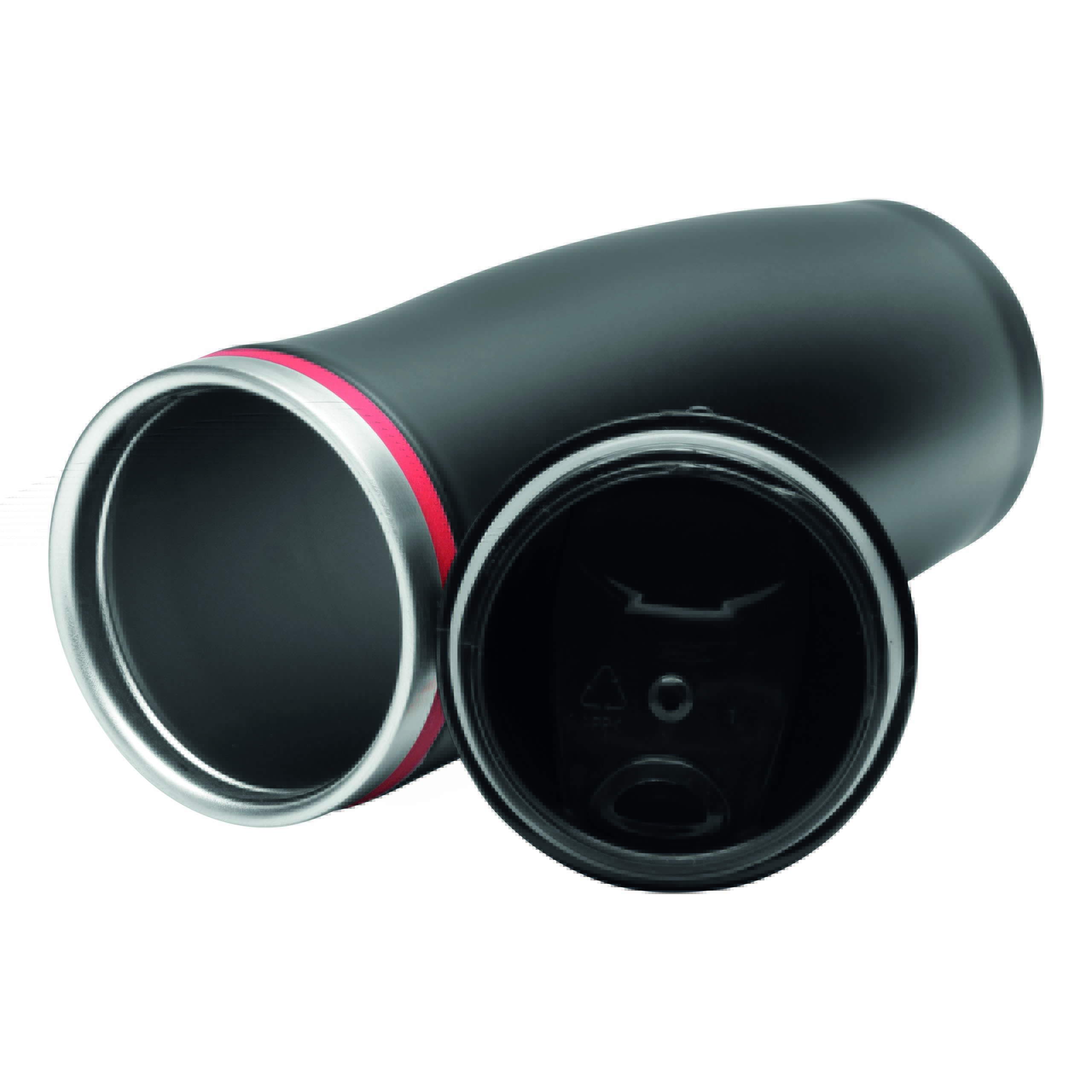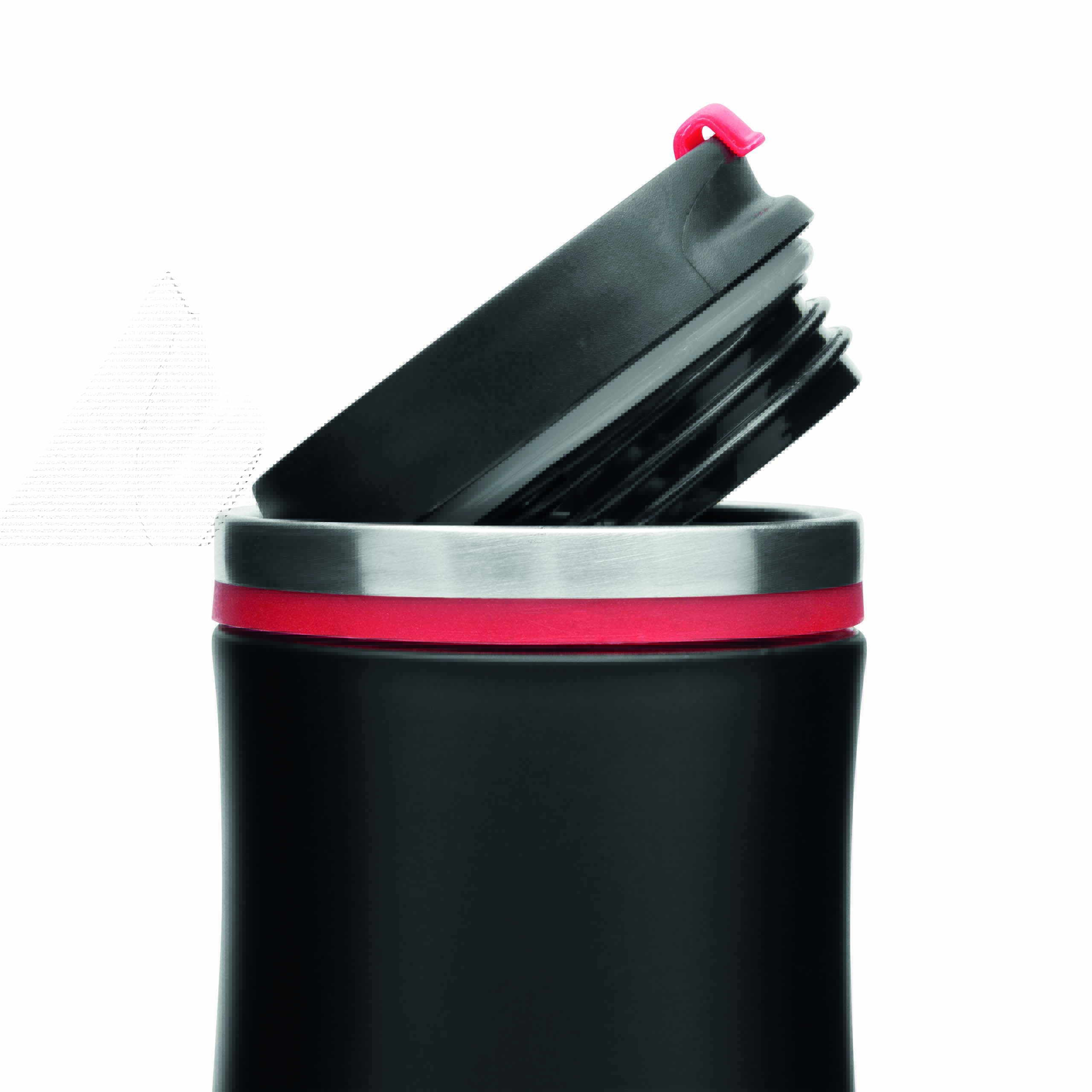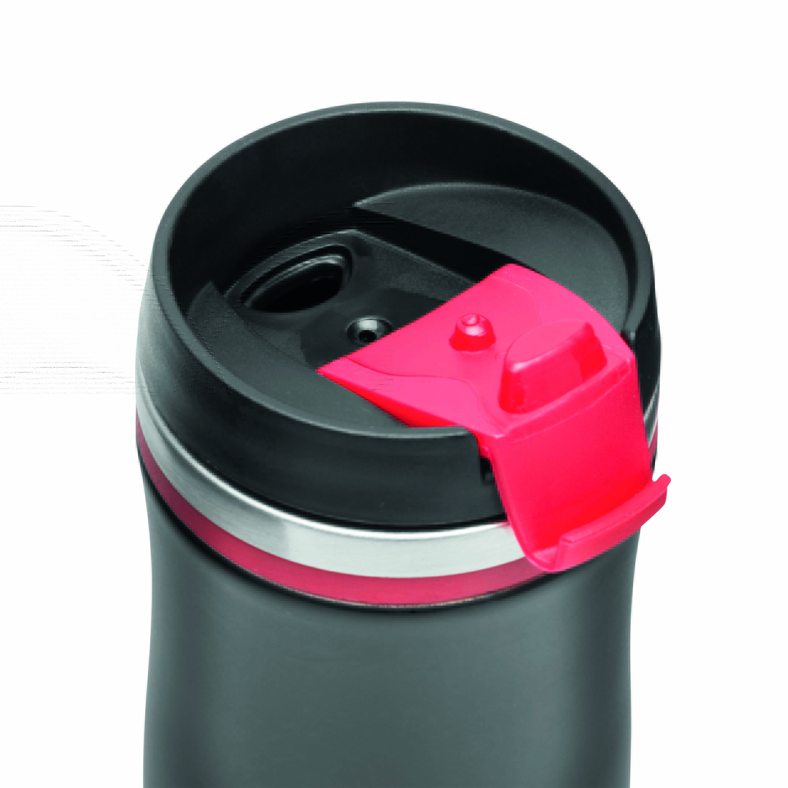 Kubek termiczny o podwójnych ściankach DARK CREMA. Wewnątrz i na zewnątrz stal nierdzewna. Odkręcana plastikowa pokrywa z wbudowanym, składanym otworem do picia, kolorowy gumowy pierścień wokół otworu i gumowany spód dla lepszej przyczepności, pojemność ok. 400 ml.