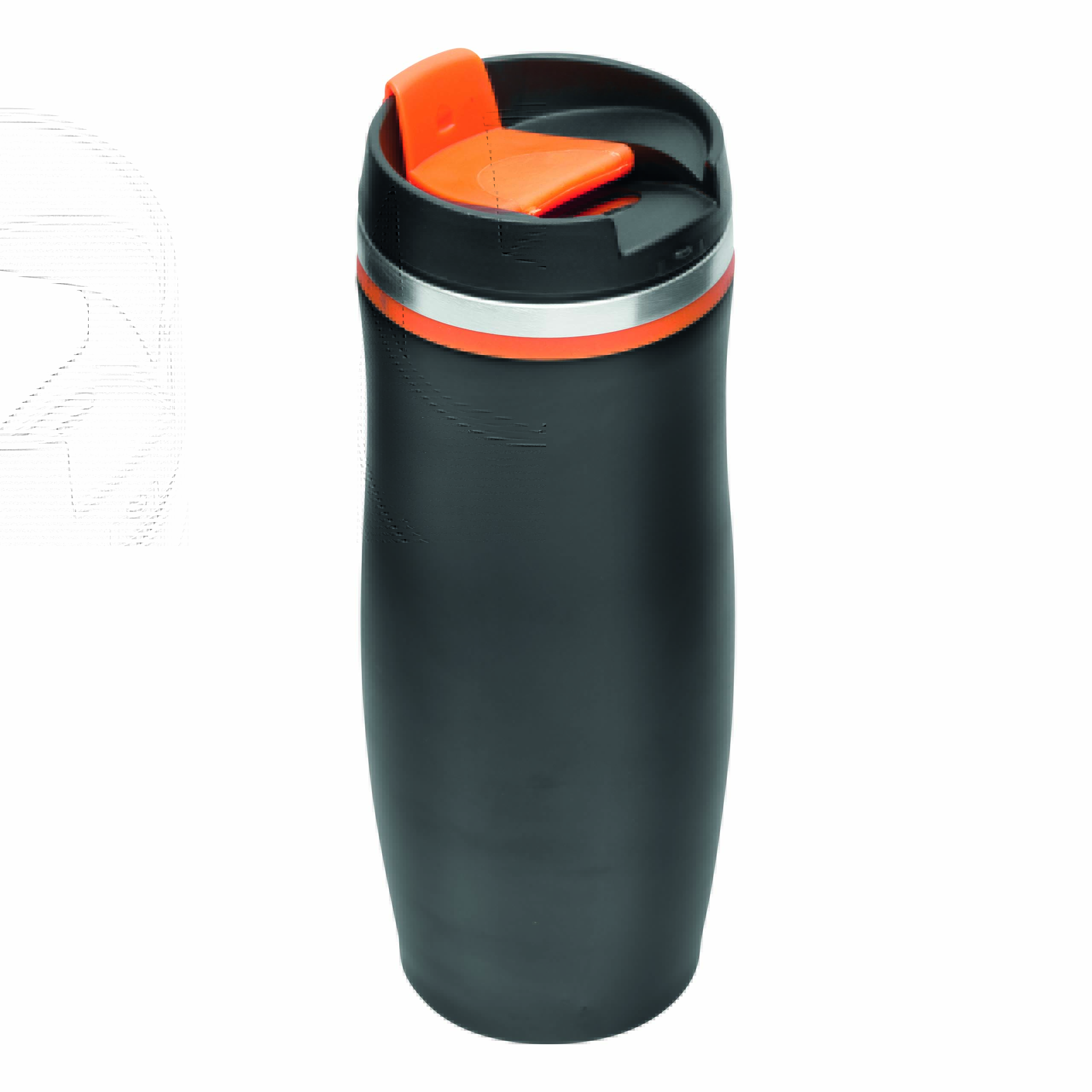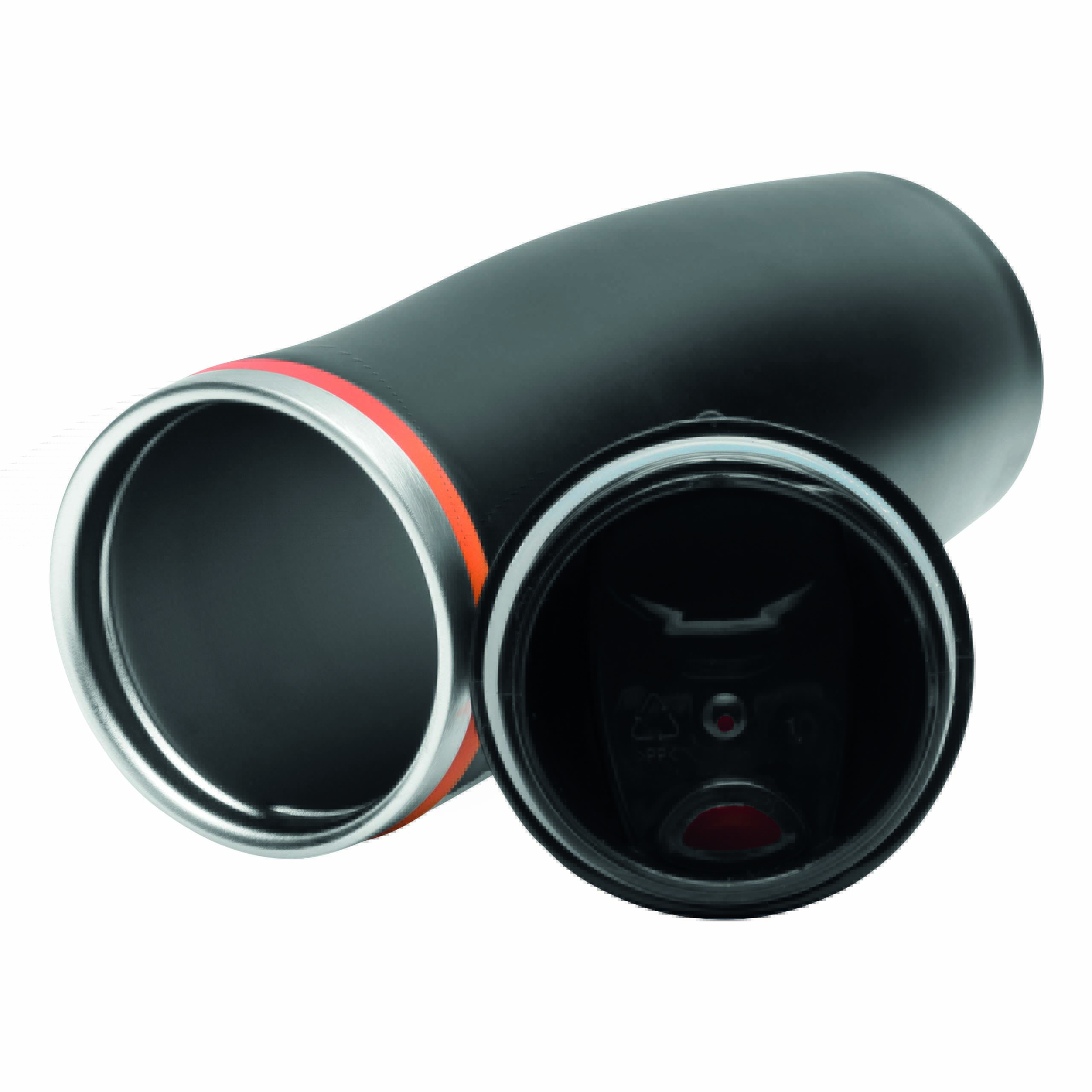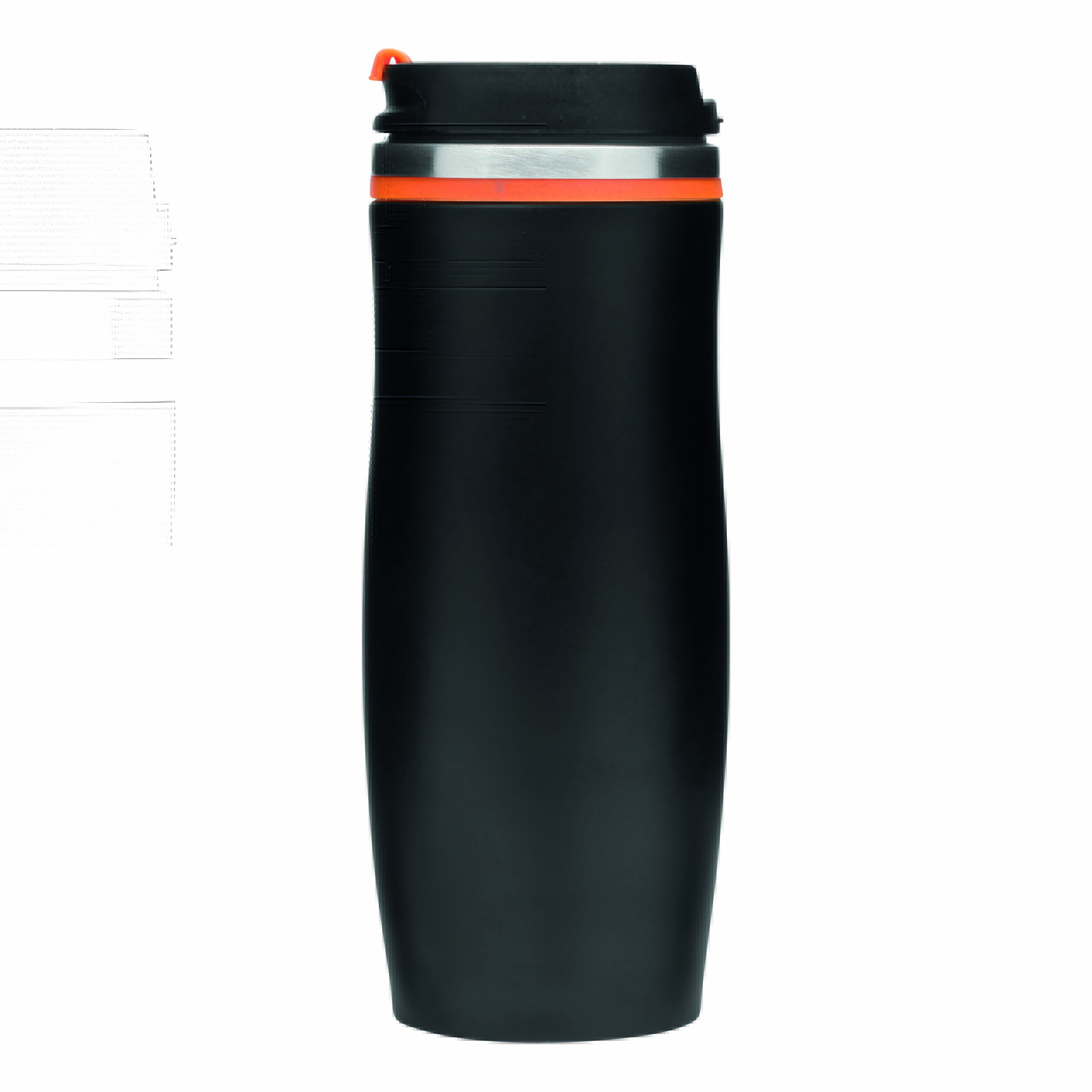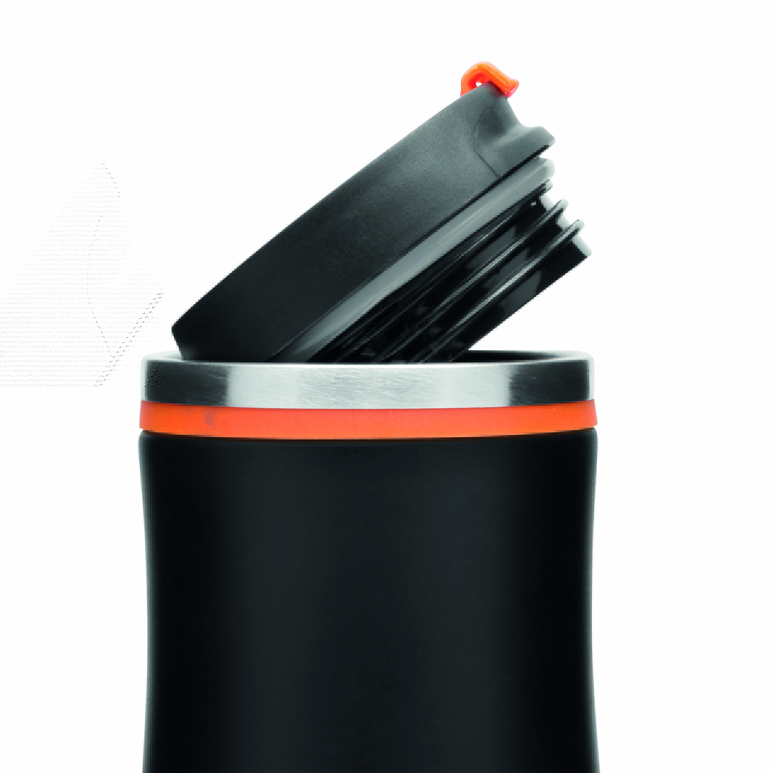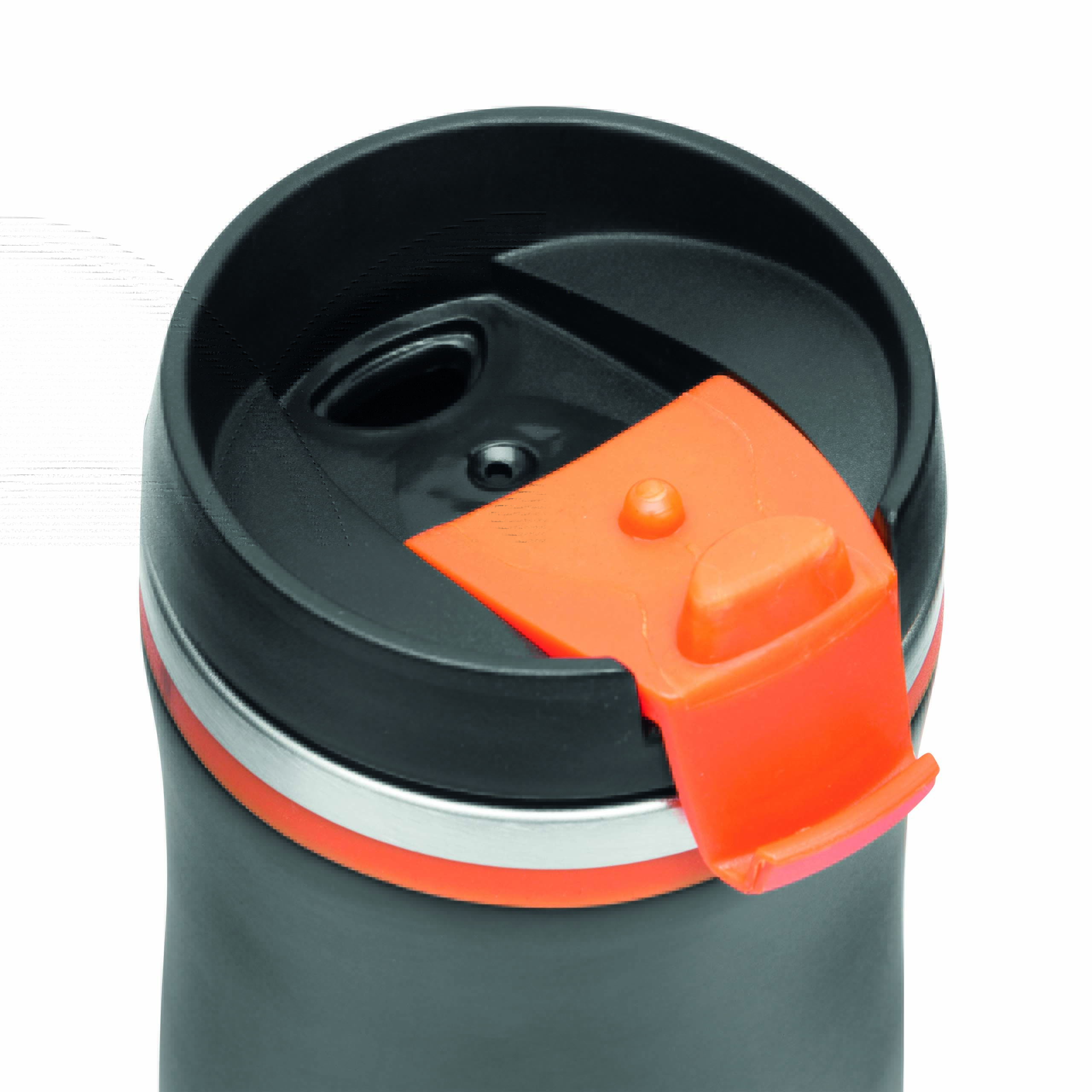 Kubek termiczny o podwójnych ściankach DARK CREMA. Wewnątrz i na zewnątrz stal nierdzewna. Odkręcana plastikowa pokrywa z wbudowanym, składanym otworem do picia, kolorowy gumowy pierścień wokół otworu i gumowany spód dla lepszej przyczepności, pojemność ok. 400 ml.
