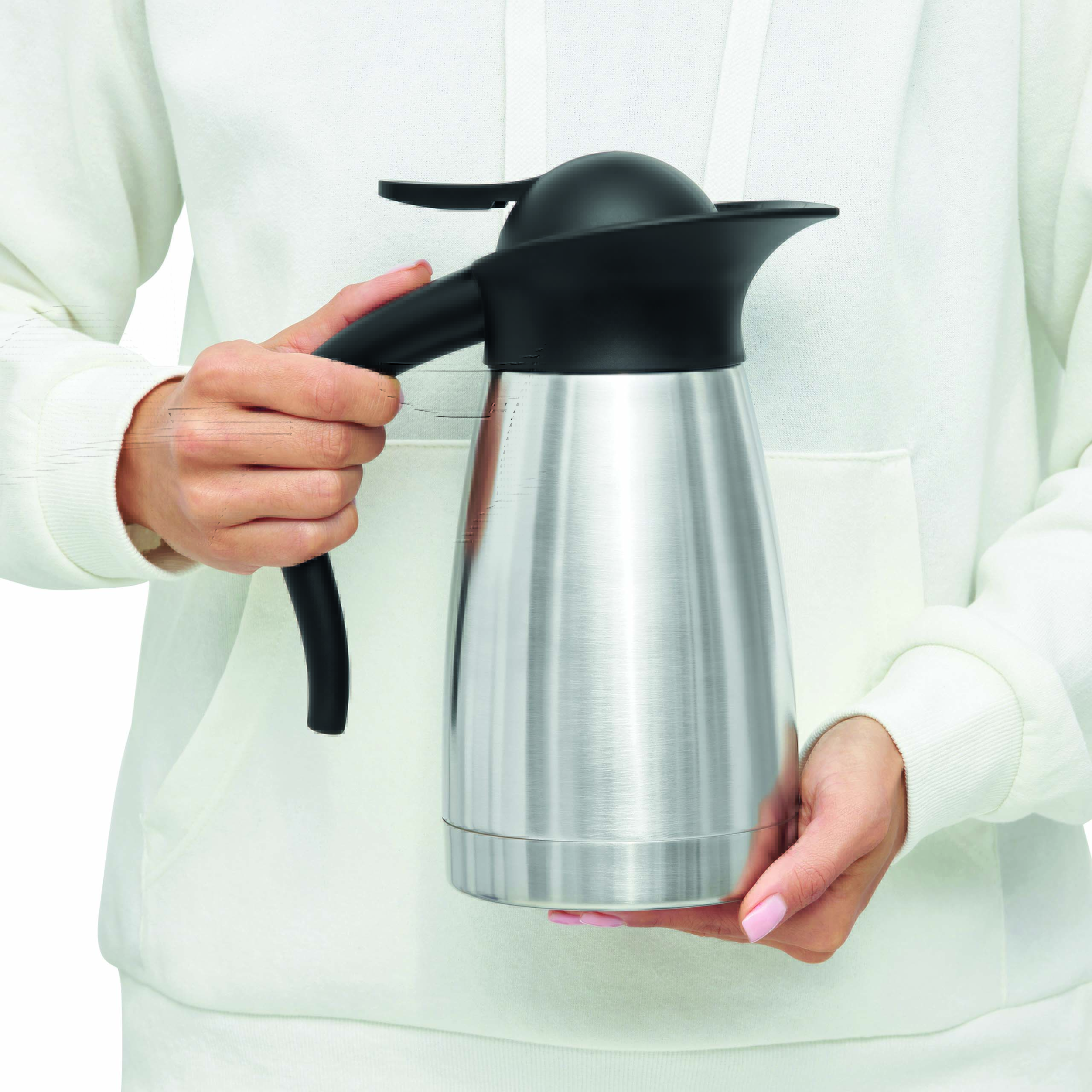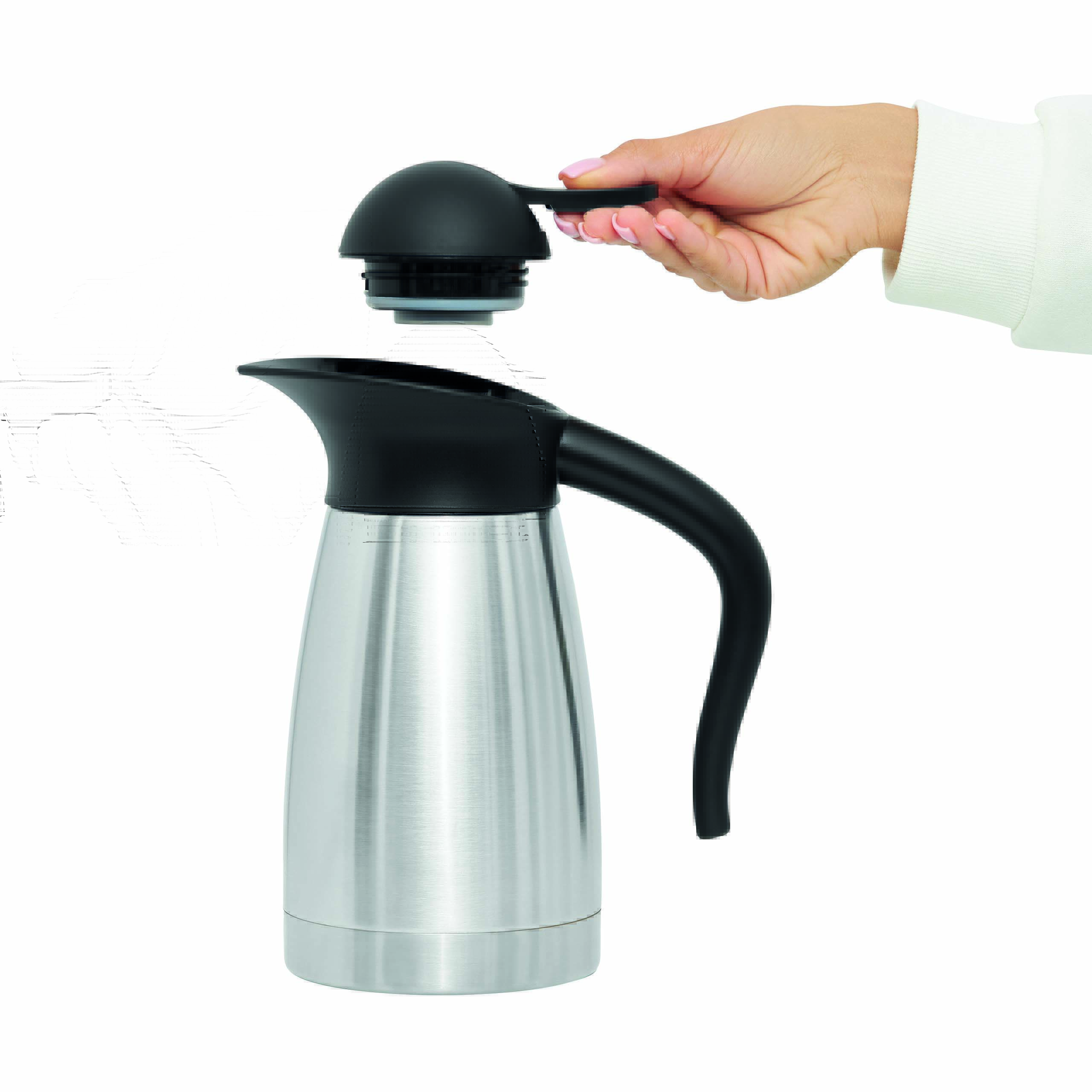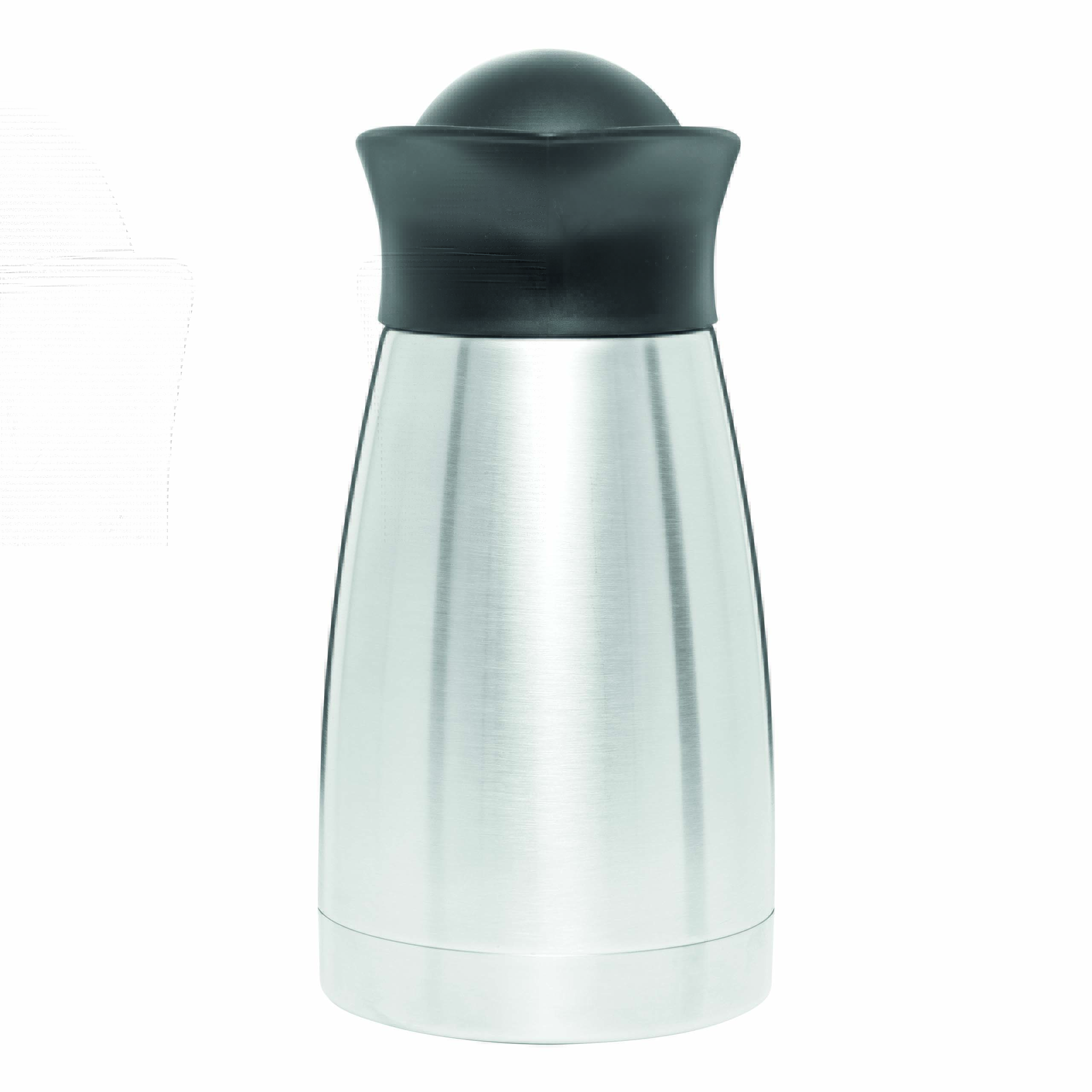 Dwuścienny dzbanek próżniowy AWAKE ze stali nierdzewnej. Nakrętka z przyciskiem do nalewania jedną ręką. Pojemność ok. 1 l. W pudełku upominkowym.