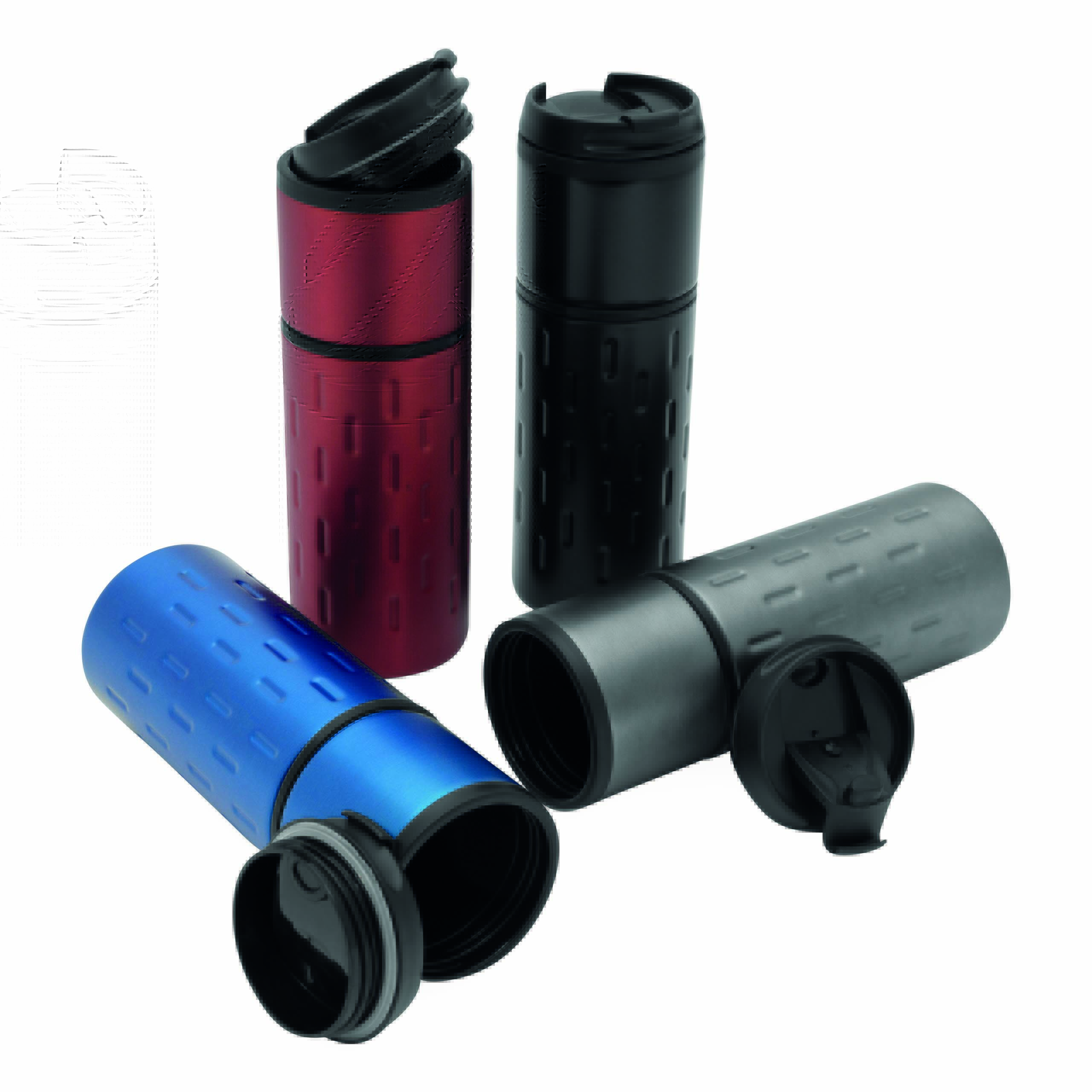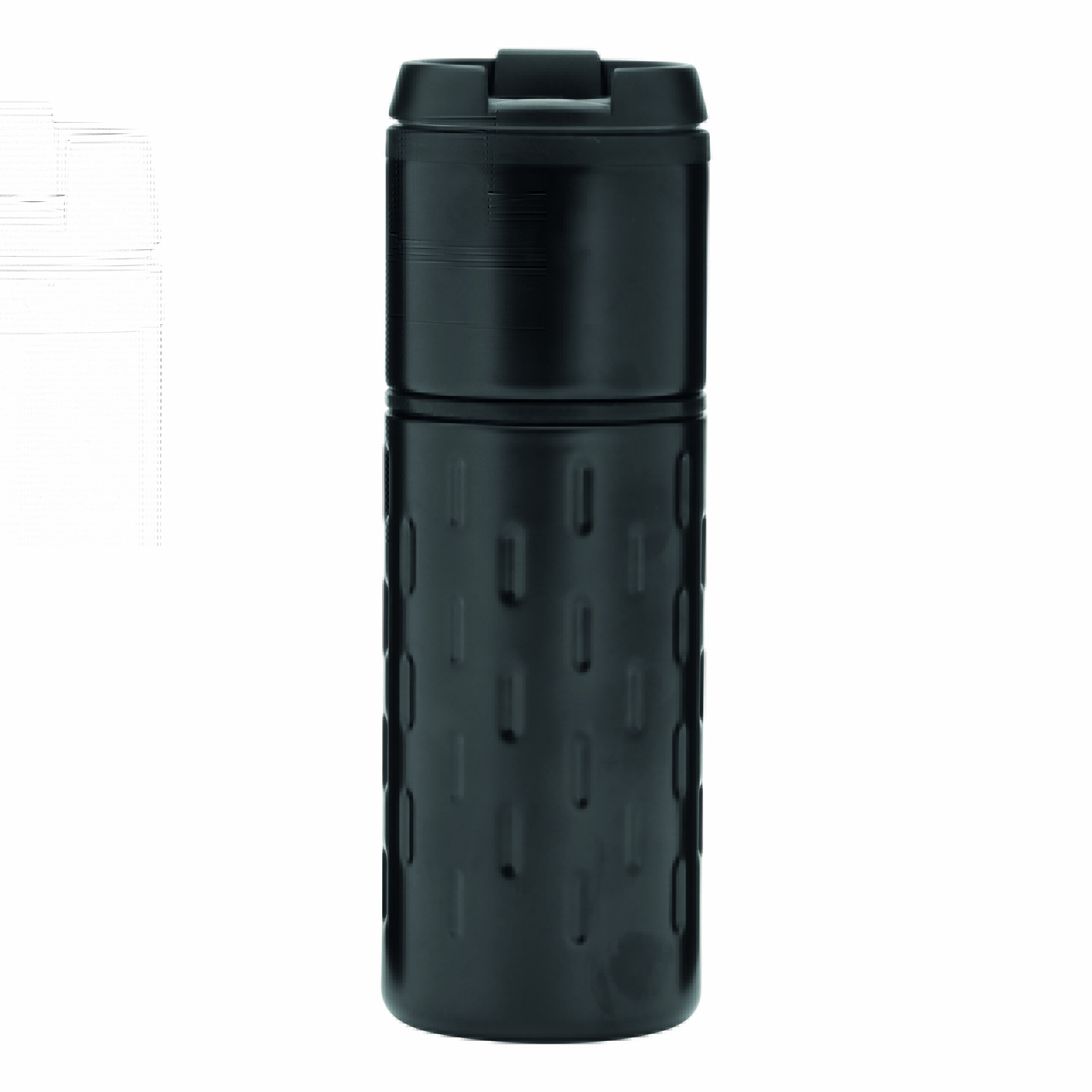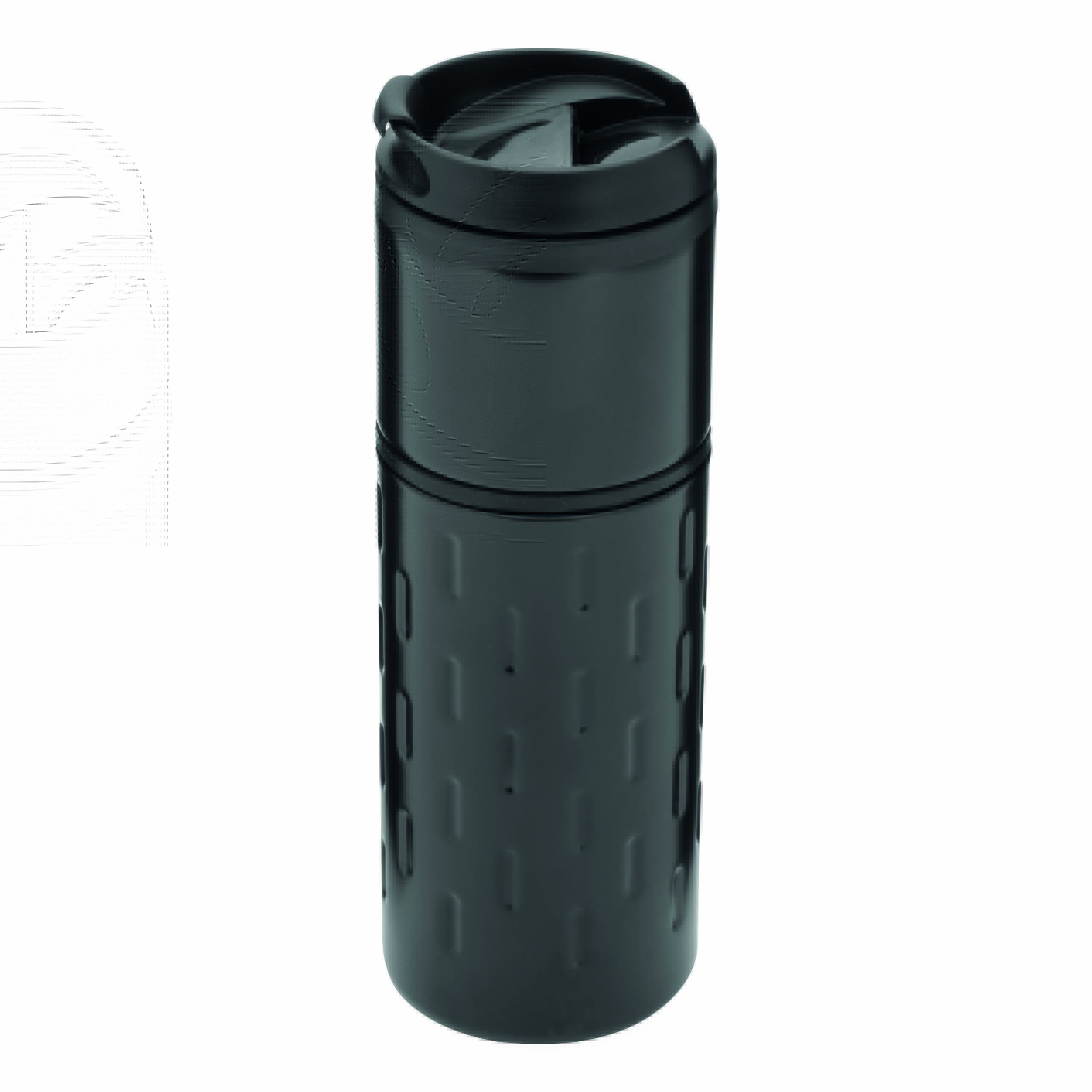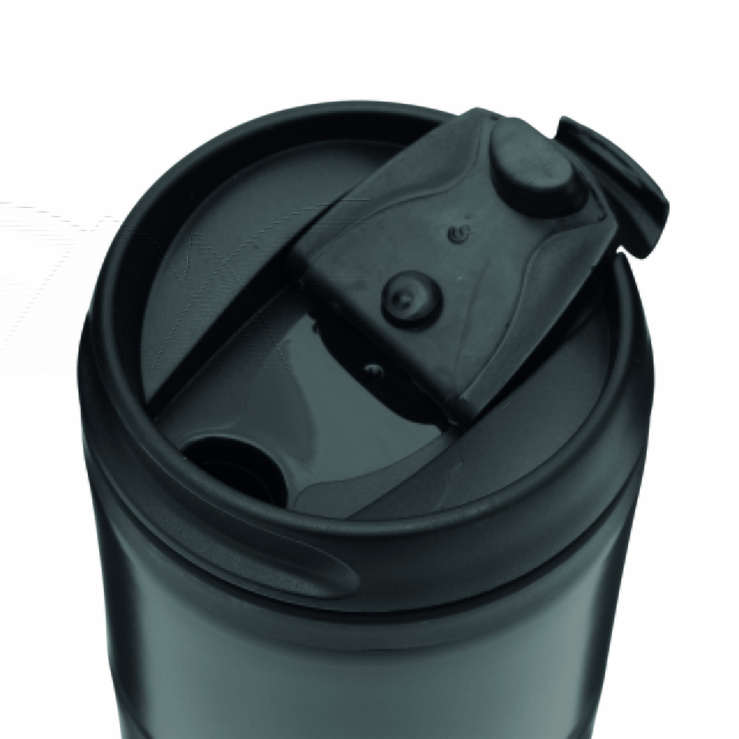 Kubek termiczny o podwójnych ściankach EXCLUSIVE LIQUID. Na zewnątrz stal nierdzewna o futurystycznym wzornictwie z silikonowym pierścieniem, wewnątrz plastik, odkręcana plastikowa pokrywa z wbudowanym, składanym otworem do picia, gumowany spód dla lepszej przyczepności, pojemność ok. 400 ml.