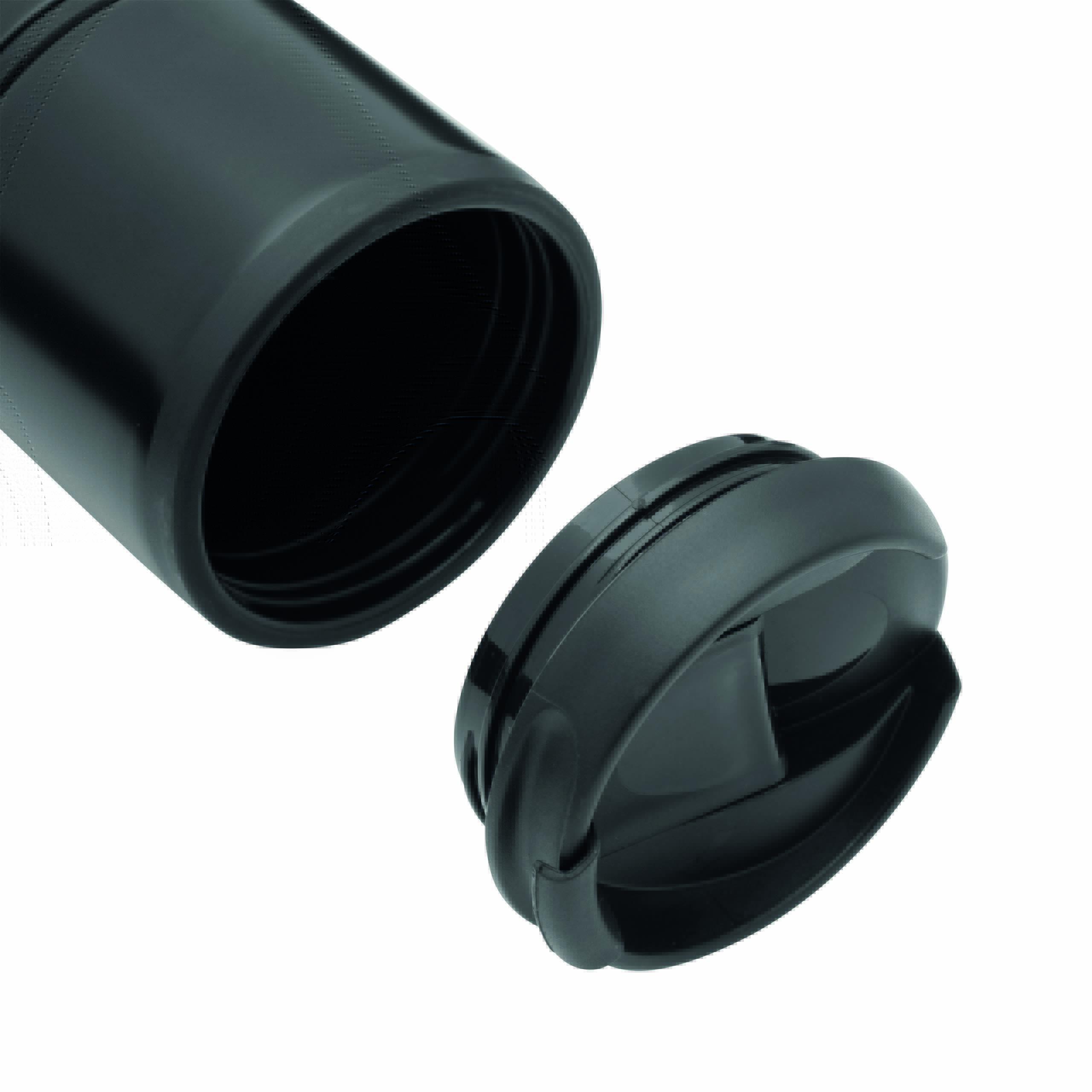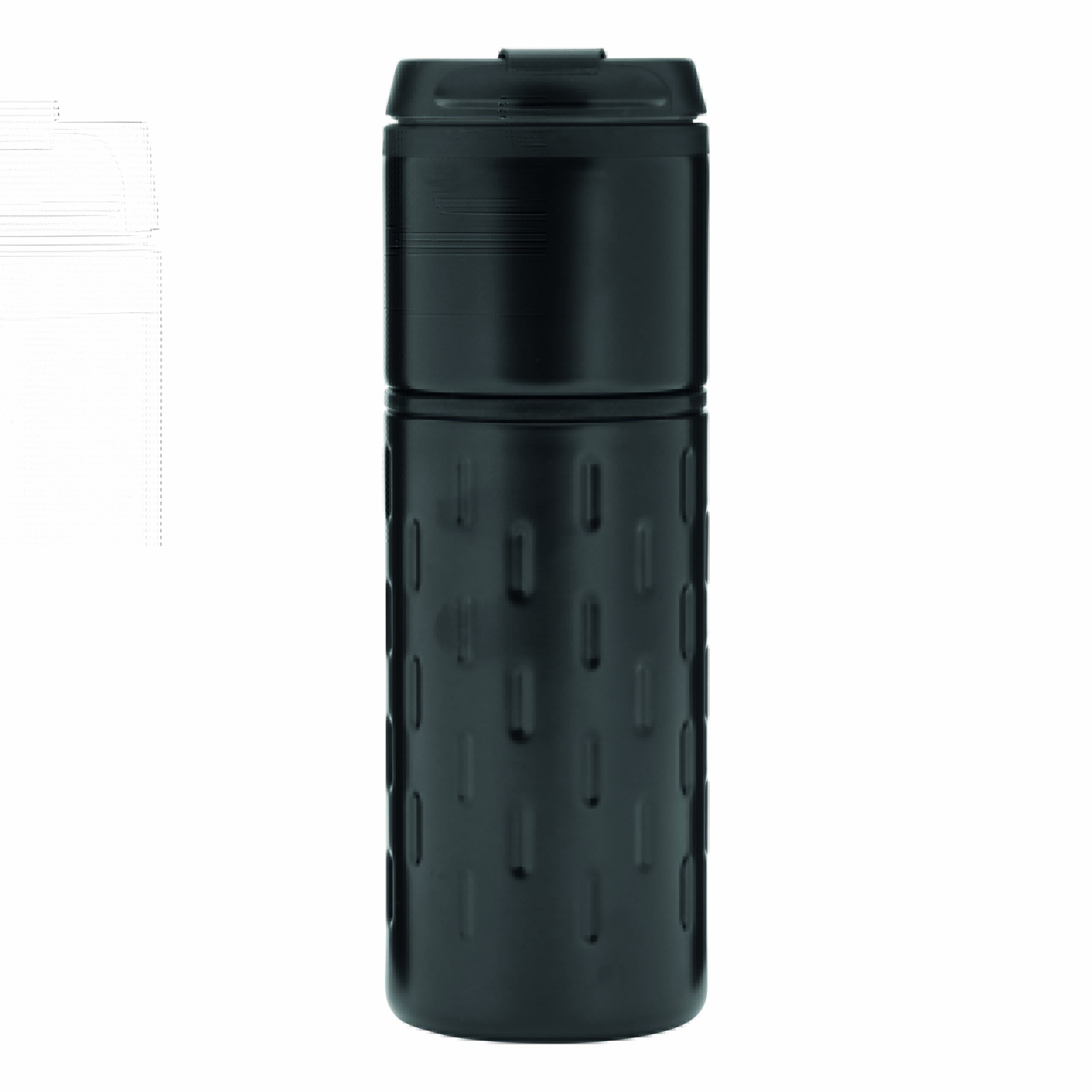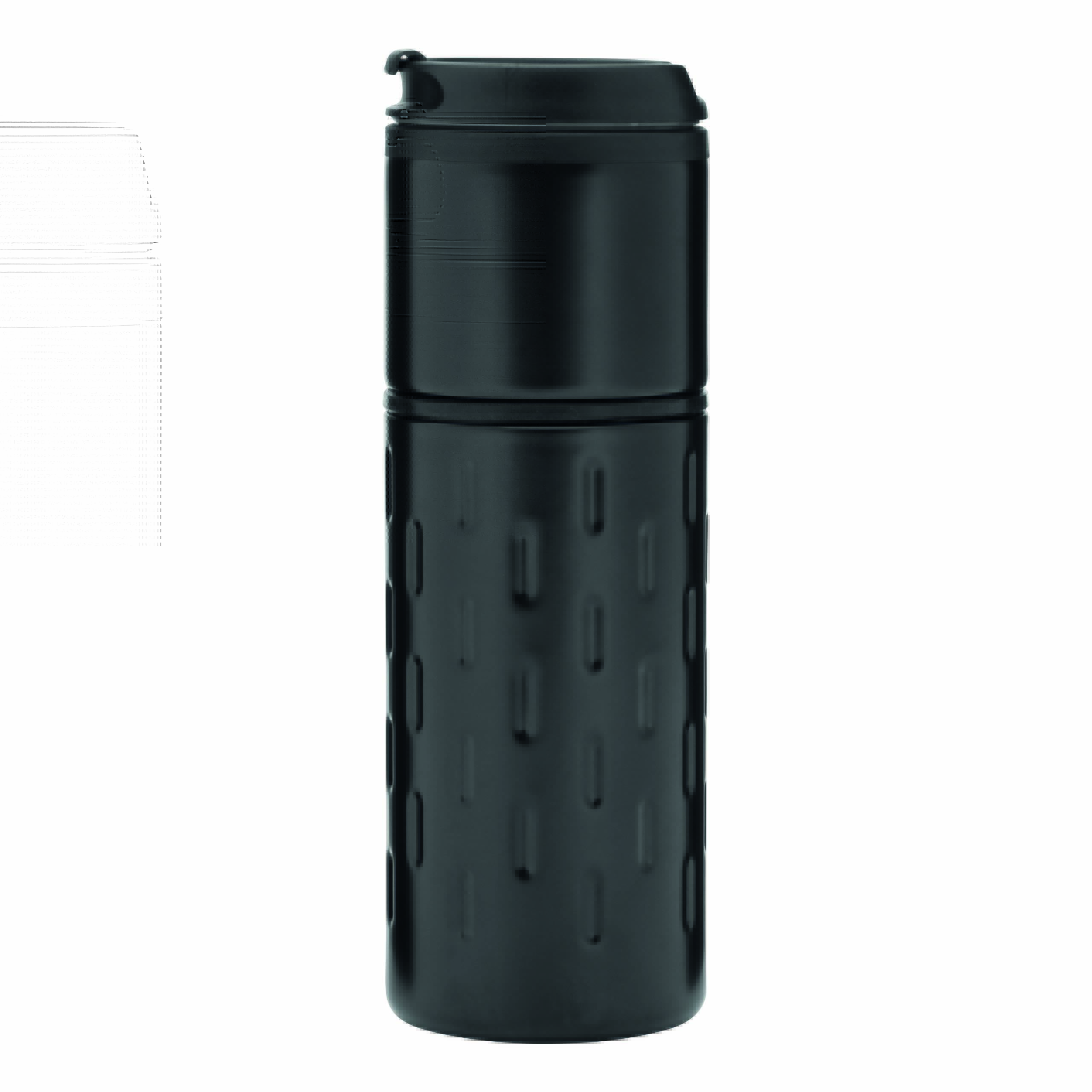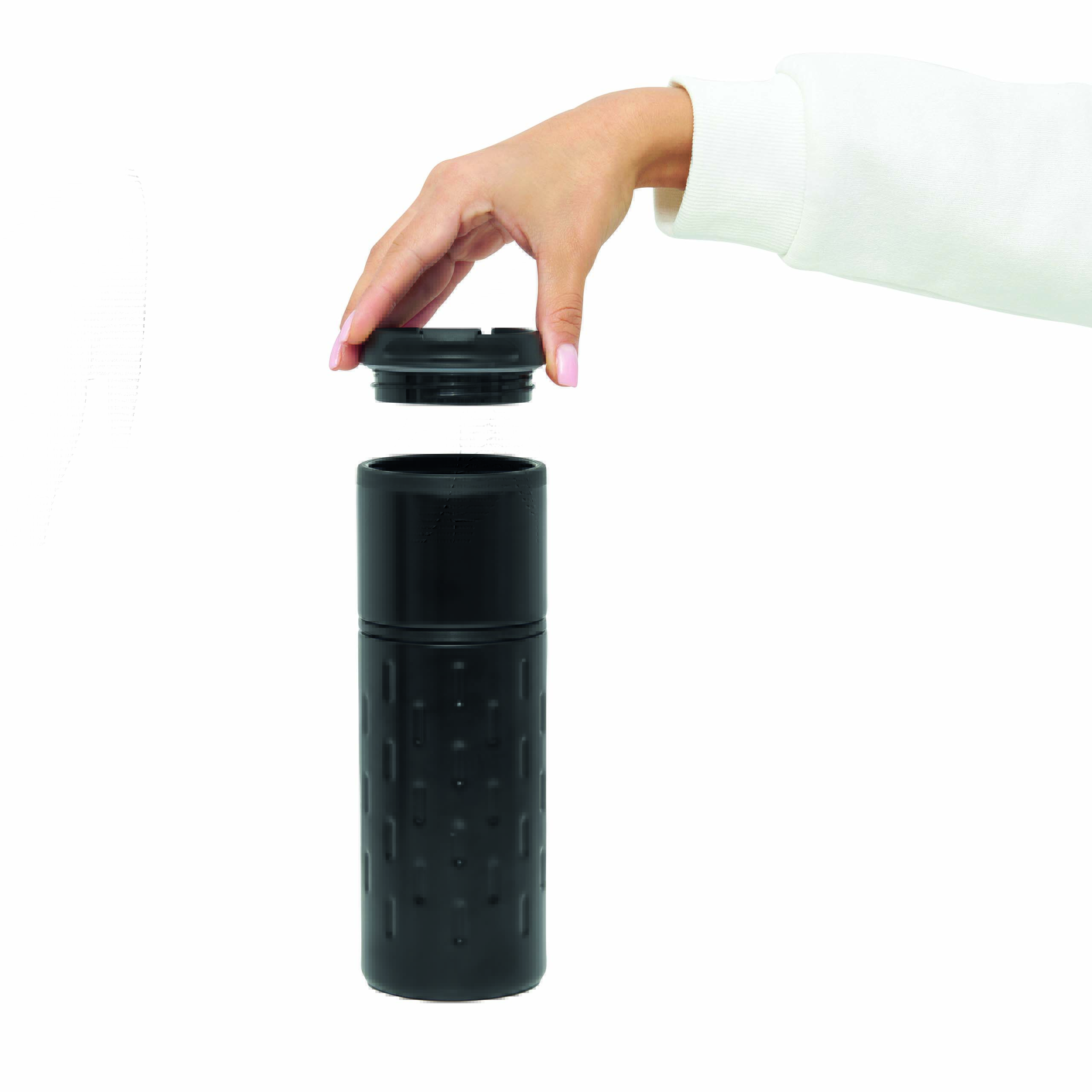 Kubek termiczny o podwójnych ściankach EXCLUSIVE LIQUID. Na zewnątrz stal nierdzewna o futurystycznym wzornictwie z silikonowym pierścieniem, wewnątrz plastik, odkręcana plastikowa pokrywa z wbudowanym, składanym otworem do picia, gumowany spód dla lepszej przyczepności, pojemność ok. 400 ml.