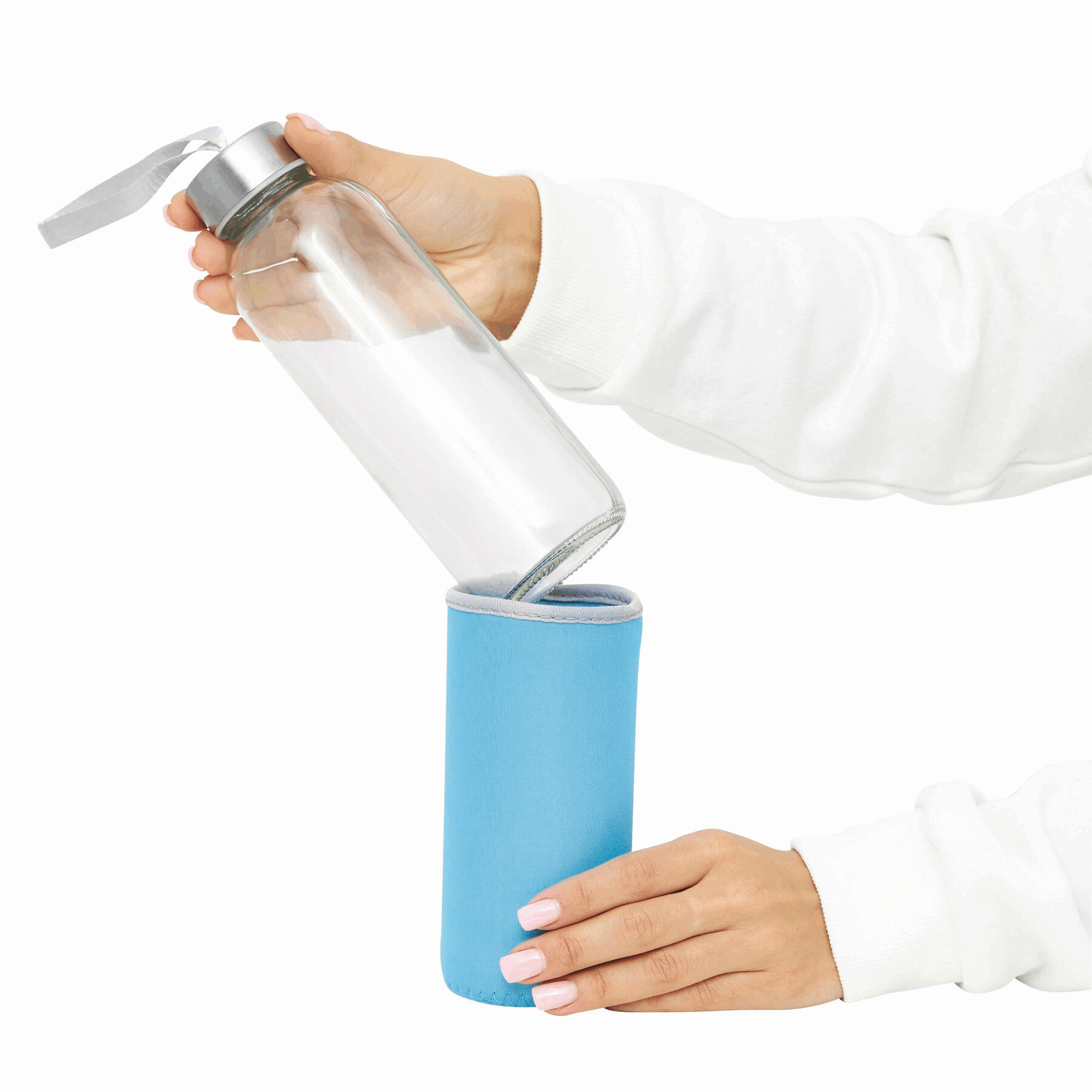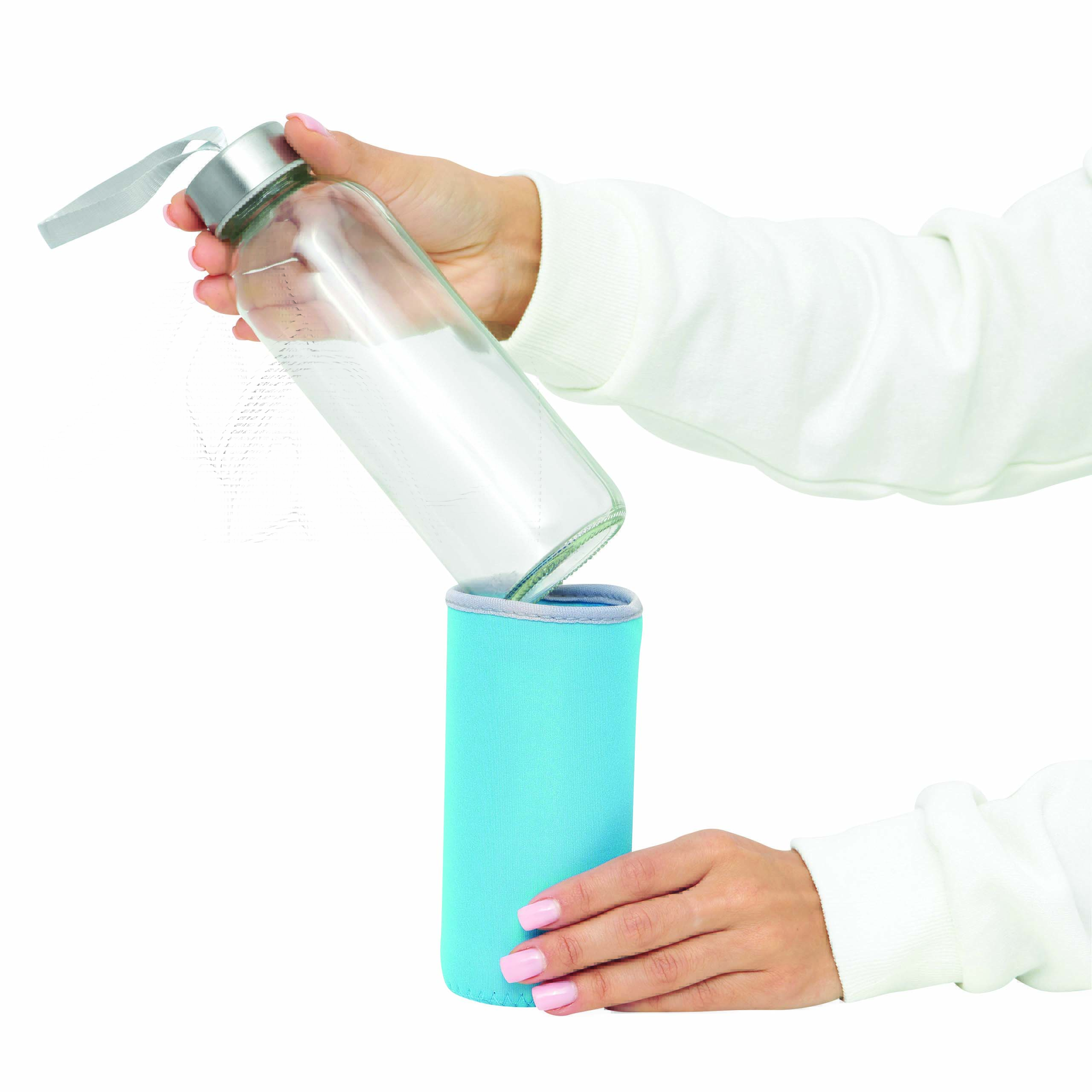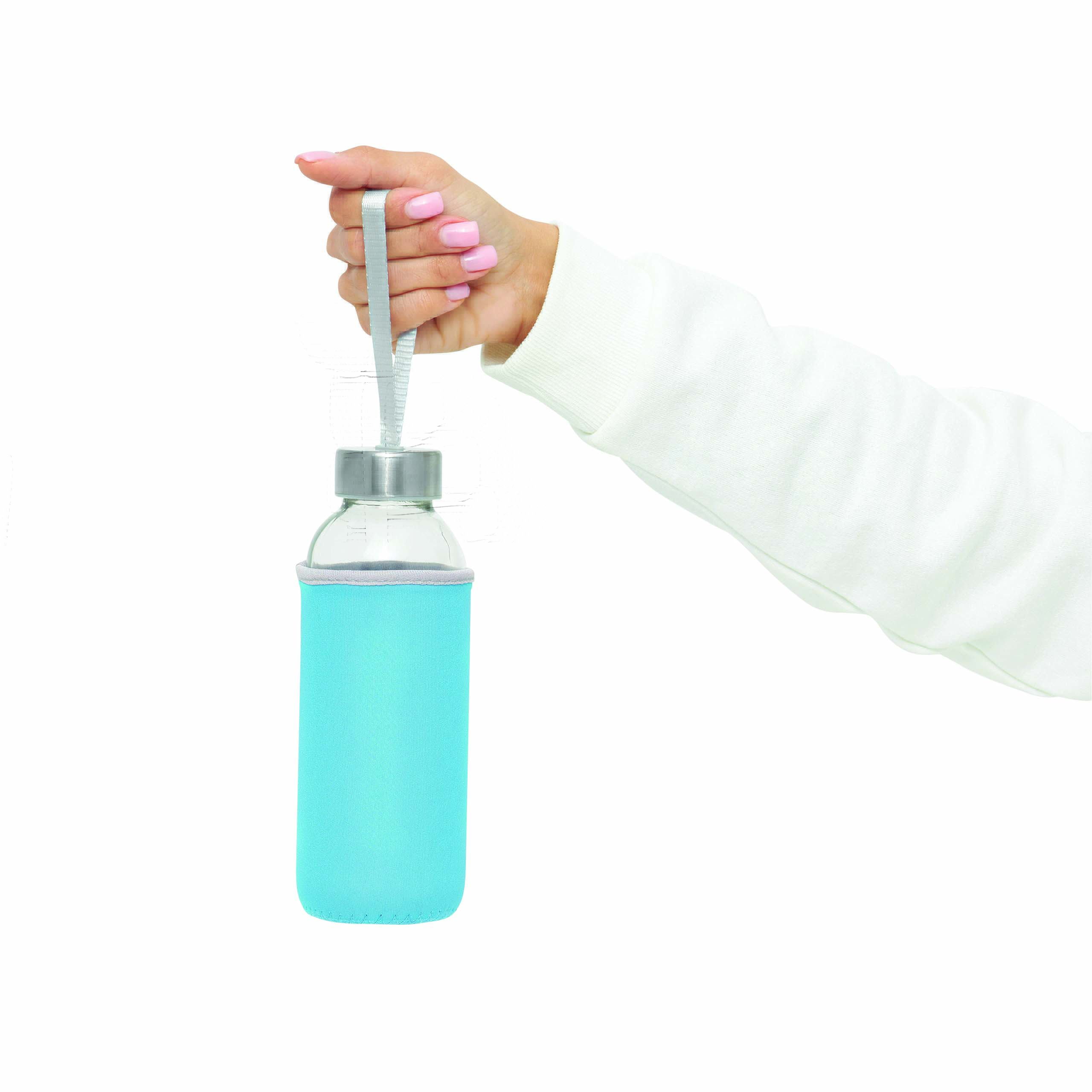 Szklana butelka TAKE WELL z nakrętką i uchwytem do przenoszenia, z kolorową osłonką, pojemność ok. 450 ml.