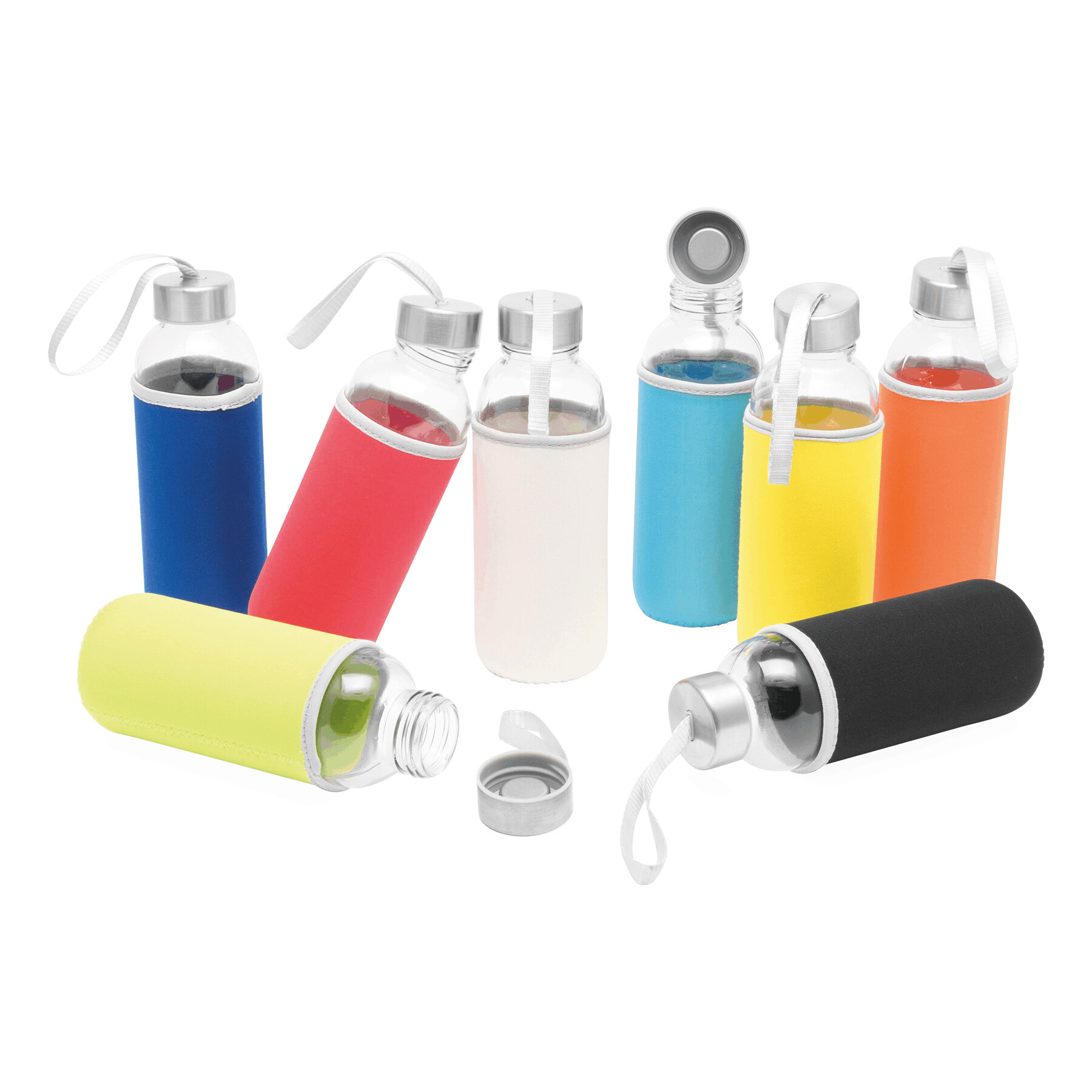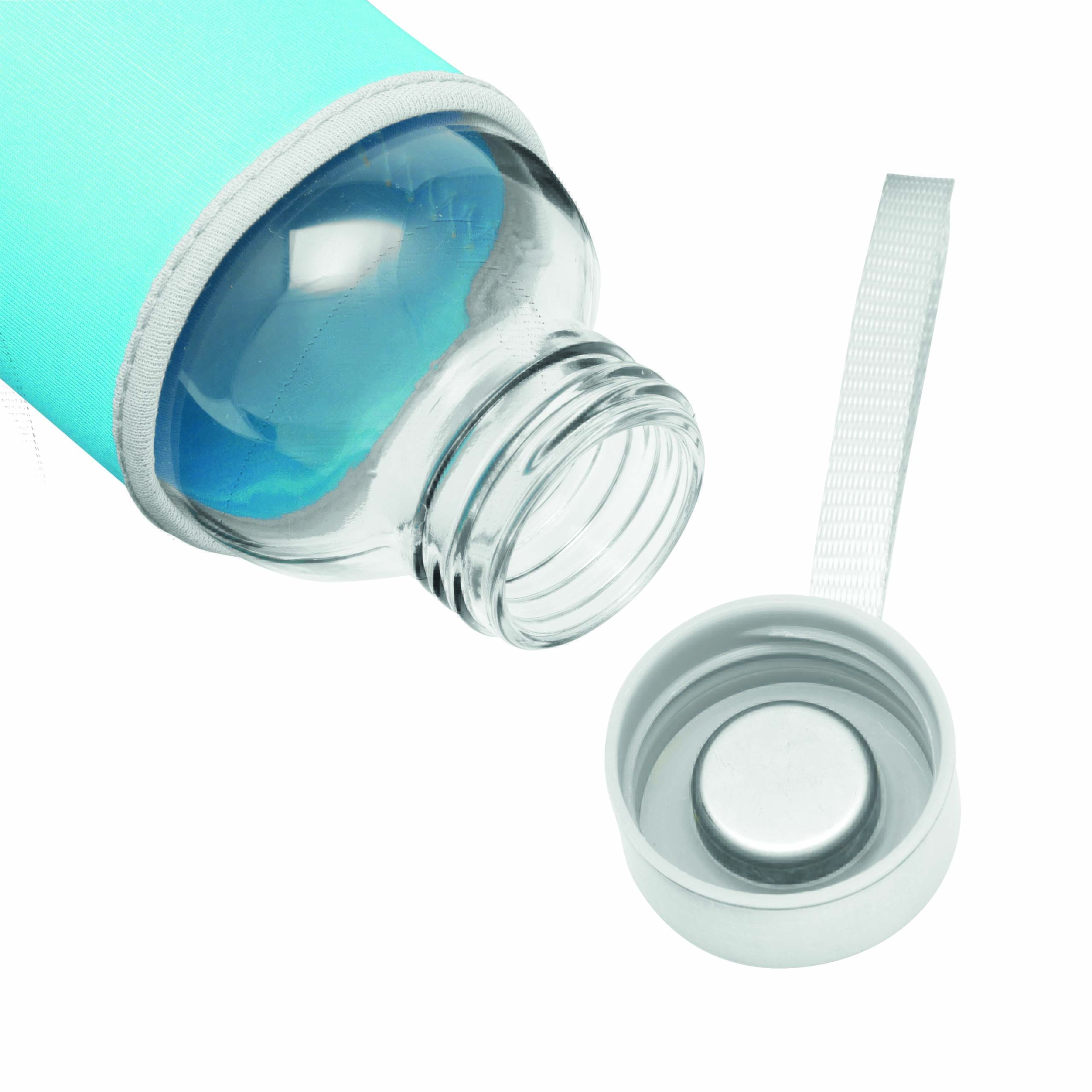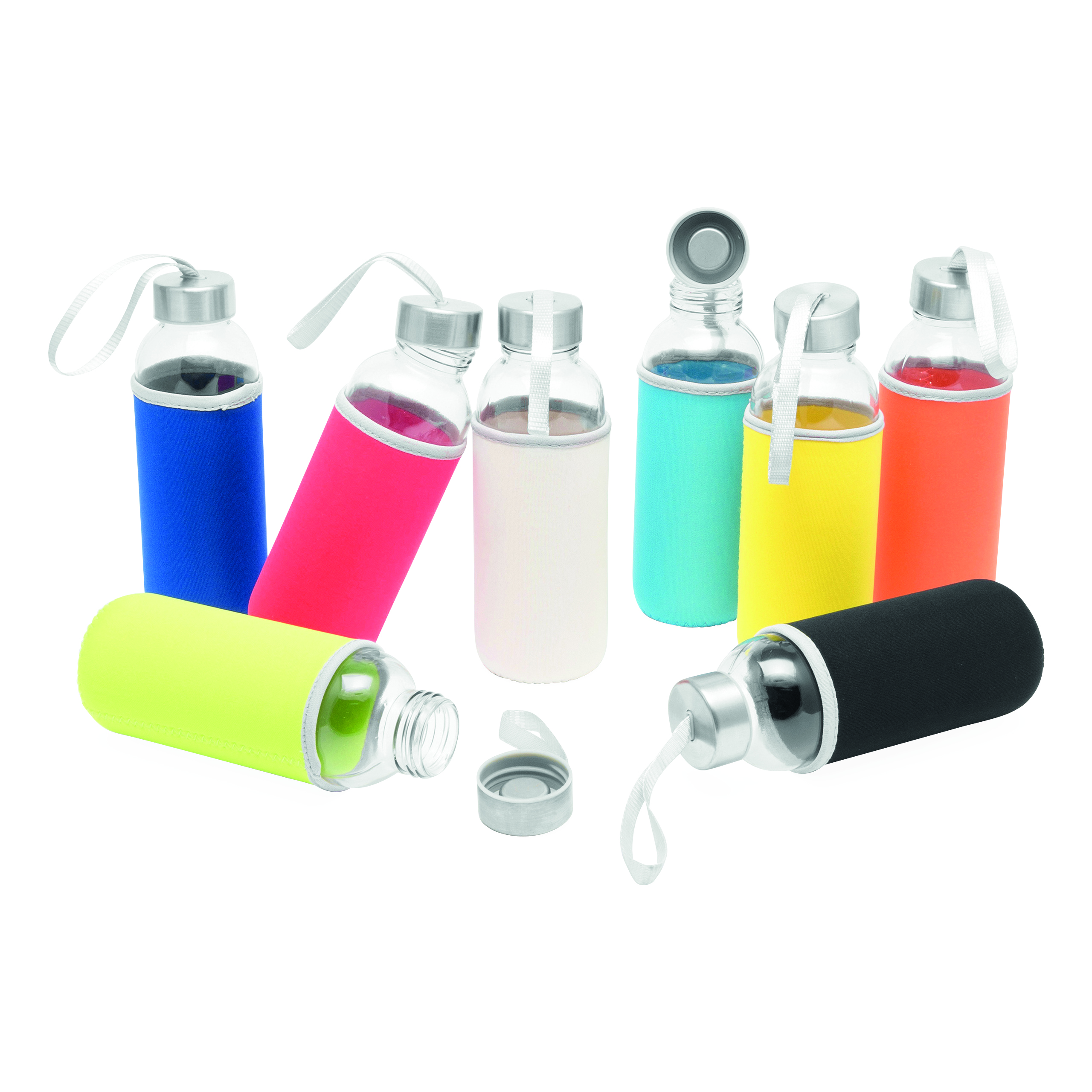 Szklana butelka TAKE WELL z nakrętką i uchwytem do przenoszenia, z kolorową osłonką, pojemność ok. 450 ml.