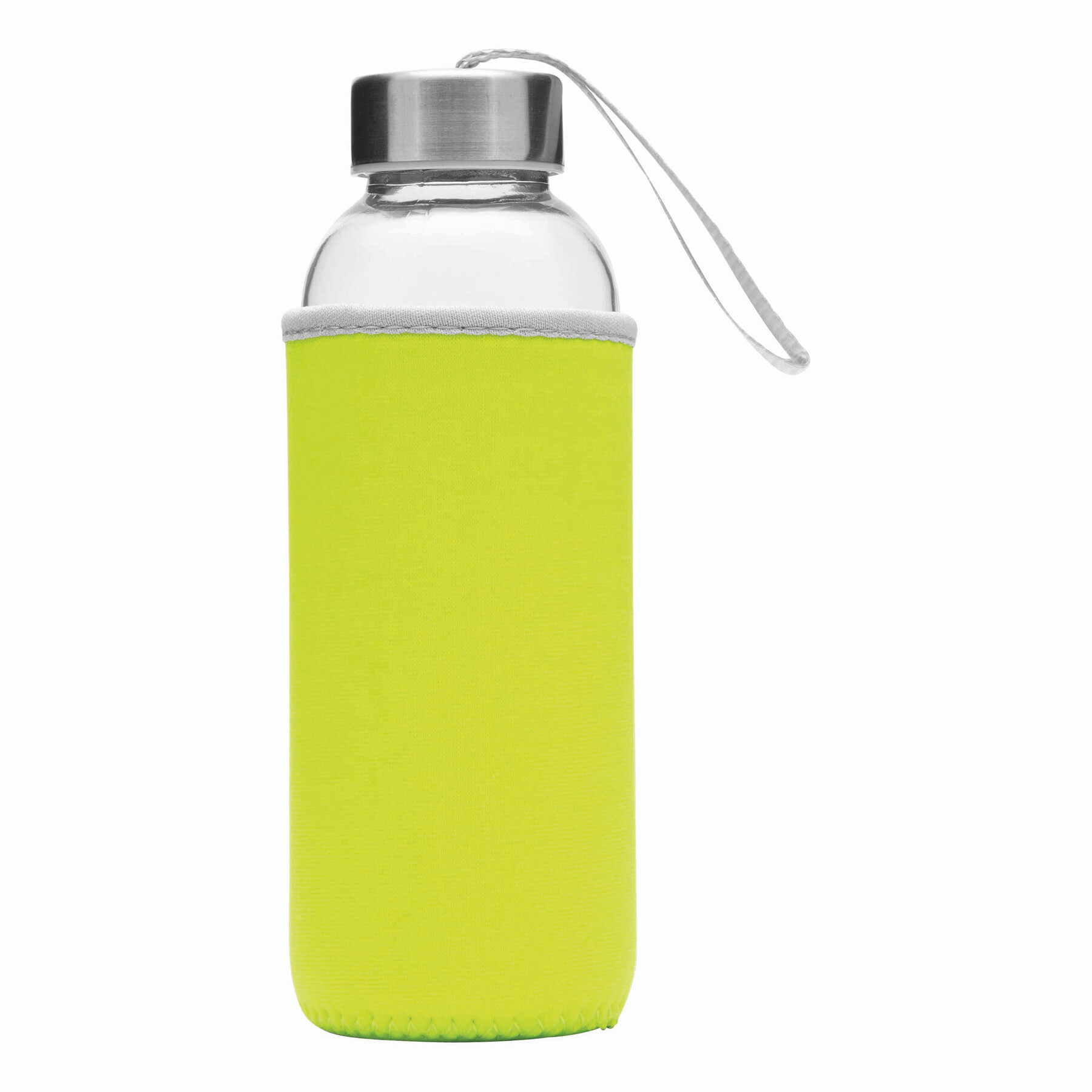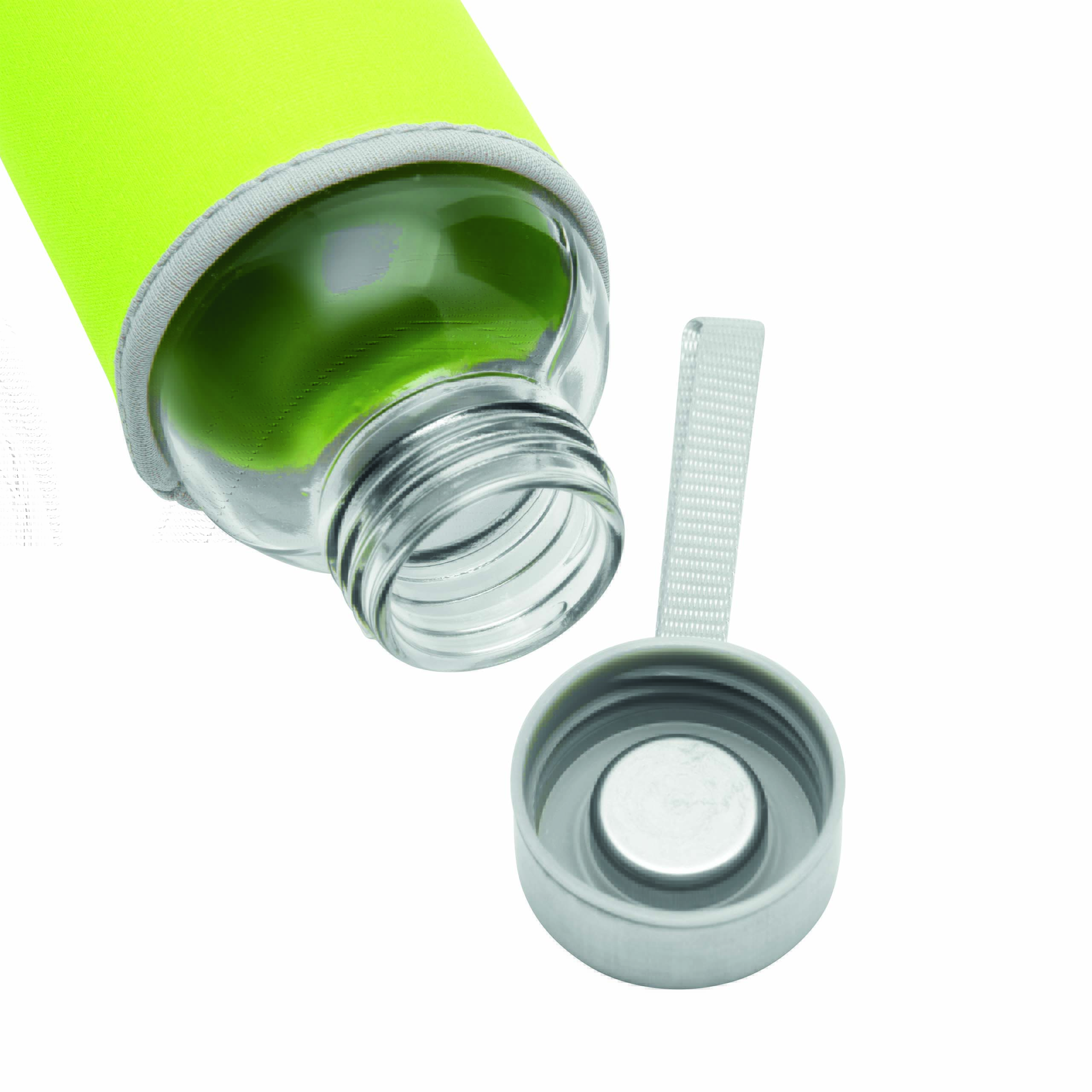 Szklana butelka TAKE WELL z nakrętką i uchwytem do przenoszenia, z kolorową osłonką, pojemność ok. 450 ml.