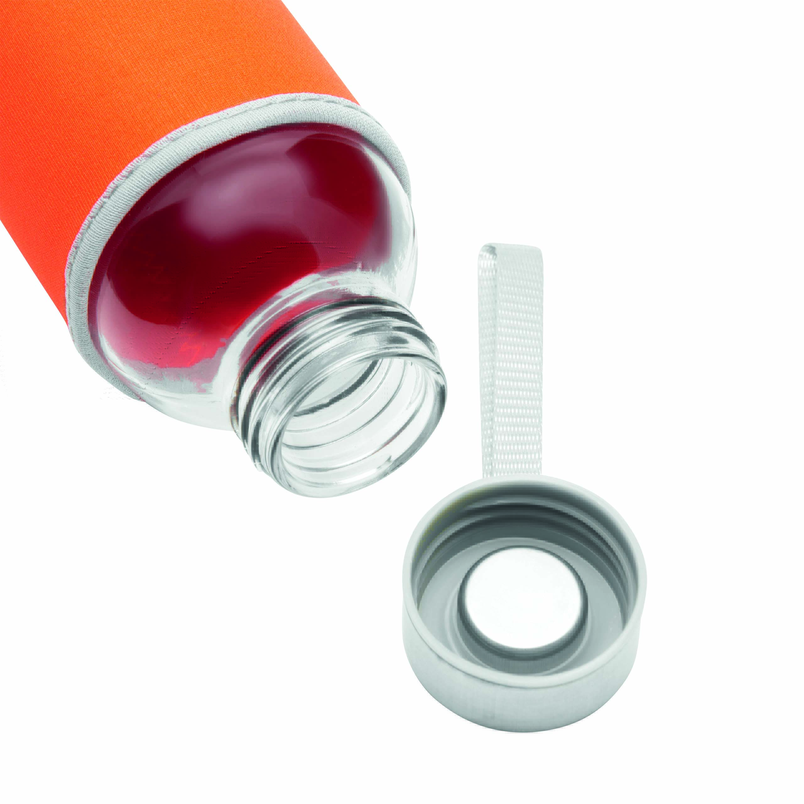 Szklana butelka TAKE WELL z nakrętką i uchwytem do przenoszenia, z kolorową osłonką, pojemność ok. 450 ml.