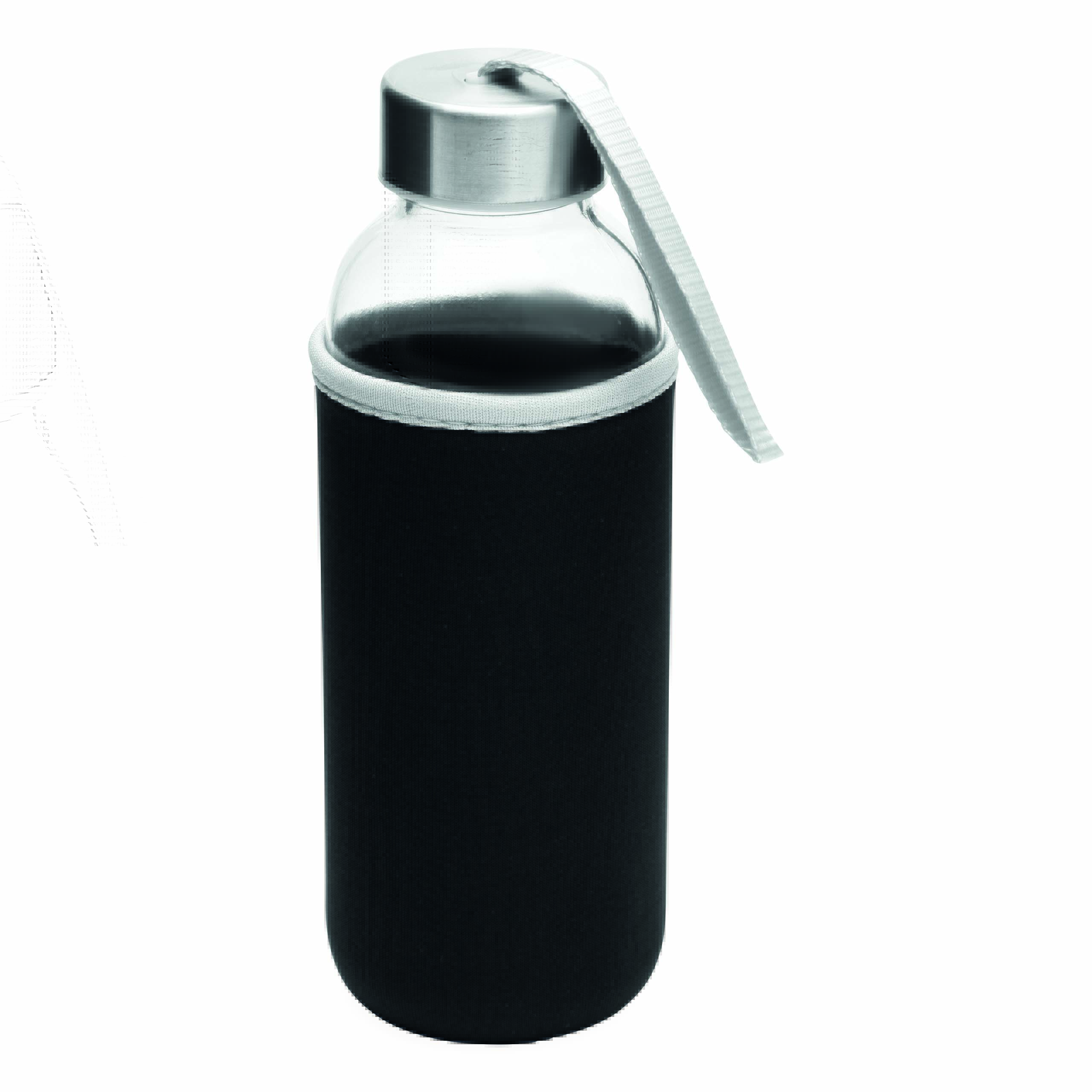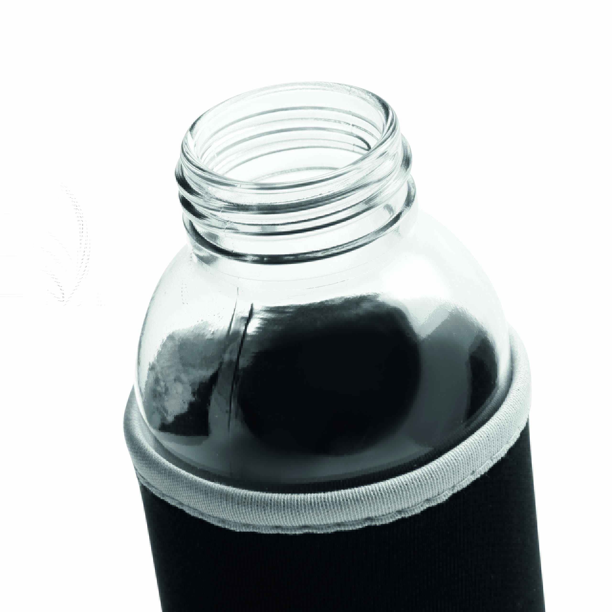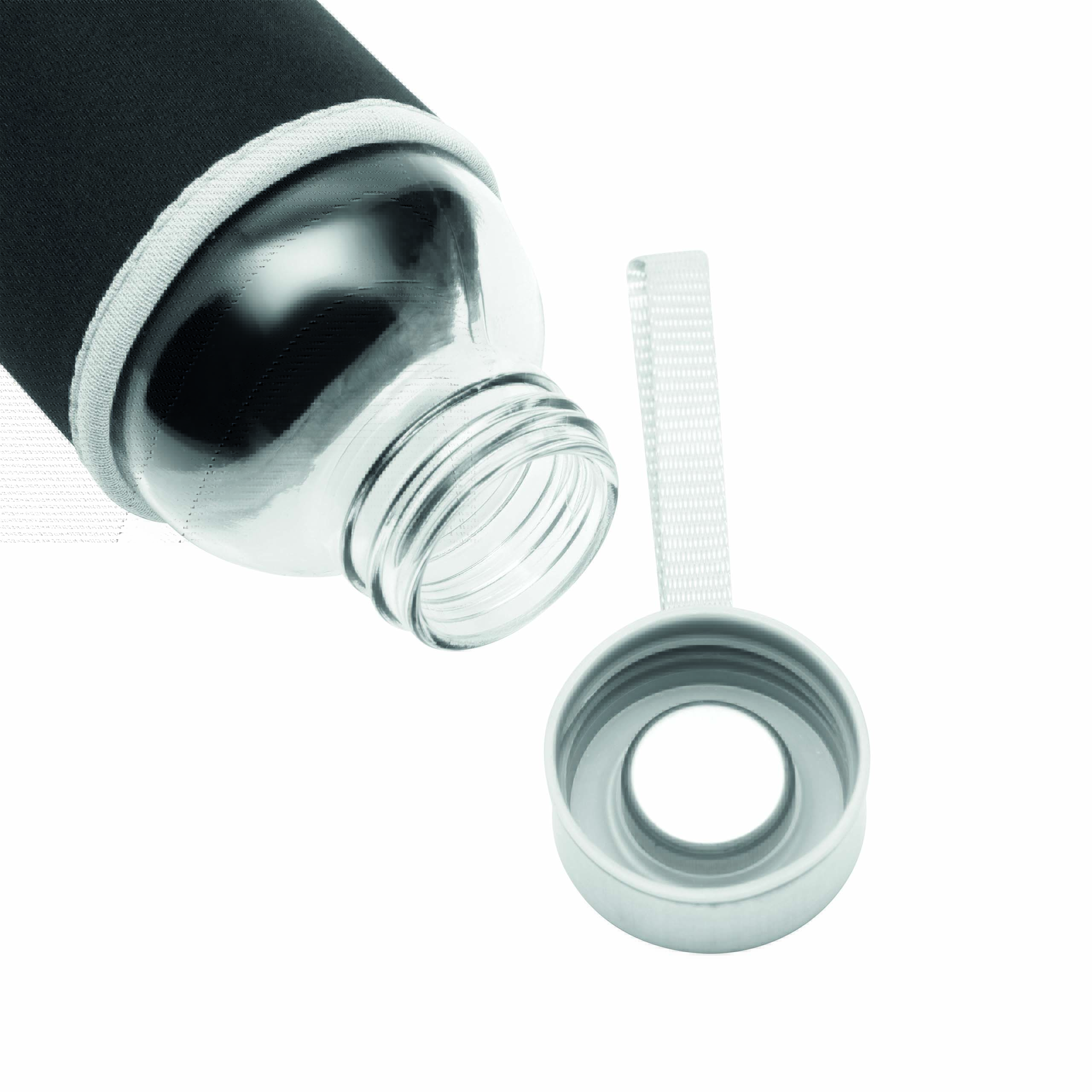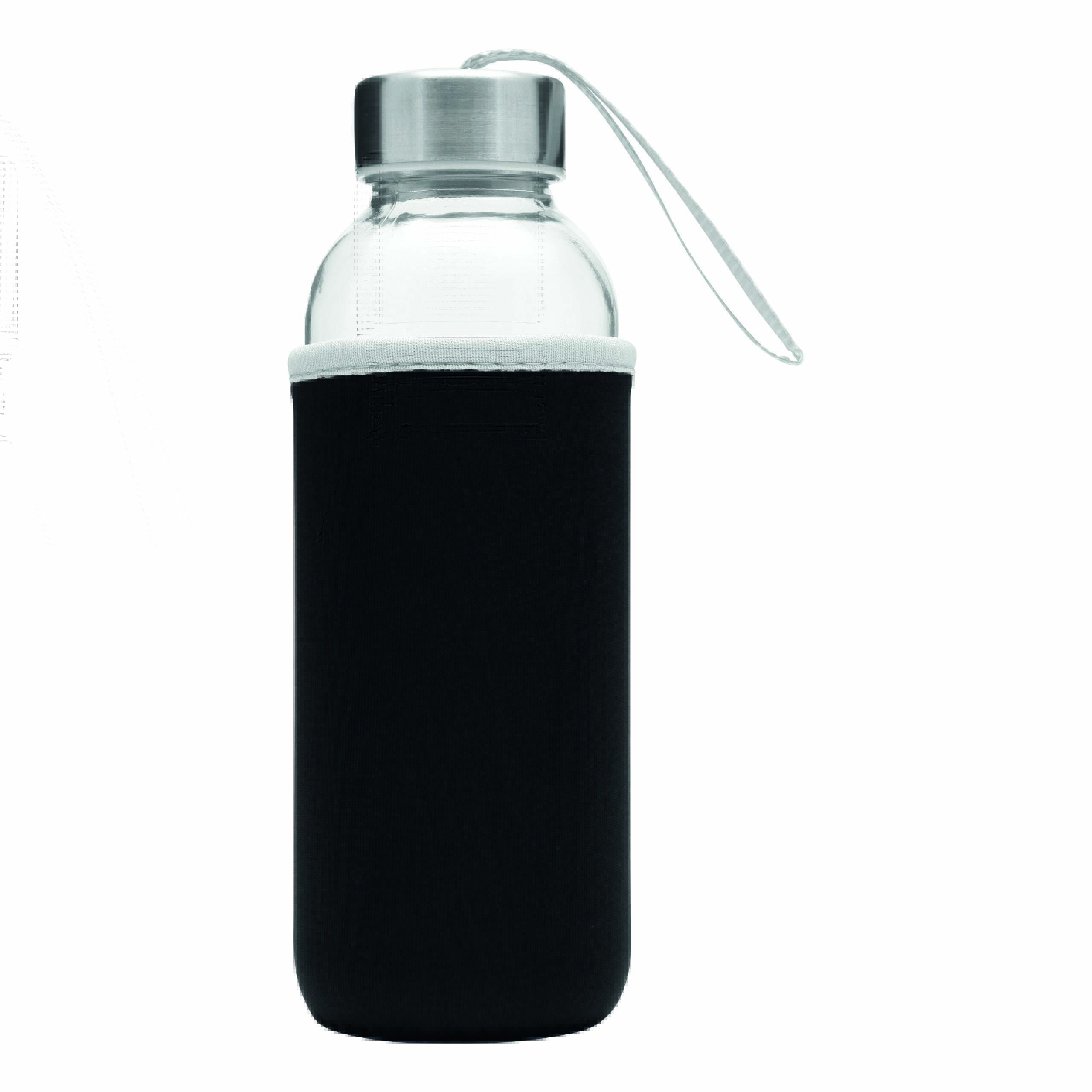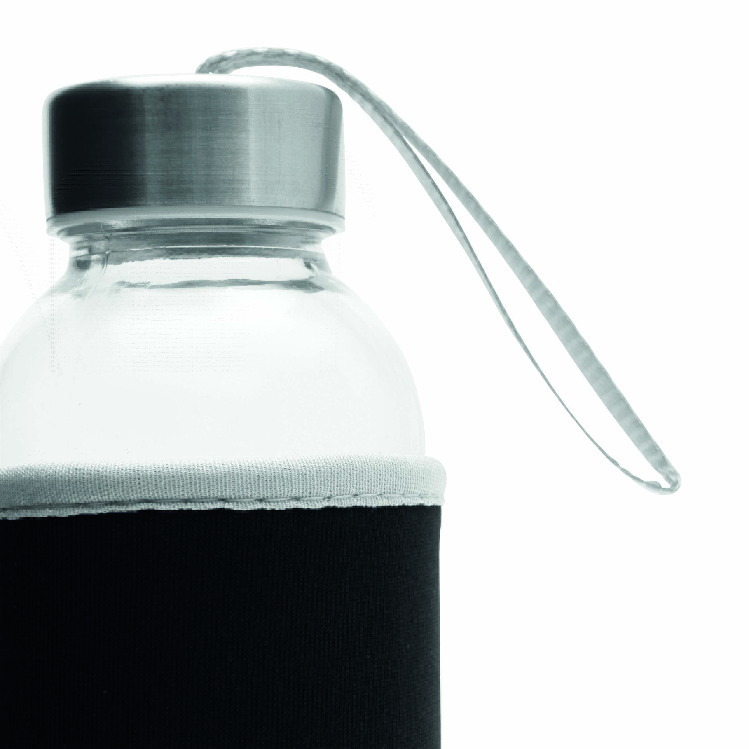 Szklana butelka TAKE WELL z nakrętką i uchwytem do przenoszenia, z kolorową osłonką, pojemność ok. 450 ml.