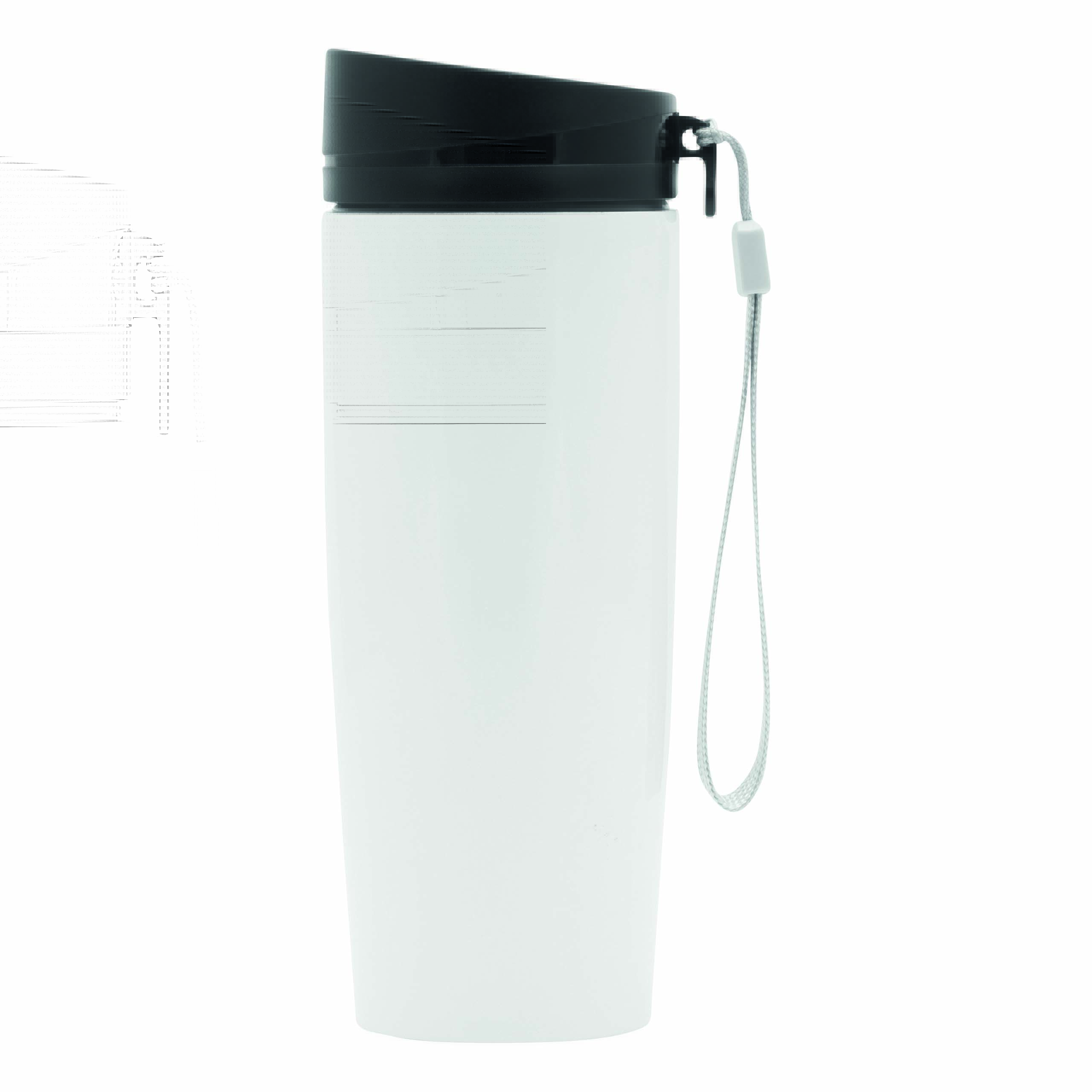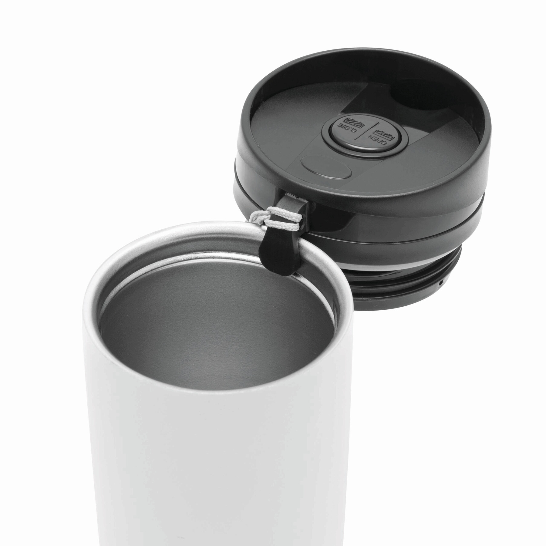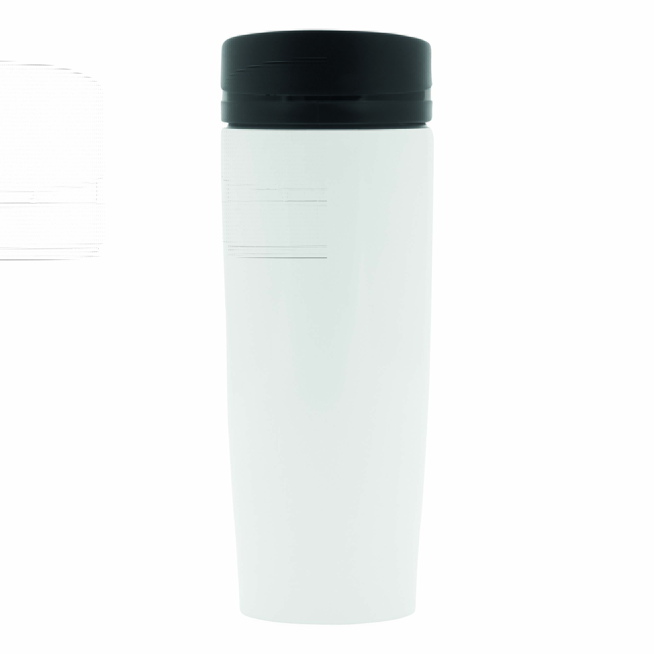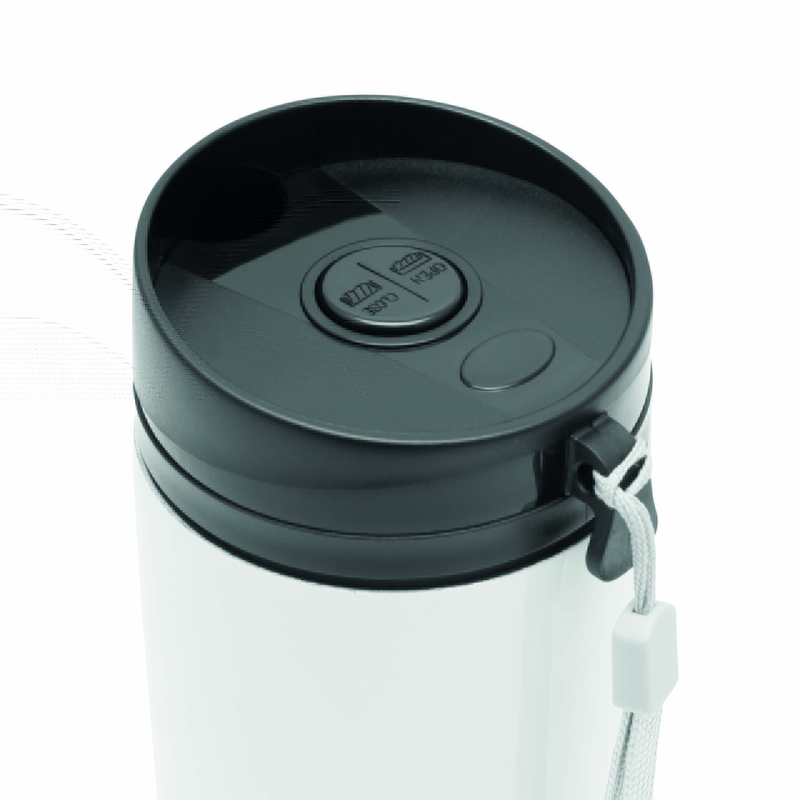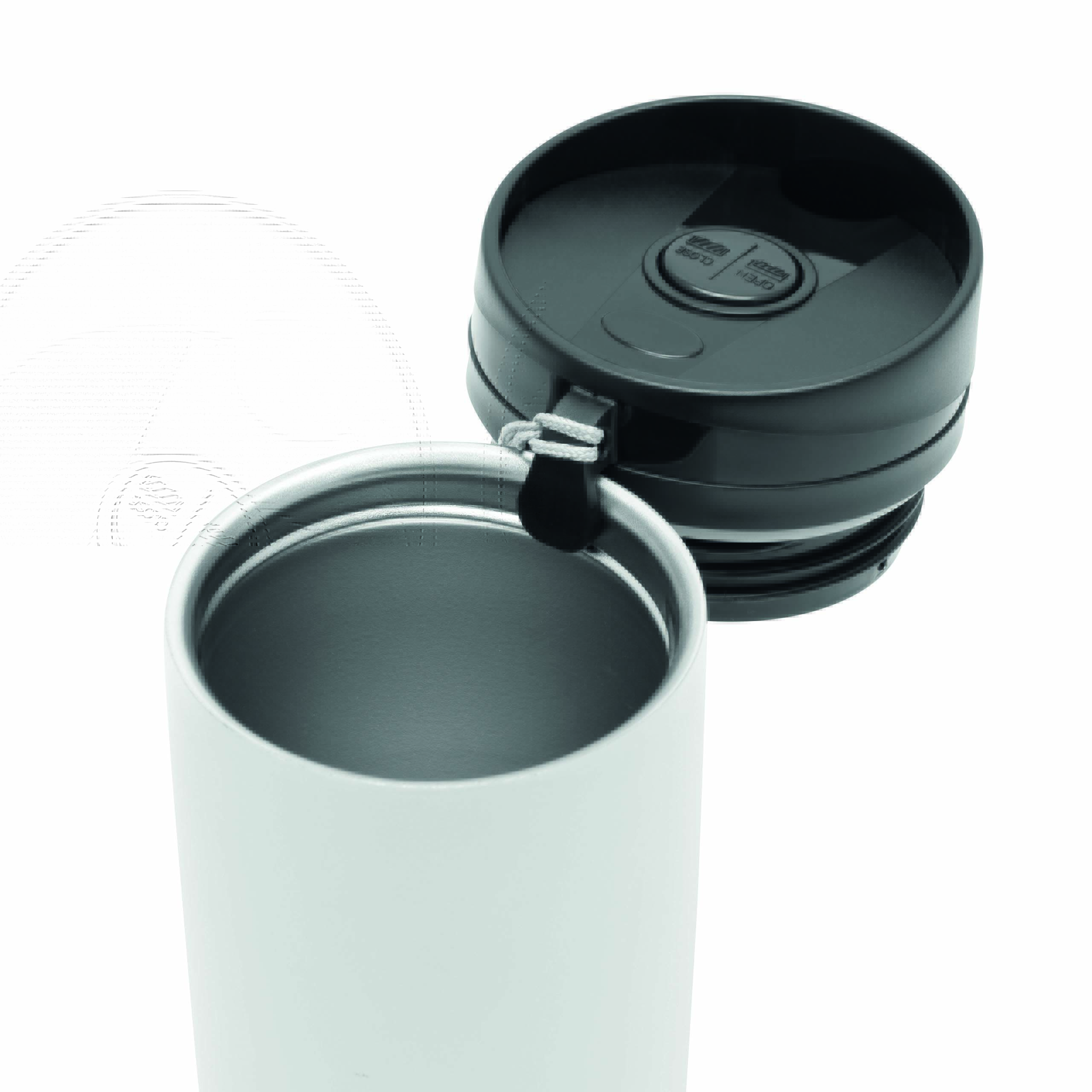 Kubek termiczny o podwójnych ściankach EARLY MORNING wewnątrz i na zewnątrz stal nierdzewna, plastikowe odkręcane wieczko z bezpieczną zakrętką, przyciskiem OPEN/CLOSE i otworem do picia, pojemność ok. 380 ml, z haczykiem do zawieszenia.
