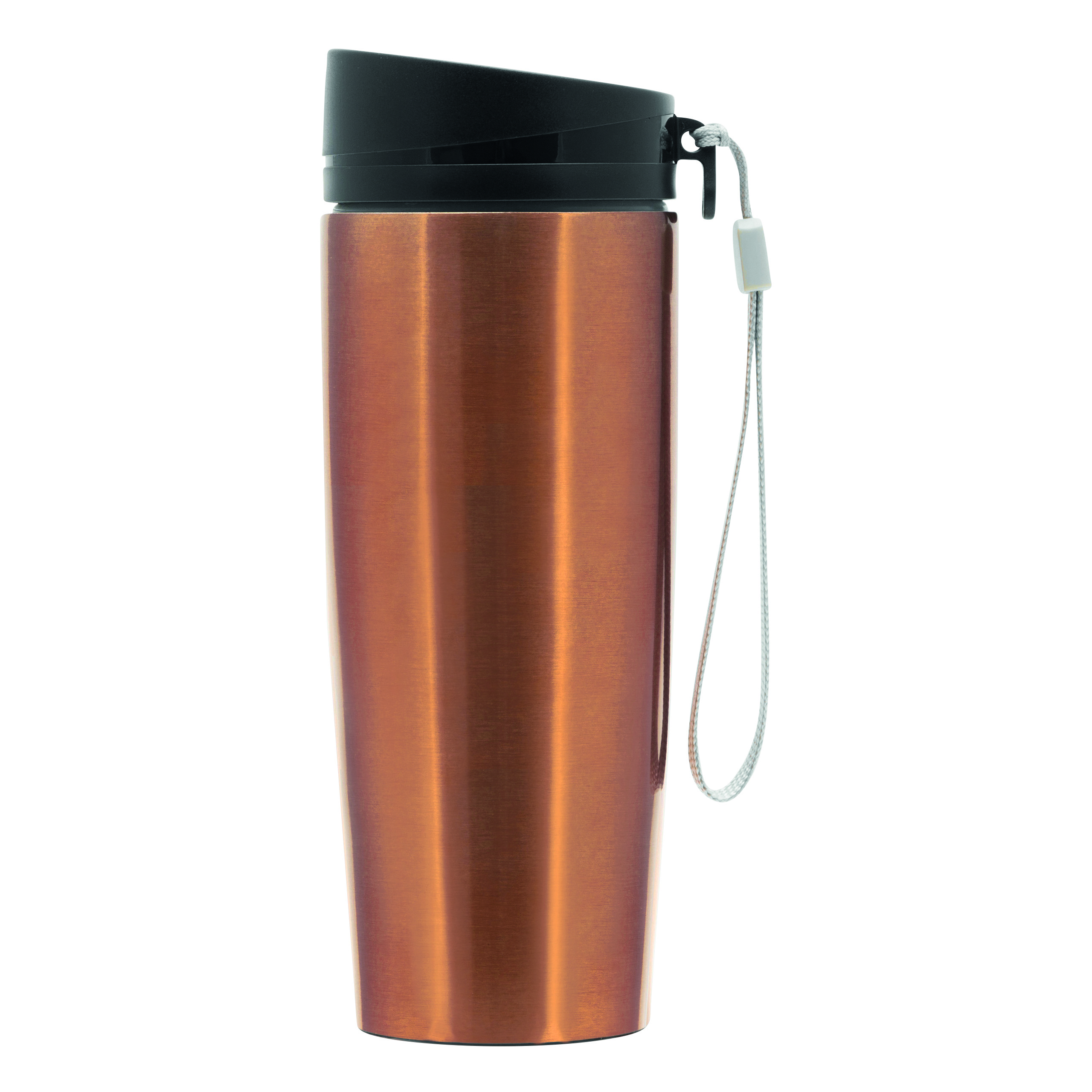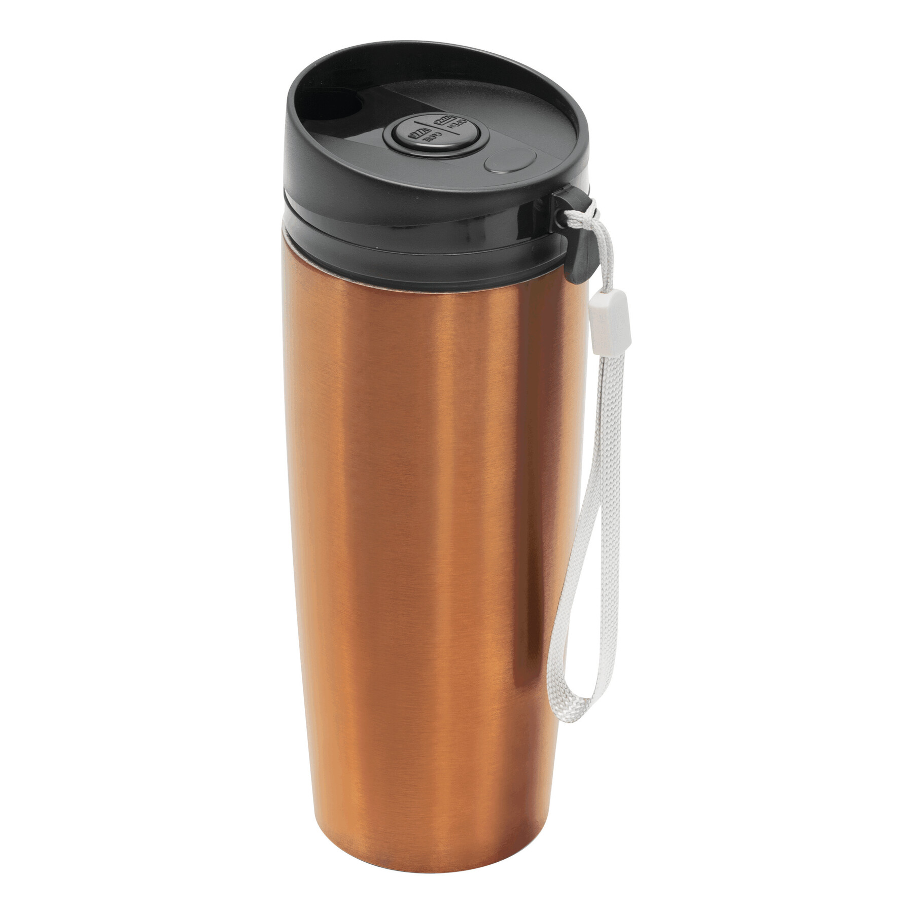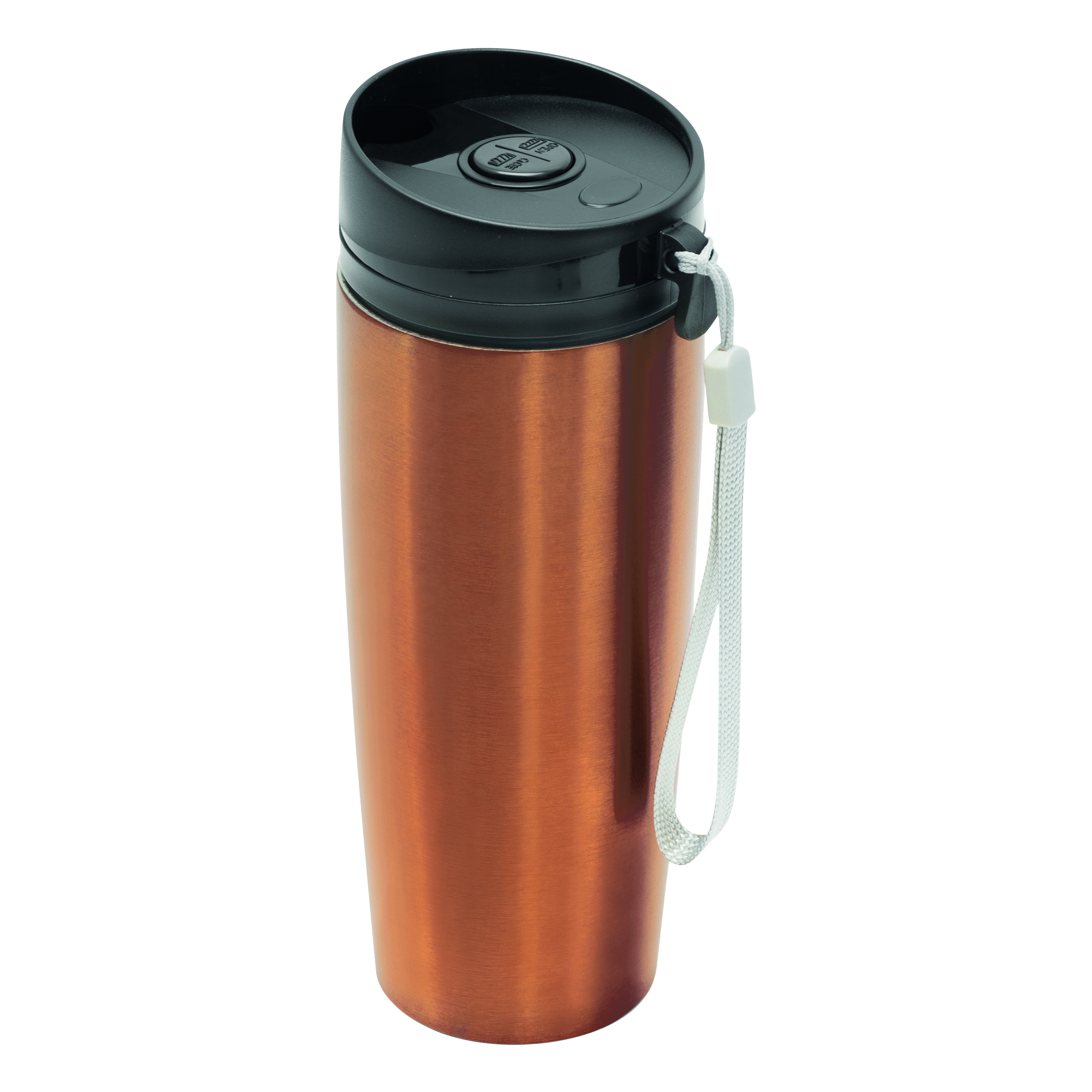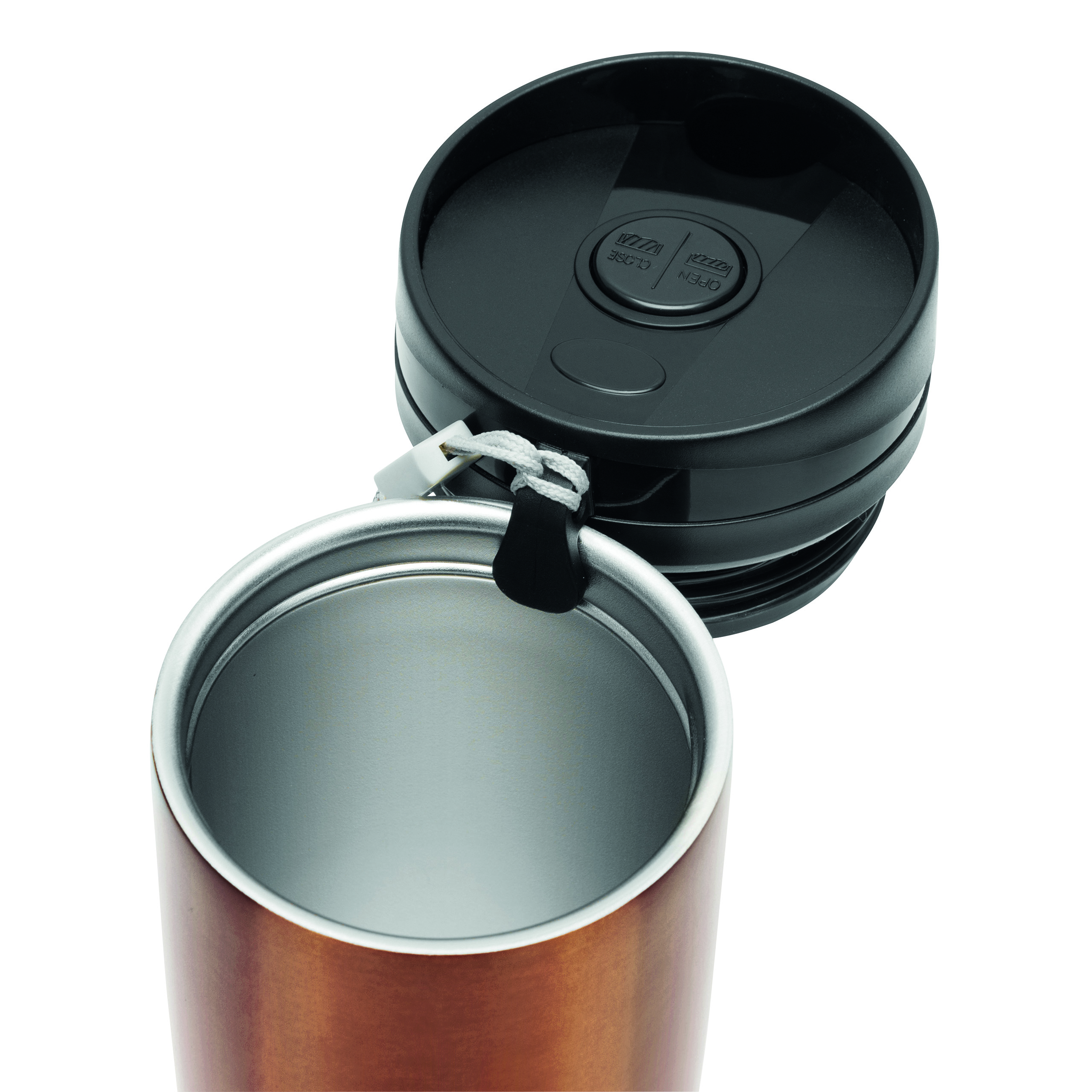 Kubek termiczny o podwójnych ściankach EARLY MORNING wewnątrz i na zewnątrz stal nierdzewna, plastikowe odkręcane wieczko z bezpieczną zakrętką, przyciskiem OPEN/CLOSE i otworem do picia, pojemność ok. 380 ml, z haczykiem do zawieszenia.