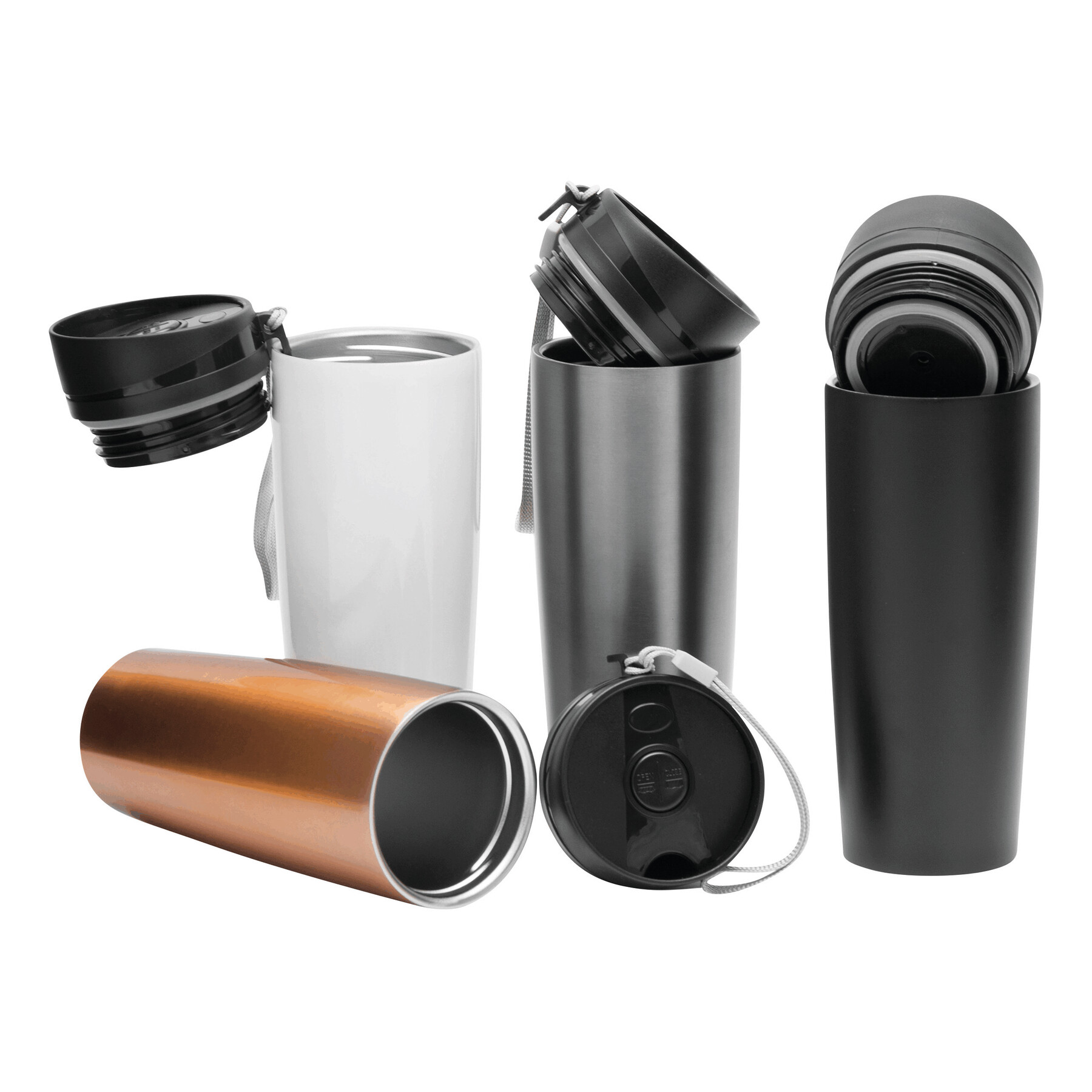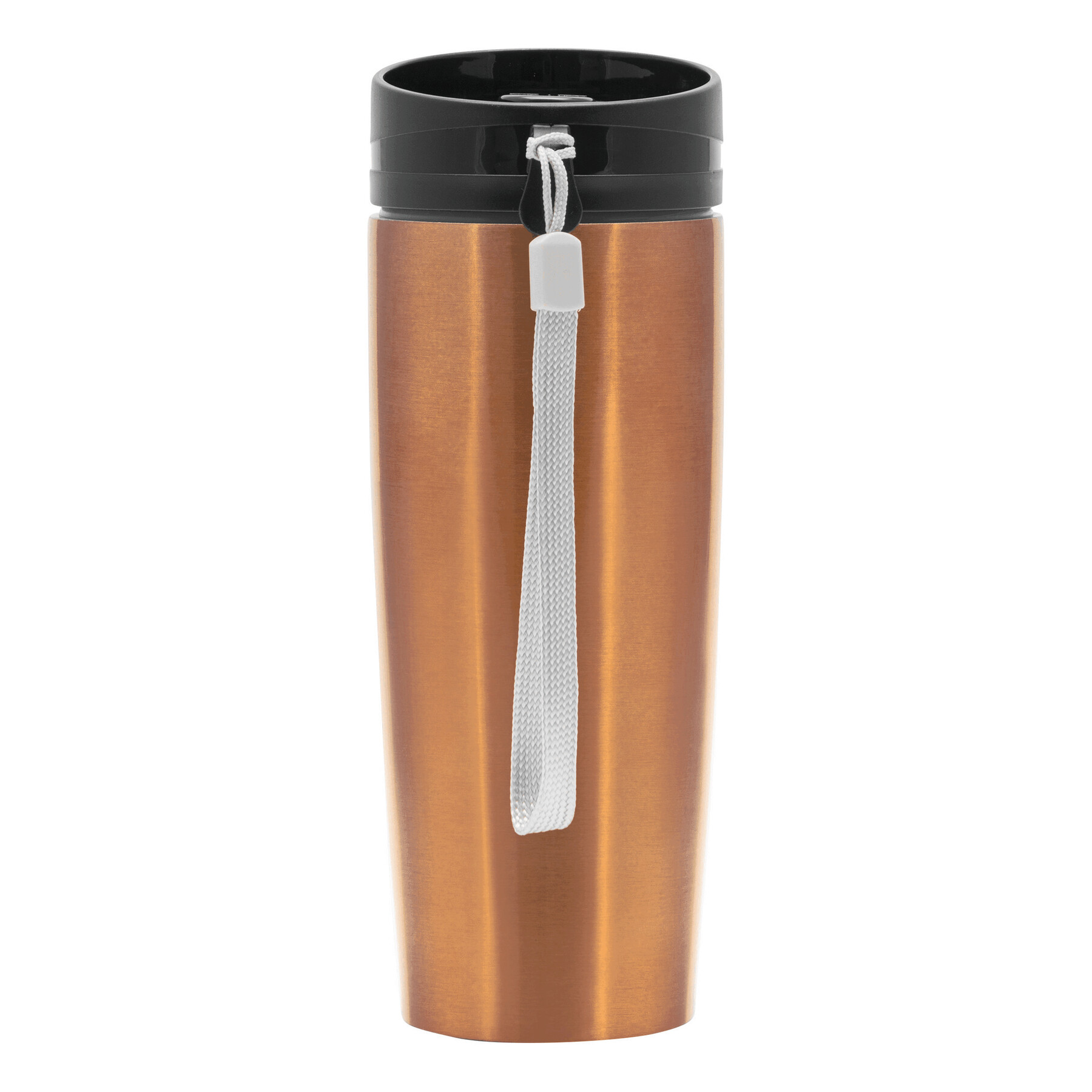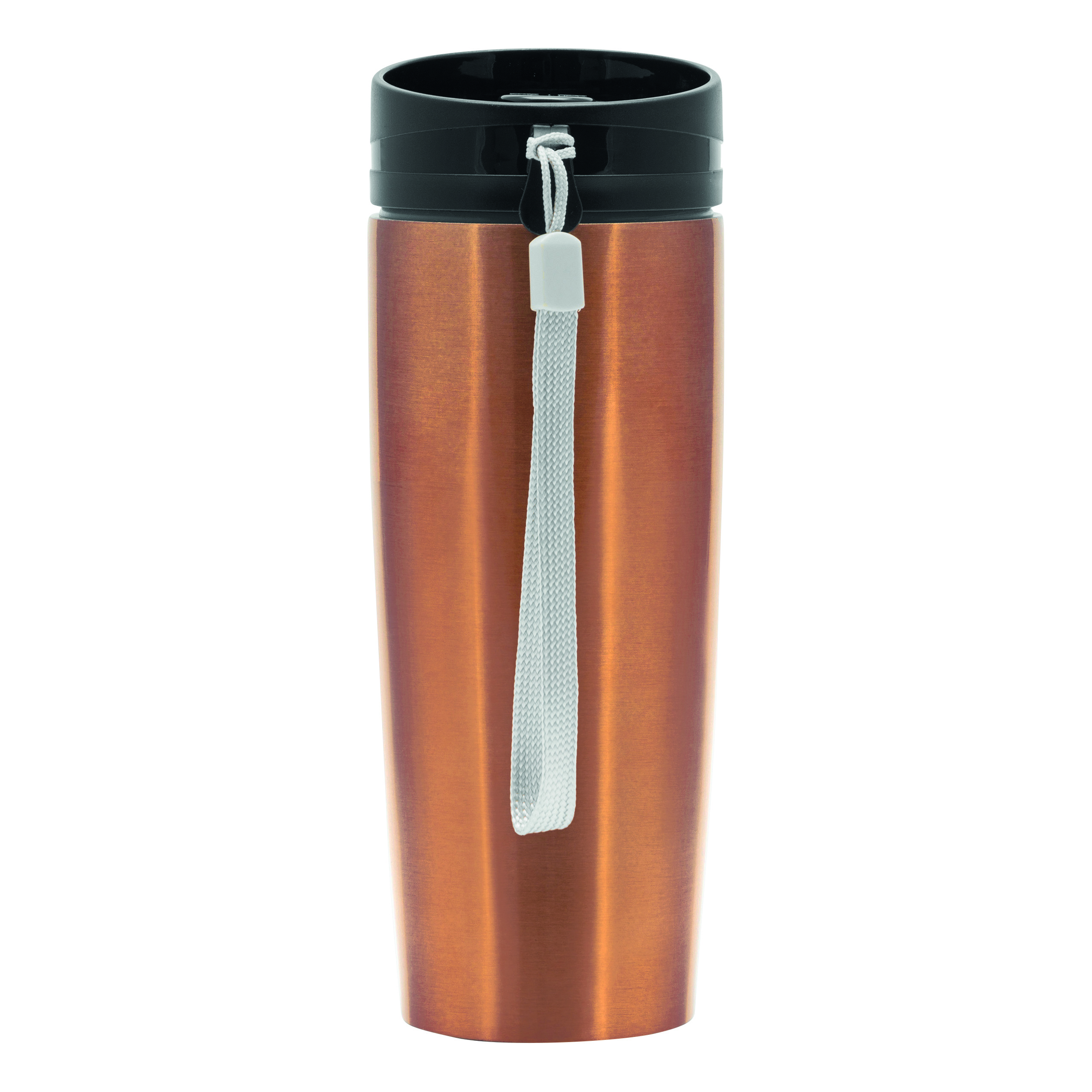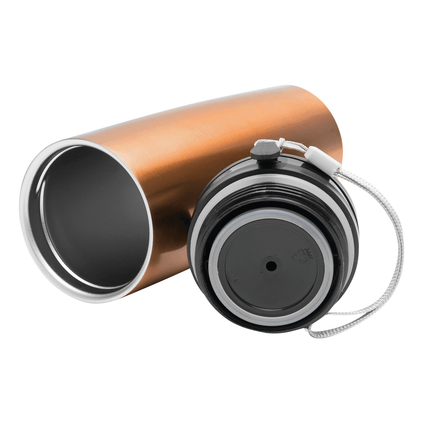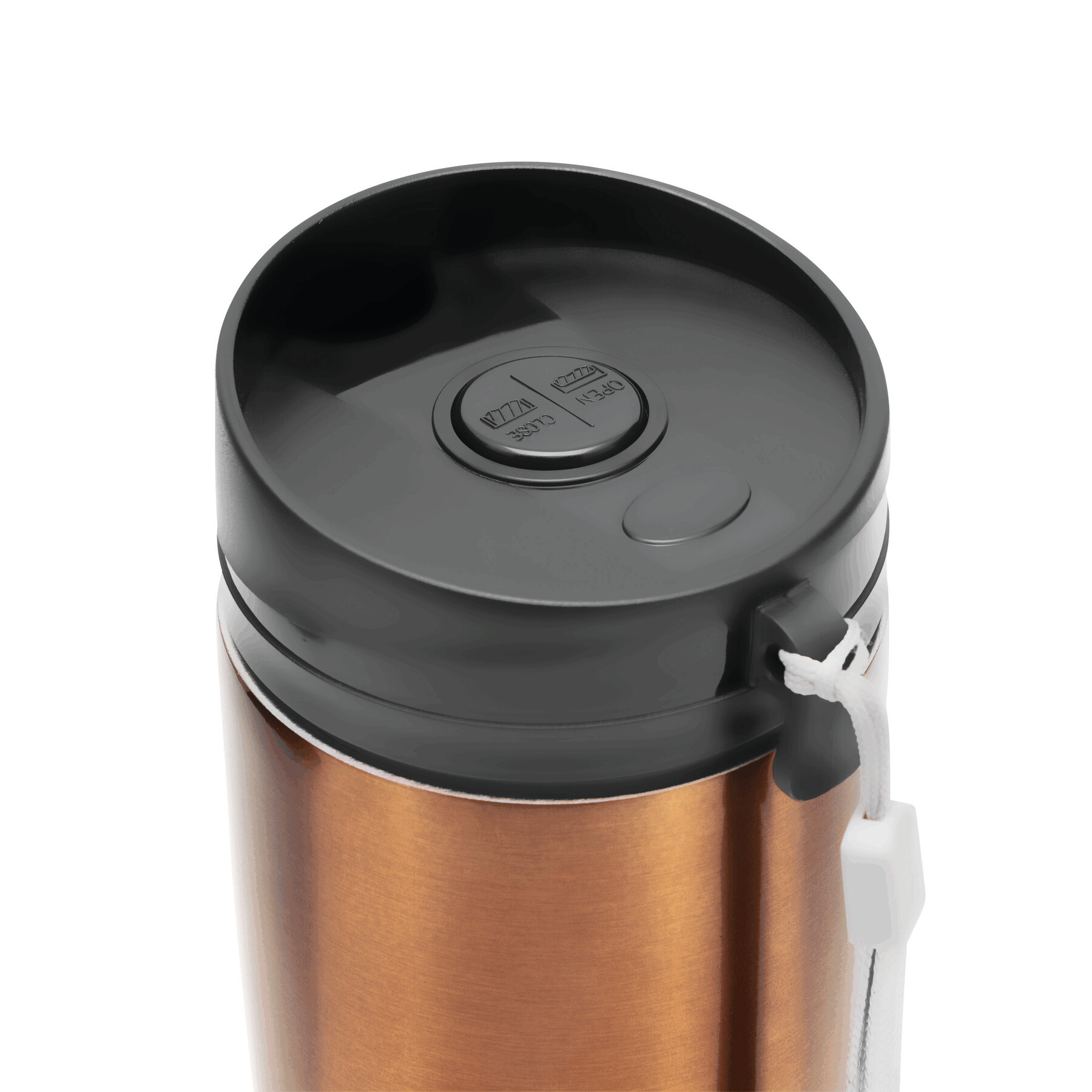 Kubek termiczny o podwójnych ściankach EARLY MORNING wewnątrz i na zewnątrz stal nierdzewna, plastikowe odkręcane wieczko z bezpieczną zakrętką, przyciskiem OPEN/CLOSE i otworem do picia, pojemność ok. 380 ml, z haczykiem do zawieszenia.
