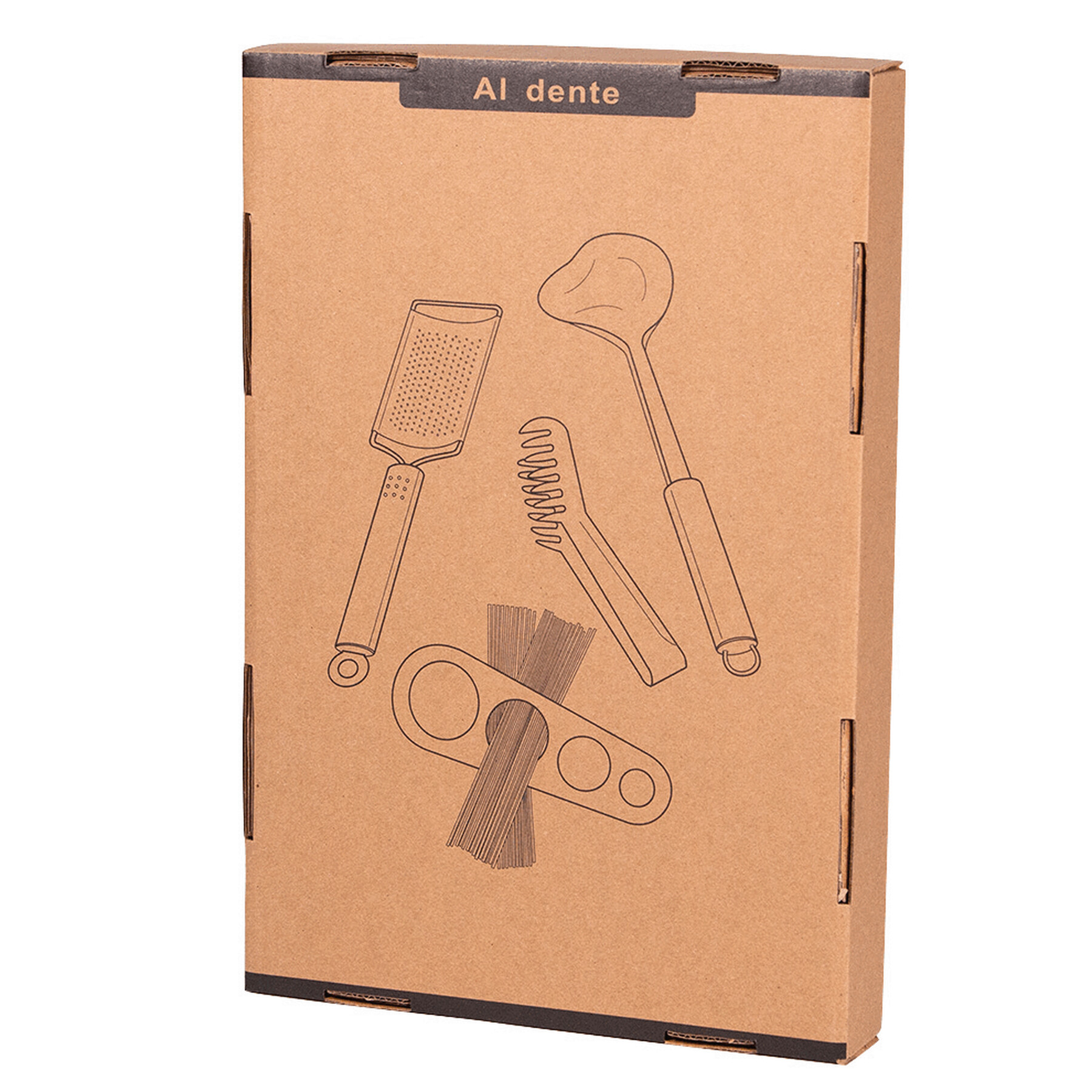 Zestaw do spaghetti AL DENTE z tarką do sera, urządzeniem do porcjowania makaronu, szczypcami do makaronu i chochlą.