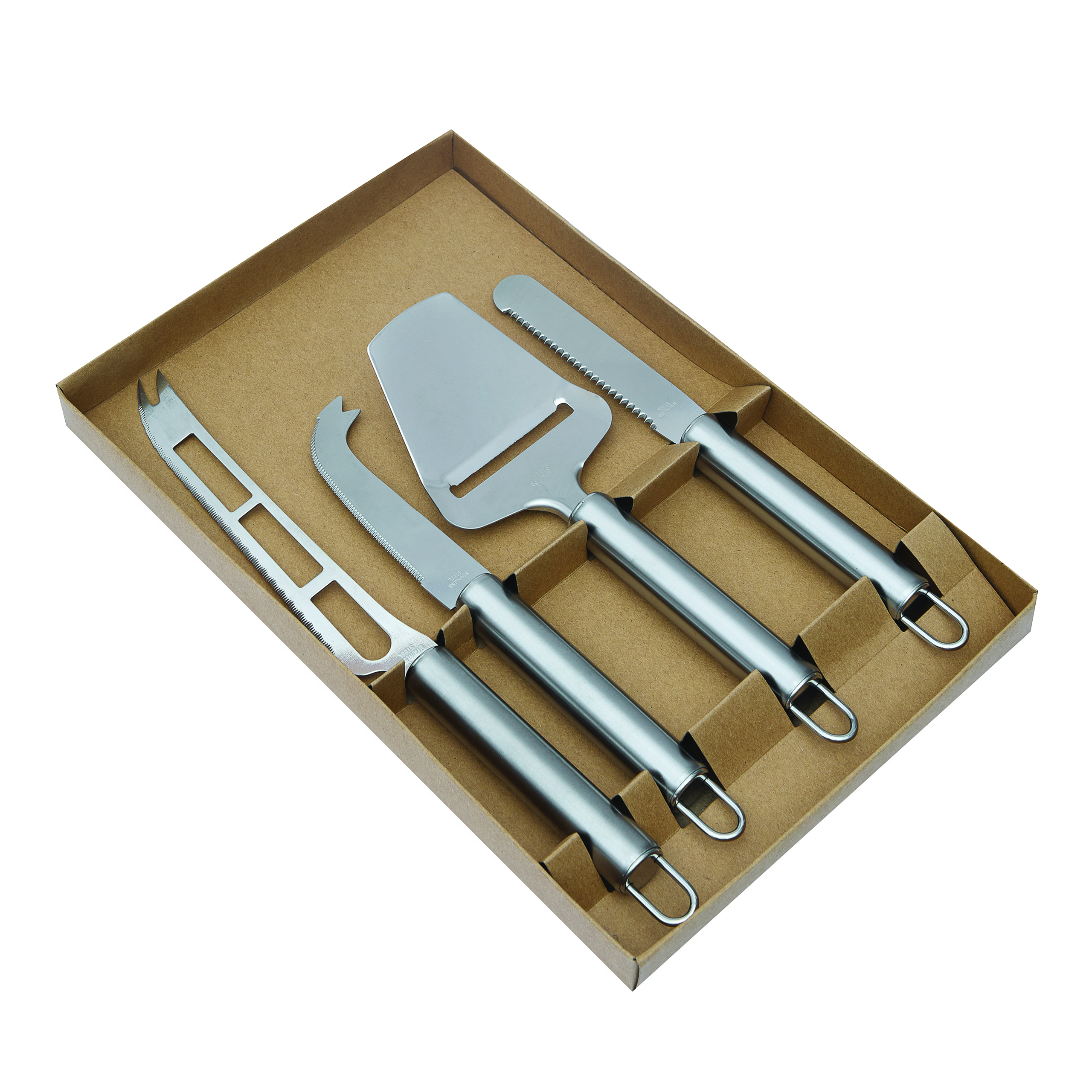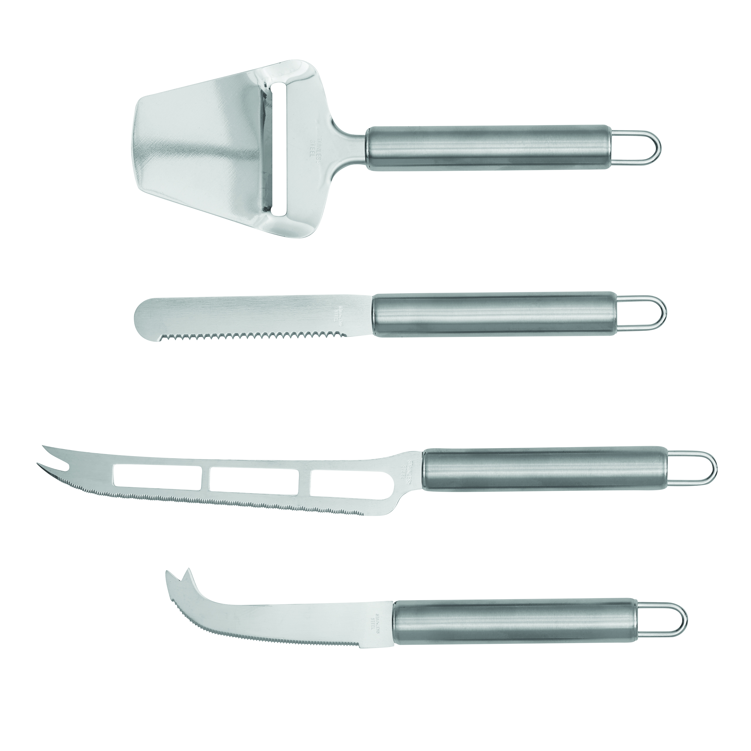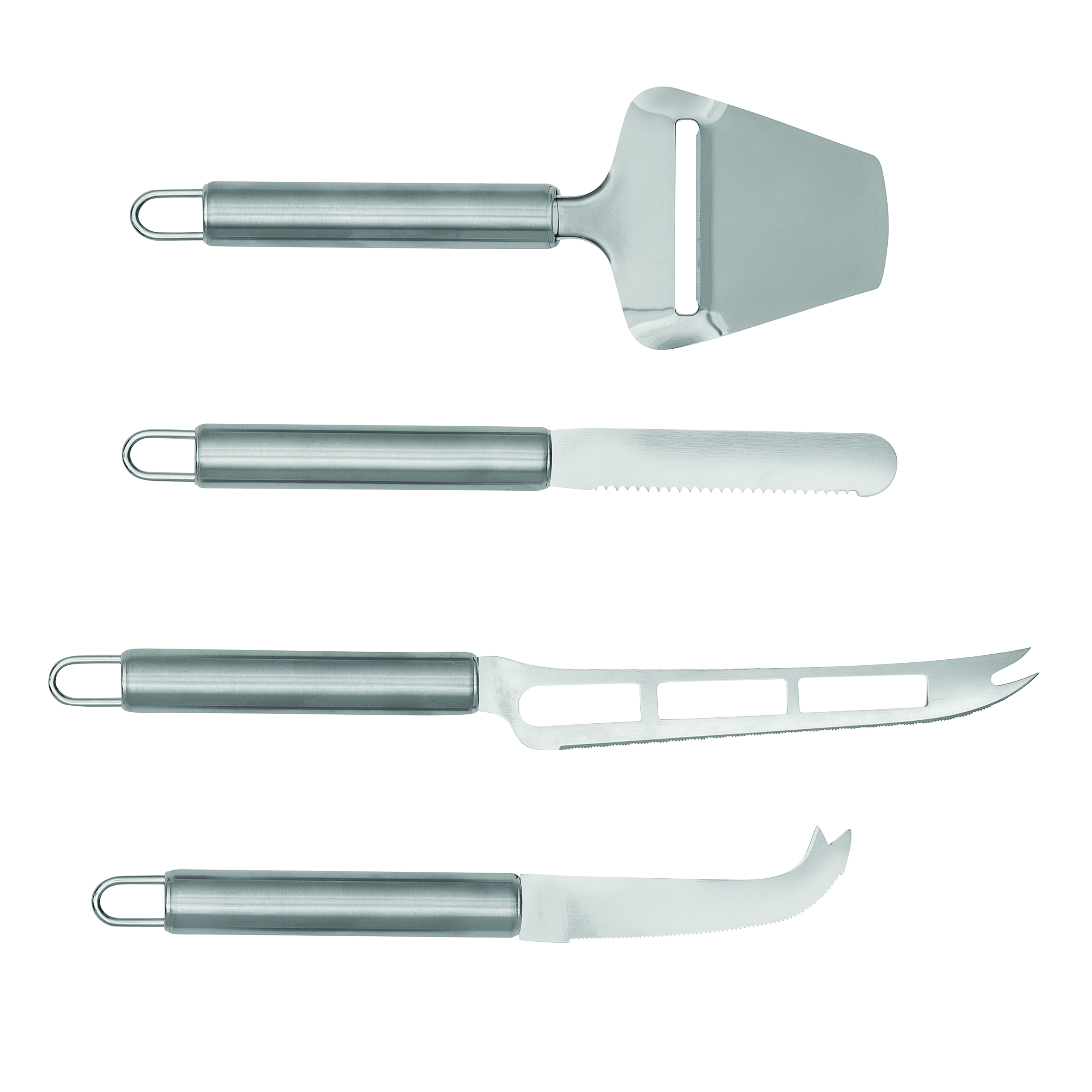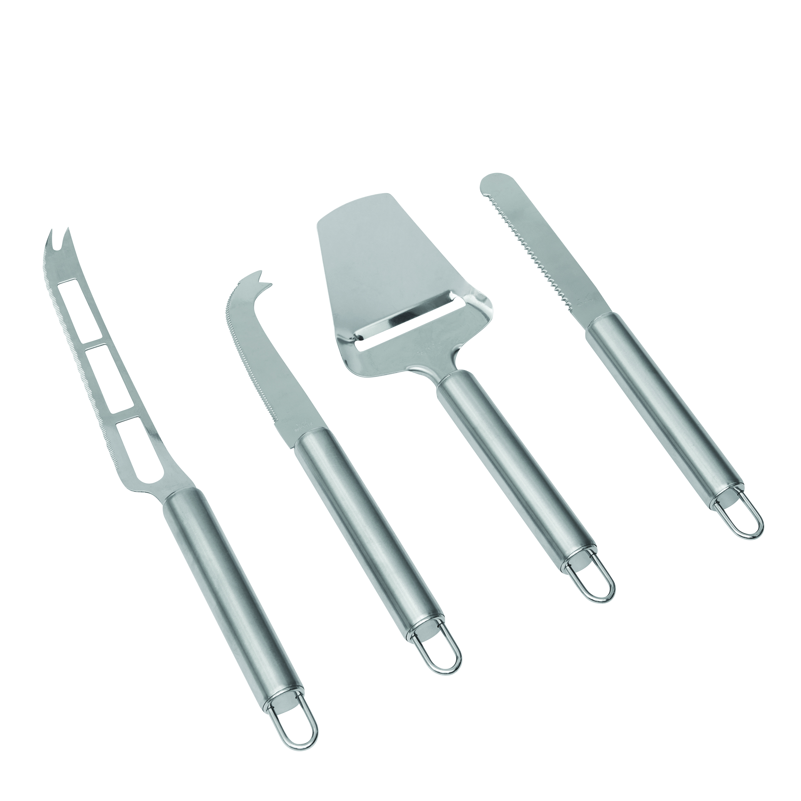 Sztućce do sera CHEESE z nożem do delikatnych serów, nożem do twardych rodzajów sera, ostrzem o falistym kształcie, wszystkie sztućce mają praktyczne zawieszki, pakowane w pudełko.