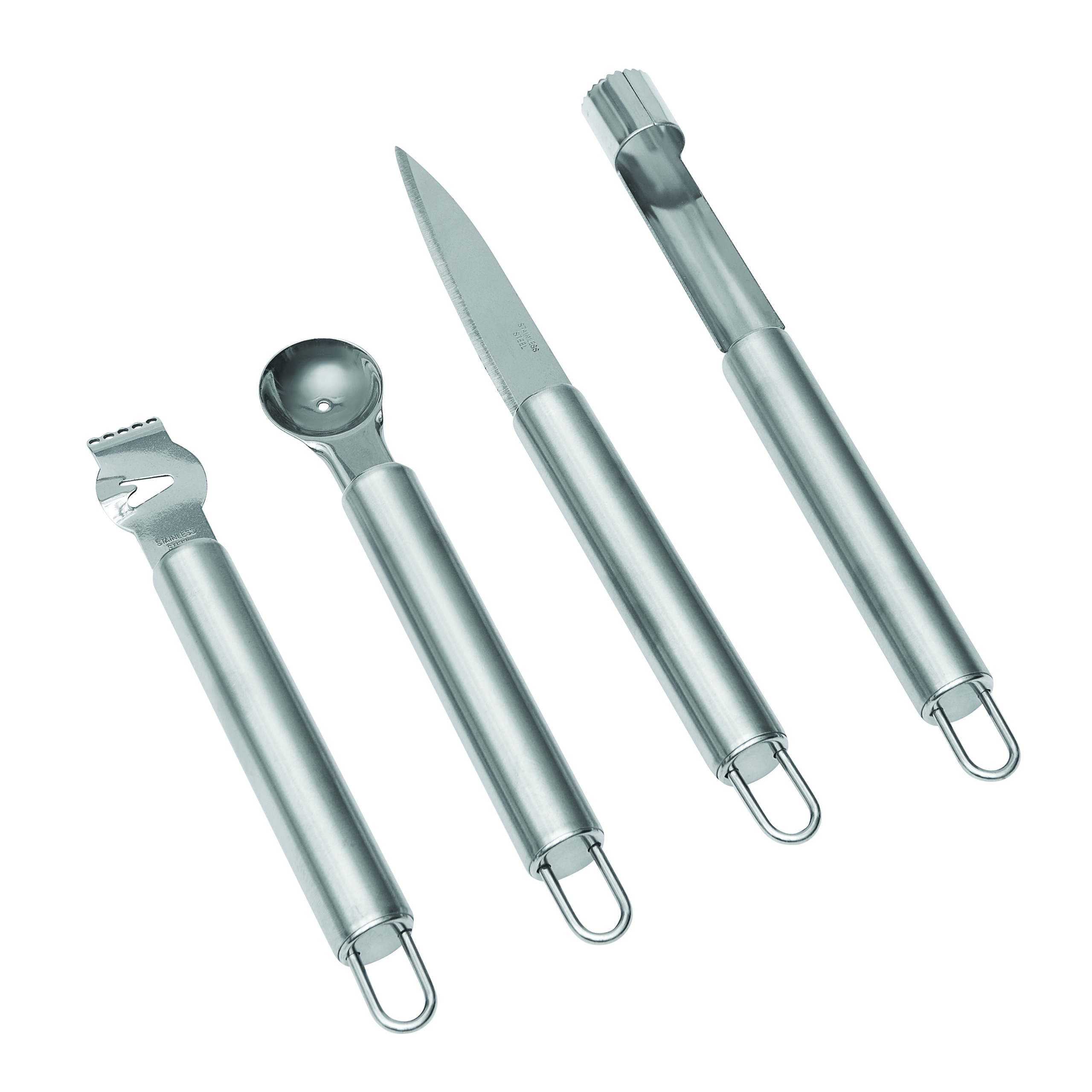 Sztućce do owoców FRUITY z nożem do pomarańczy, tarką do cytryn, łyżką do oczyszczania z pestek, narzędziem do wyjmowania nasion i łusek z jabłek. Wszystkie sztućce mają praktyczne zawieszki, zestaw pakowany w pudełko.