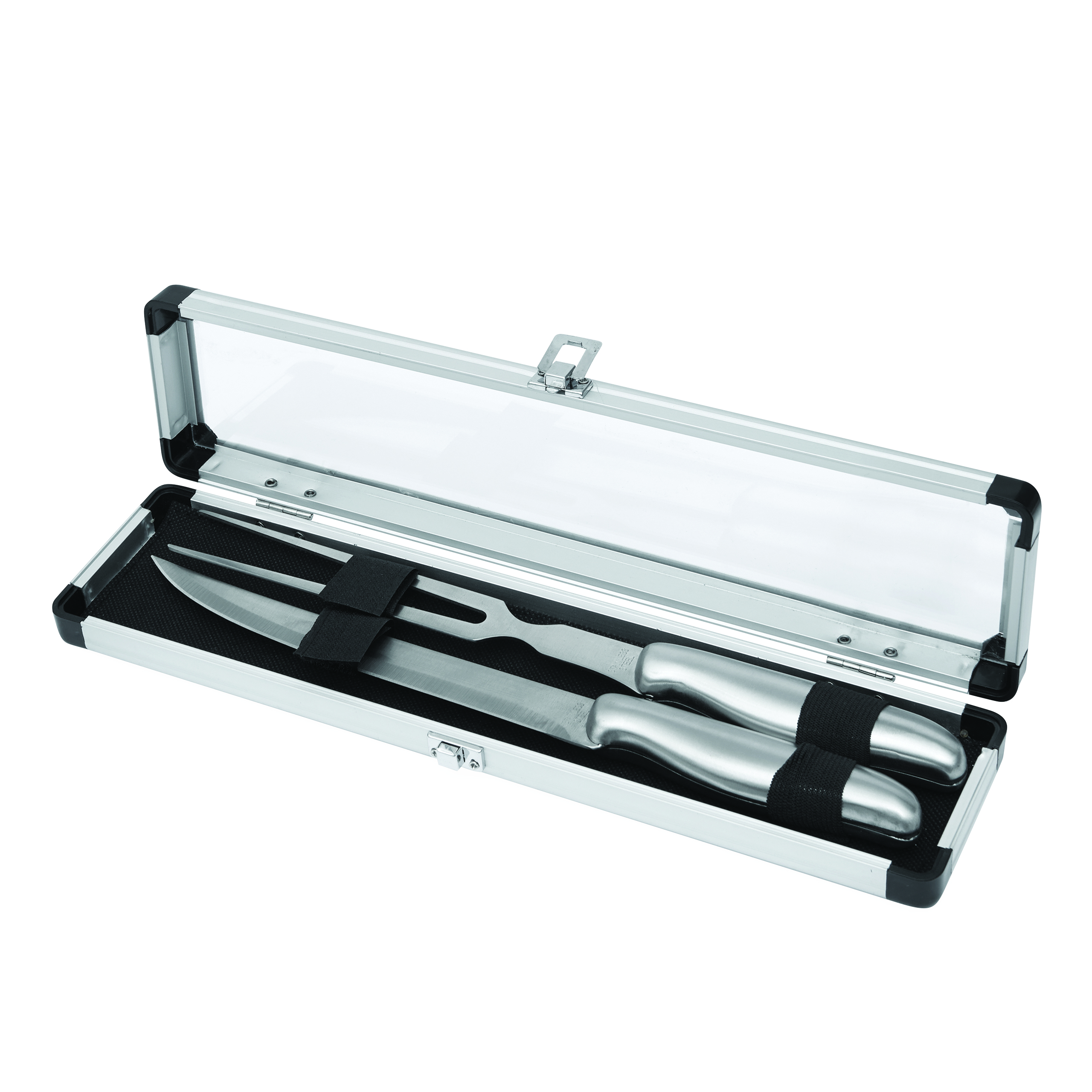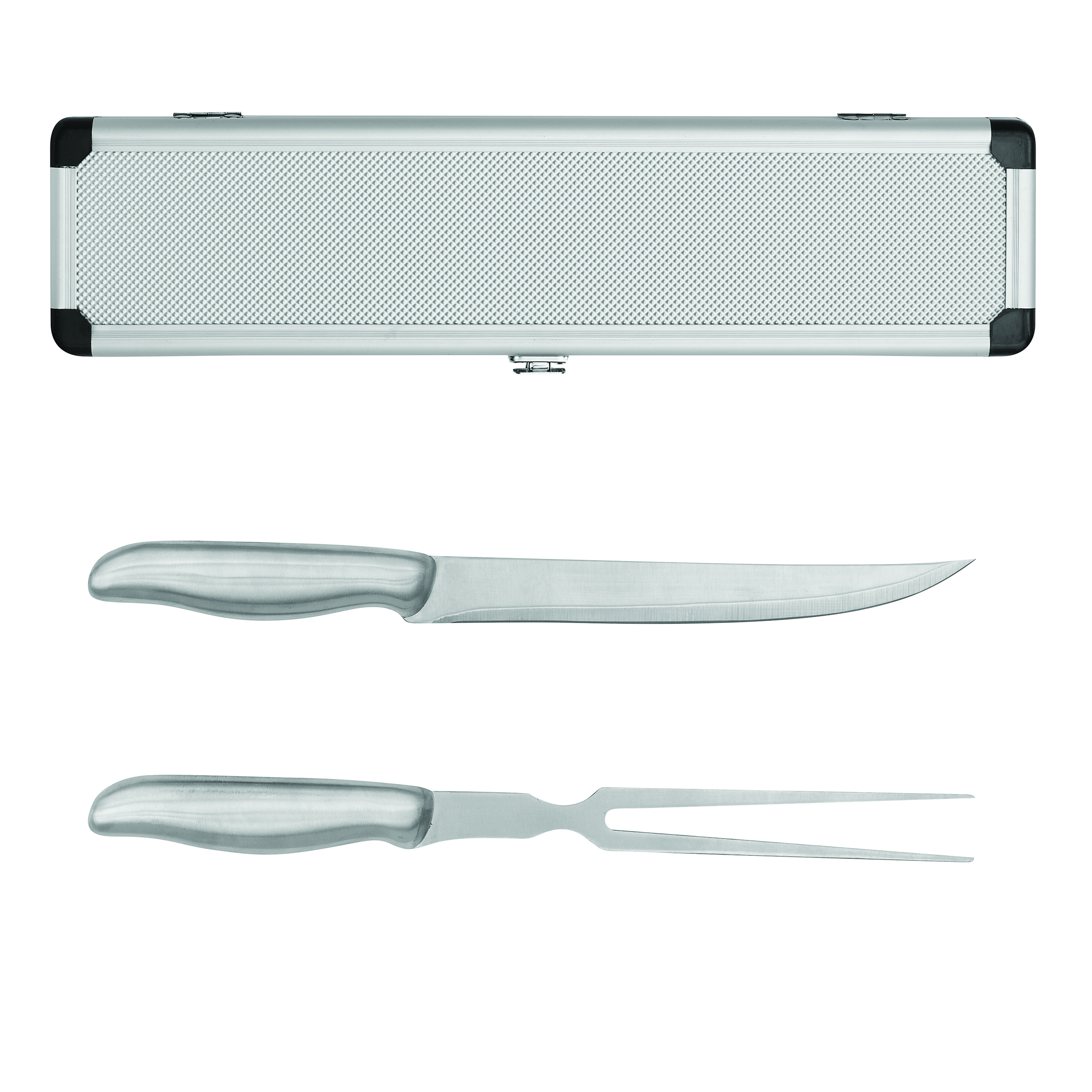 Zestaw sztućców ROASTBEEF wykonanych ze stali nierdzewnej, zawiera nóż i widelec, zapakowany w aluminiowe etui z przezroczystą pokrywką.