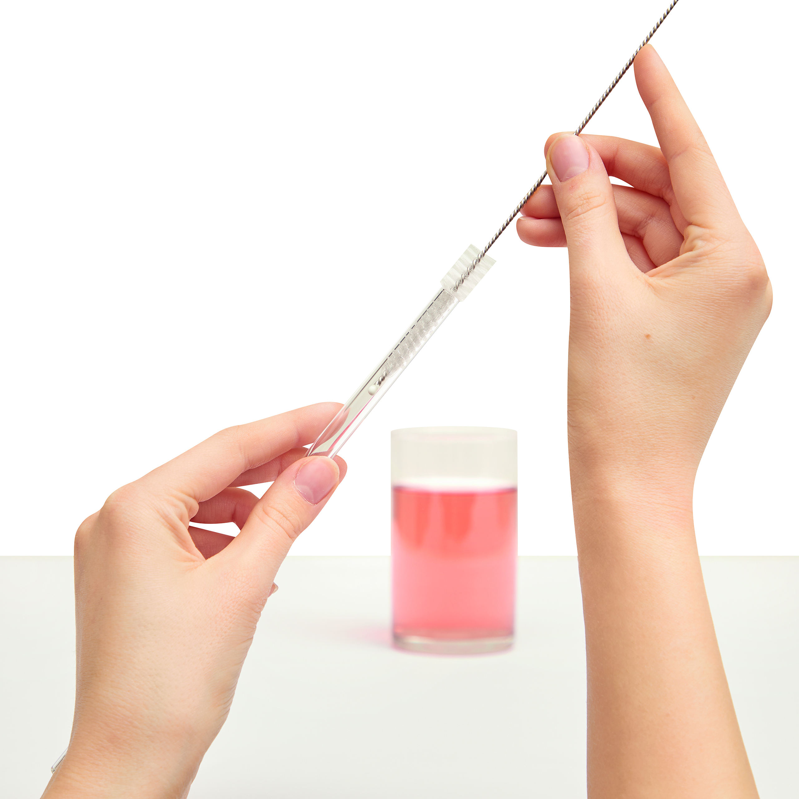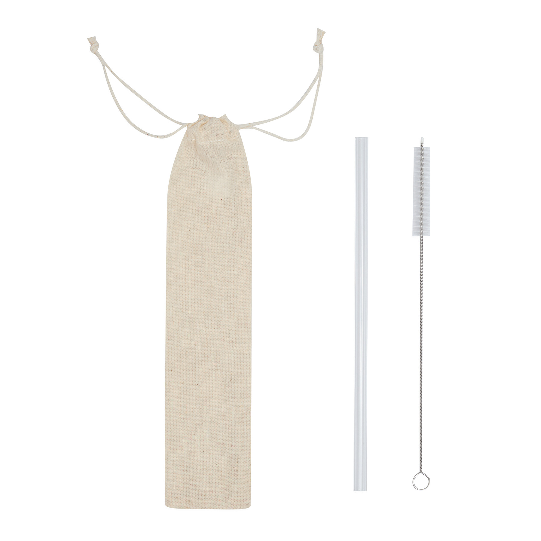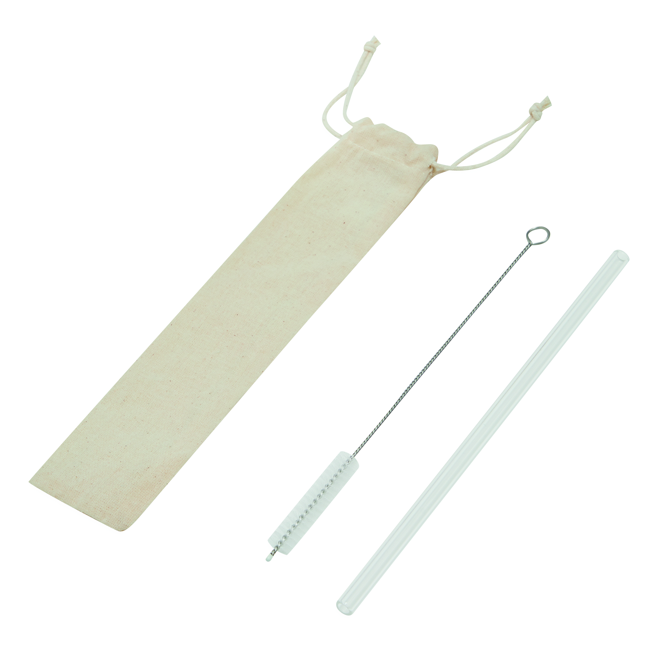 Szklana słomka do picia DRINK SMART. Wielokrotnego użytku z dodatkową szczoteczką do łatwego czyszczenia, w przyjaznym dla środowiska bawełnianym woreczku.