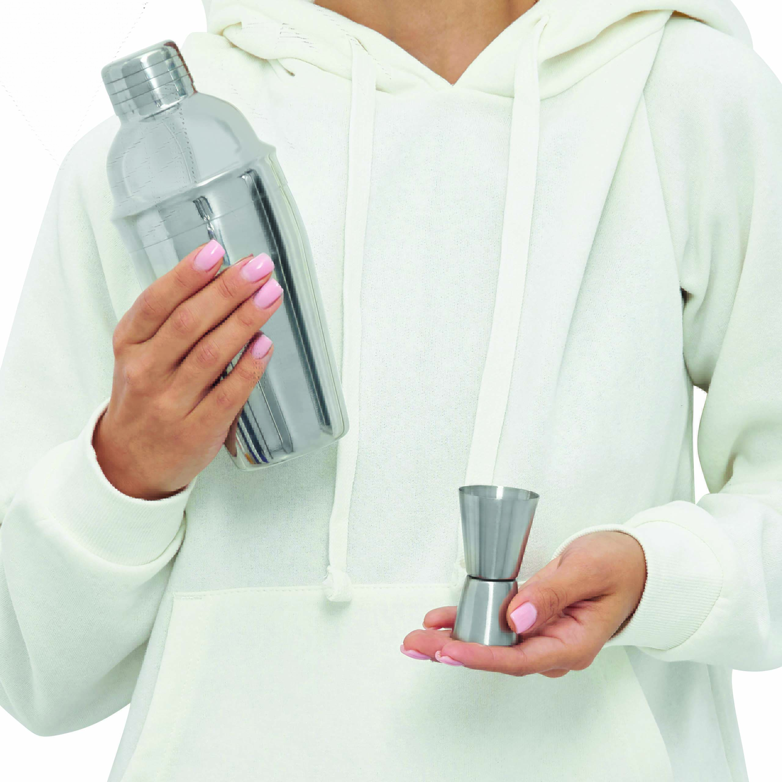 Zestaw barmański BARKEEPER składający się z shakera, pokrywki, sitka i jiggera. Ze stali nierdzewnej. Pojemność ok. 550 ml.