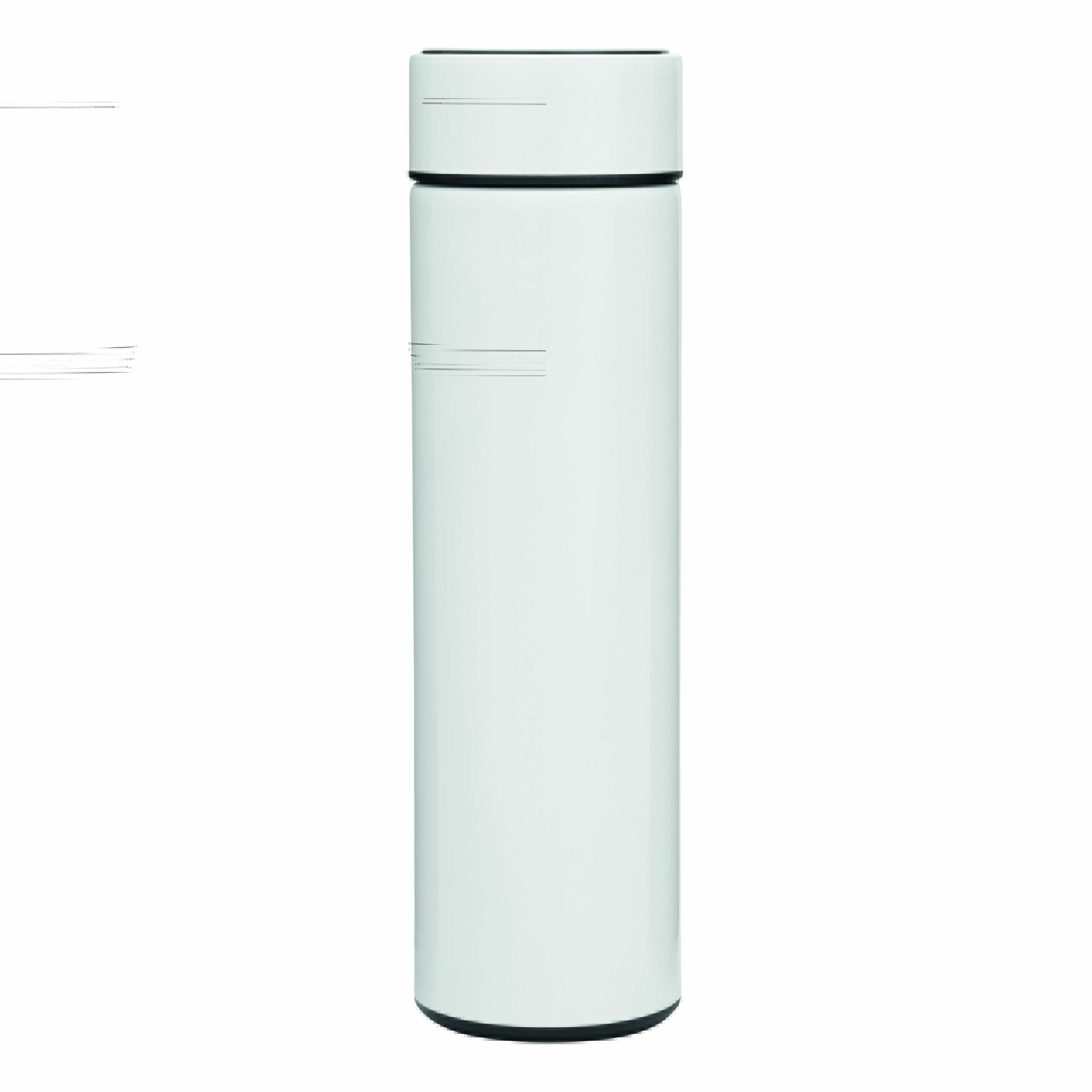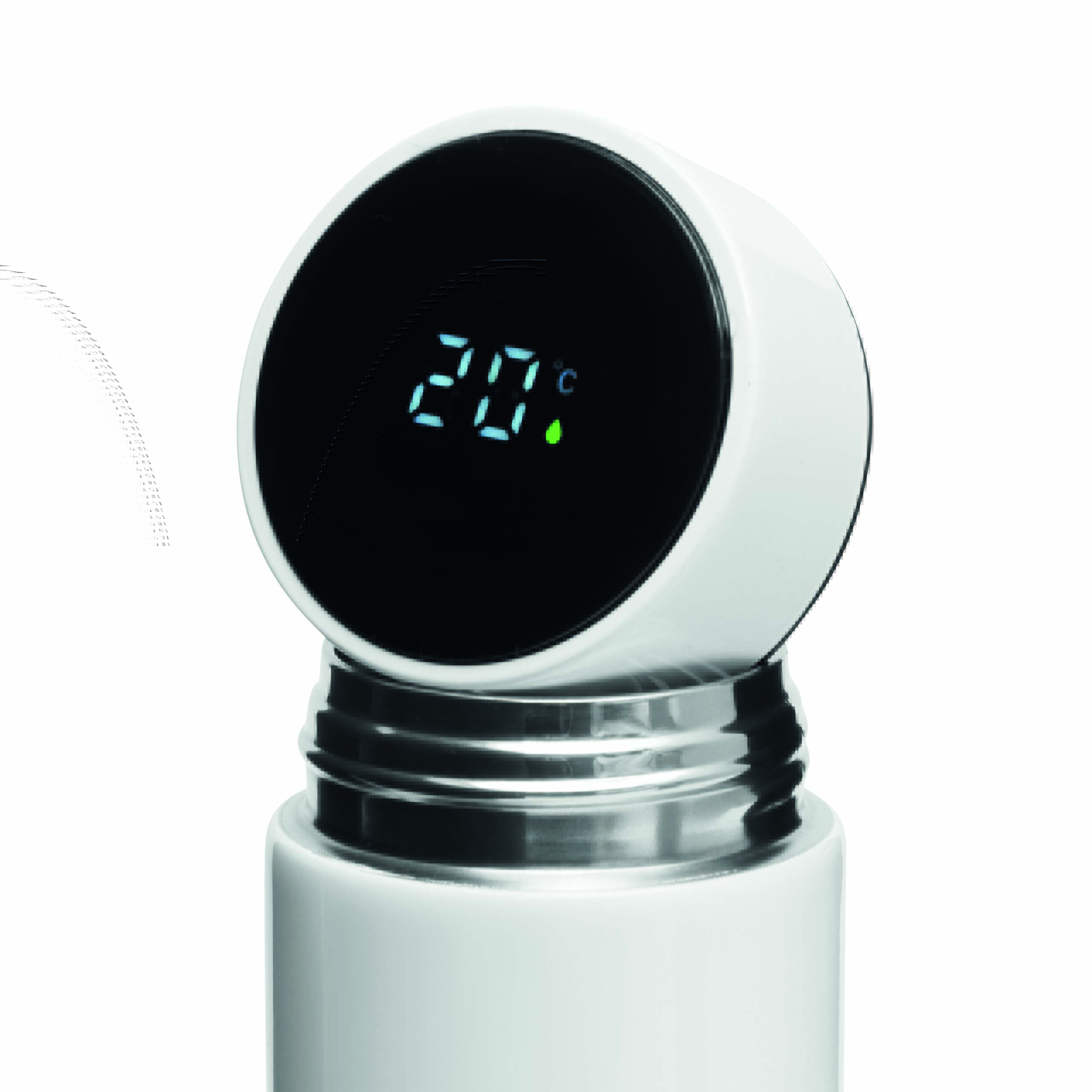 Termos próżniowy o podwójnych ściankach EXQUISITE. Wewnątrz i na zewnątrz ze stali nierdzewnej, z przykręcaną nakrętką ze zintegrowanym termometrem cyfrowym i z wyjmowanym zaparzaczem do herbaty. Pojemność ok. 500 ml. Wbudowana, niewymienna bateria.