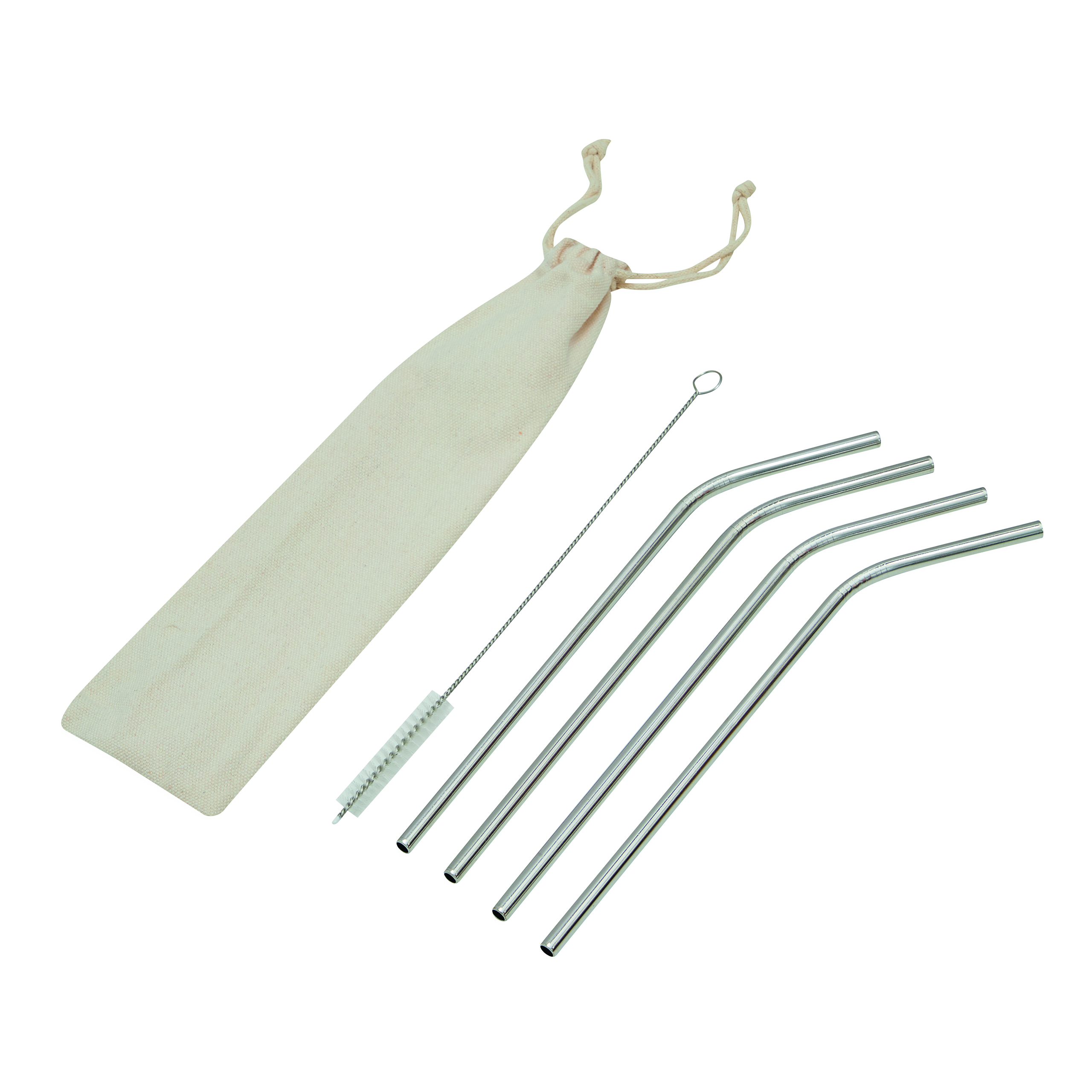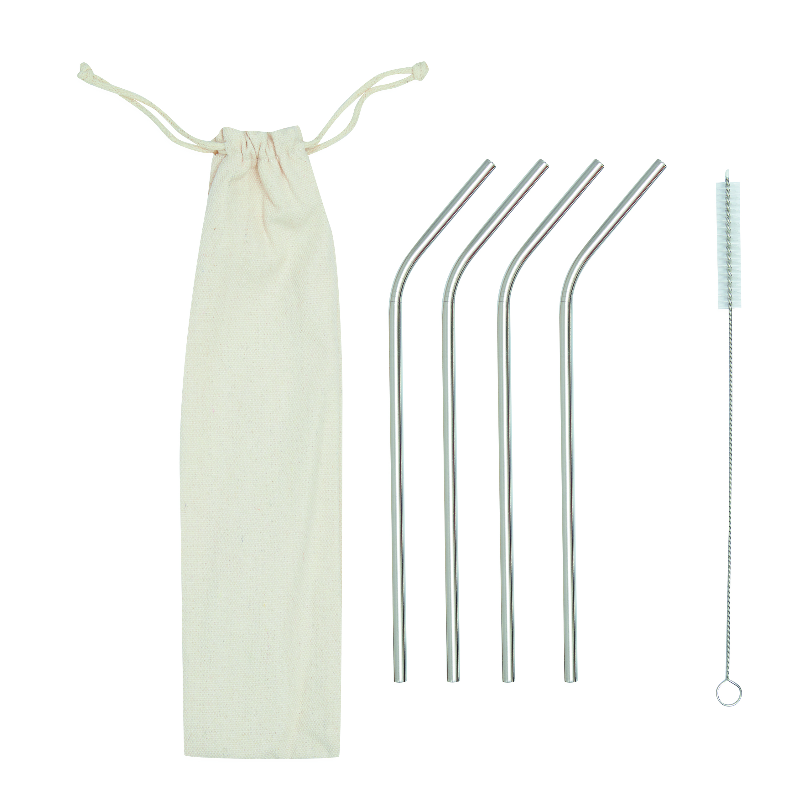 Zestaw słomek ze stali nierdzewnej DRINK HAPPY wykonany z 4 wygiętych słomek i szczoteczki do łatwego czyszczenia, w przyjaznej dla środowiska bawełnianej torbie.