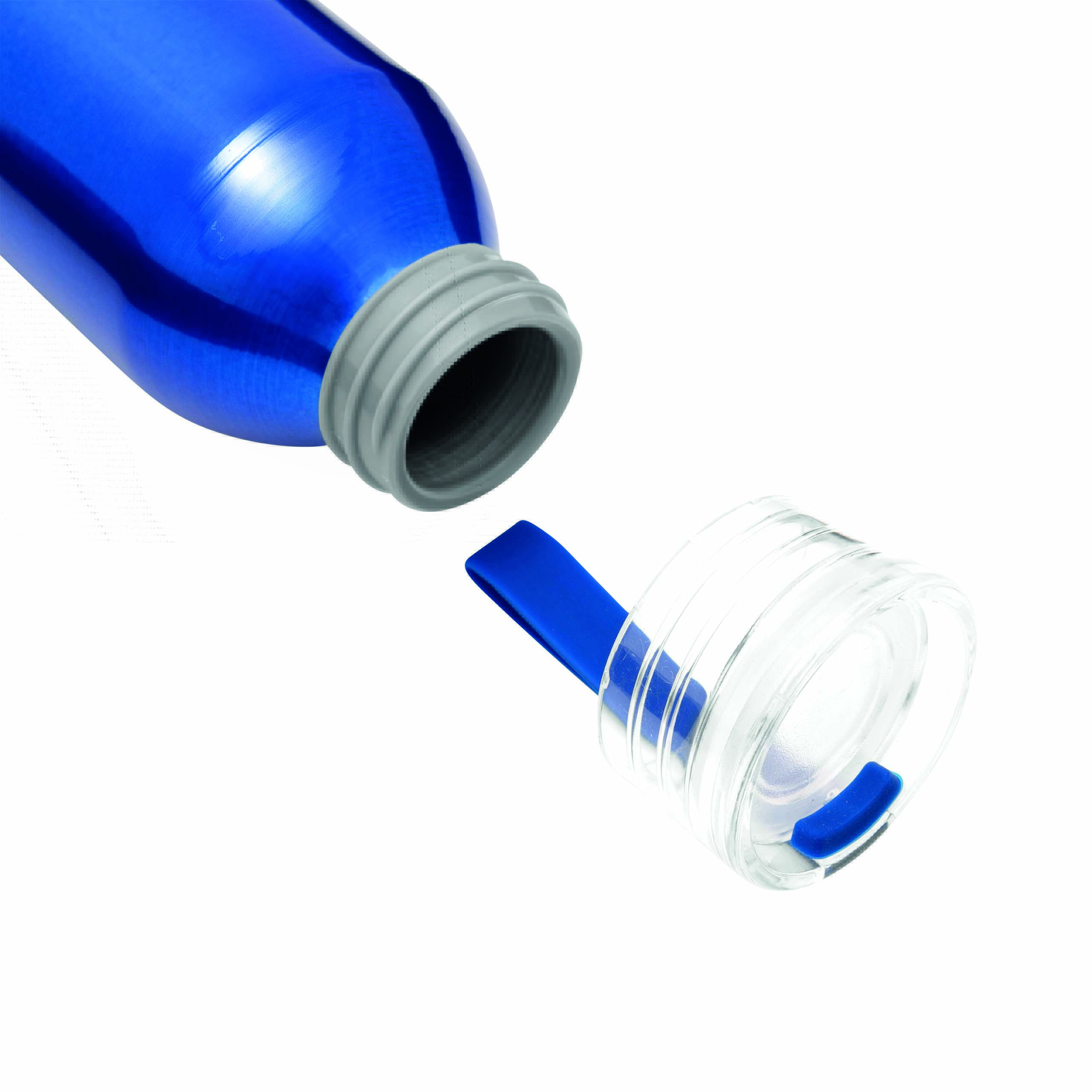 Aluminiowa butelka LOOPED z przezroczystą, plastikową zakrętką z silikonową pętelką. Pojemność ok. 650 ml.