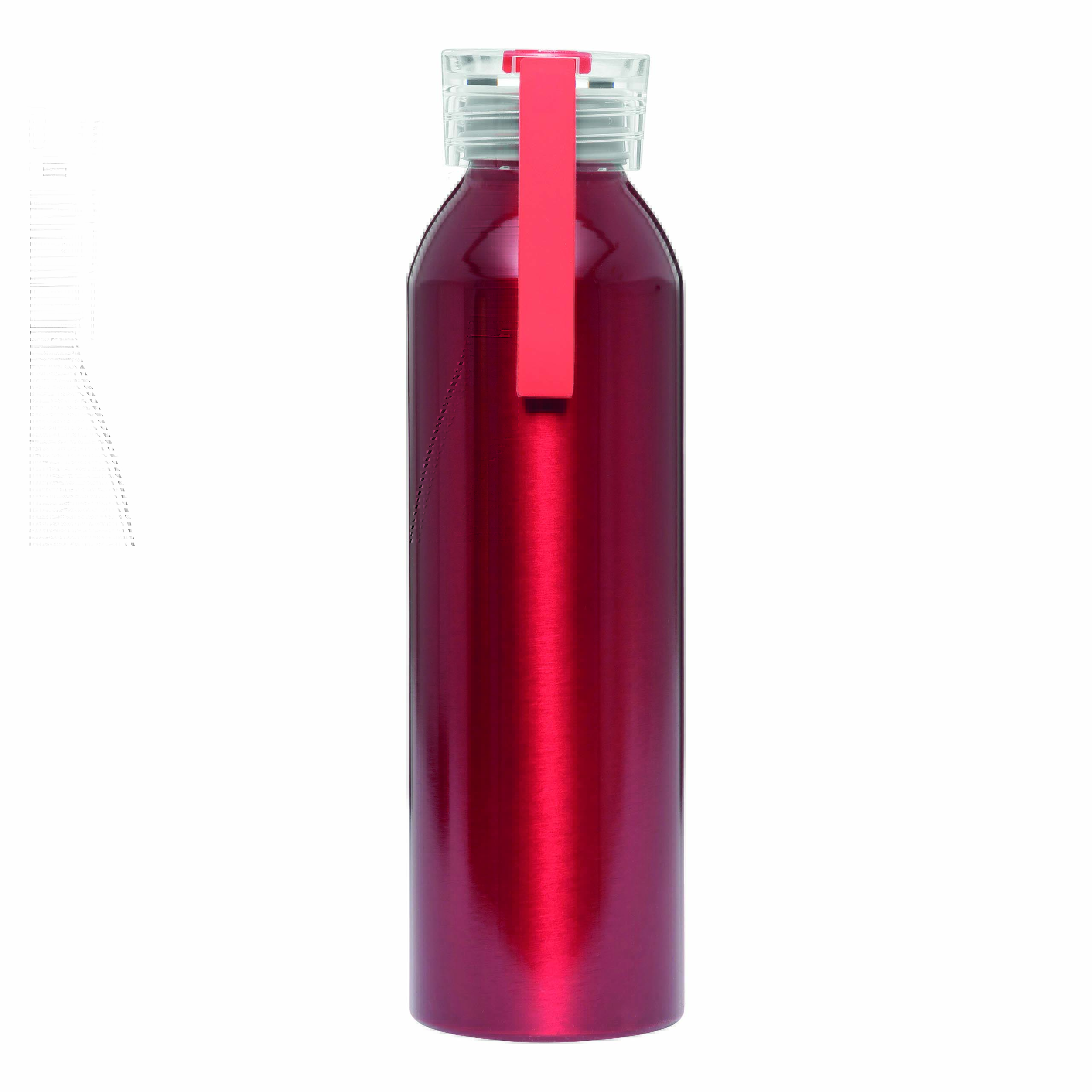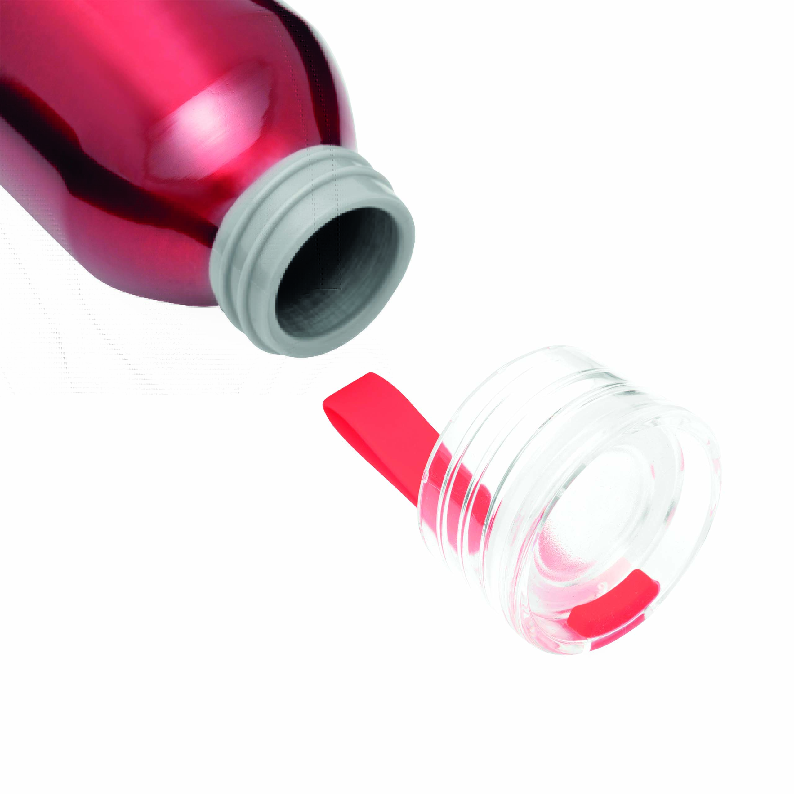 Aluminiowa butelka LOOPED z przezroczystą, plastikową zakrętką z silikonową pętelką. Pojemność ok. 650 ml.