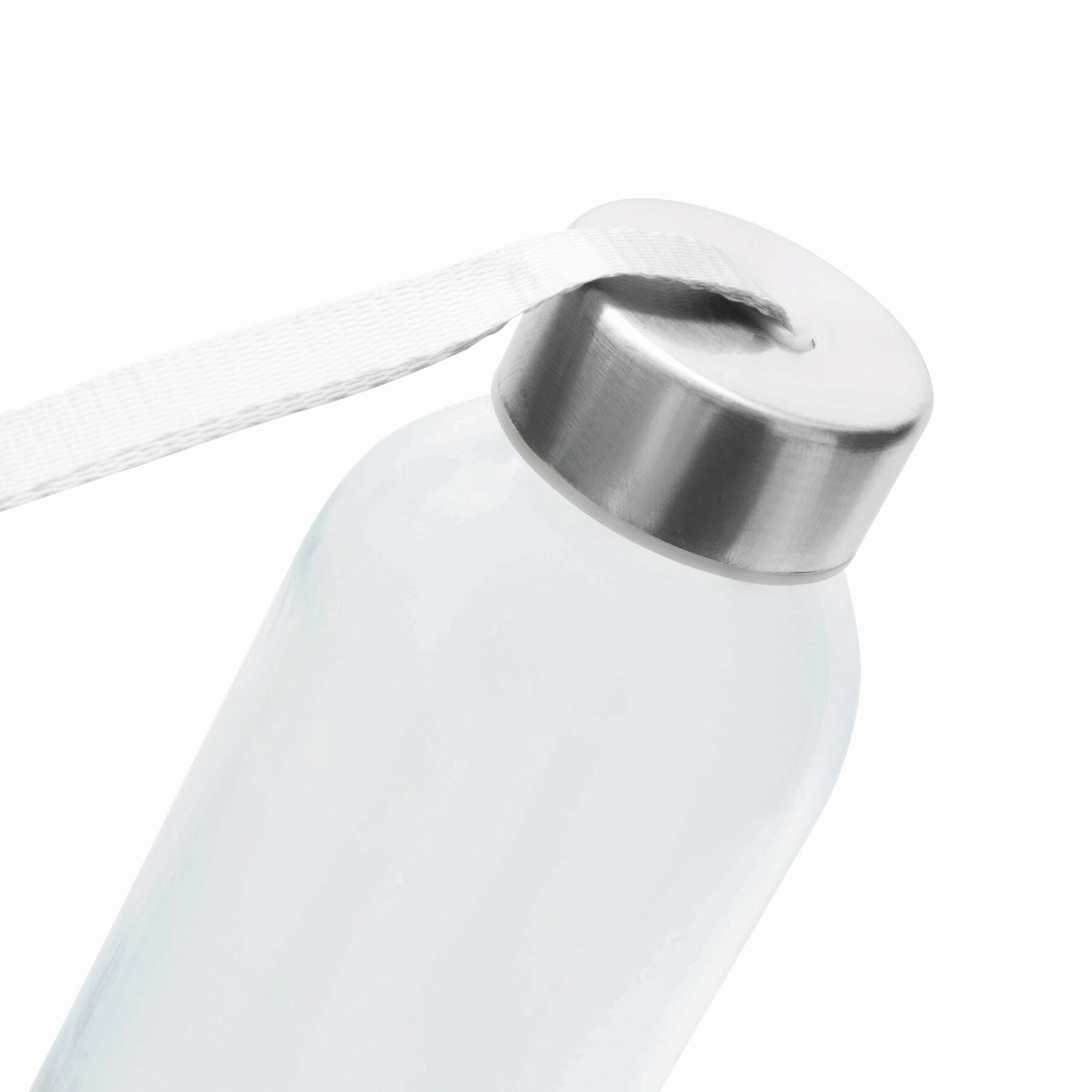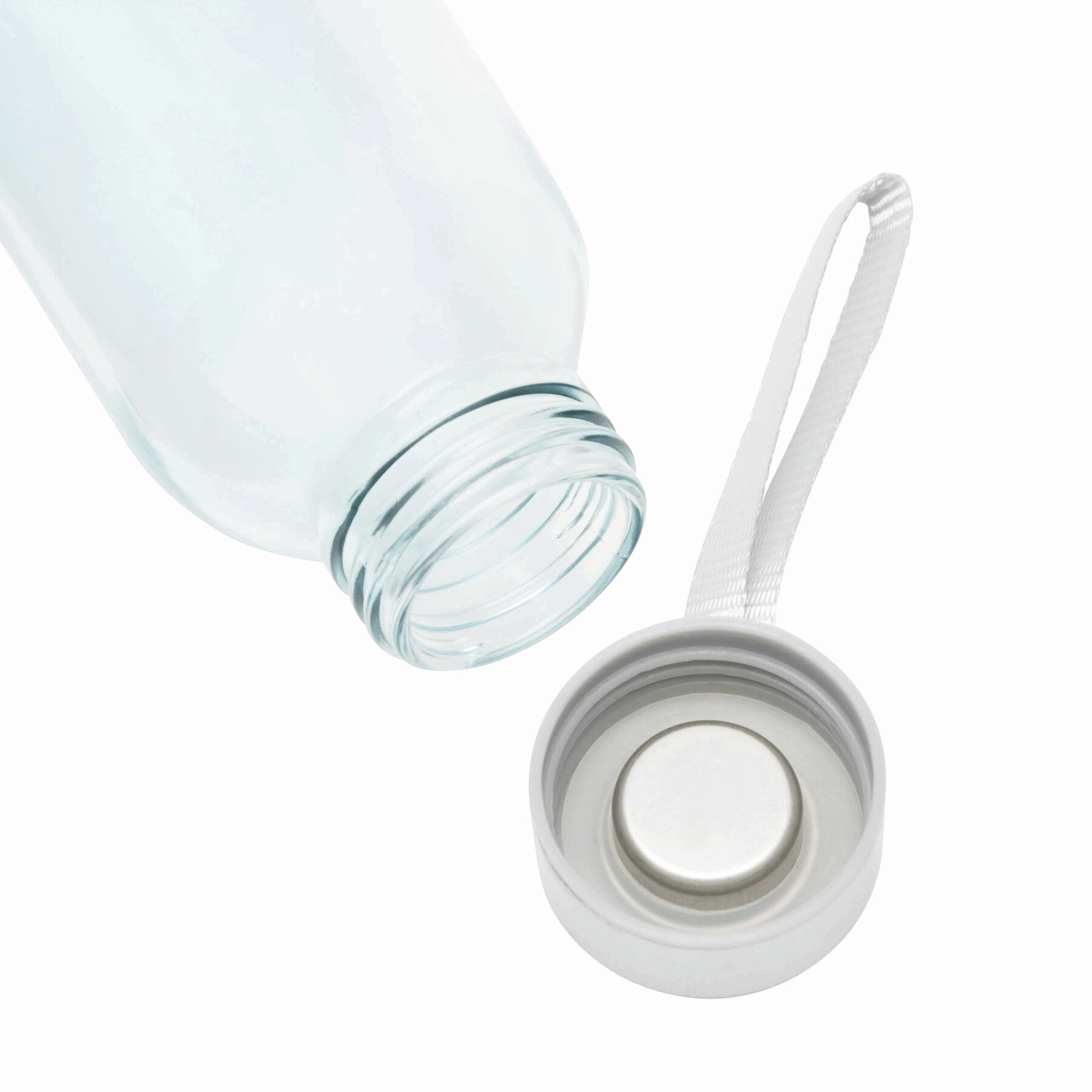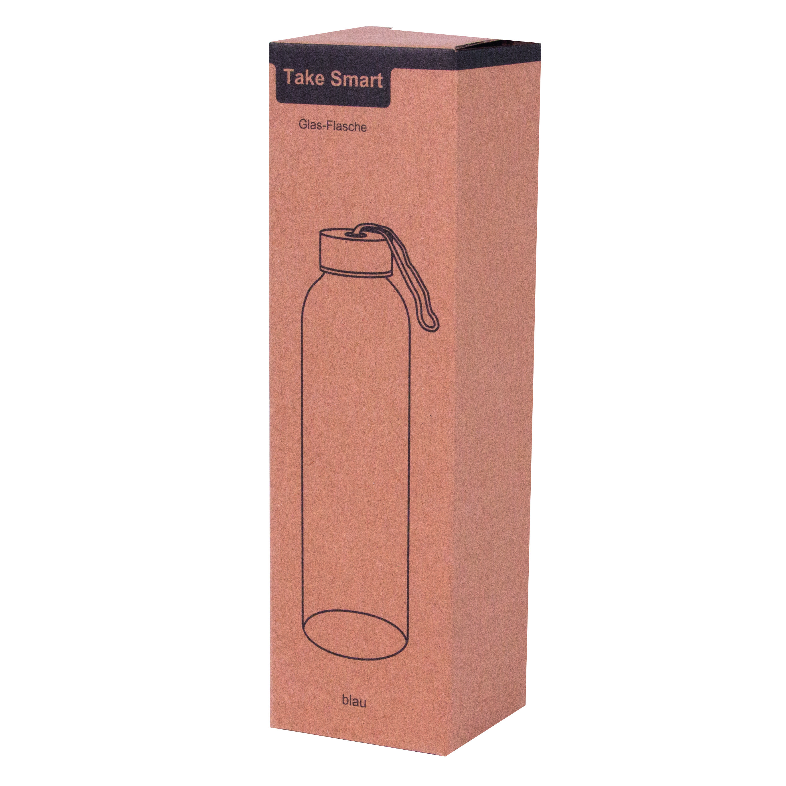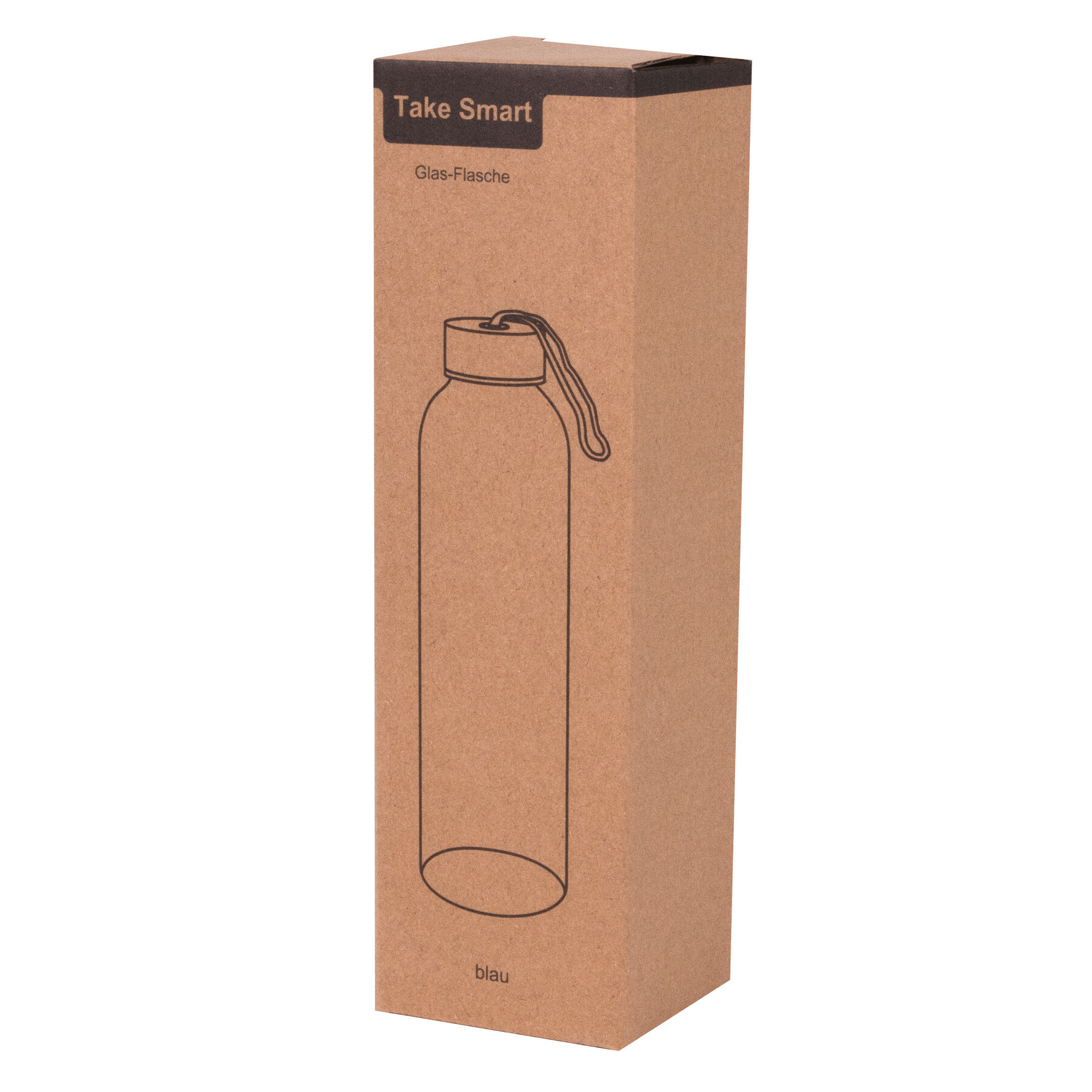 Butelka szklana TAKE SMART. Zakrętka ze stali nierdzewnej z uszczelką silikonową i smyczą. Pojemność ok. 500 ml, w białym pudełku.