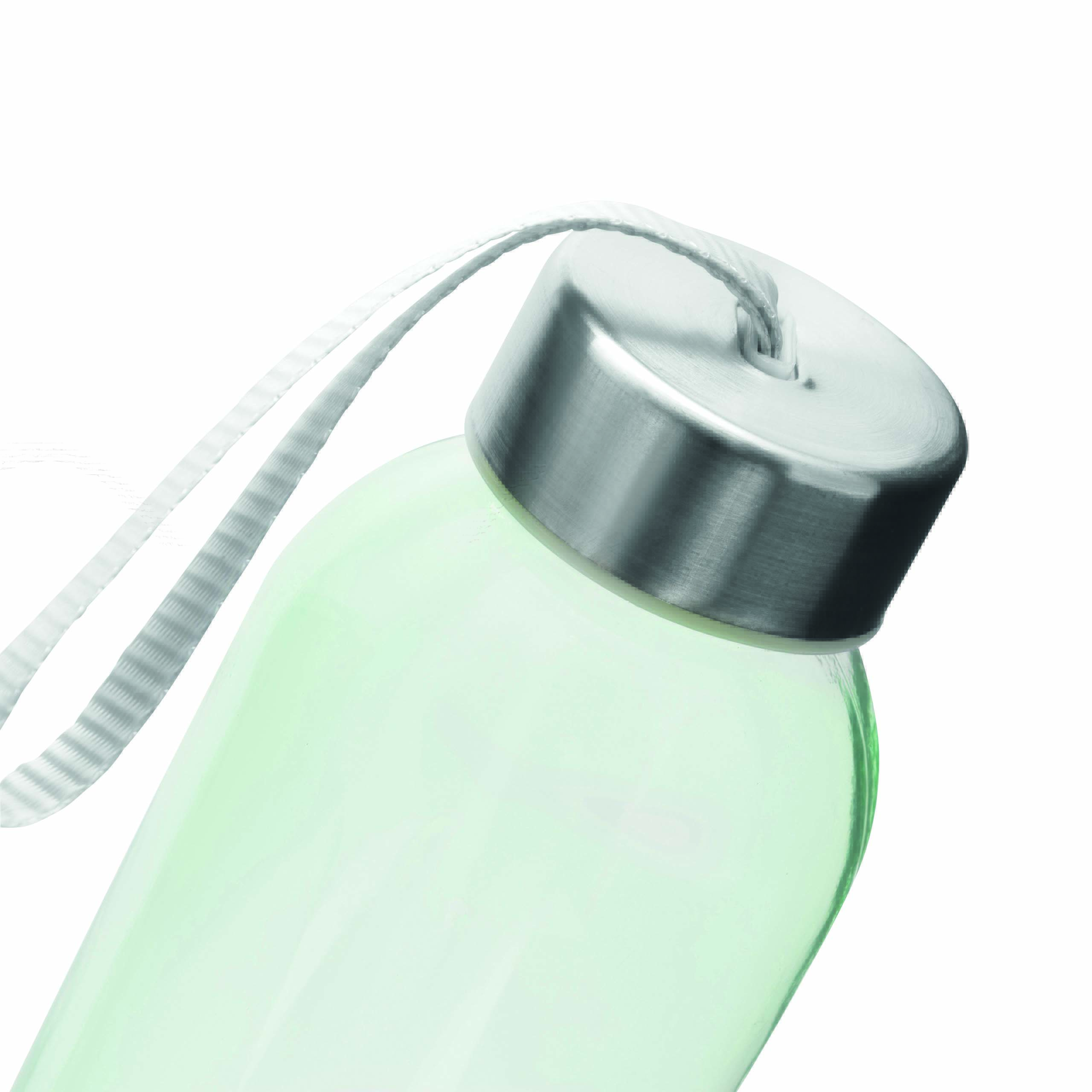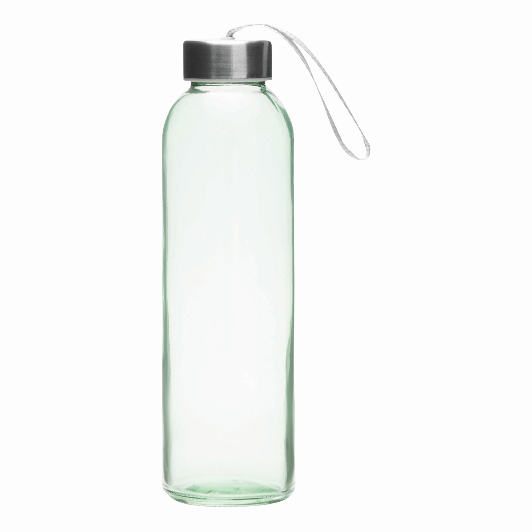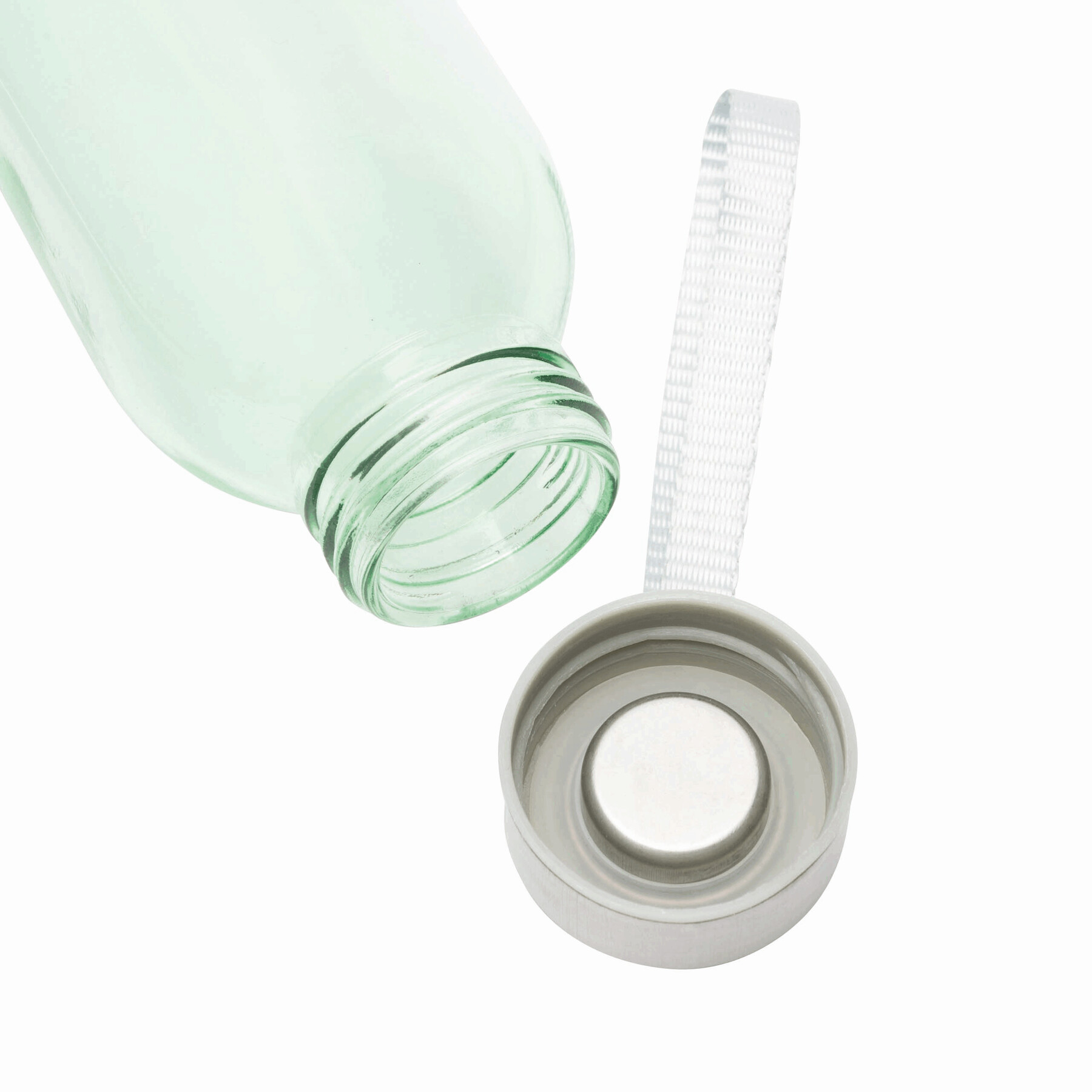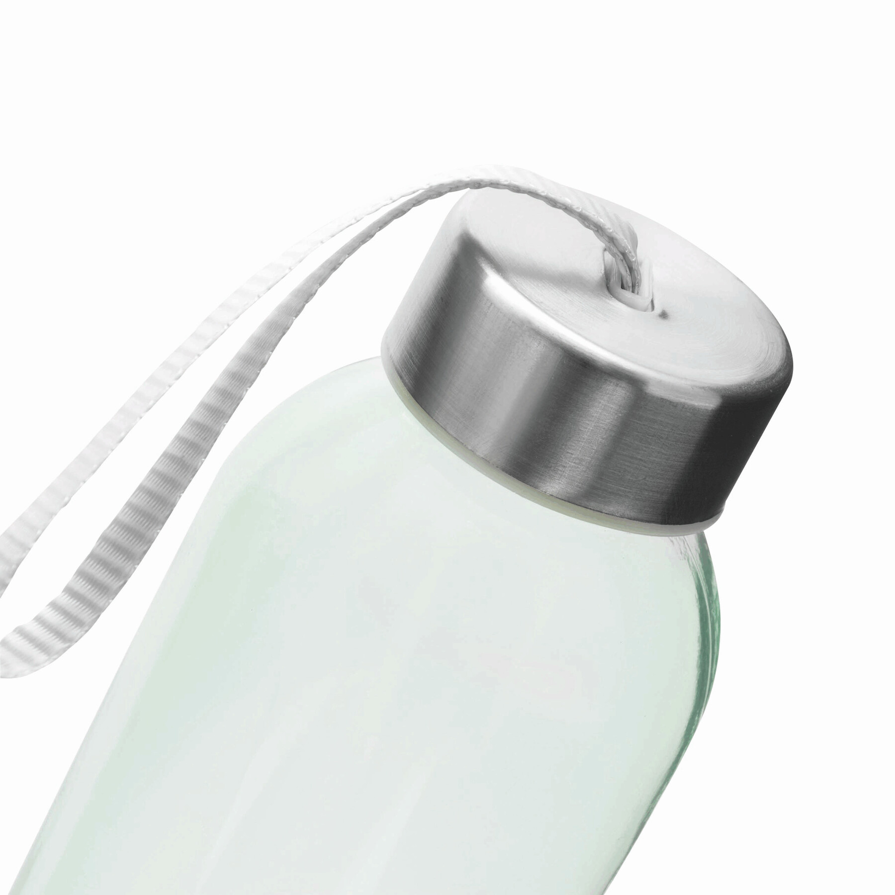 Butelka szklana TAKE SMART. Zakrętka ze stali nierdzewnej z uszczelką silikonową i smyczą. Pojemność ok. 500 ml, w białym pudełku.