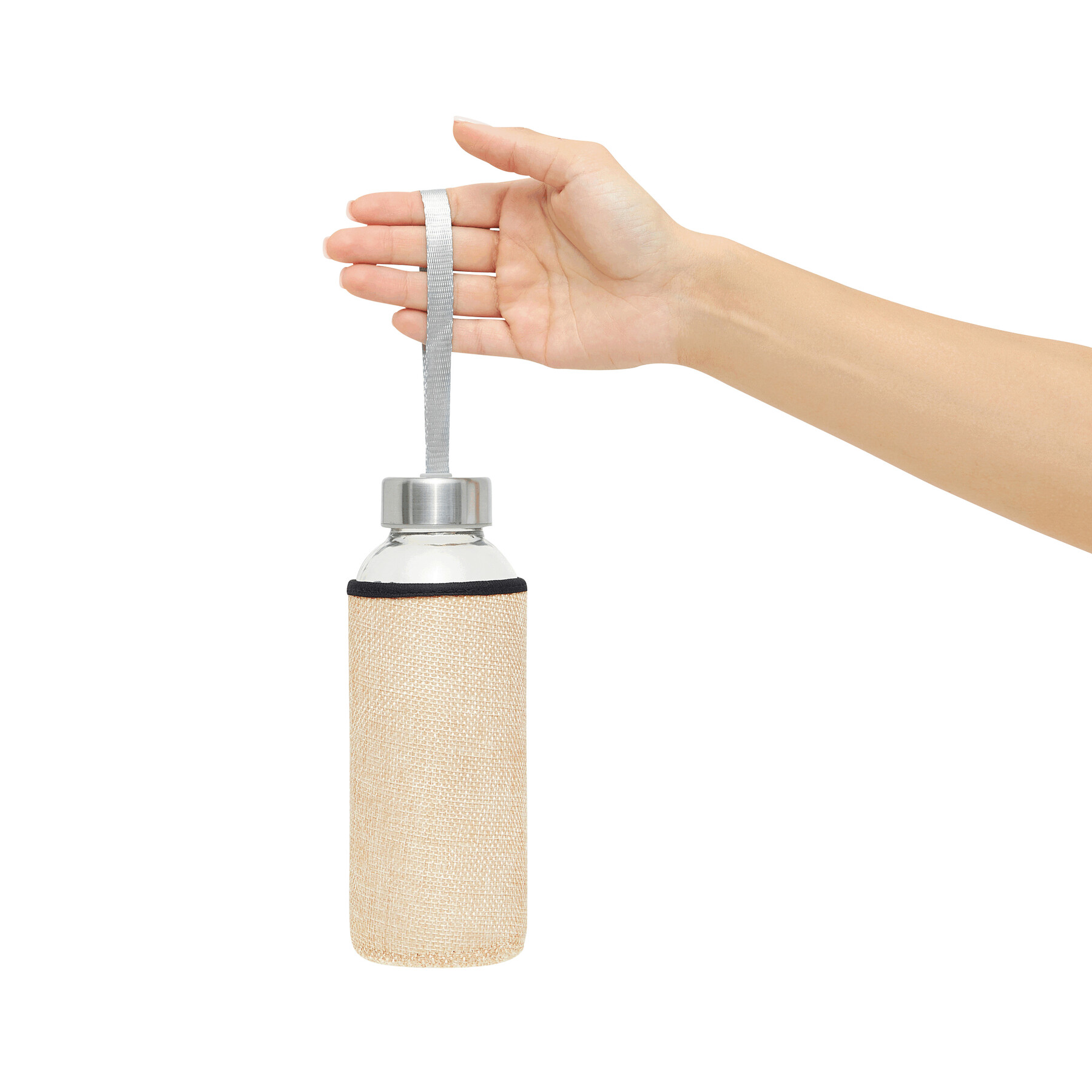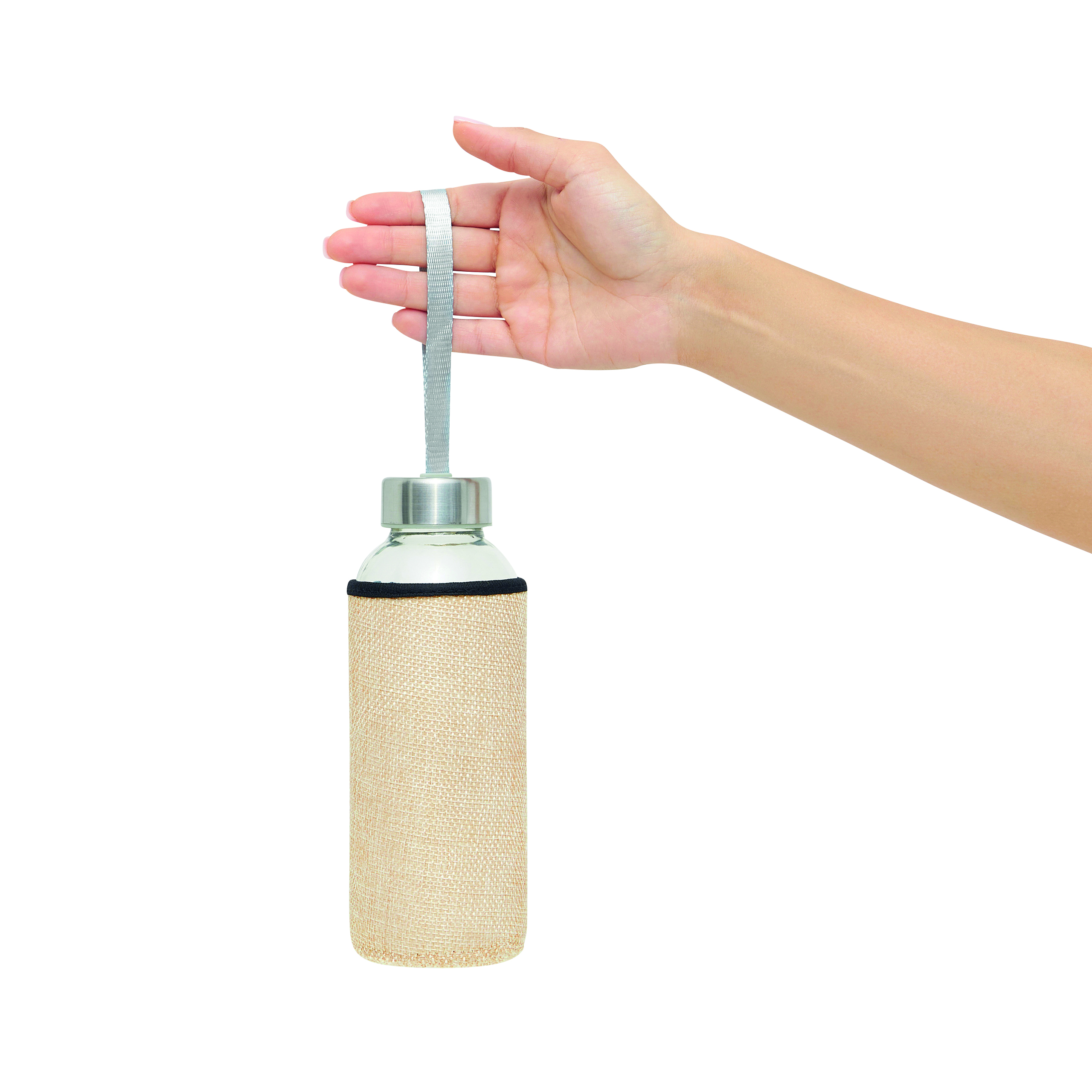 Butelka szklana TAKE JUTY. Zakrętka ze stali nierdzewnej z uszczelką silikonową i smyczą. W kolorowym etui ochronnym z juty. Pojemność ok. 450 ml, w białym pudełku.