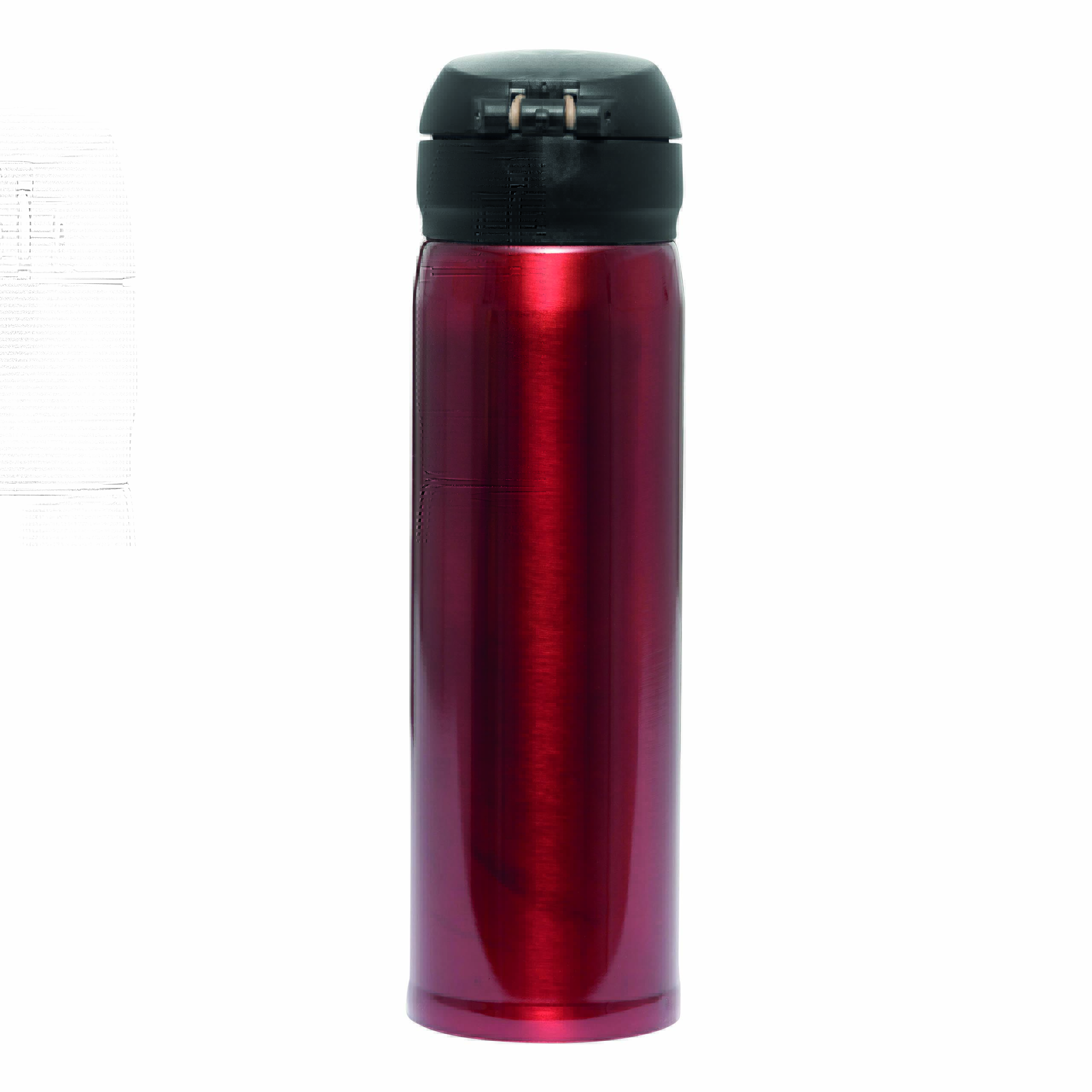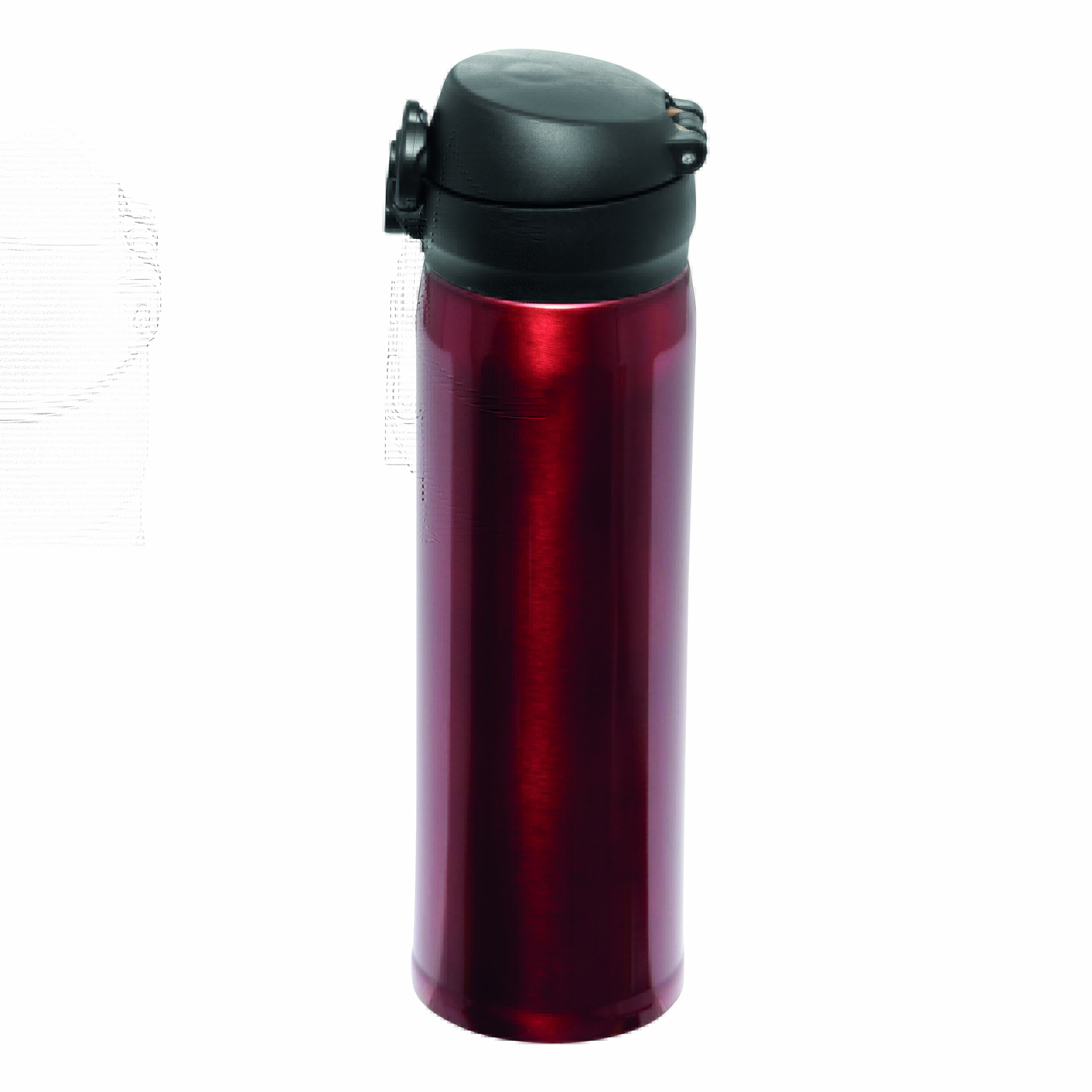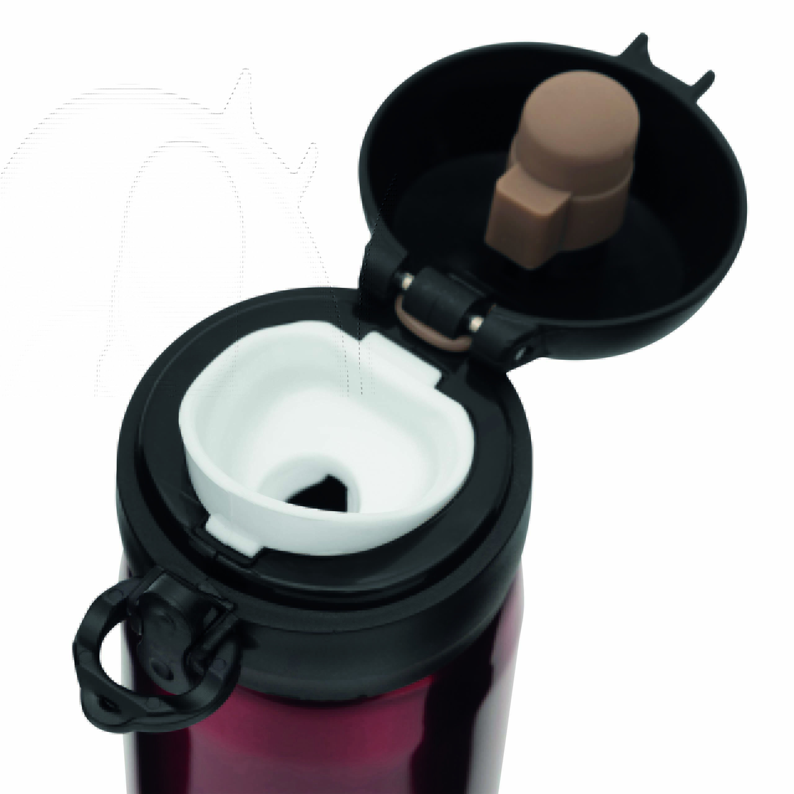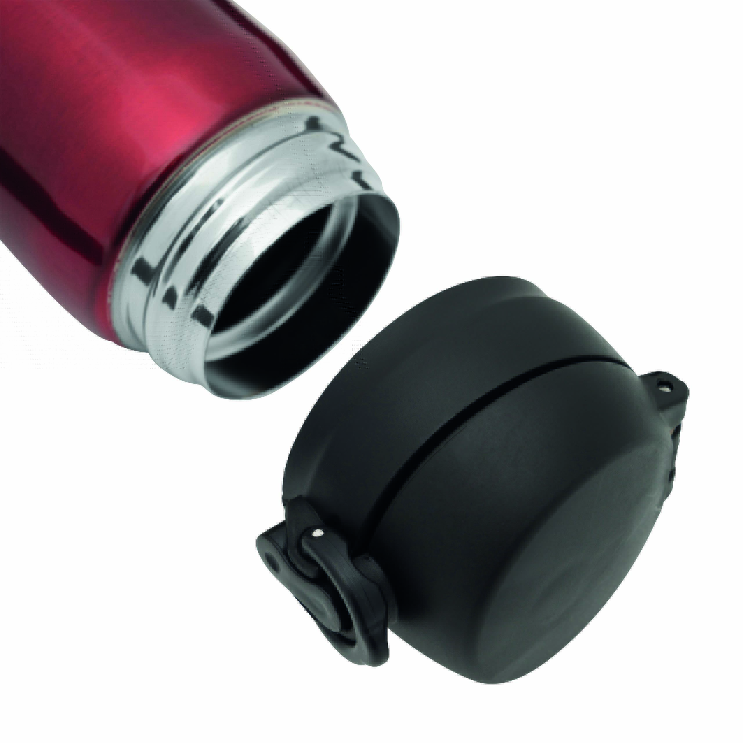 Butelka próżniowa OOLONG. Dwuścienna, wewnątrz i na zewnątrz ze stali nierdzewnej, z dzióbkiem i zakrętką, z przyciskiem i bezpiecznym zamknięciem. Pojemność ok. 400 ml.