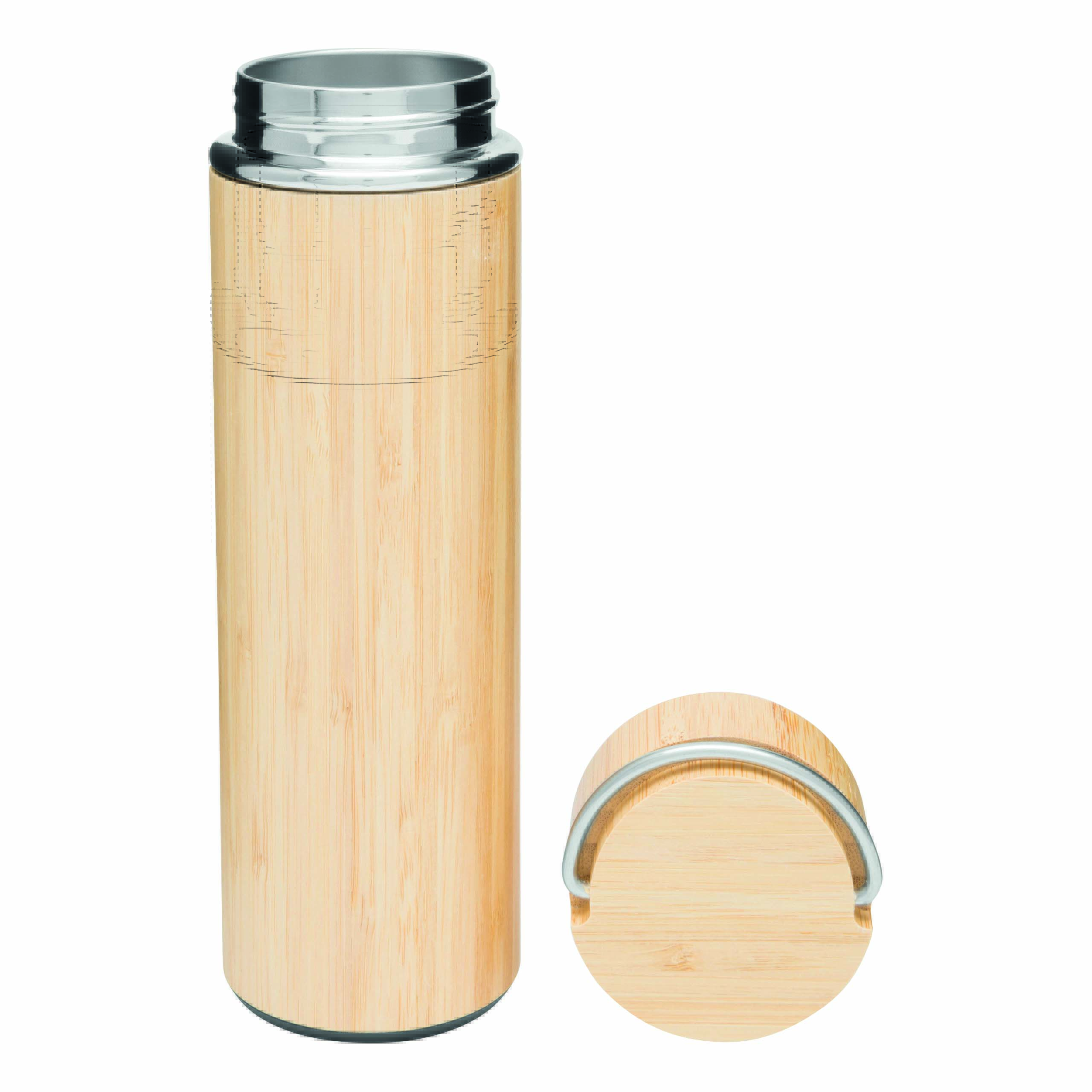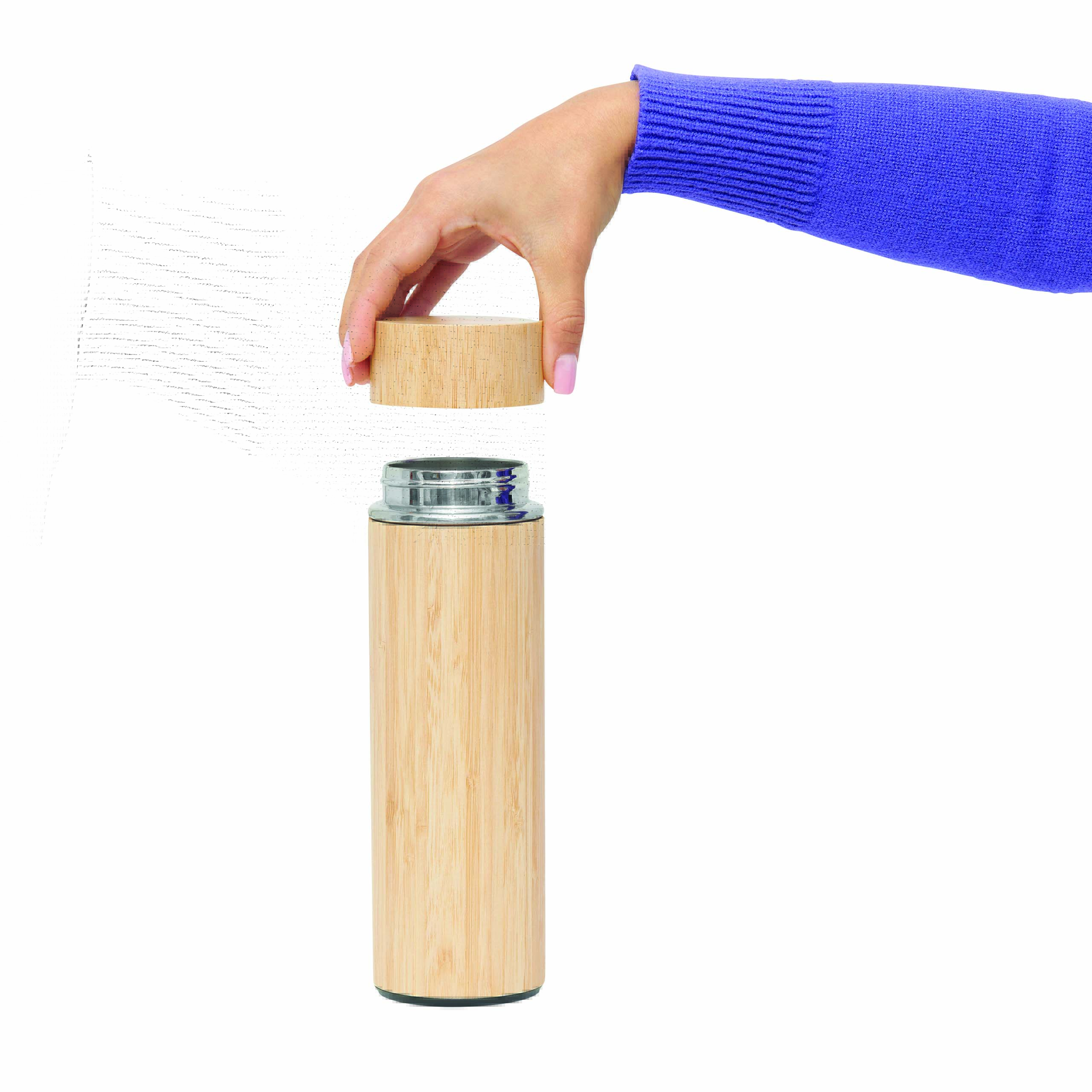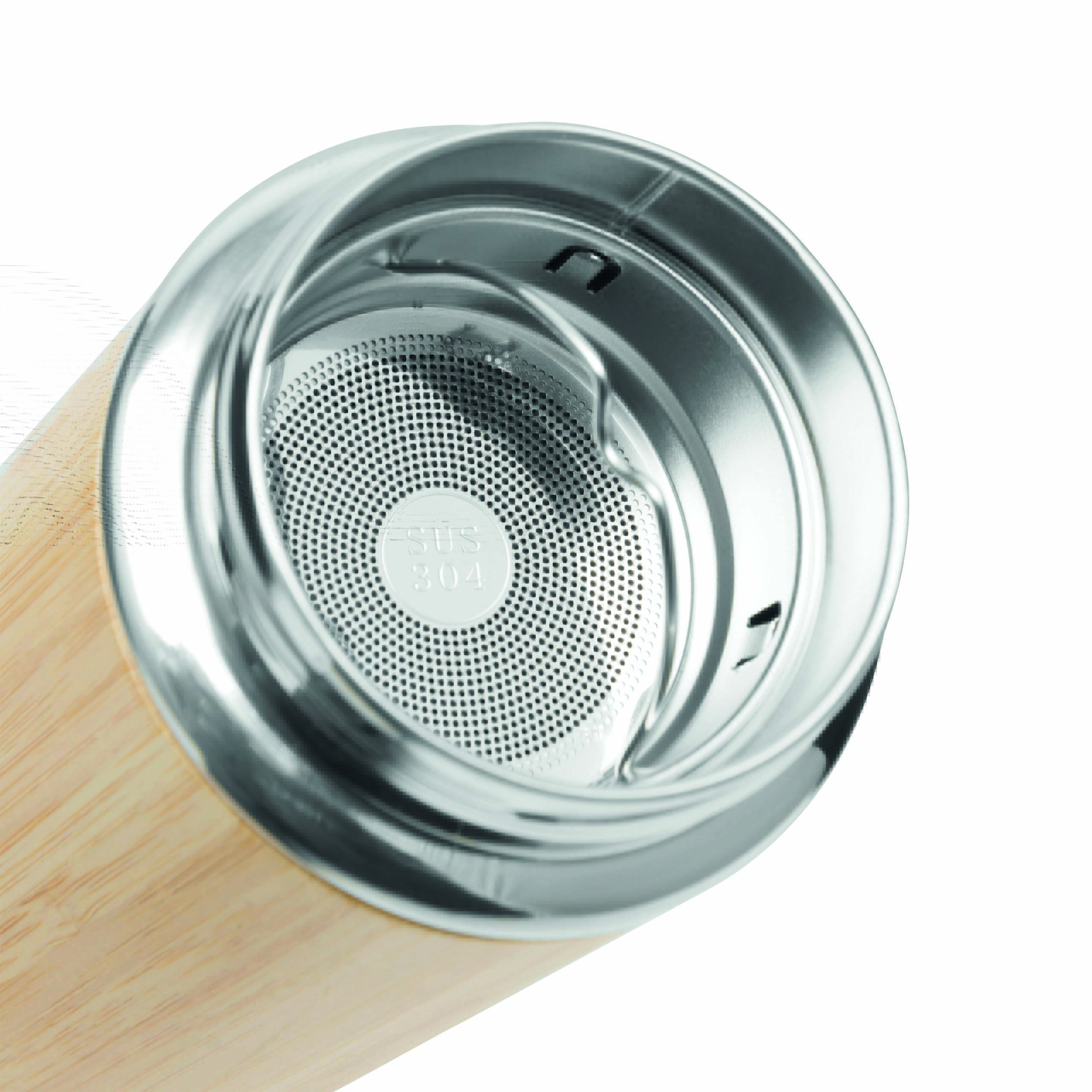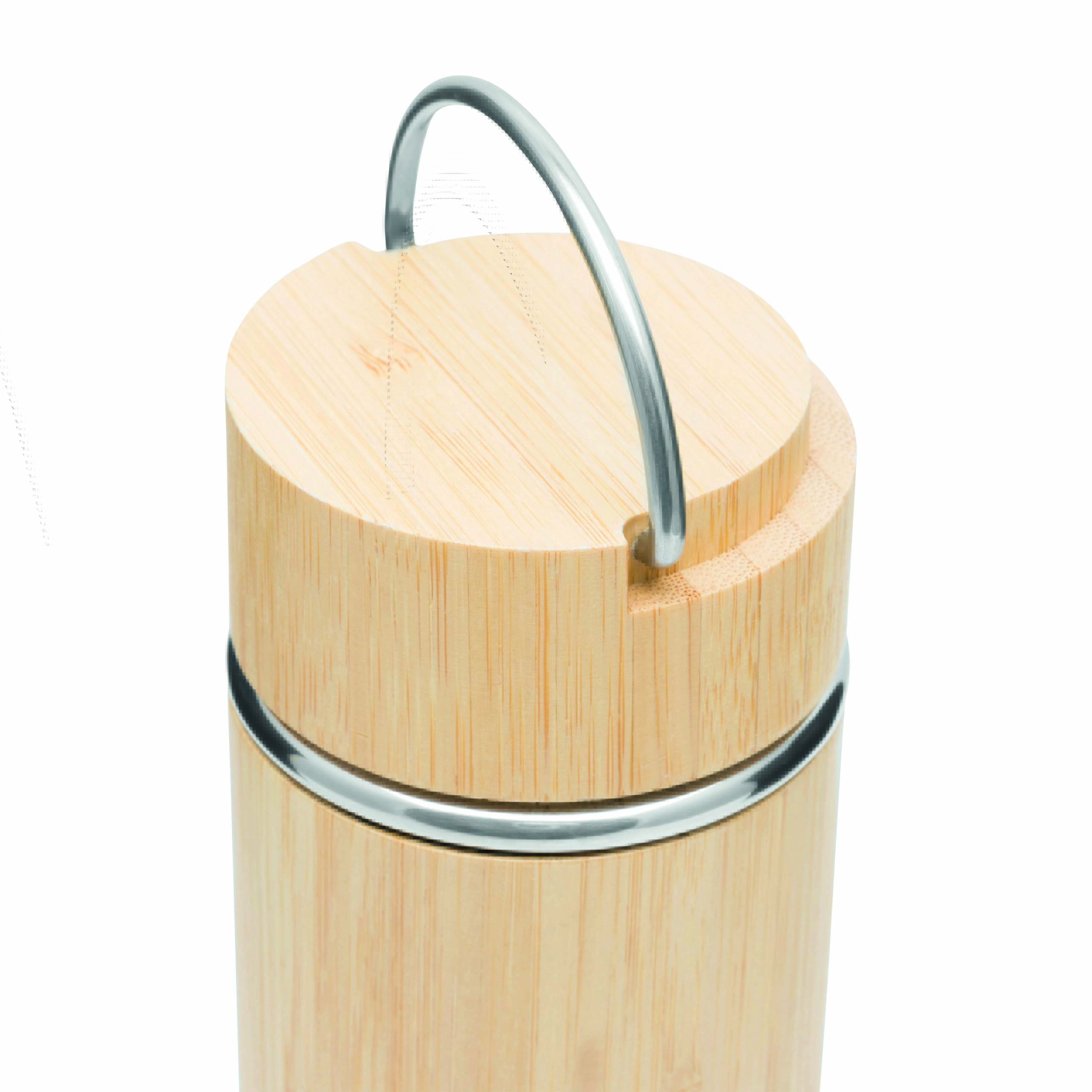 Termos BAMBOO HOT, podwójne ścianki: wewnątrz i na zewnątrz ze stali nierdzewnej, na zewnątrz pokryty bambusem, bezpieczna zakręcana pokrywka, silikonowy O-ring, z uchwytem ze stali nierdzewnej, z odłączanym sitkiem, pojemność ok. 400 ml.