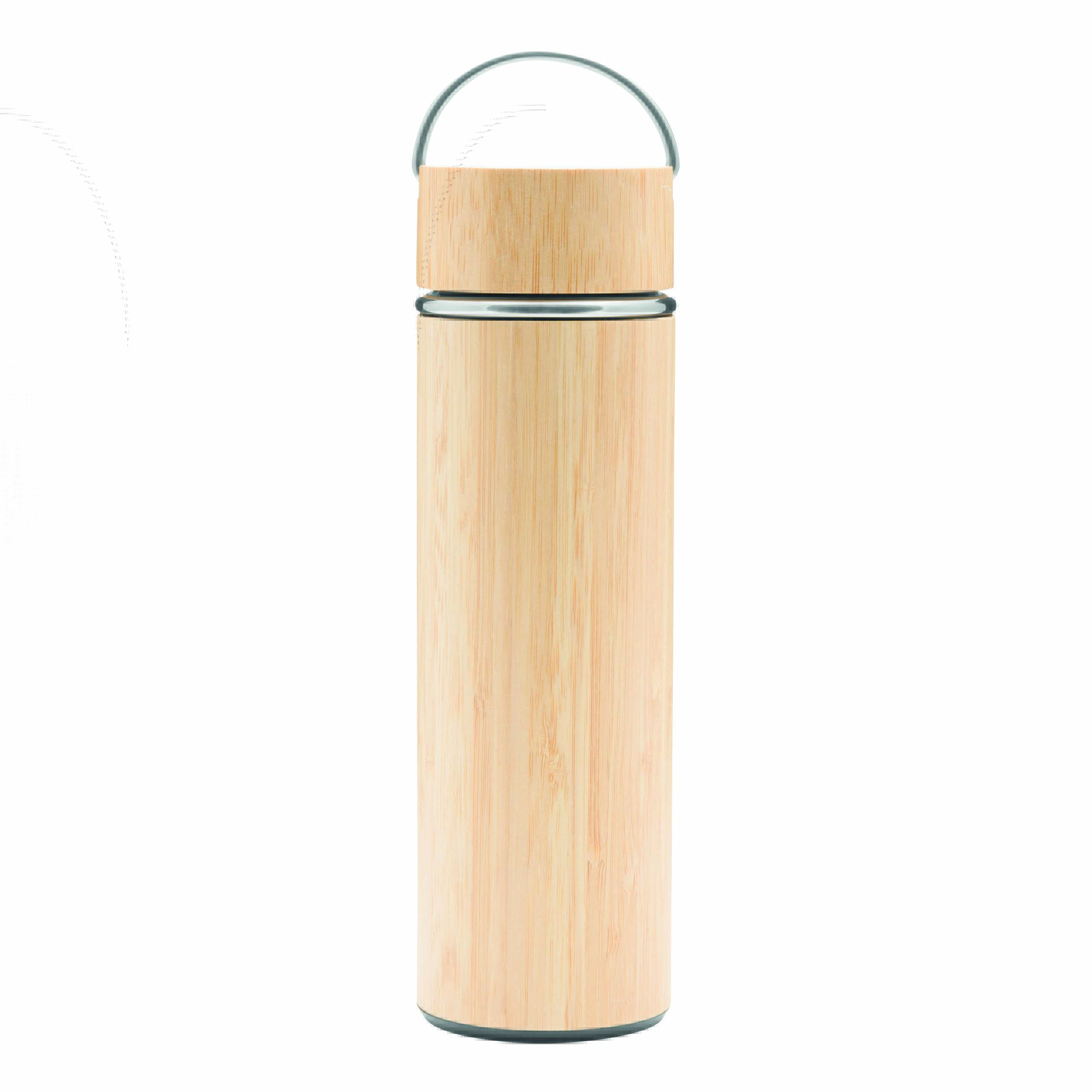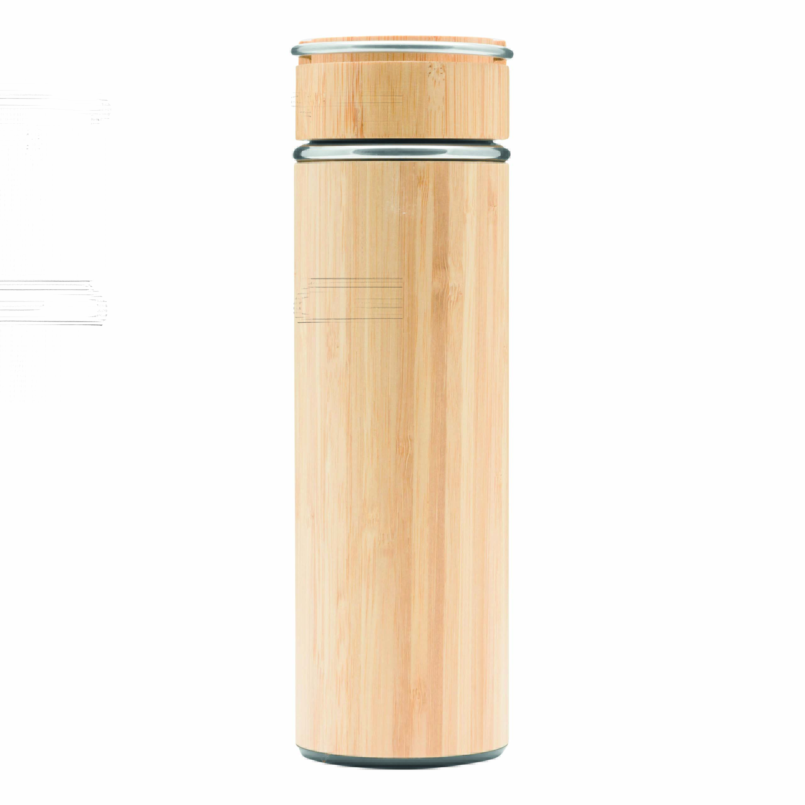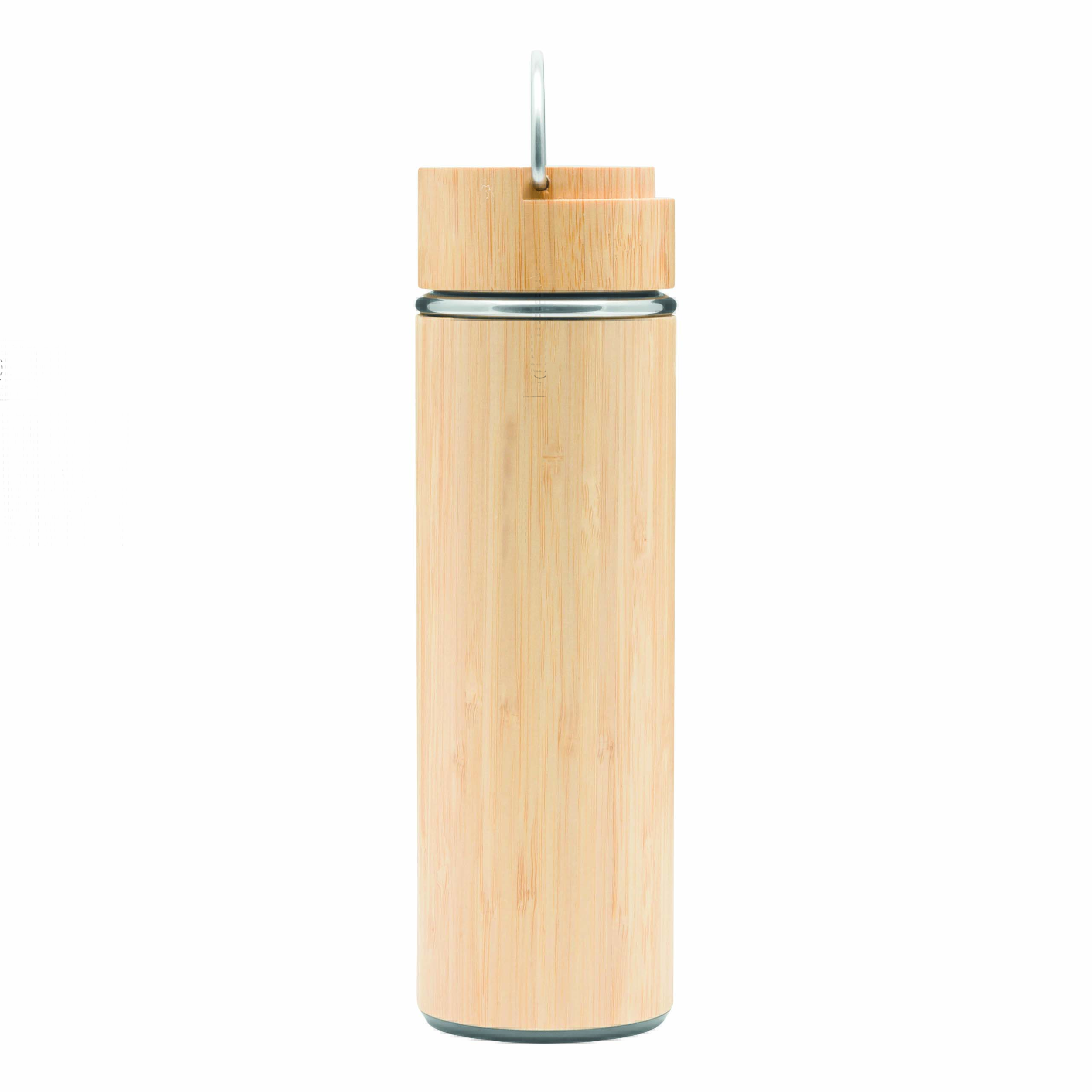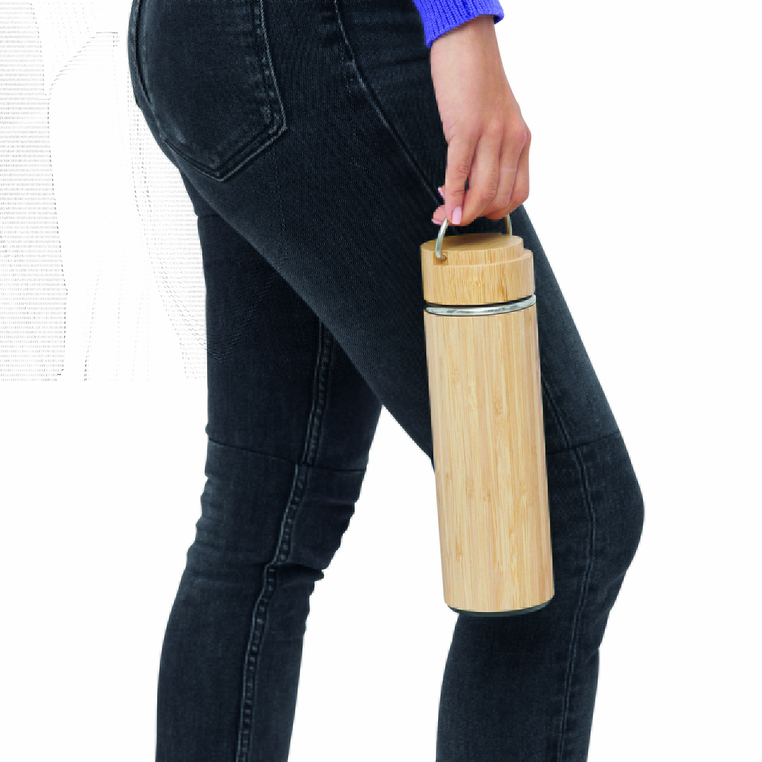 Termos BAMBOO HOT, podwójne ścianki: wewnątrz i na zewnątrz ze stali nierdzewnej, na zewnątrz pokryty bambusem, bezpieczna zakręcana pokrywka, silikonowy O-ring, z uchwytem ze stali nierdzewnej, z odłączanym sitkiem, pojemność ok. 400 ml.