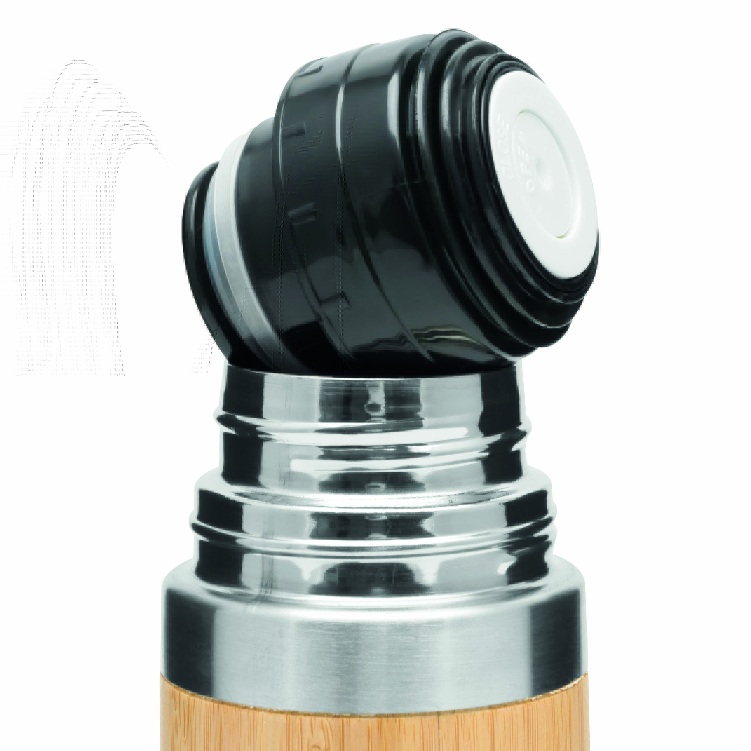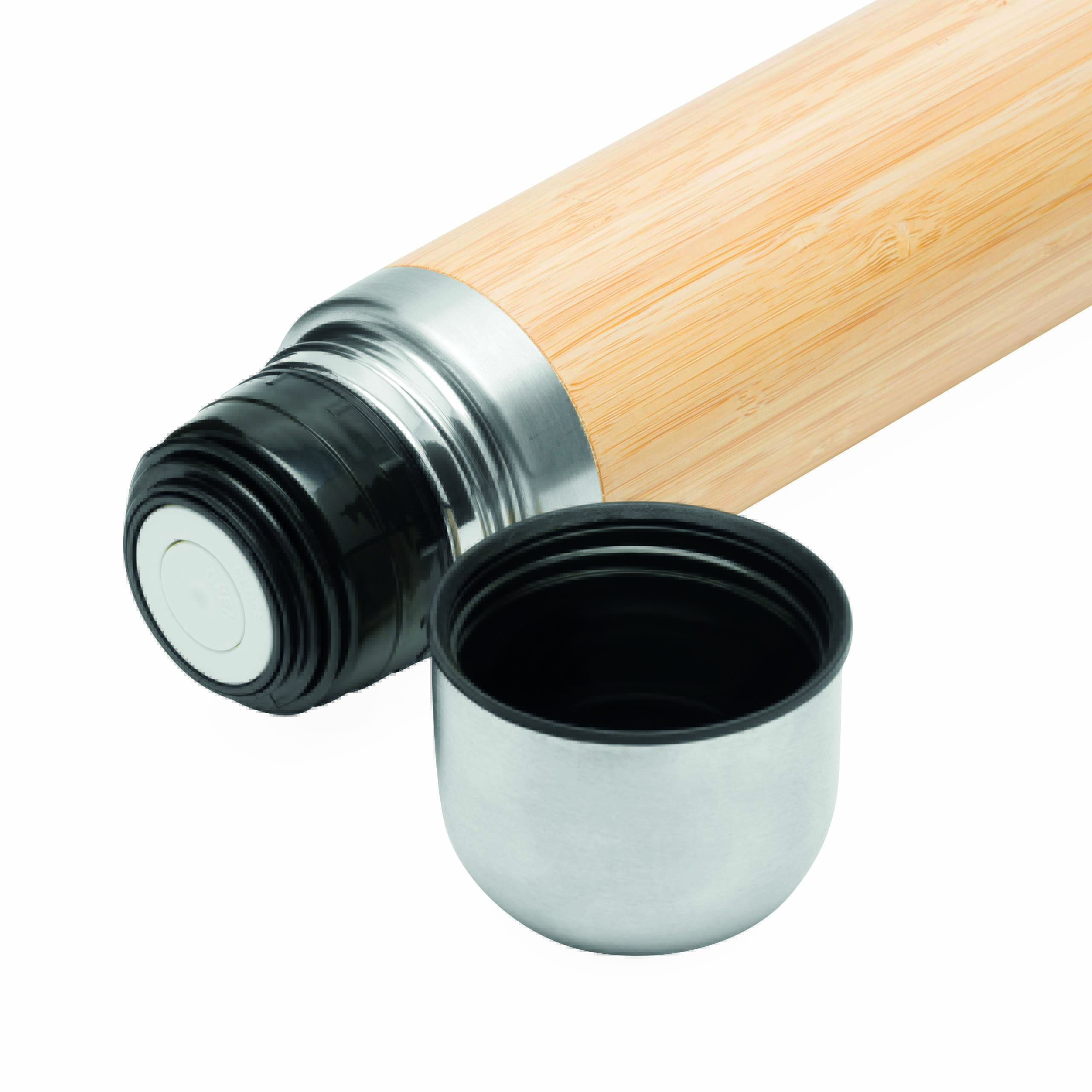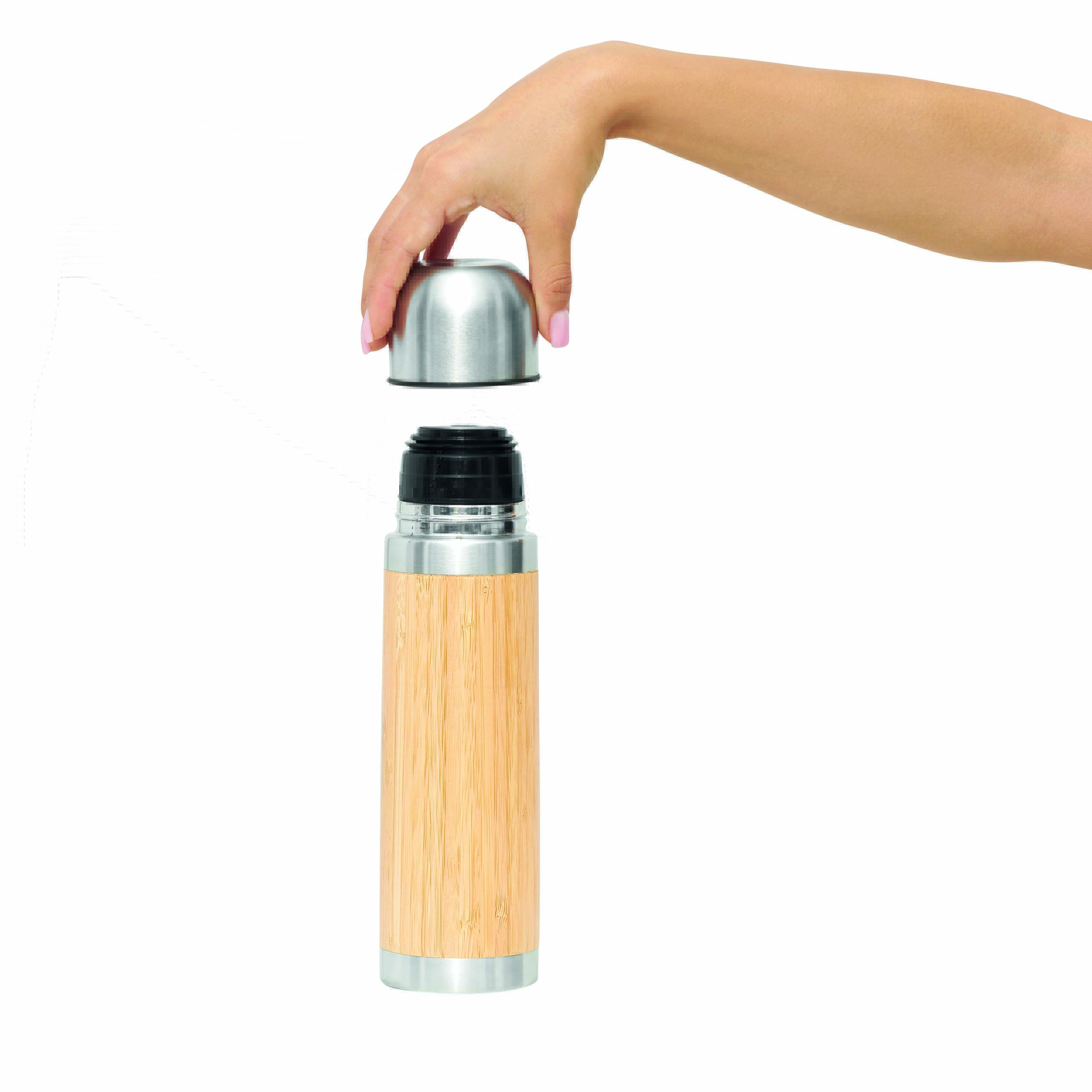 Termos BAMBOO SPACE, podwójne ścianki: wewnętrzna i zewnętrzna ze stali nierdzewnej, zewnętrzna pokryta bambusem, plastikowa wylewka z przyciskiem, pokrywka (wewnętrzna powierzchnia z tworzywa sztucznego) może być używana jako kubek, gumowana podstawa zapewnia dobrą przyczepność do powierzchni, pojemność ok. 450 ml.