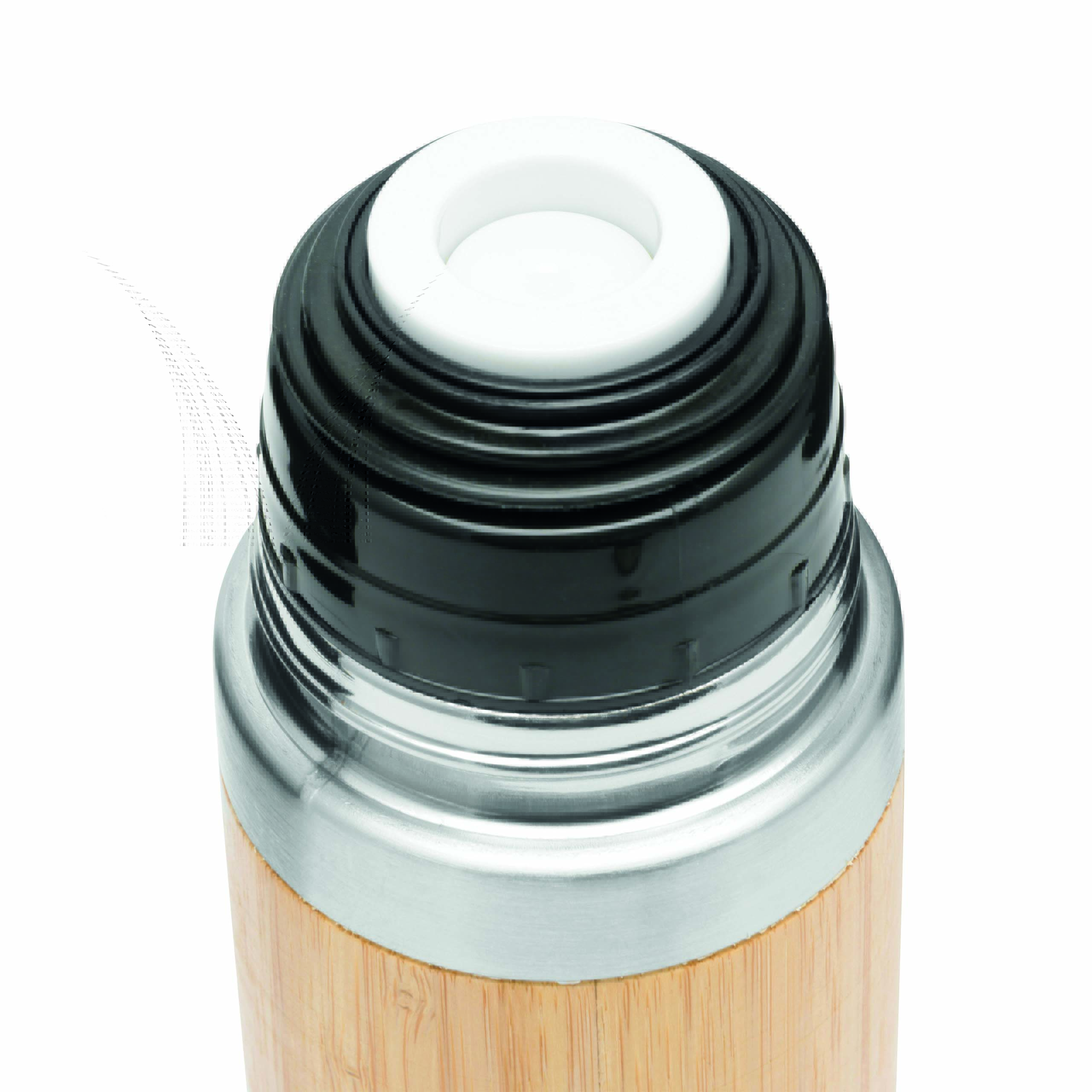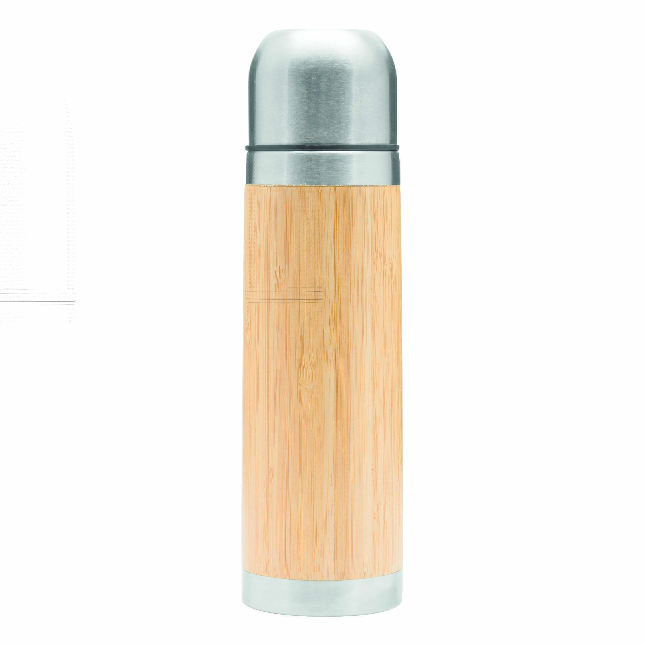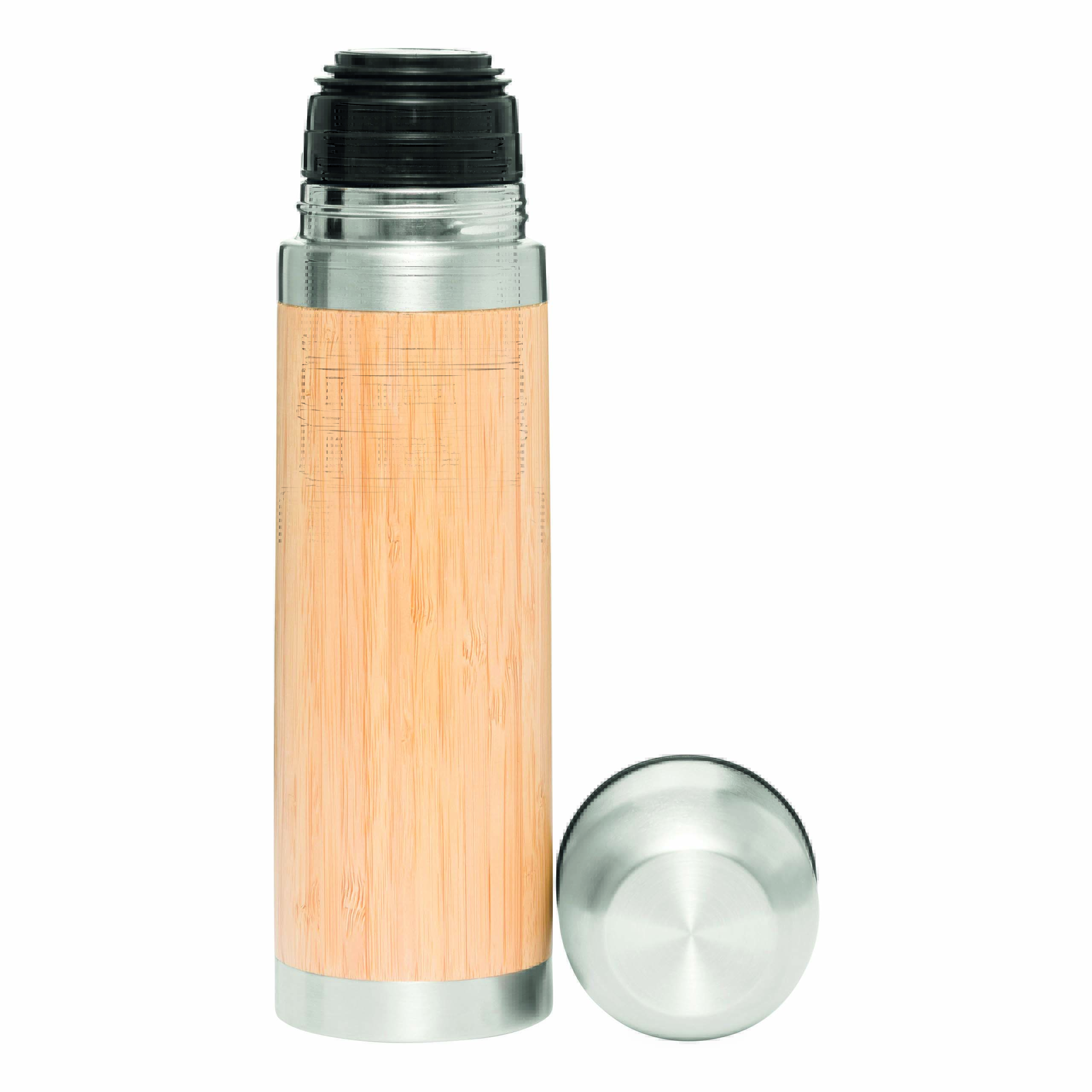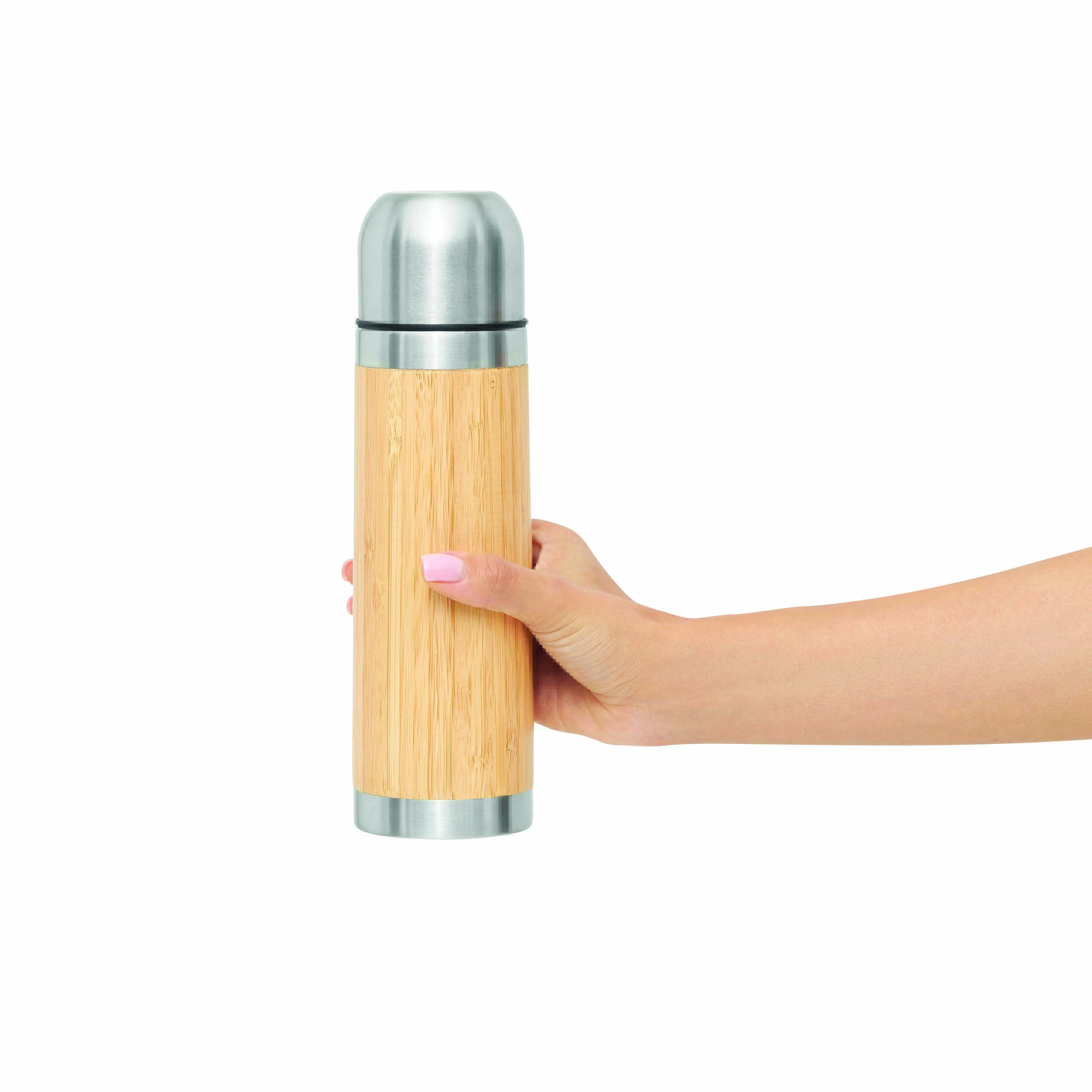 Termos BAMBOO SPACE, podwójne ścianki: wewnętrzna i zewnętrzna ze stali nierdzewnej, zewnętrzna pokryta bambusem, plastikowa wylewka z przyciskiem, pokrywka (wewnętrzna powierzchnia z tworzywa sztucznego) może być używana jako kubek, gumowana podstawa zapewnia dobrą przyczepność do powierzchni, pojemność ok. 450 ml.