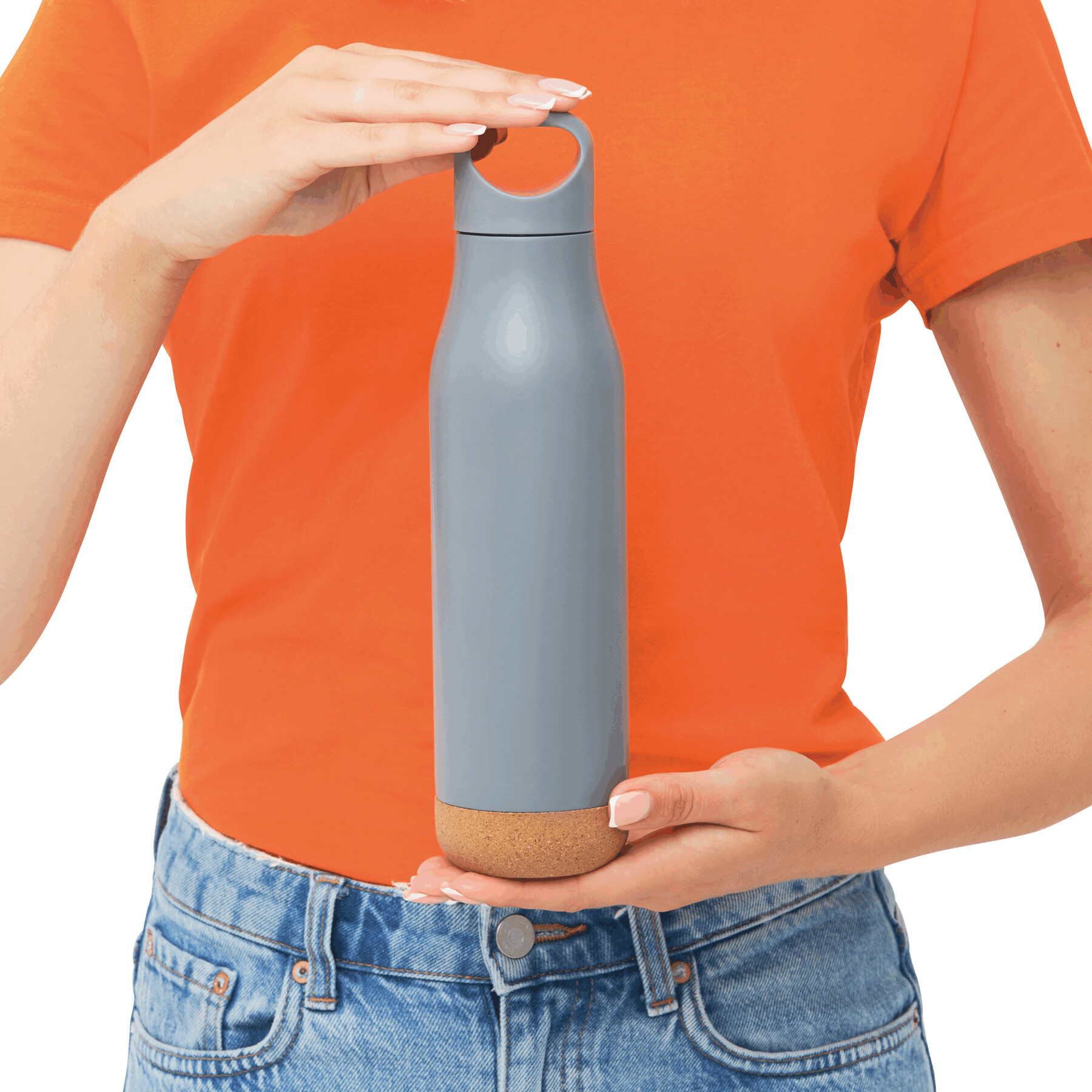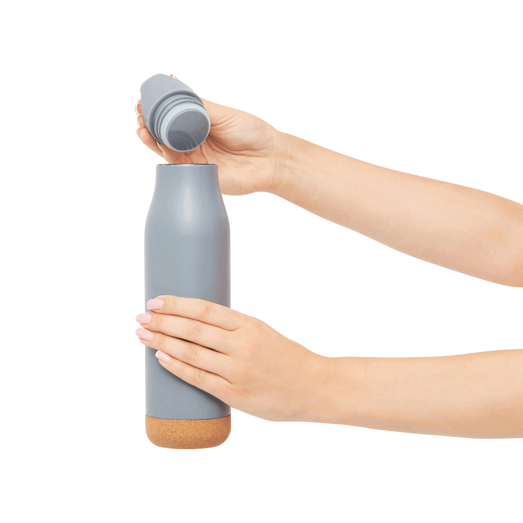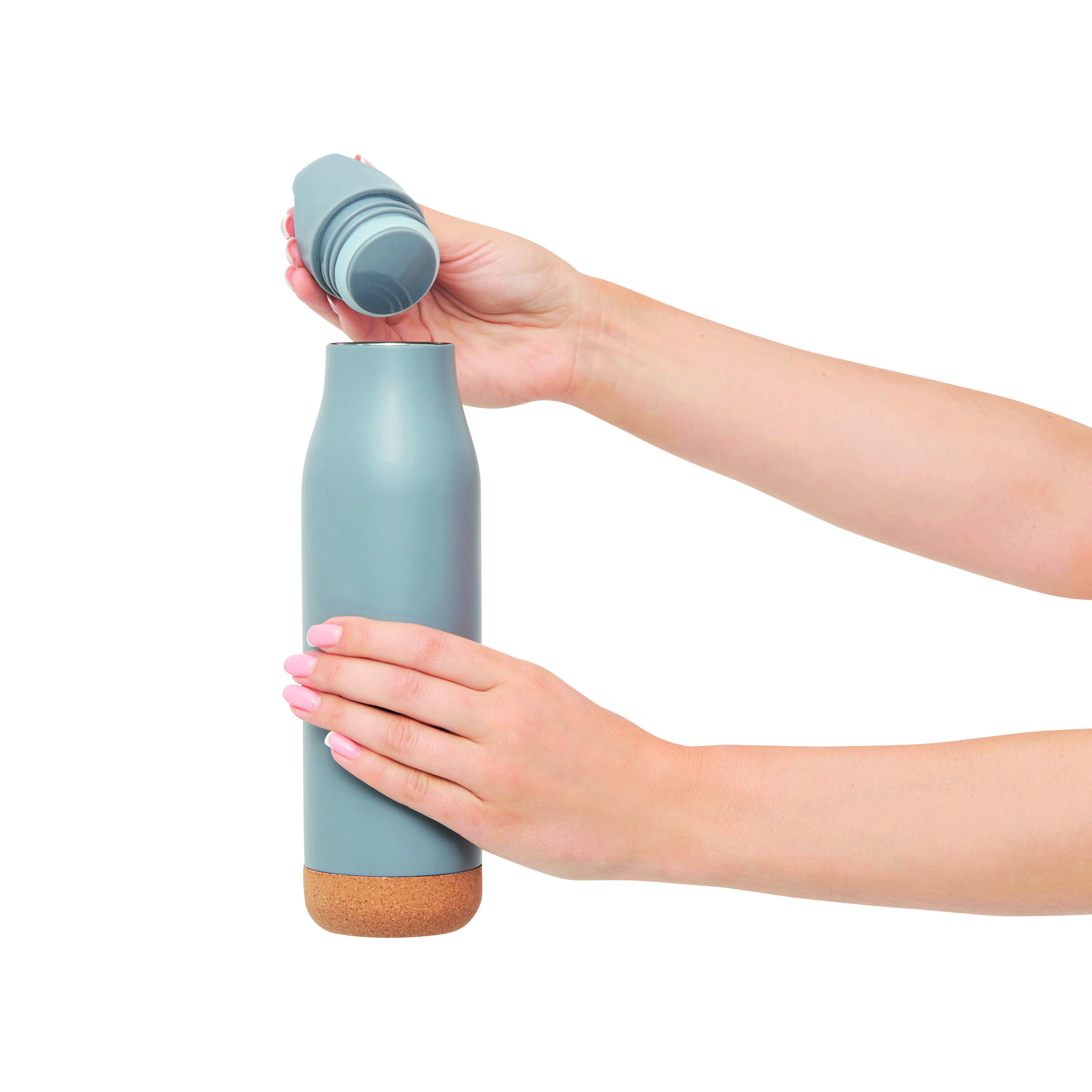 Próżniowa butelka do picia CORKY LEGEND dwuścienna: na zewnątrz i wewnątrz wykonana ze stali nierdzewnej. Plastikowa zakrętka ze szczelnym gwintem, korkowe denko, pojemność: ok. 500 ml, utrzymuje ciepło napoju przez ok. 12 godzin i zimno do 24 godzin.