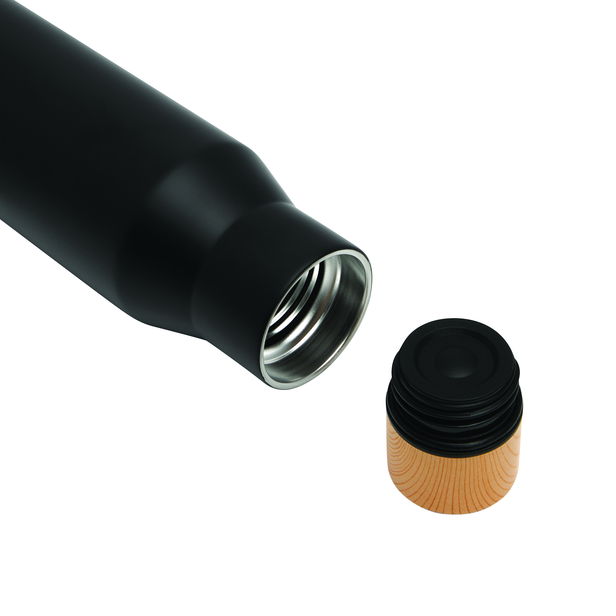Próżniowa butelka do picia DRINK NOBLY. Z podwójną izolacją – na zewnątrz i wewnątrz wykonana jest ze stali nierdzewnej. Zakrętka zrobiona jest z imitacji bambusa z dodatkowym silikonowym pierścieniem uszczelniającym. Pojemność butelki to ok. 500 ml.