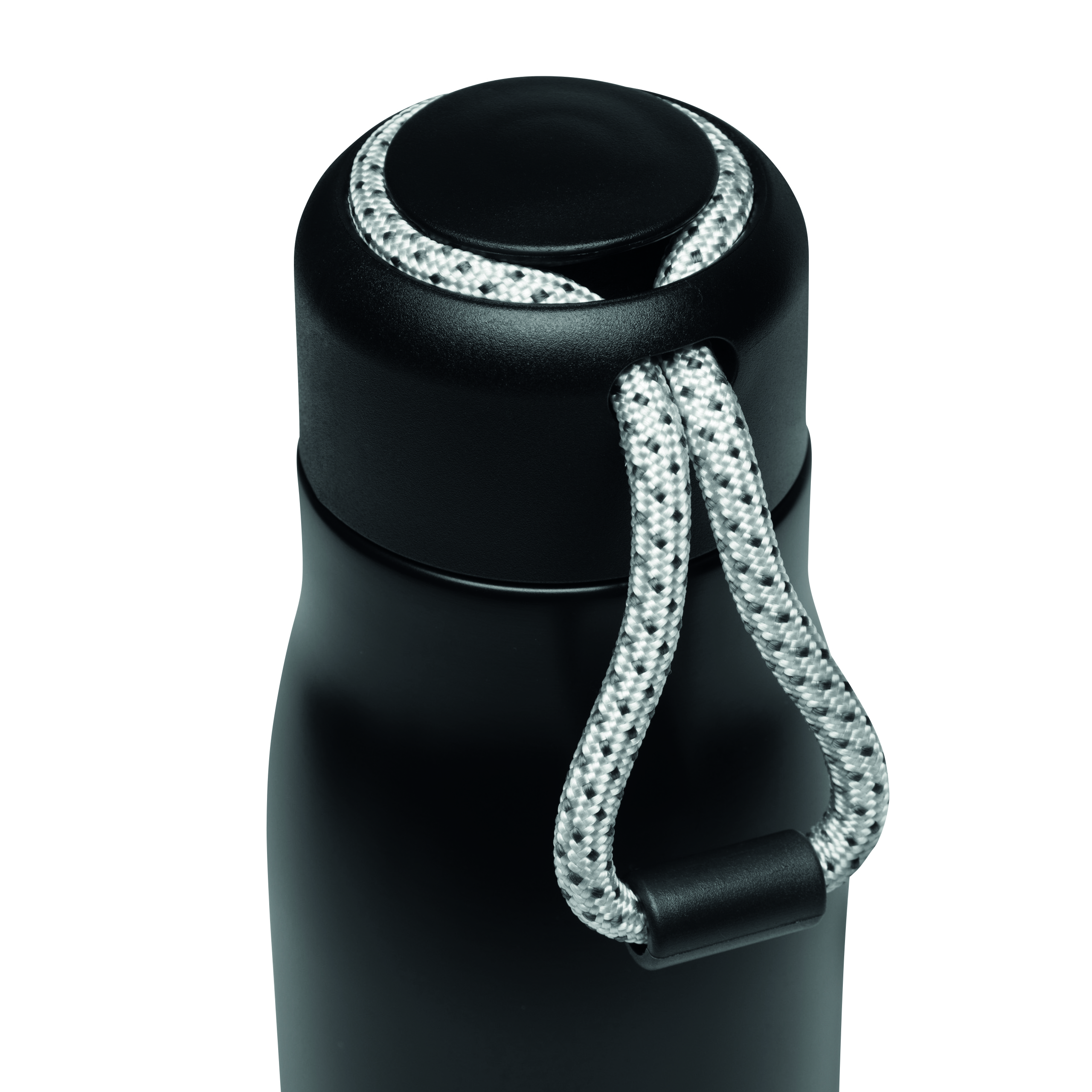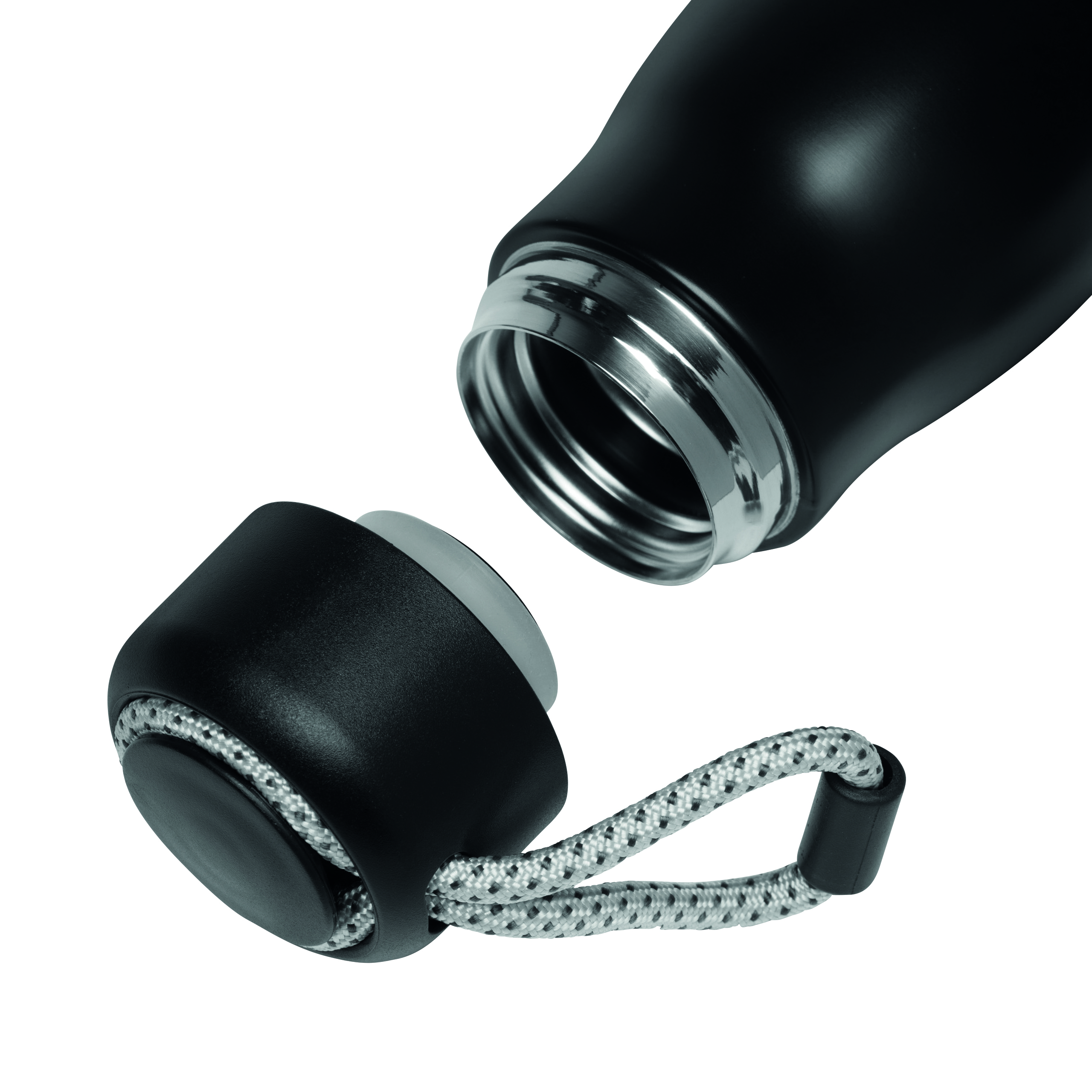Próżniowa butelka do picia ROBUSTA, dwuścienna: wewnątrz i na zewnątrz wykonana ze stali nierdzewnej, szczelna czarna zakrętka z pętelką do przenoszenia, pojemność: ok. 500 ml, utrzymuje ciepło napoju przez ok. 8 godzin i zimno do 12 godzin.