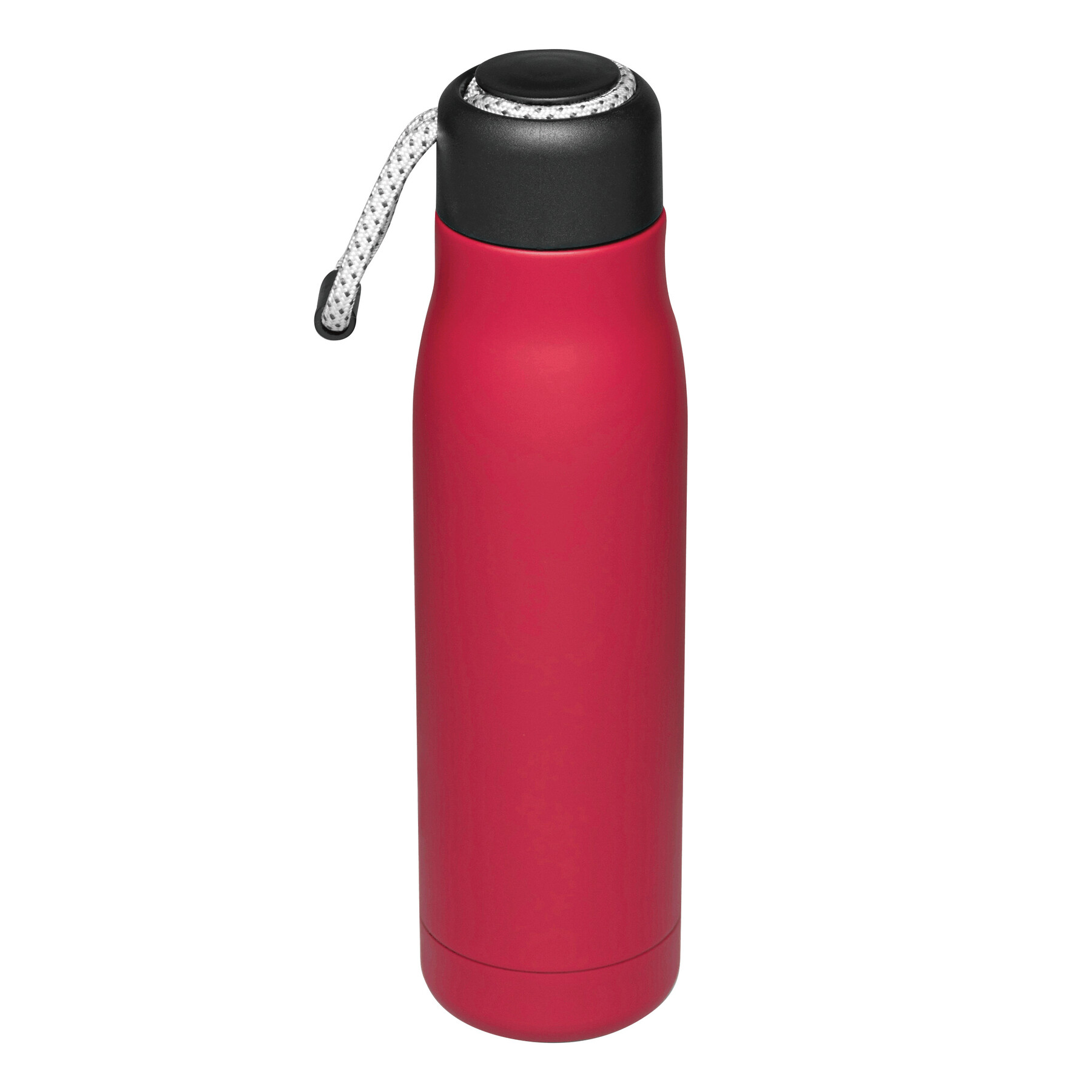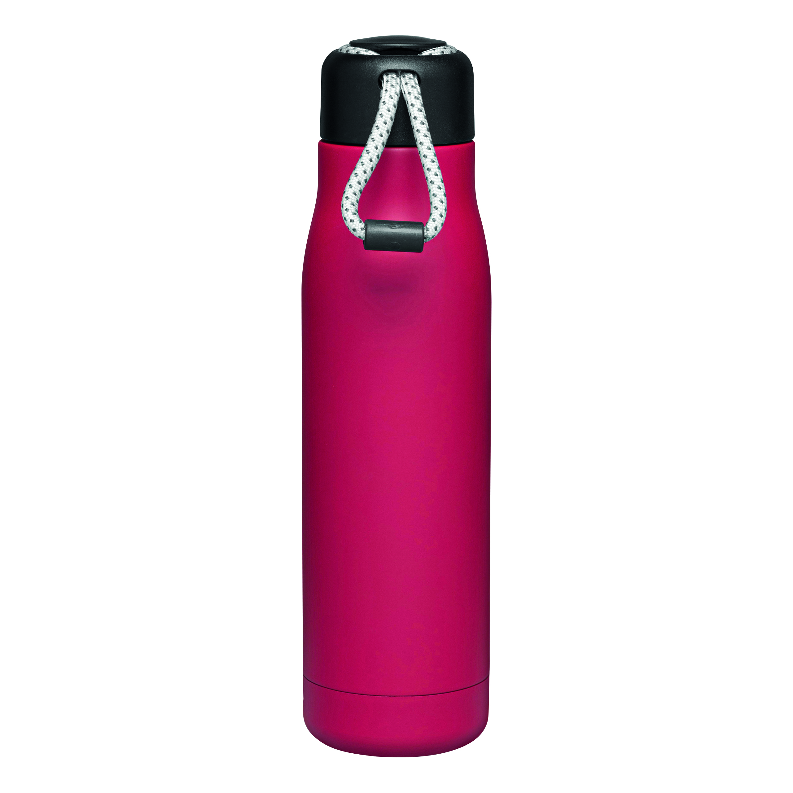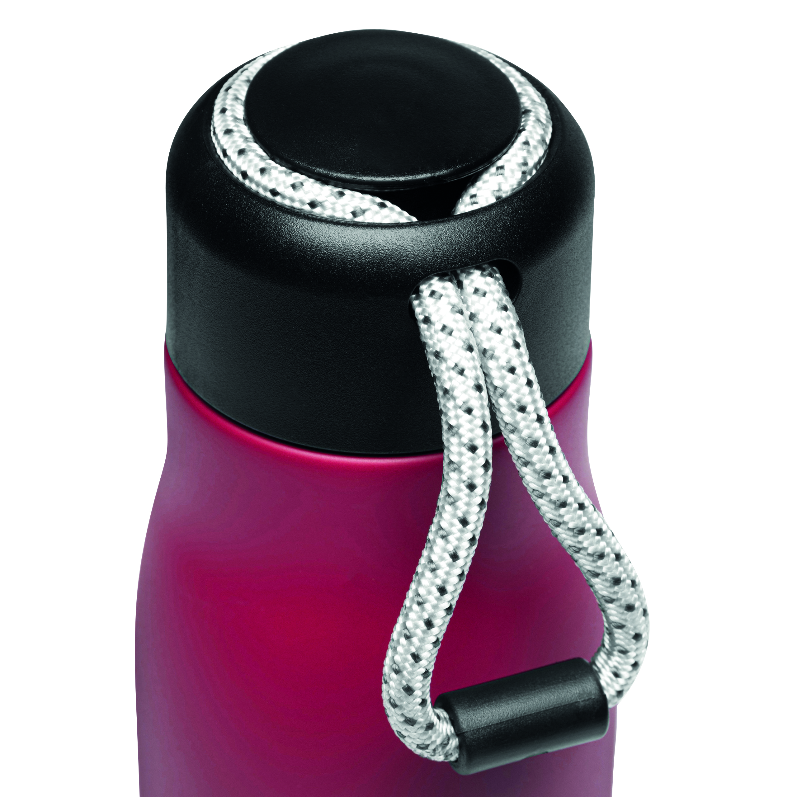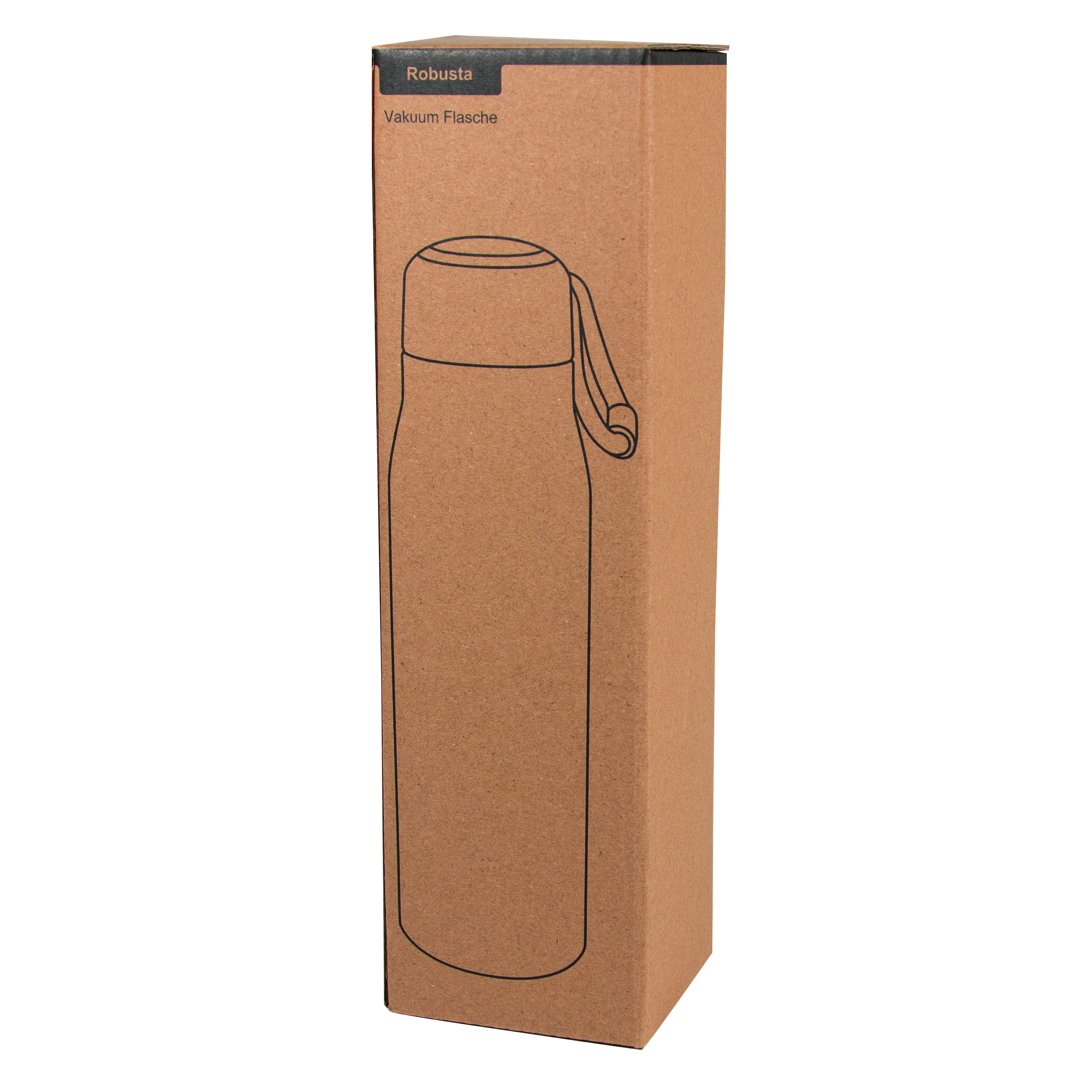 Próżniowa butelka do picia ROBUSTA, dwuścienna: wewnątrz i na zewnątrz wykonana ze stali nierdzewnej, szczelna czarna zakrętka z pętelką do przenoszenia, pojemność: ok. 500 ml, utrzymuje ciepło napoju przez ok. 8 godzin i zimno do 12 godzin.
