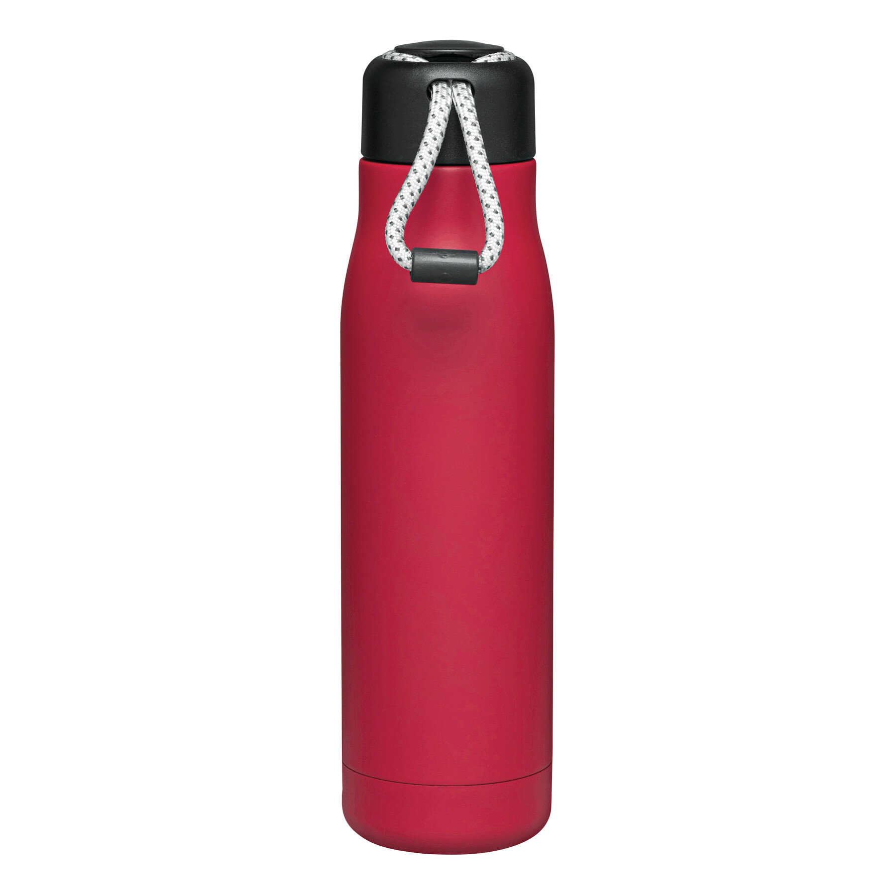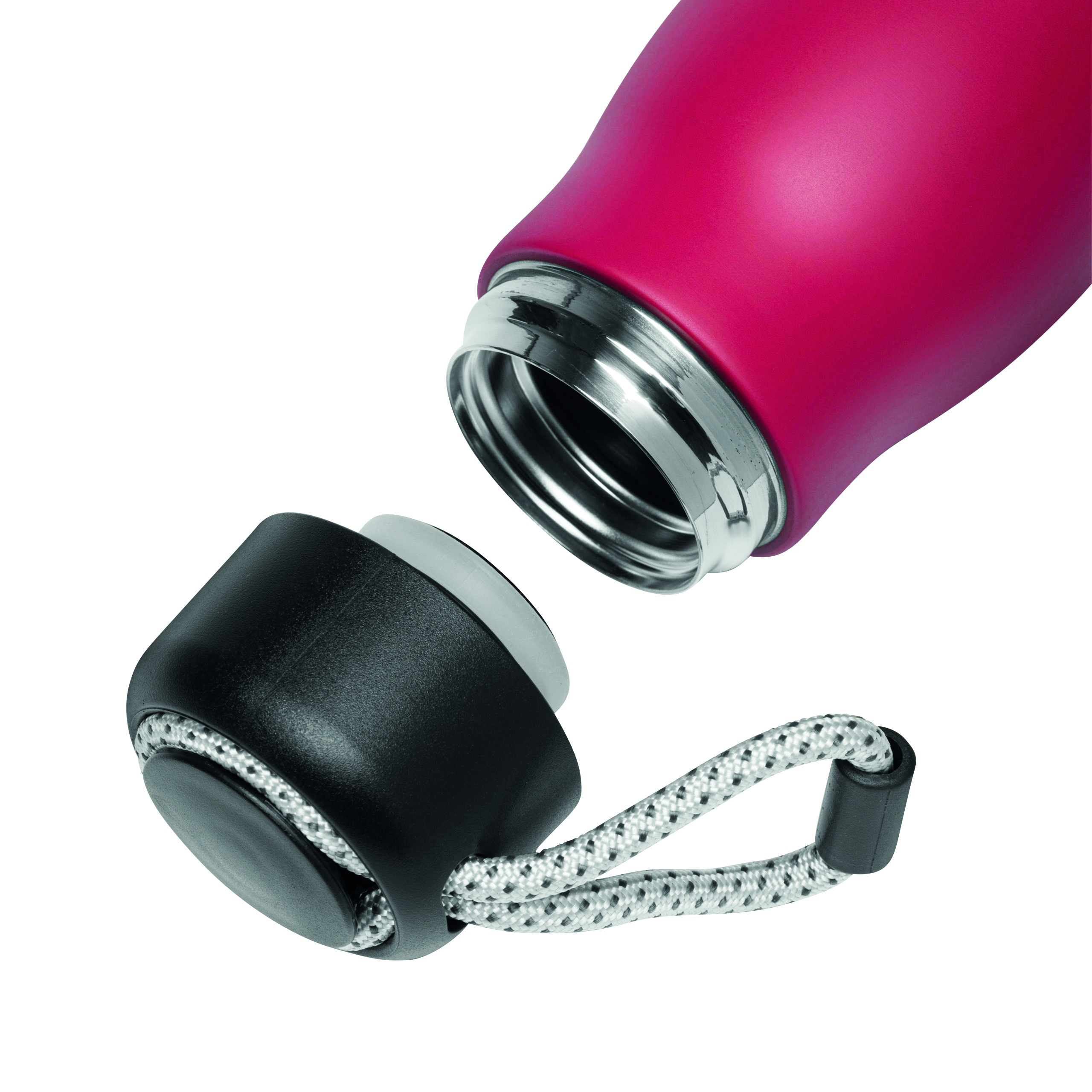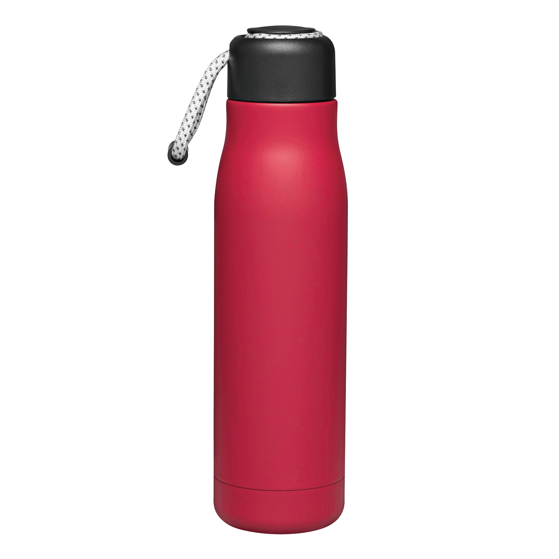 Próżniowa butelka do picia ROBUSTA, dwuścienna: wewnątrz i na zewnątrz wykonana ze stali nierdzewnej, szczelna czarna zakrętka z pętelką do przenoszenia, pojemność: ok. 500 ml, utrzymuje ciepło napoju przez ok. 8 godzin i zimno do 12 godzin.